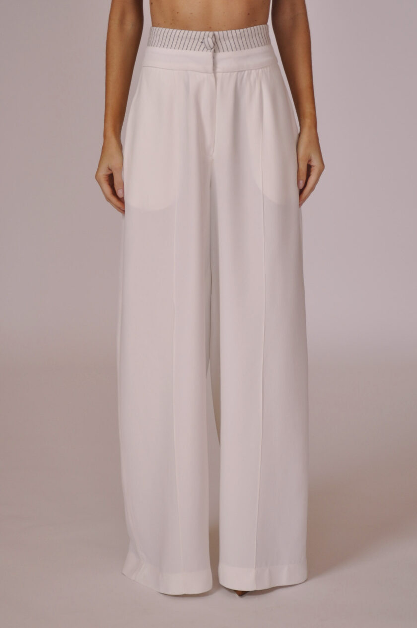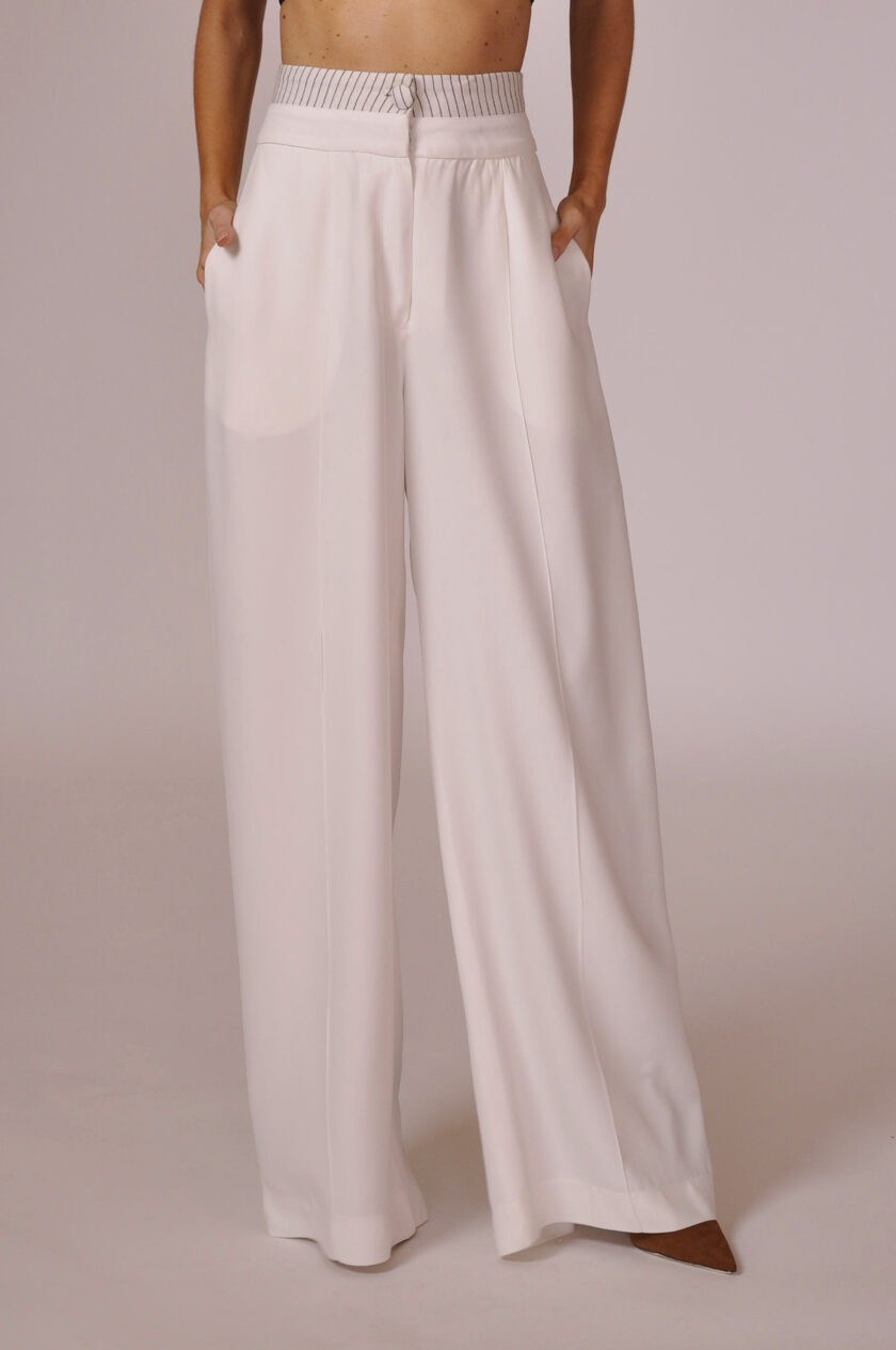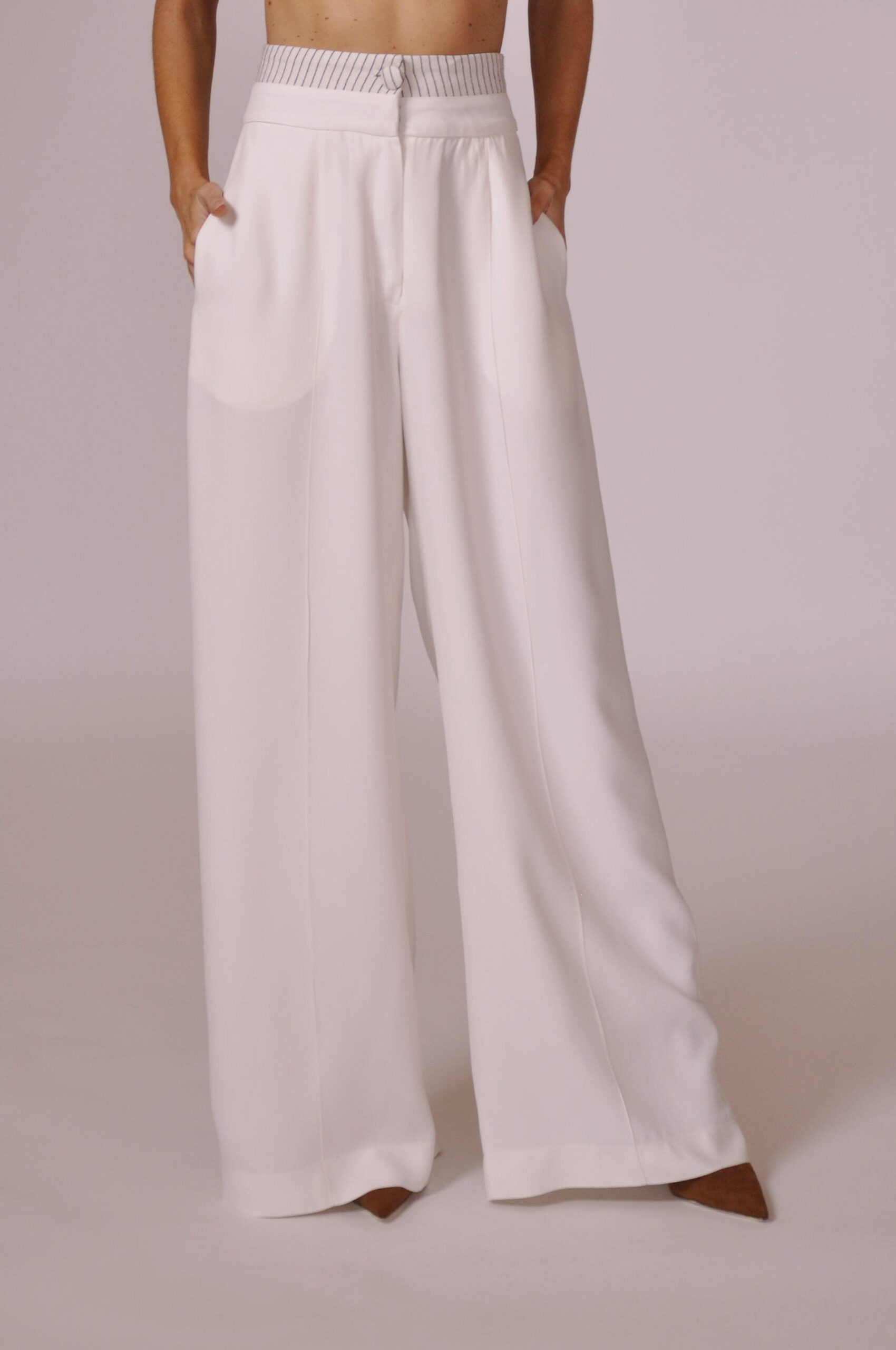 CALÇA SUR AMPLA COM CÓS EM ALGODÃO LISTRADO EM BRANCO E AZUL, FECHAMENTO EM ZÍPER E BOTÃO ENCAPADO COM BOLSOS.