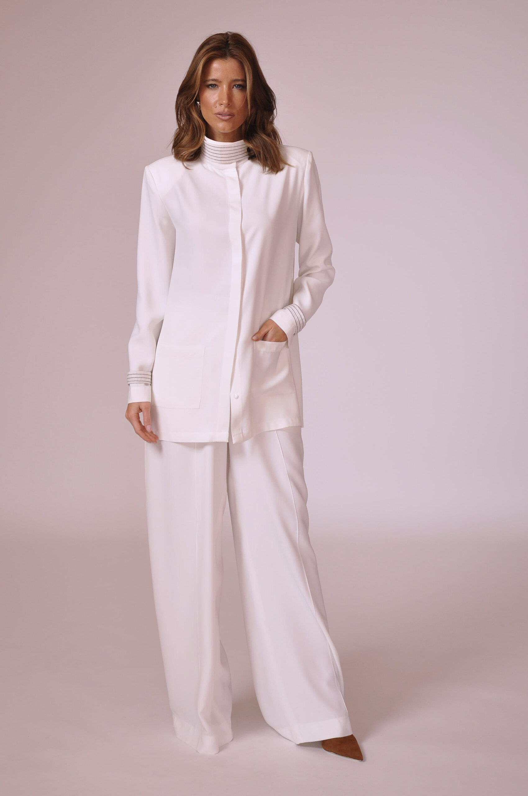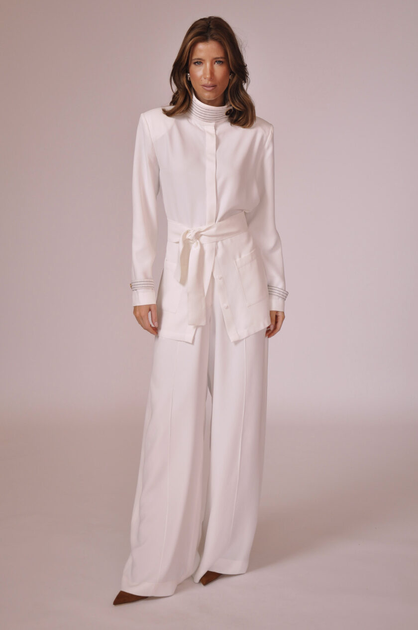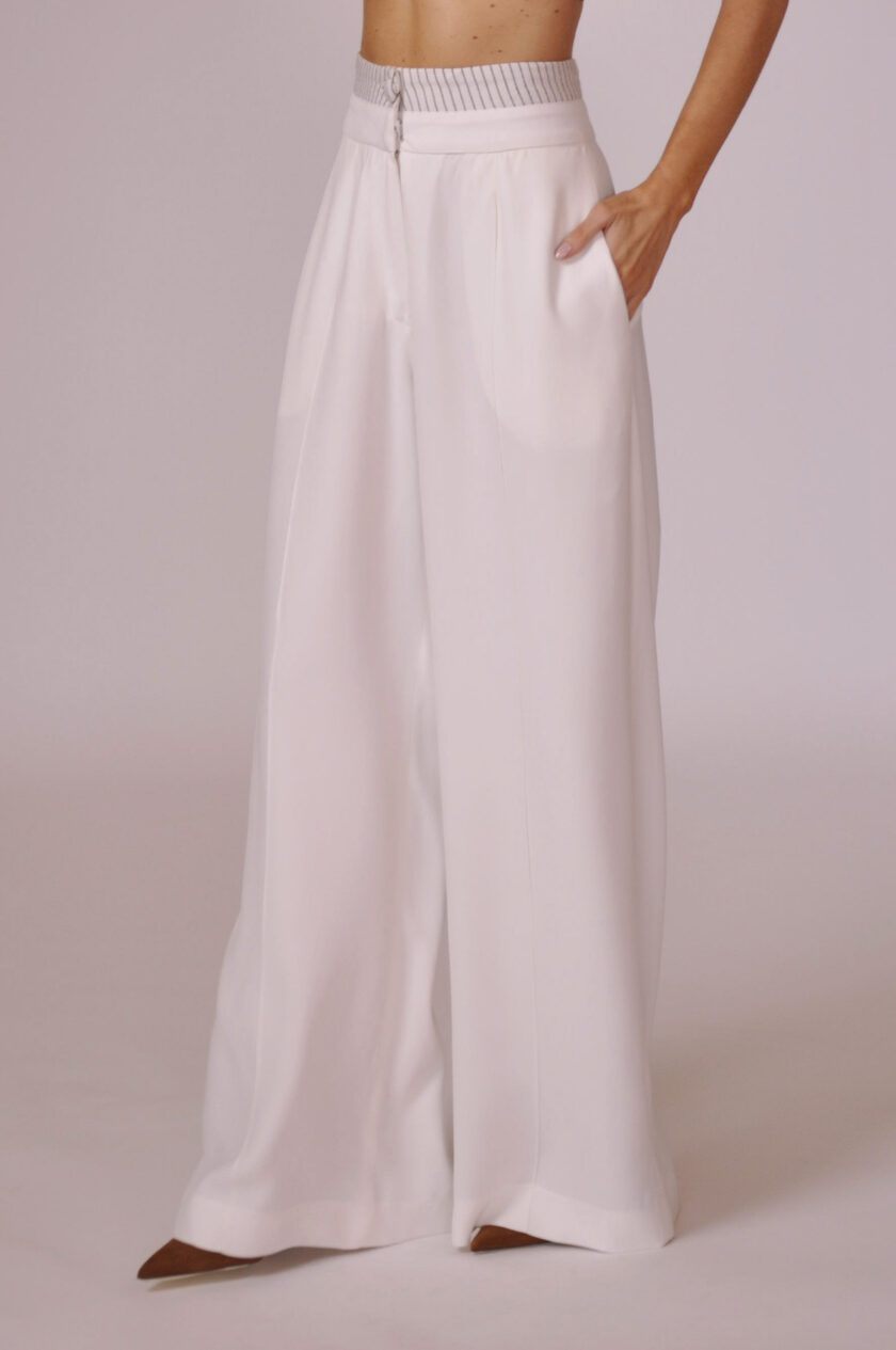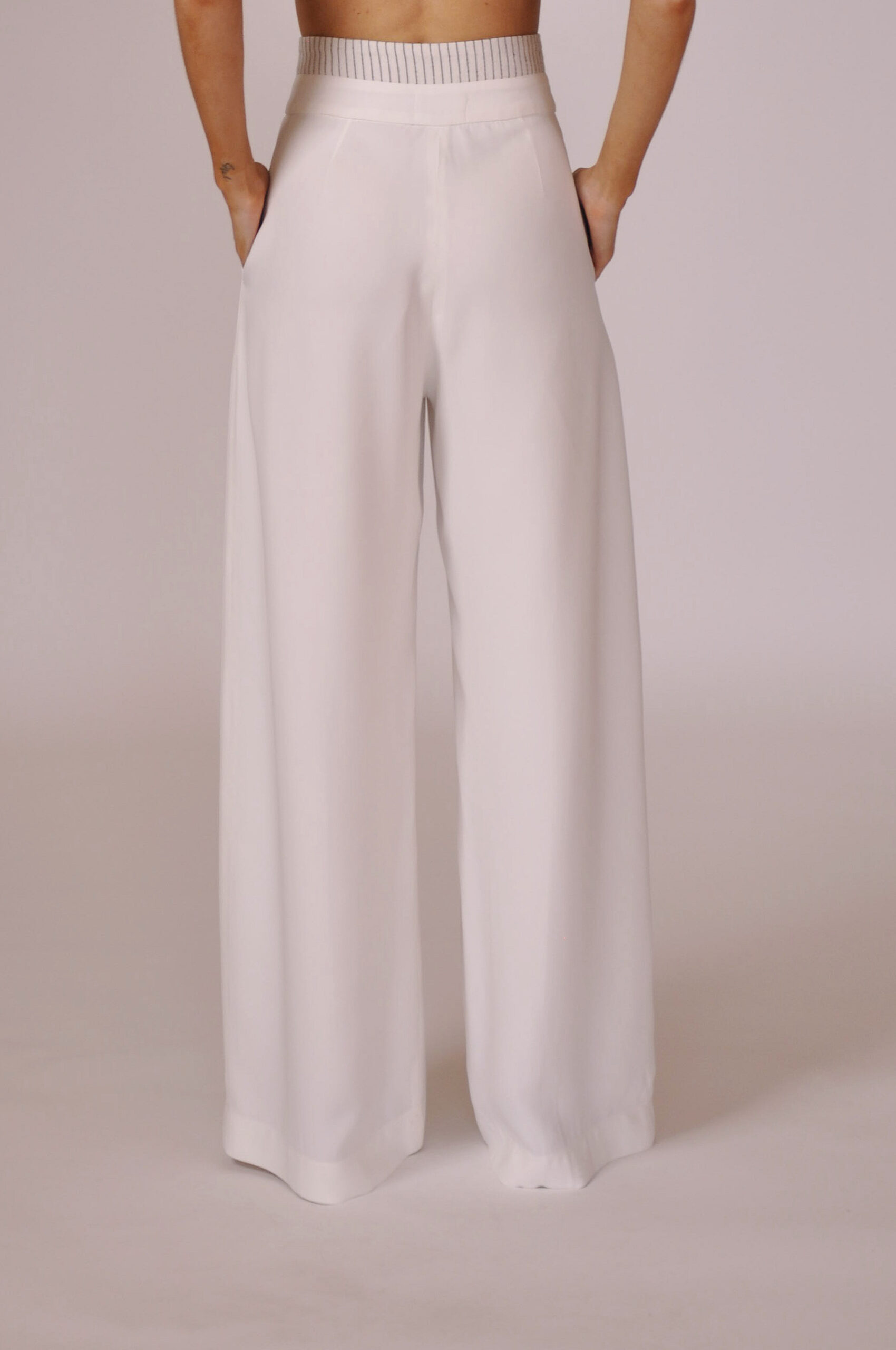 CALÇA SUR AMPLA COM CÓS EM ALGODÃO LISTRADO EM BRANCO E AZUL, FECHAMENTO EM ZÍPER E BOTÃO ENCAPADO COM BOLSOS.