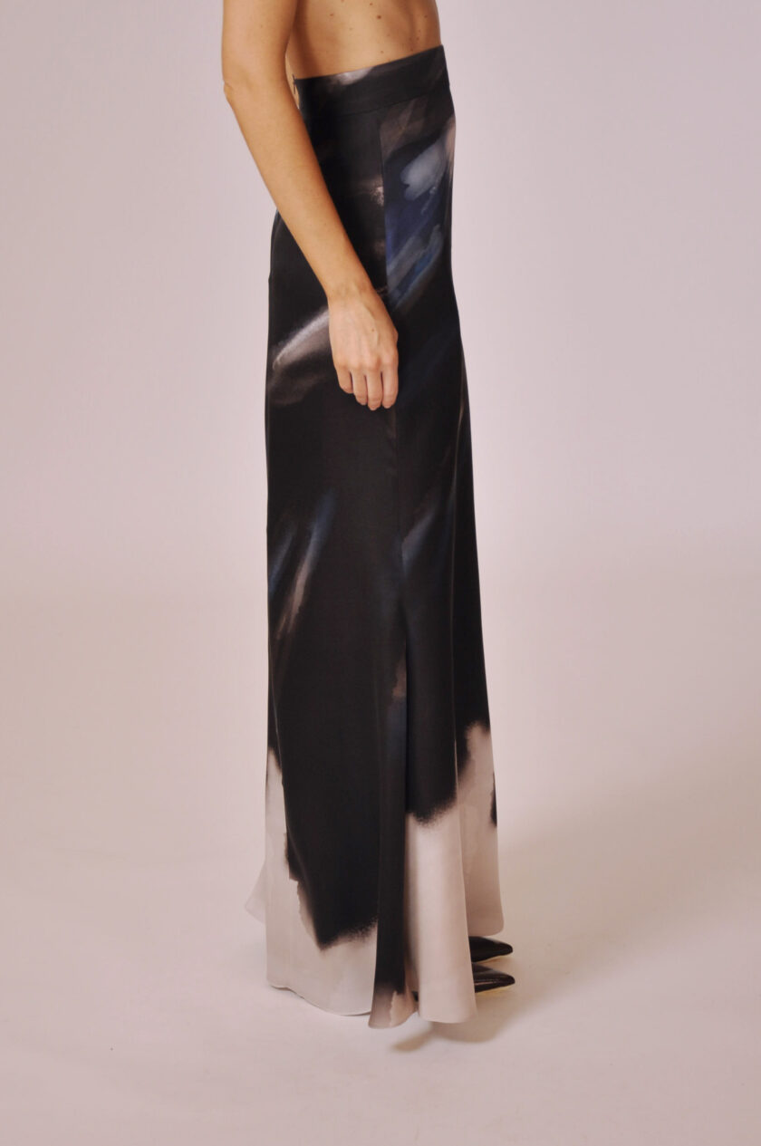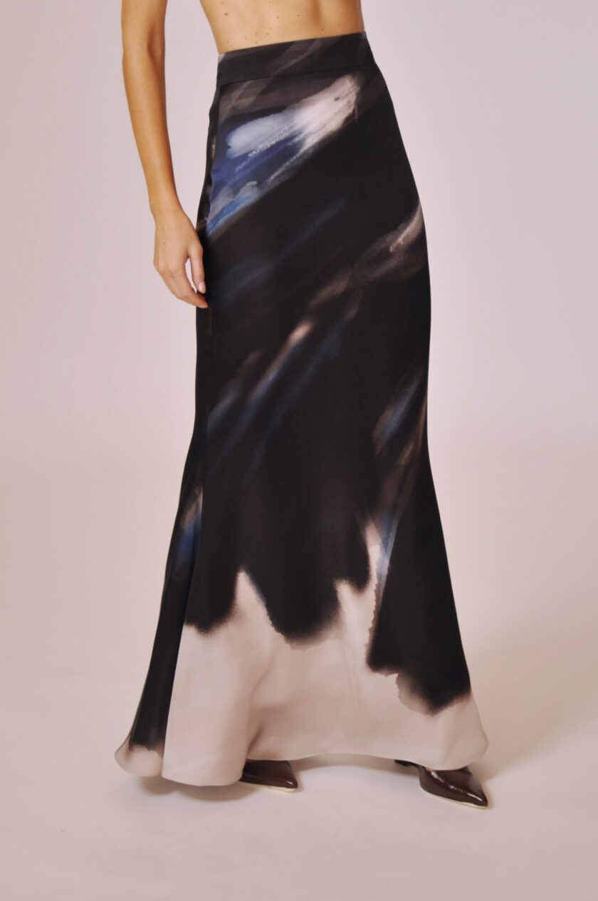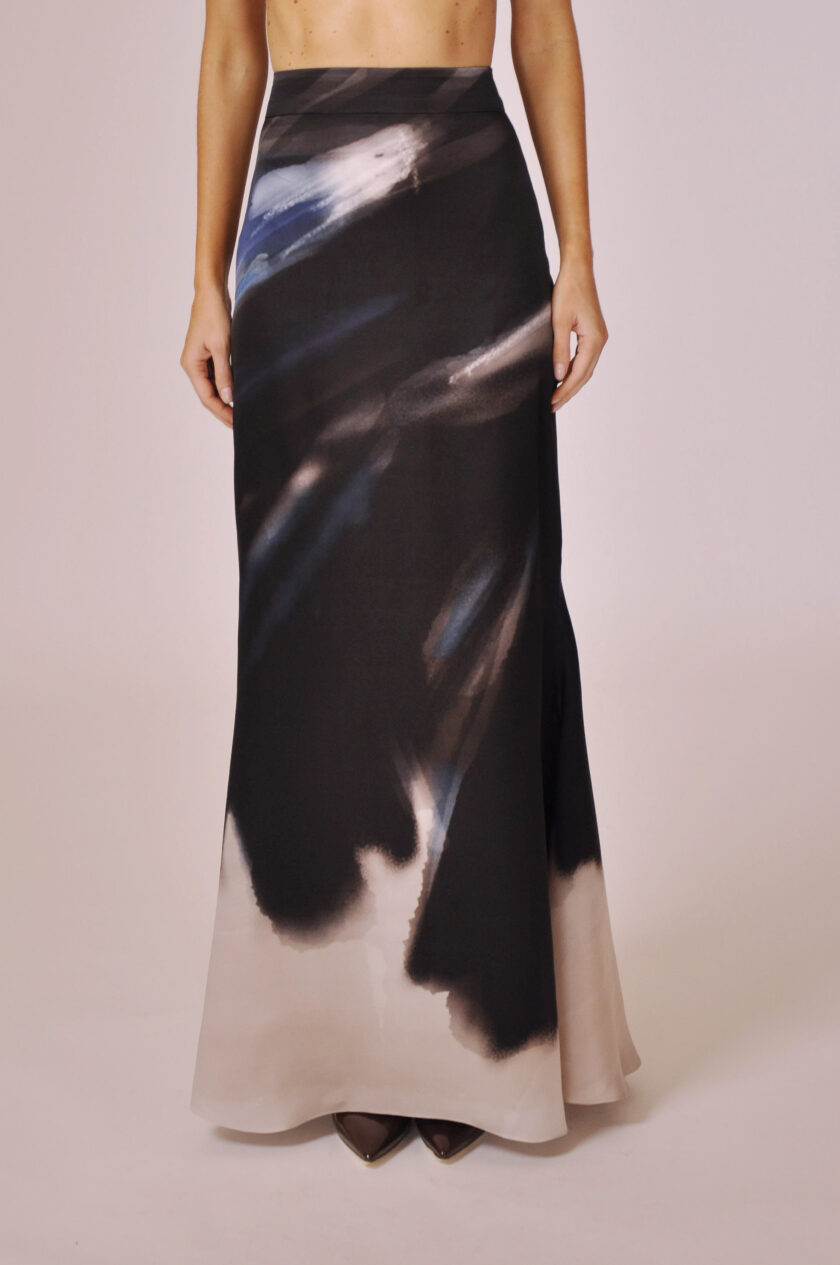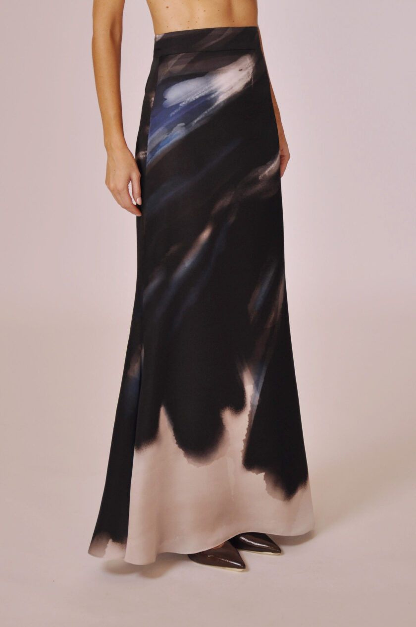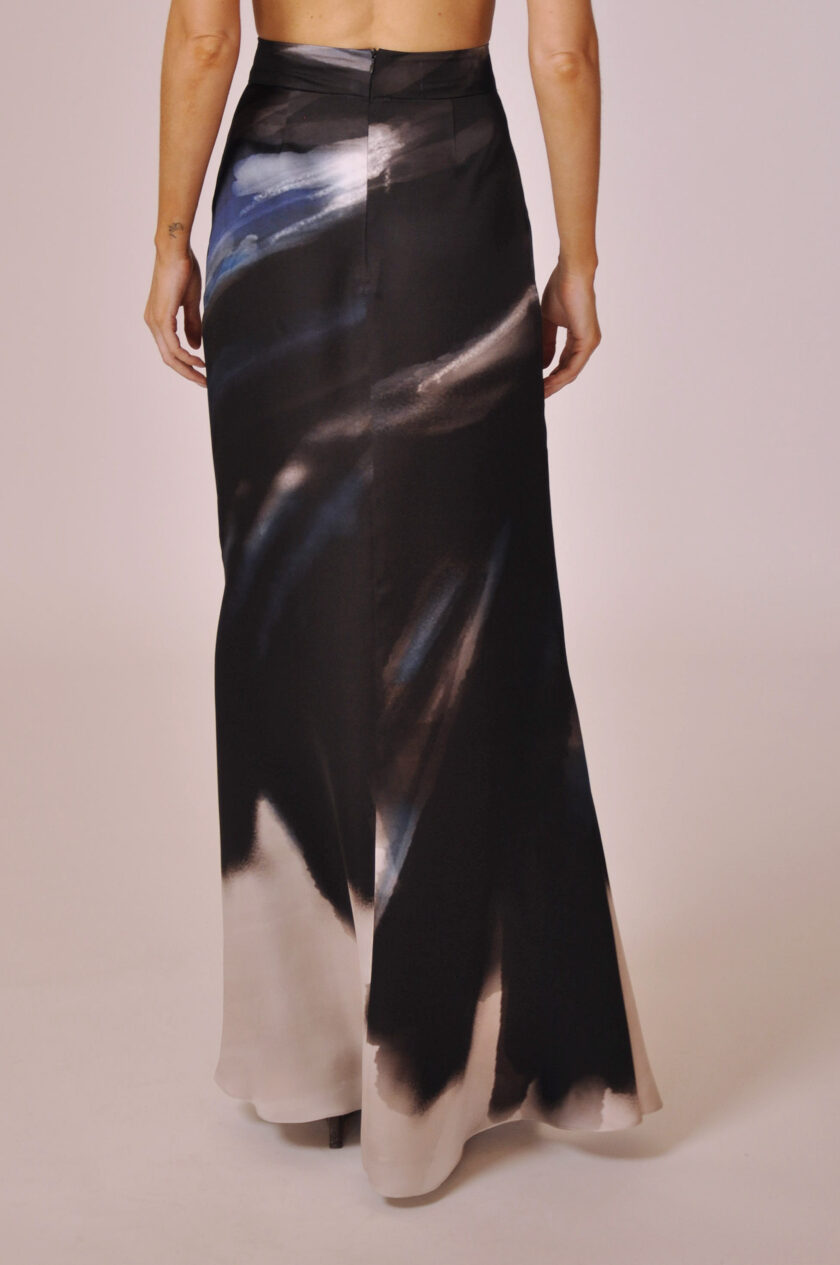 SAIA YVES LONGA COM FECHAMENTO POSTERIOR EM ZÍPER INVISÍVEL.