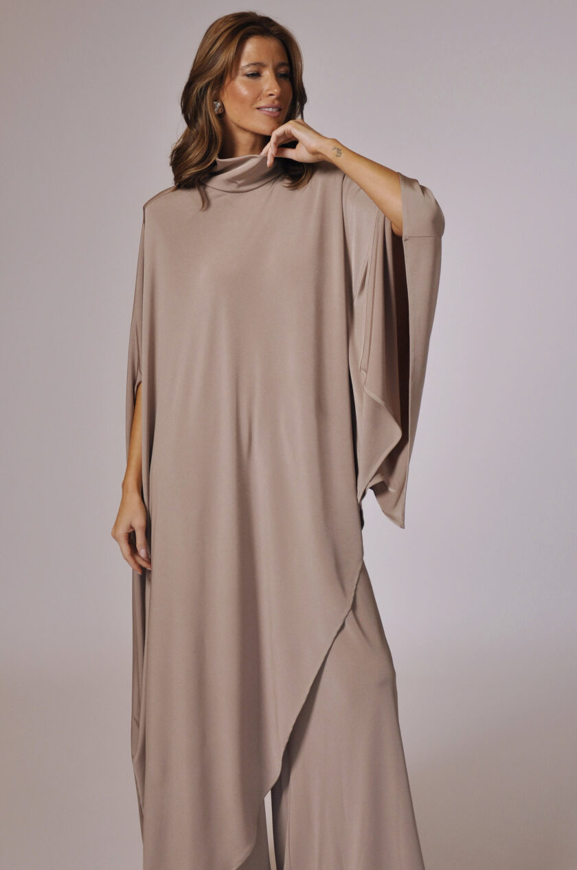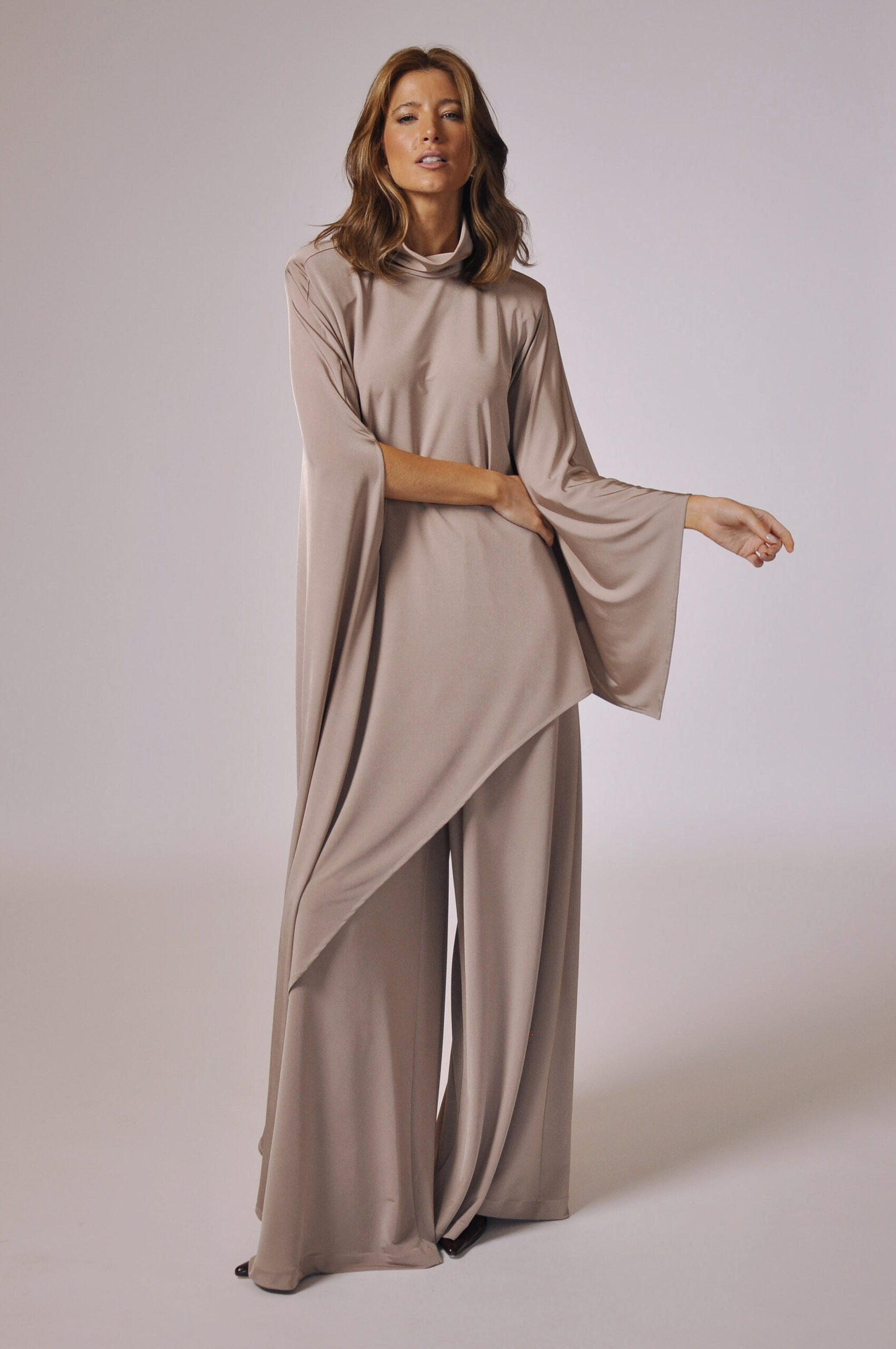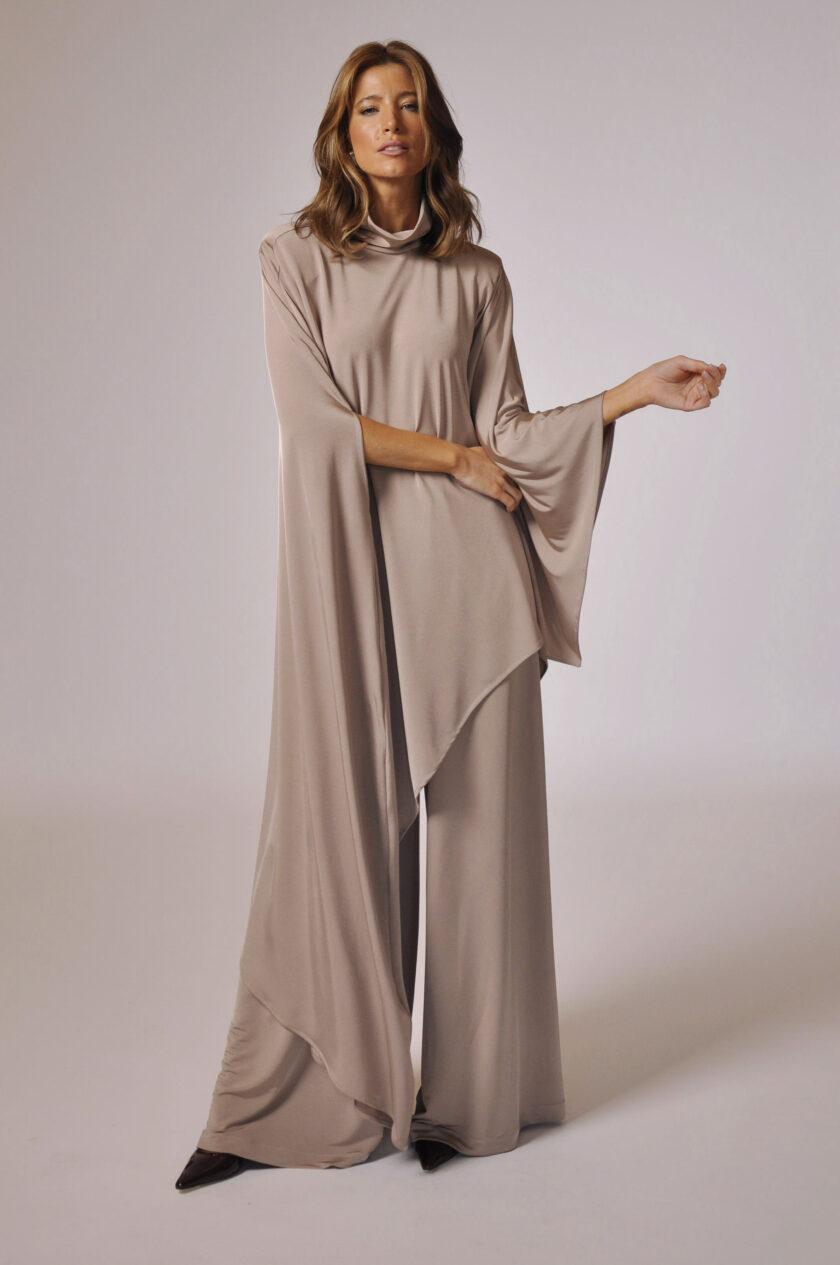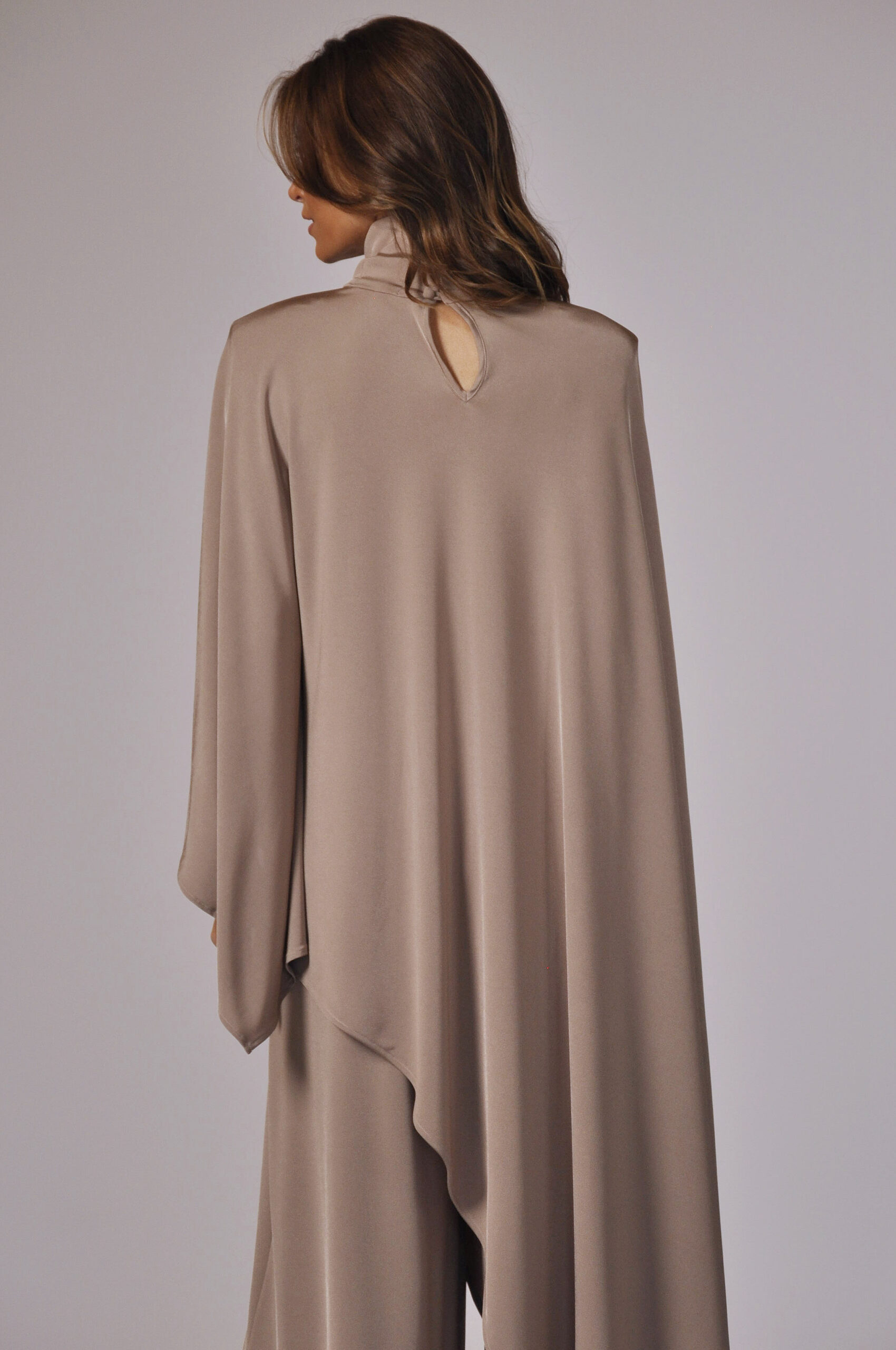 TOP SENA ASSIMÉTRICO, GOLA ALTA COM BOTÕES ENCAPADOS.