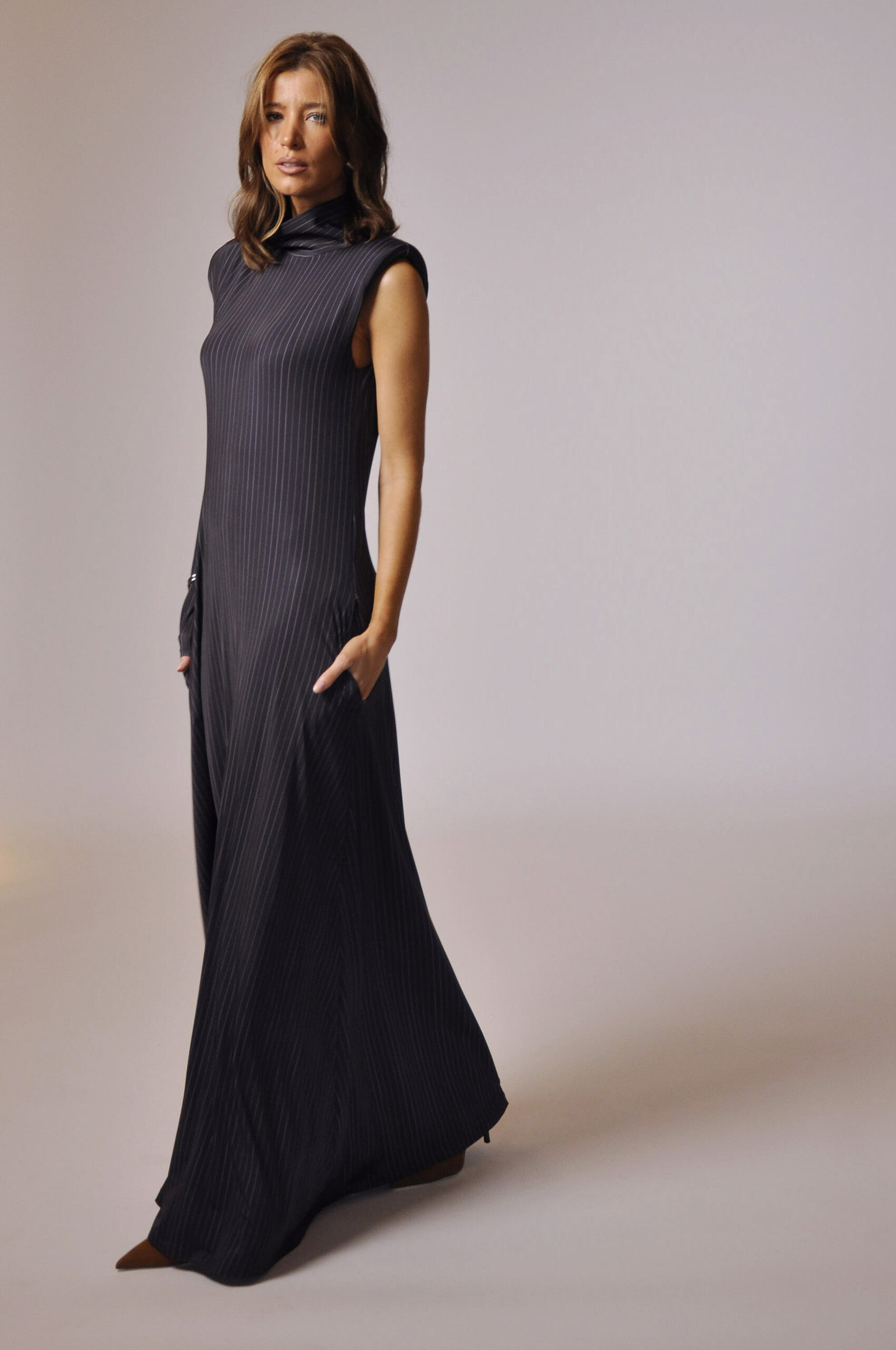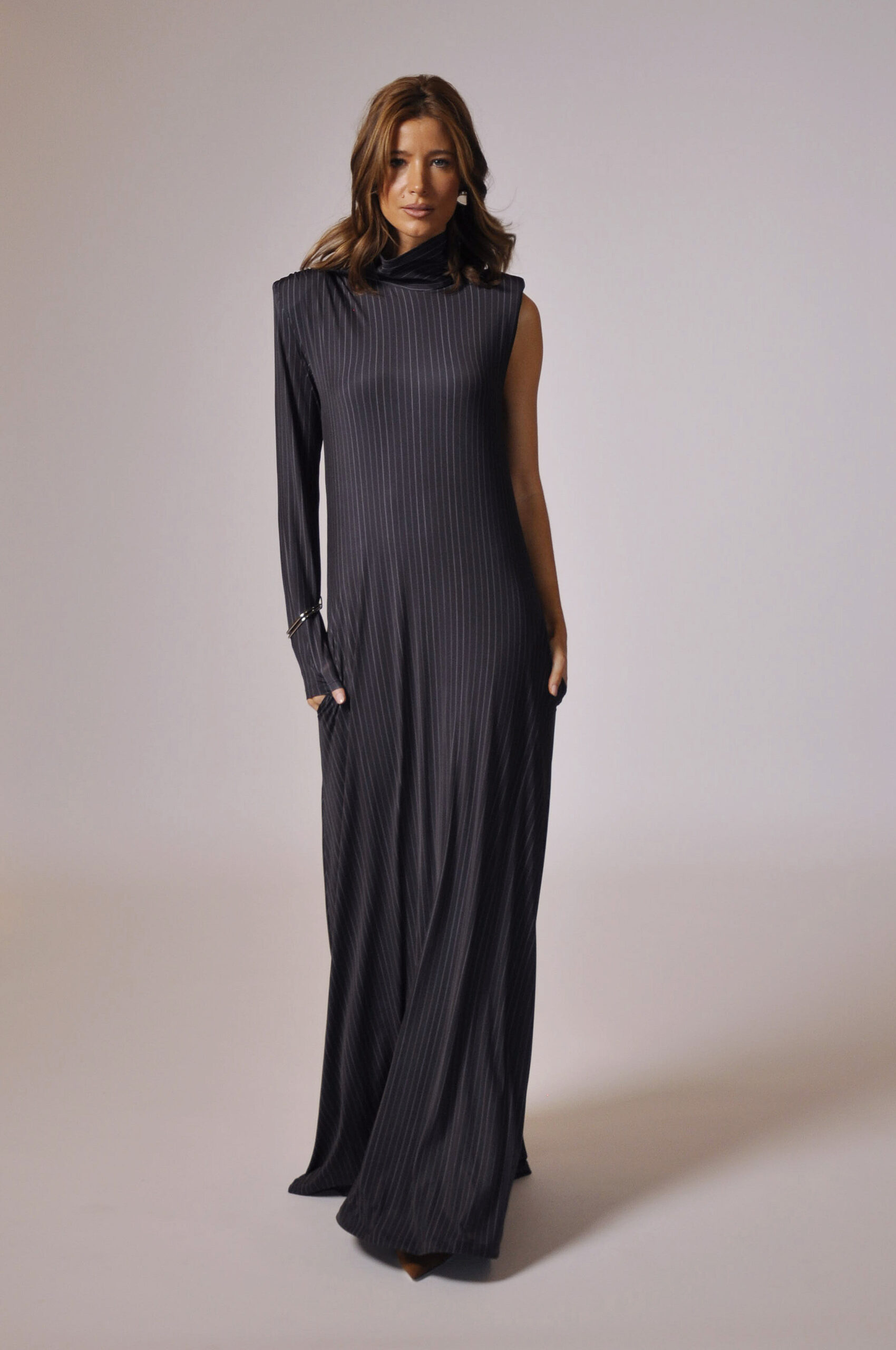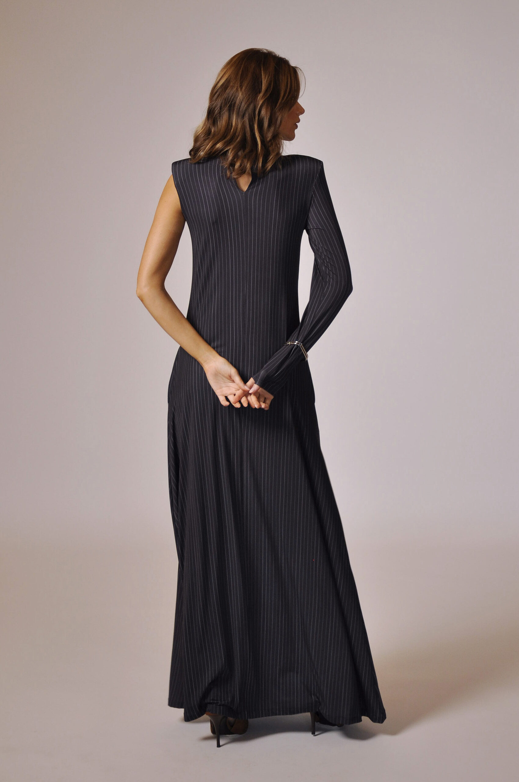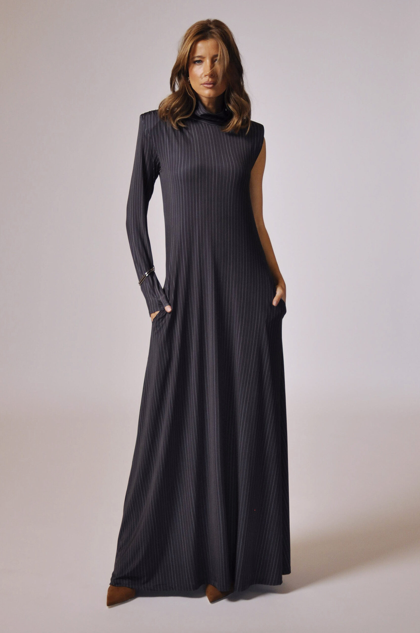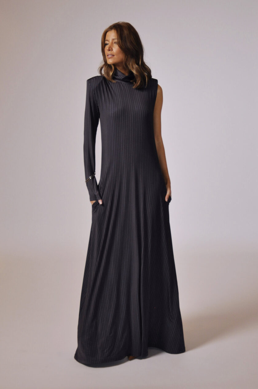 VESTIDO CROSS UM OMBRO SÓ COM OMBREIRAS, MANGA COM LUVINHA, GOLA ALTA E BOLSOS NAS LATERAIS.