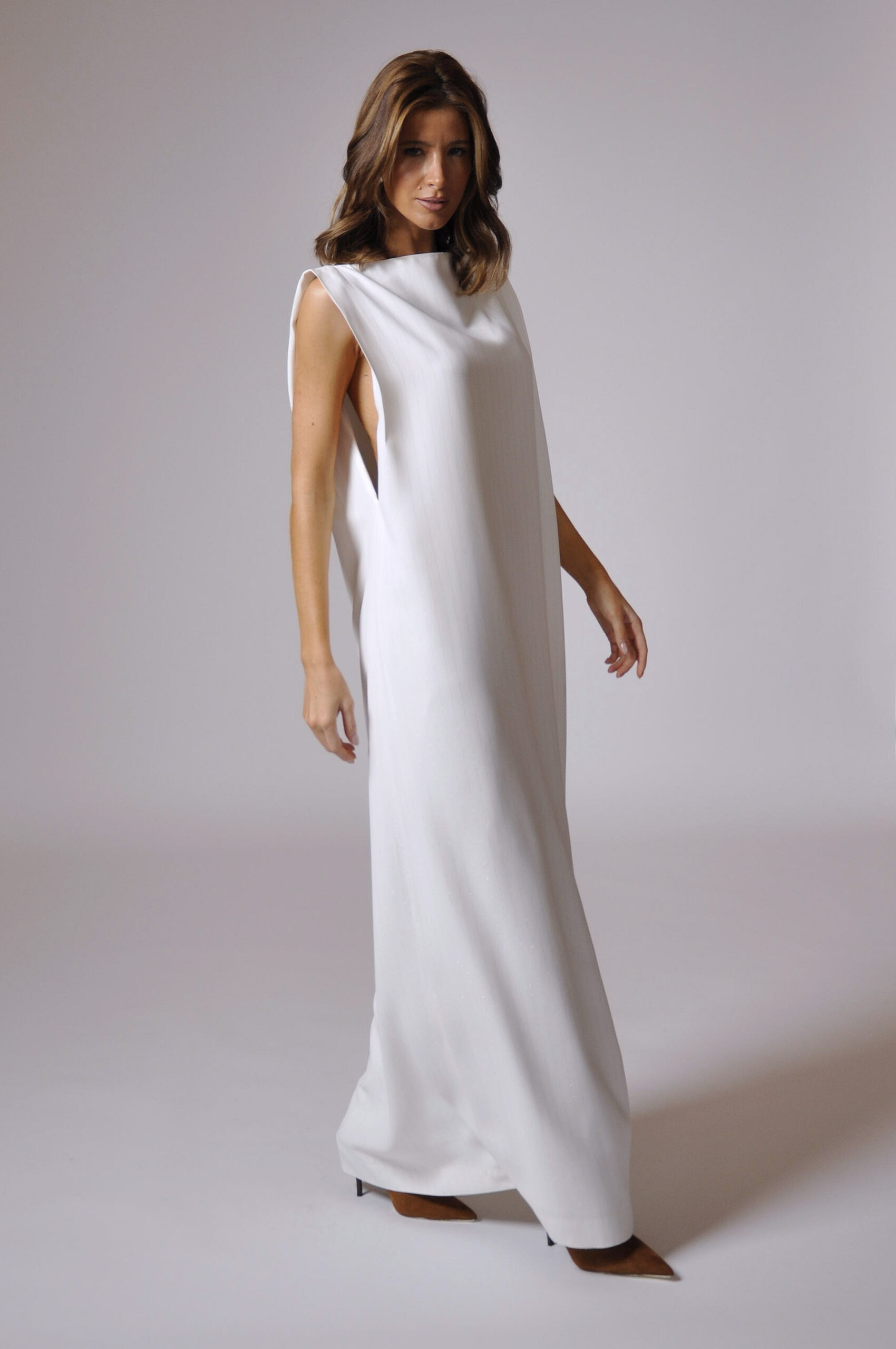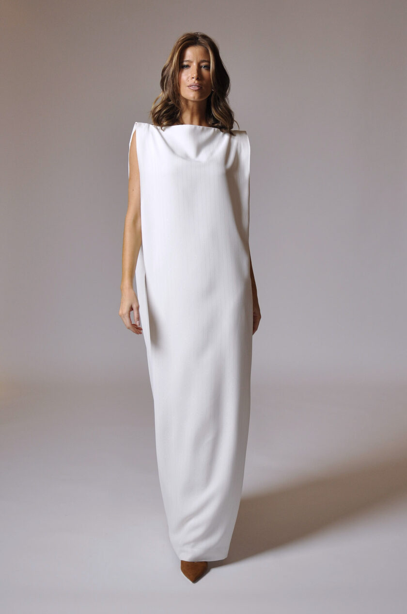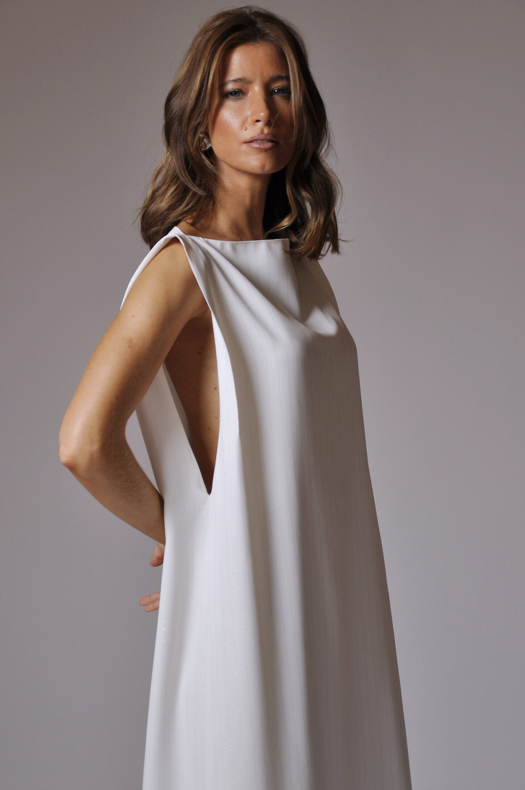 VESTIDO IRIS LONGO COM DECOTE RETO E CAVA PROFUNDA.