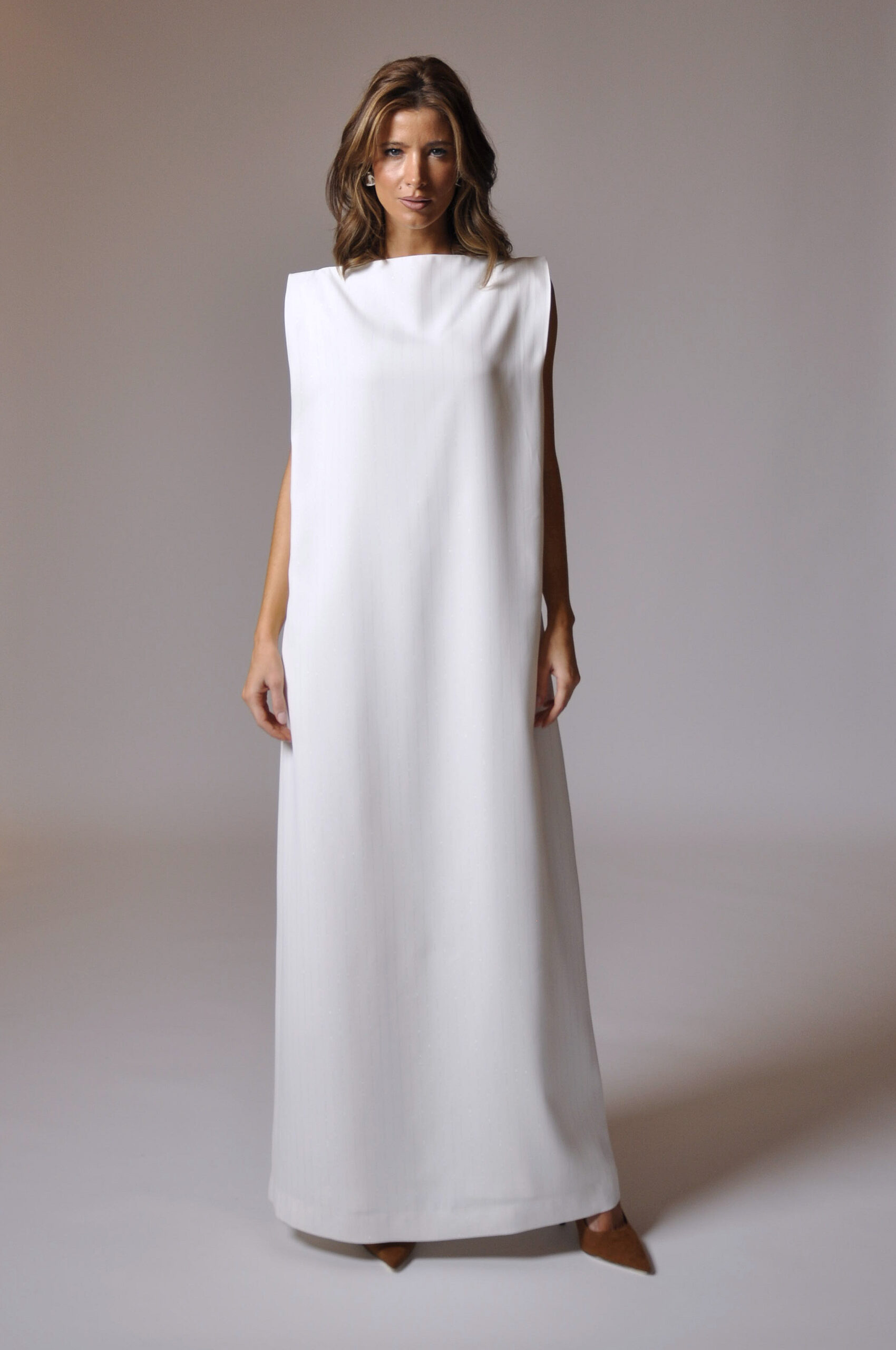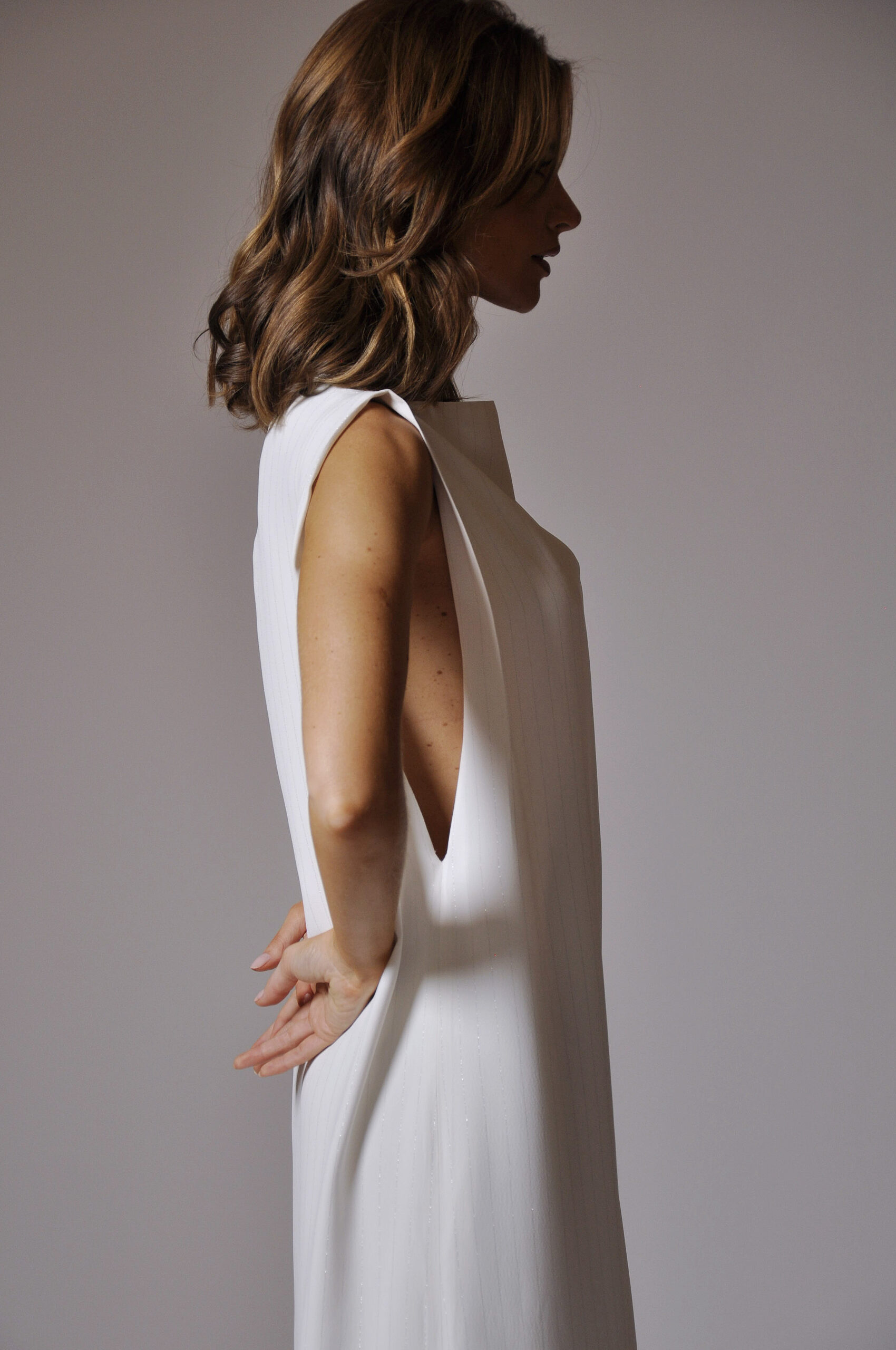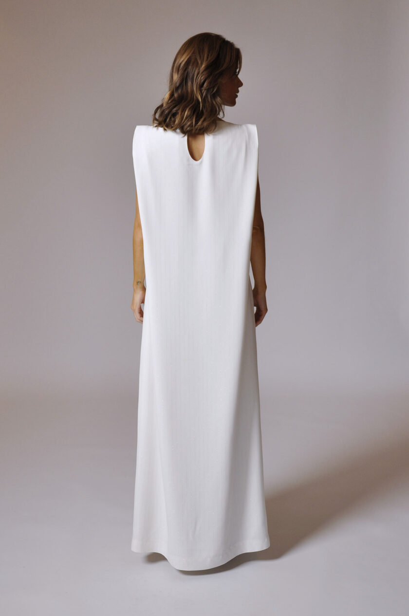 VESTIDO IRIS LONGO COM DECOTE RETO E CAVA PROFUNDA.