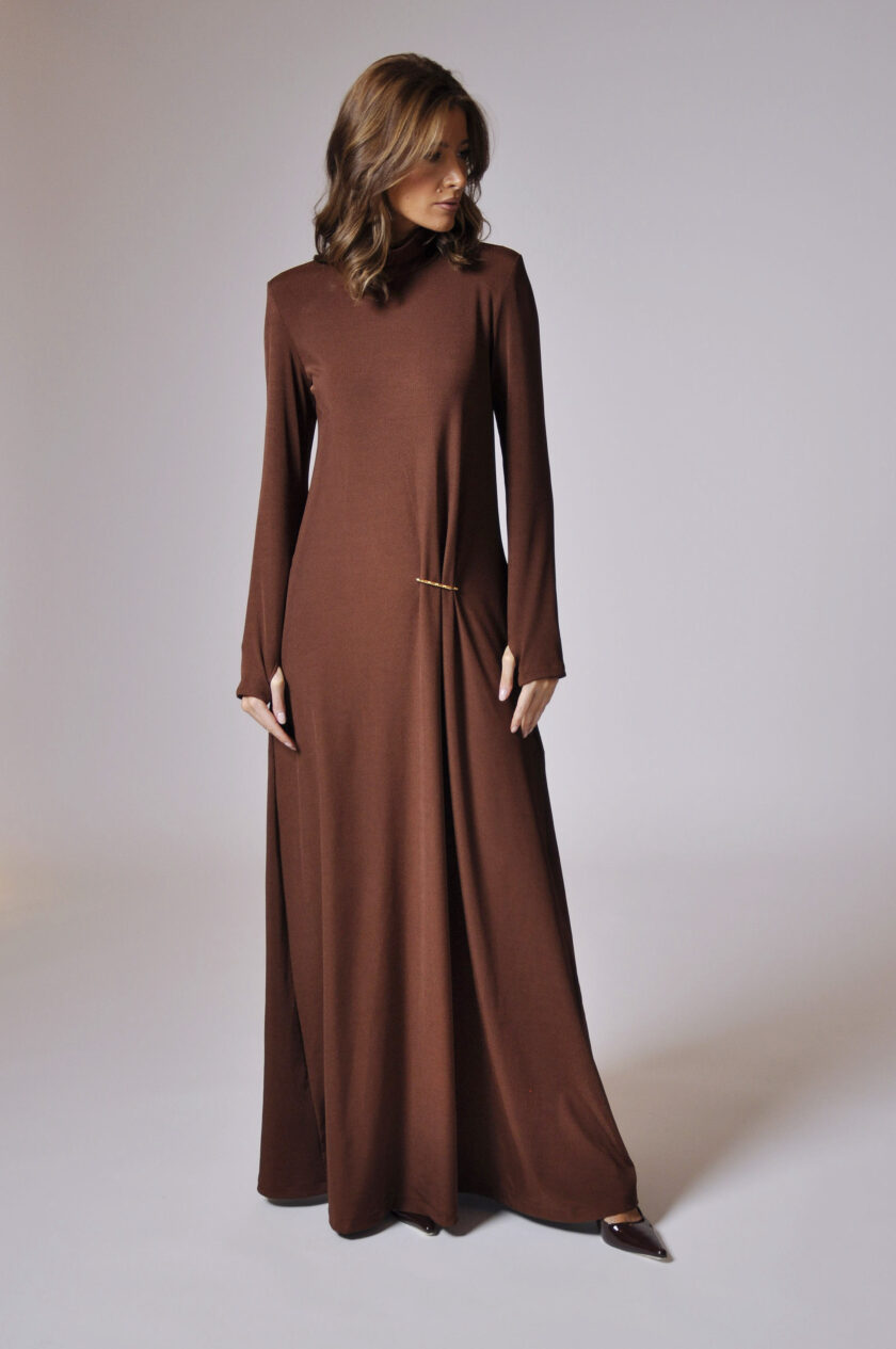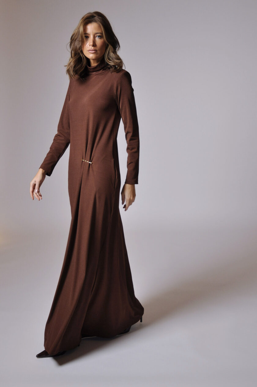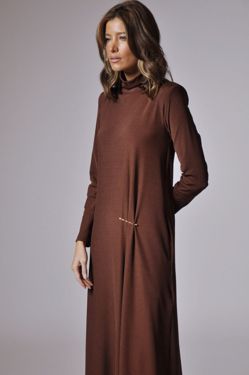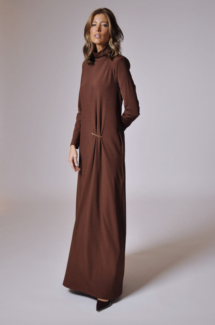 VESTIDO SANDRO LONGO, MANGA LONGA COM LUVINHA, GOLA ALTA E BROCHE DE ALFINETE.