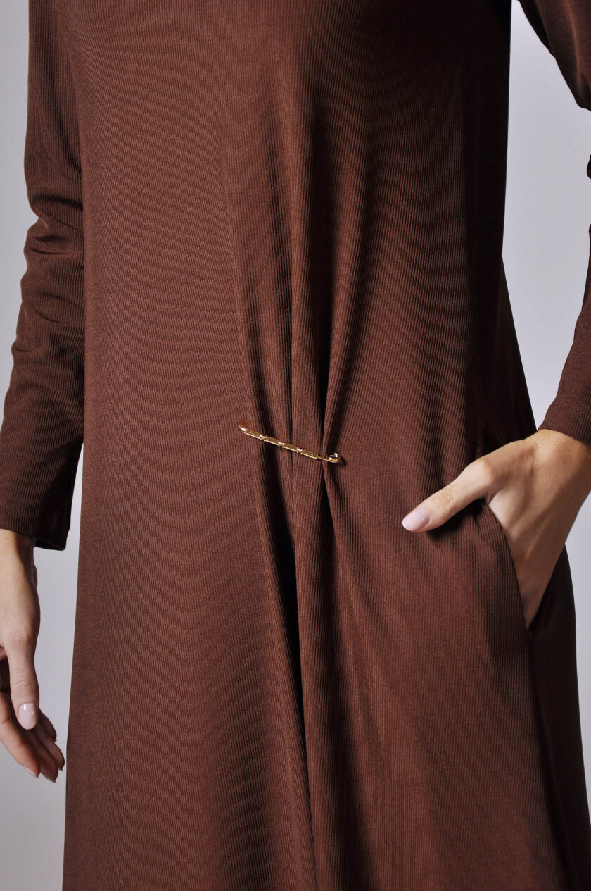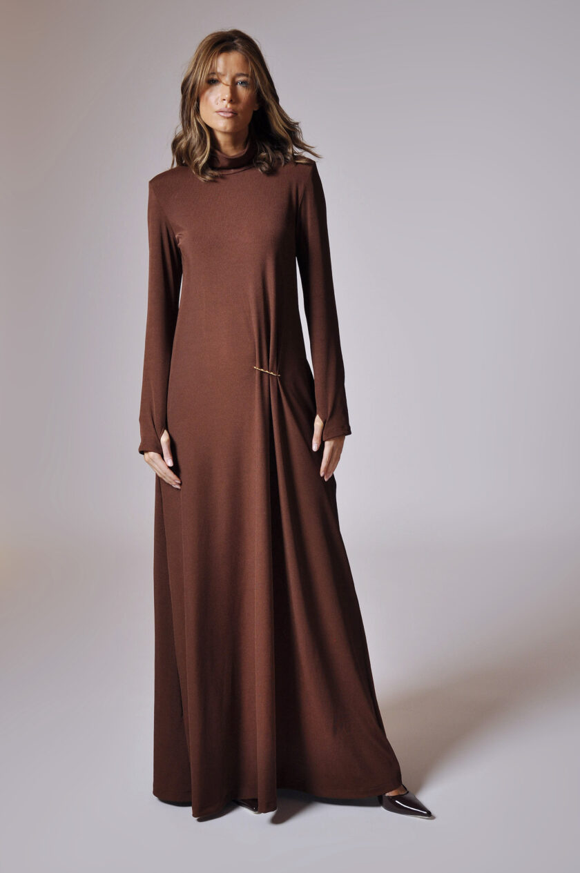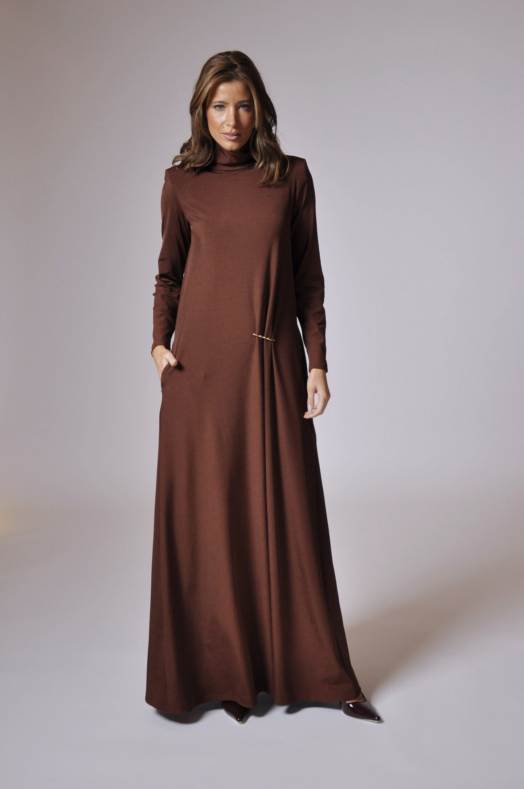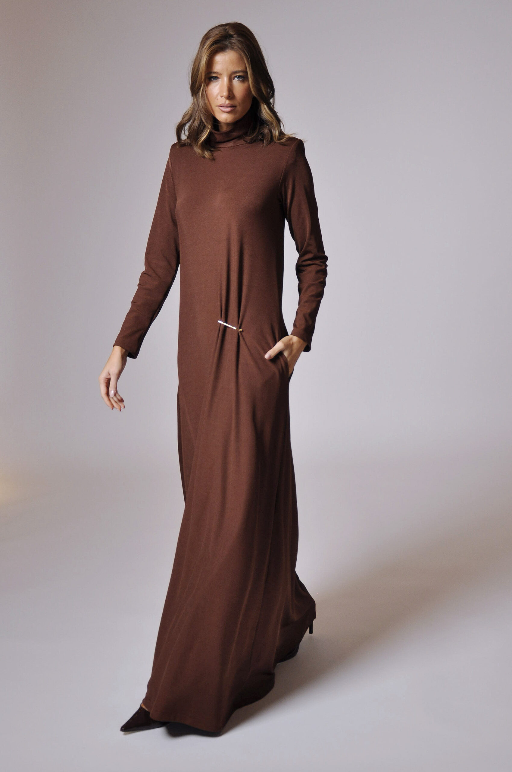 VESTIDO SANDRO LONGO, MANGA LONGA COM LUVINHA, GOLA ALTA E BROCHE DE ALFINETE.