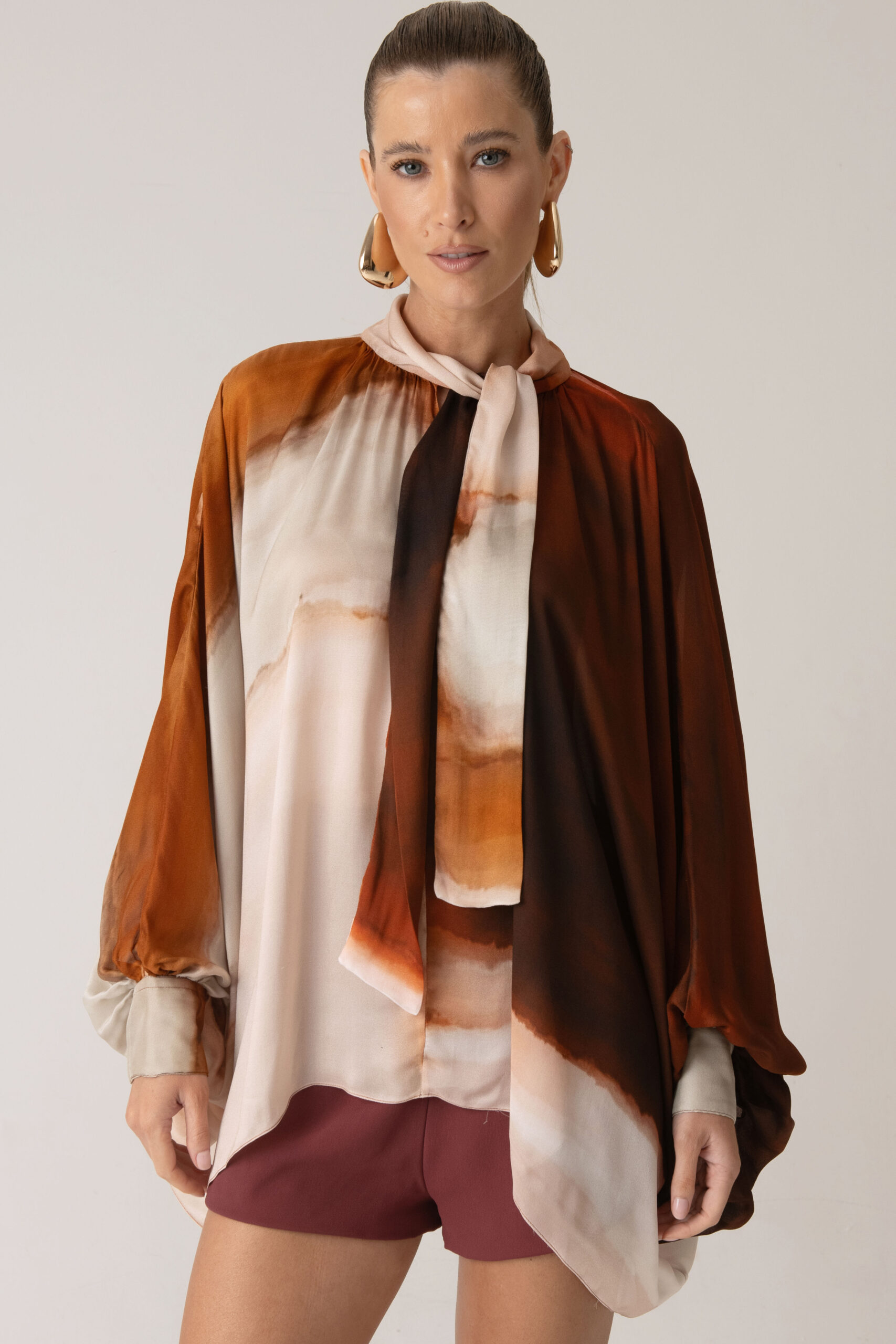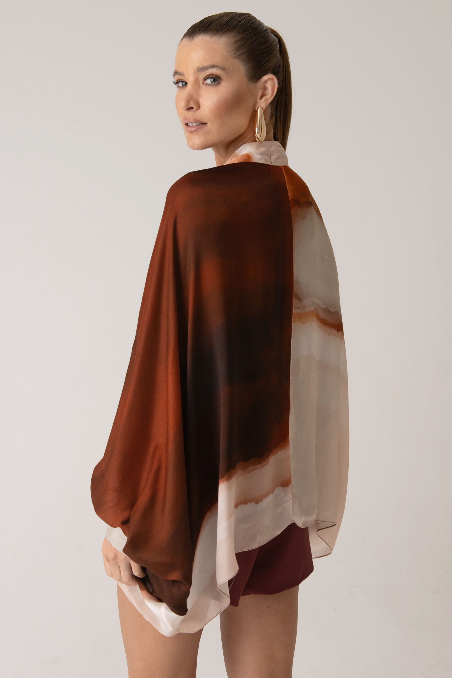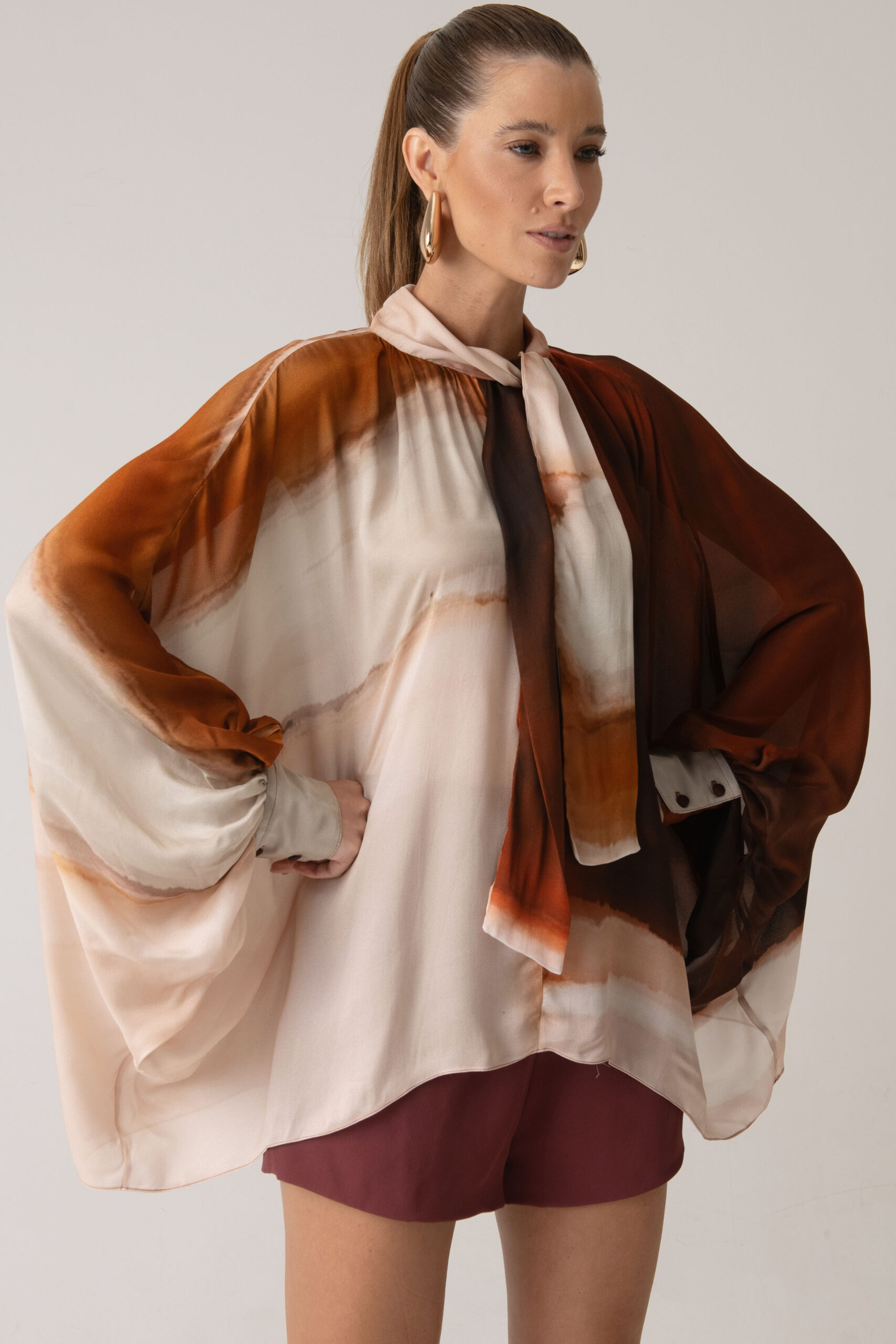 Possui gola com amarração, permitindo diferentes formas de uso, e mangas amplas que reforçam a proposta solta e elegante da peça.