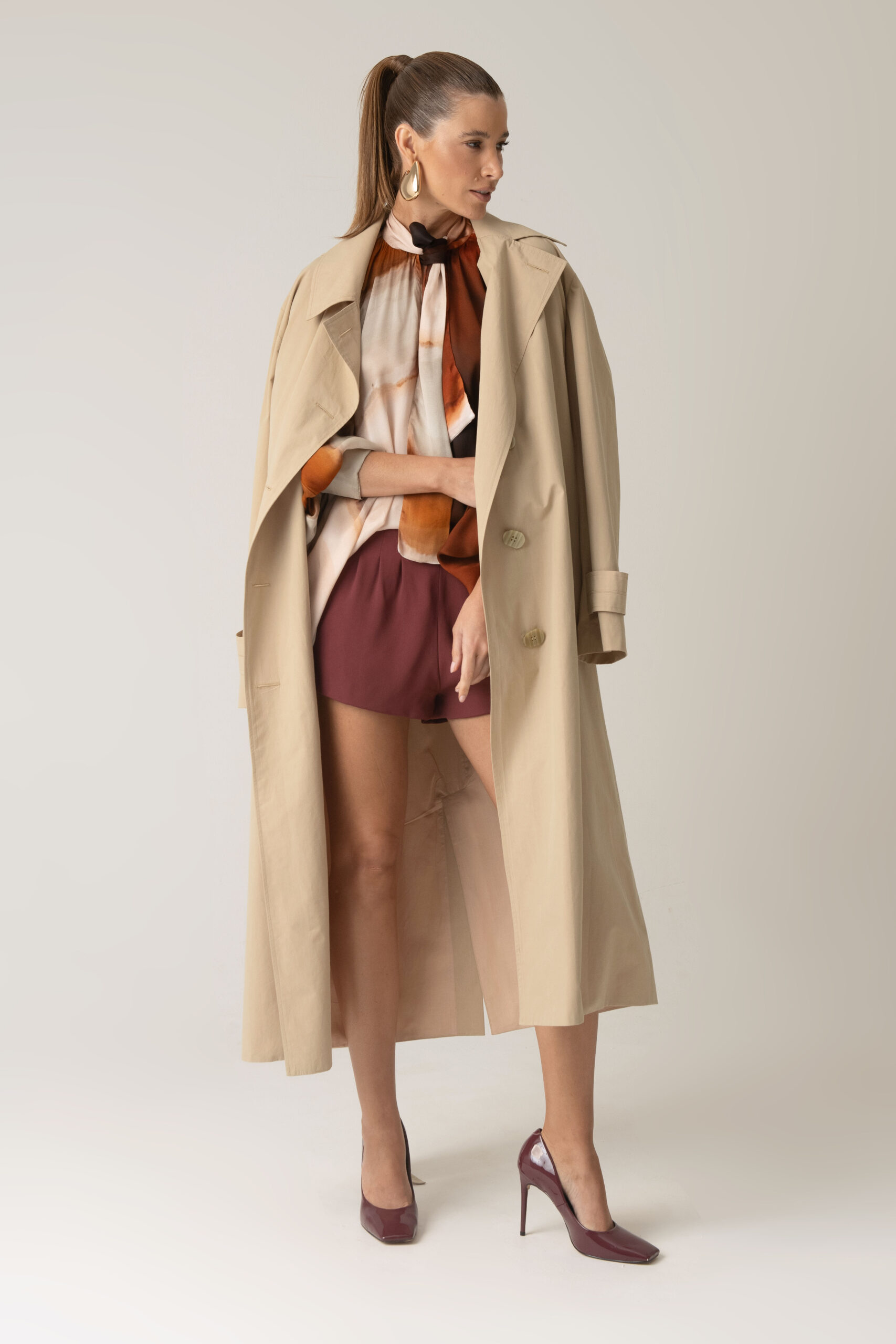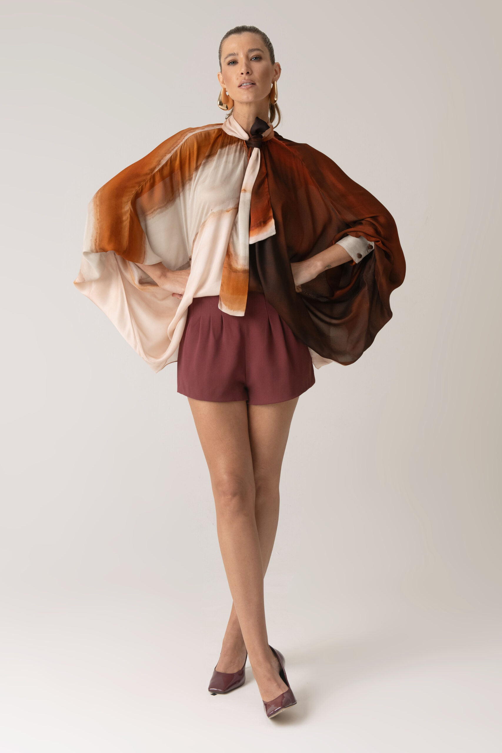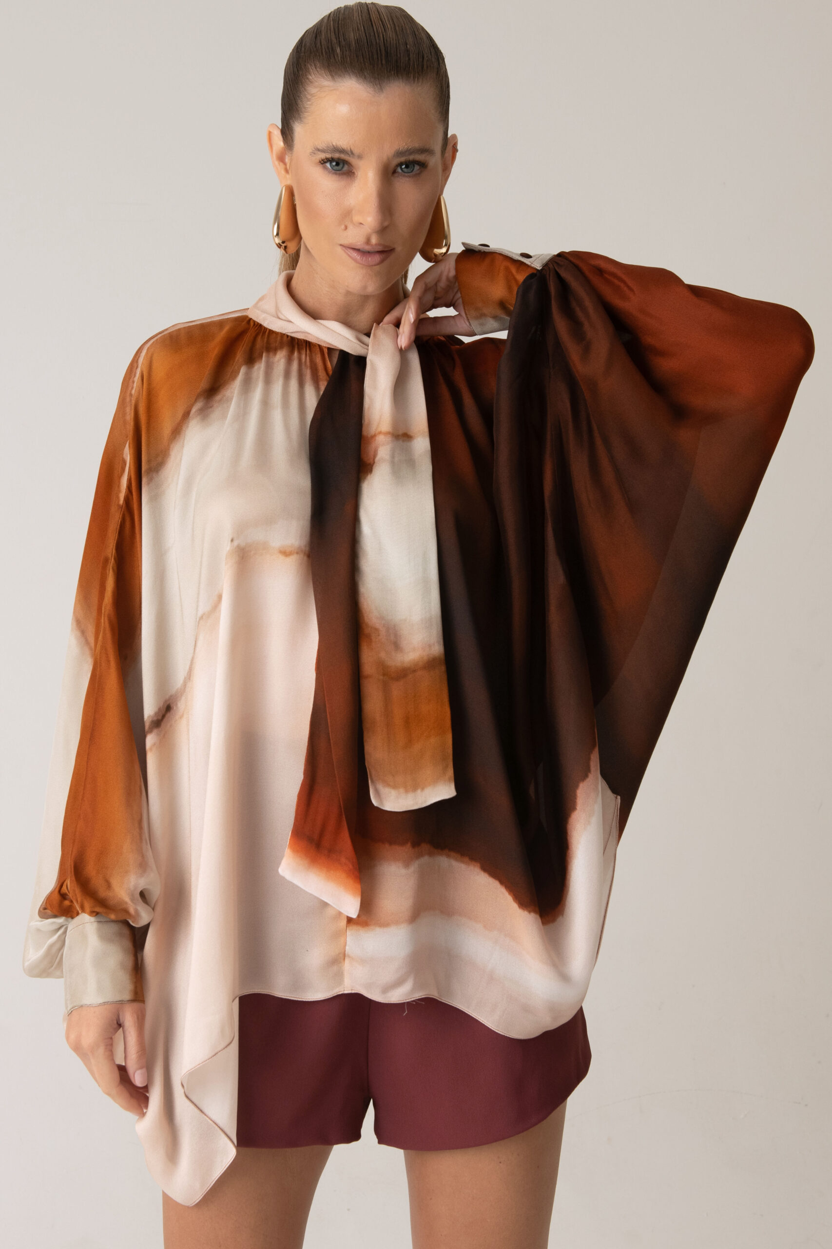 Possui gola com amarração, permitindo diferentes formas de uso, e mangas amplas que reforçam a proposta solta e elegante da peça.