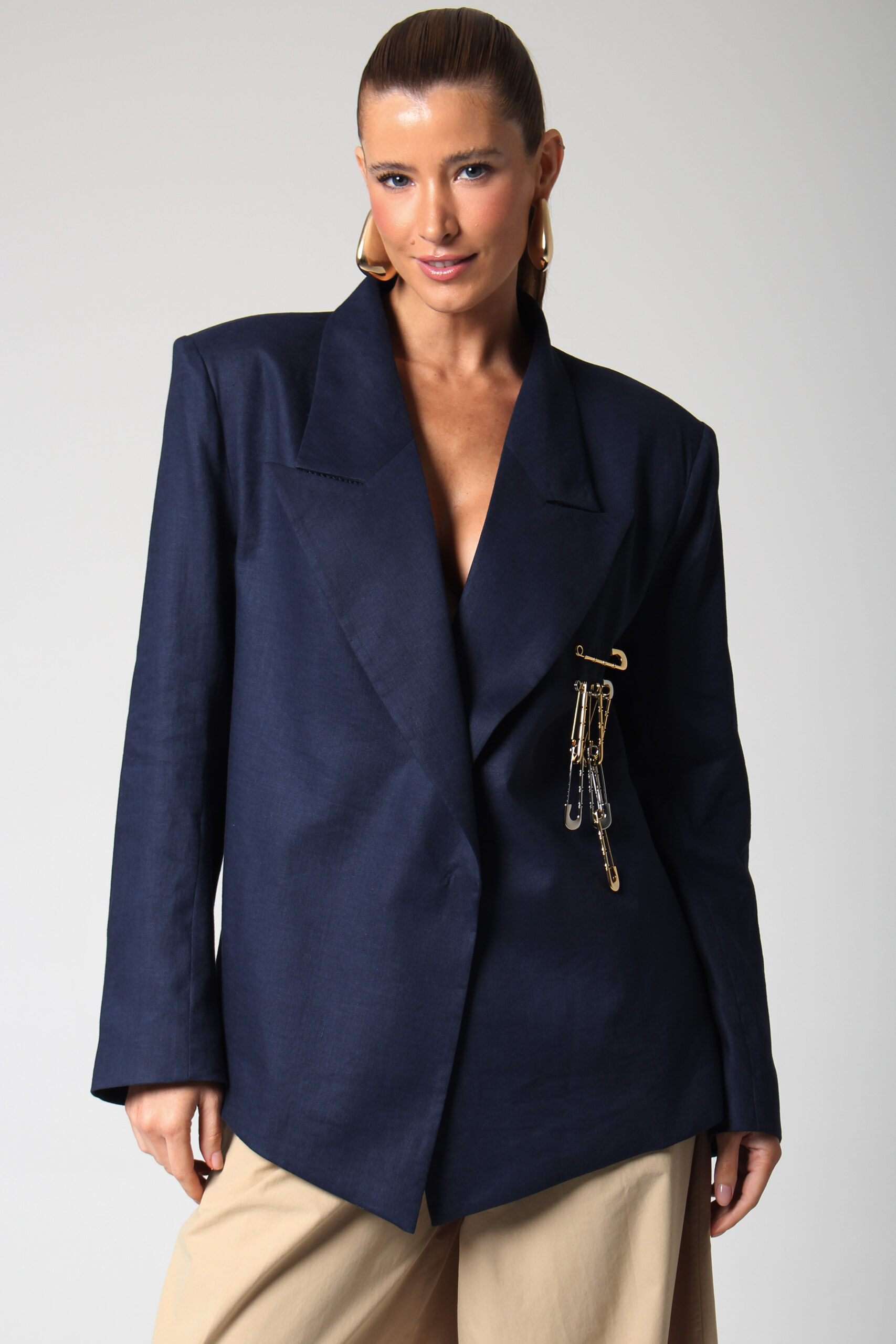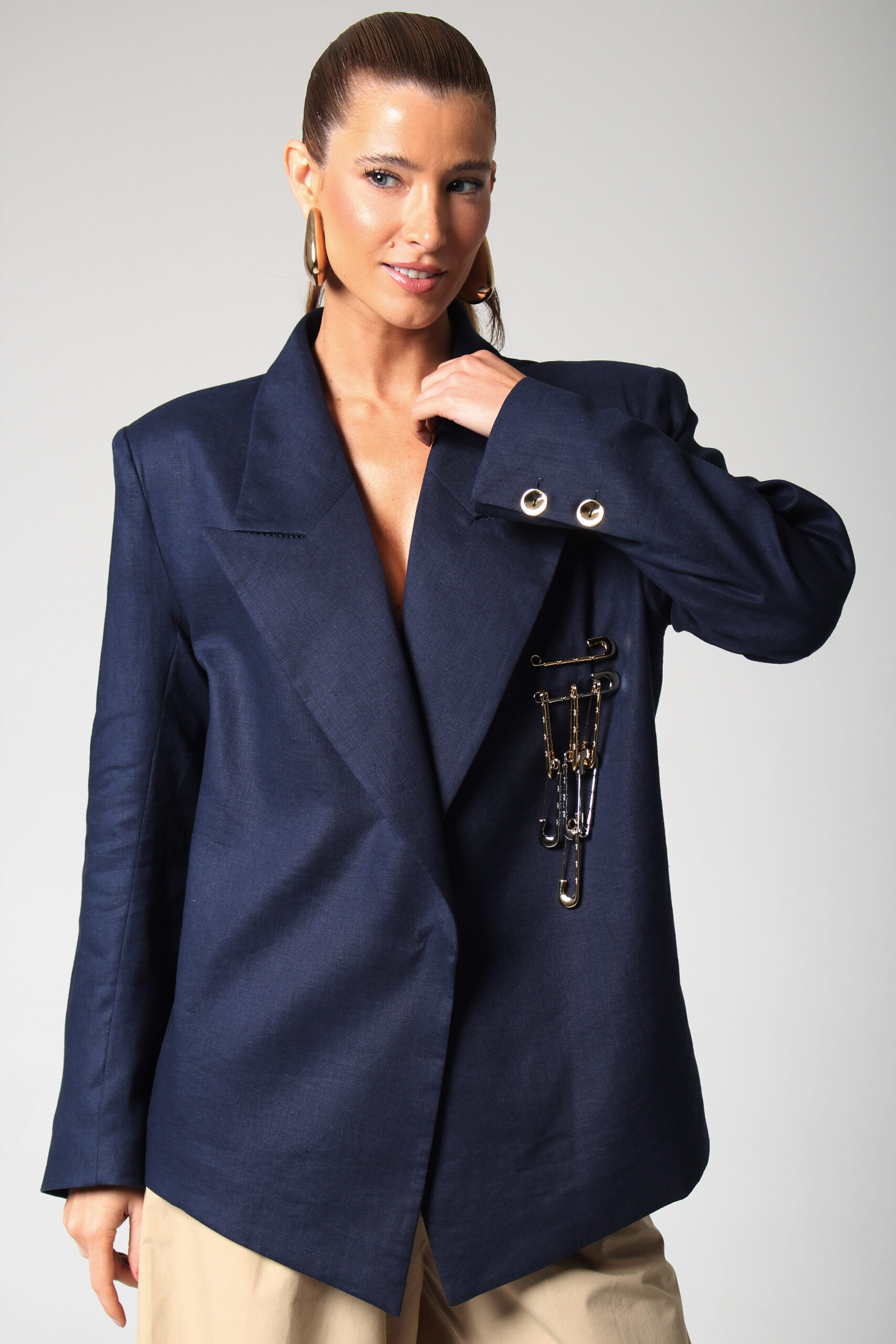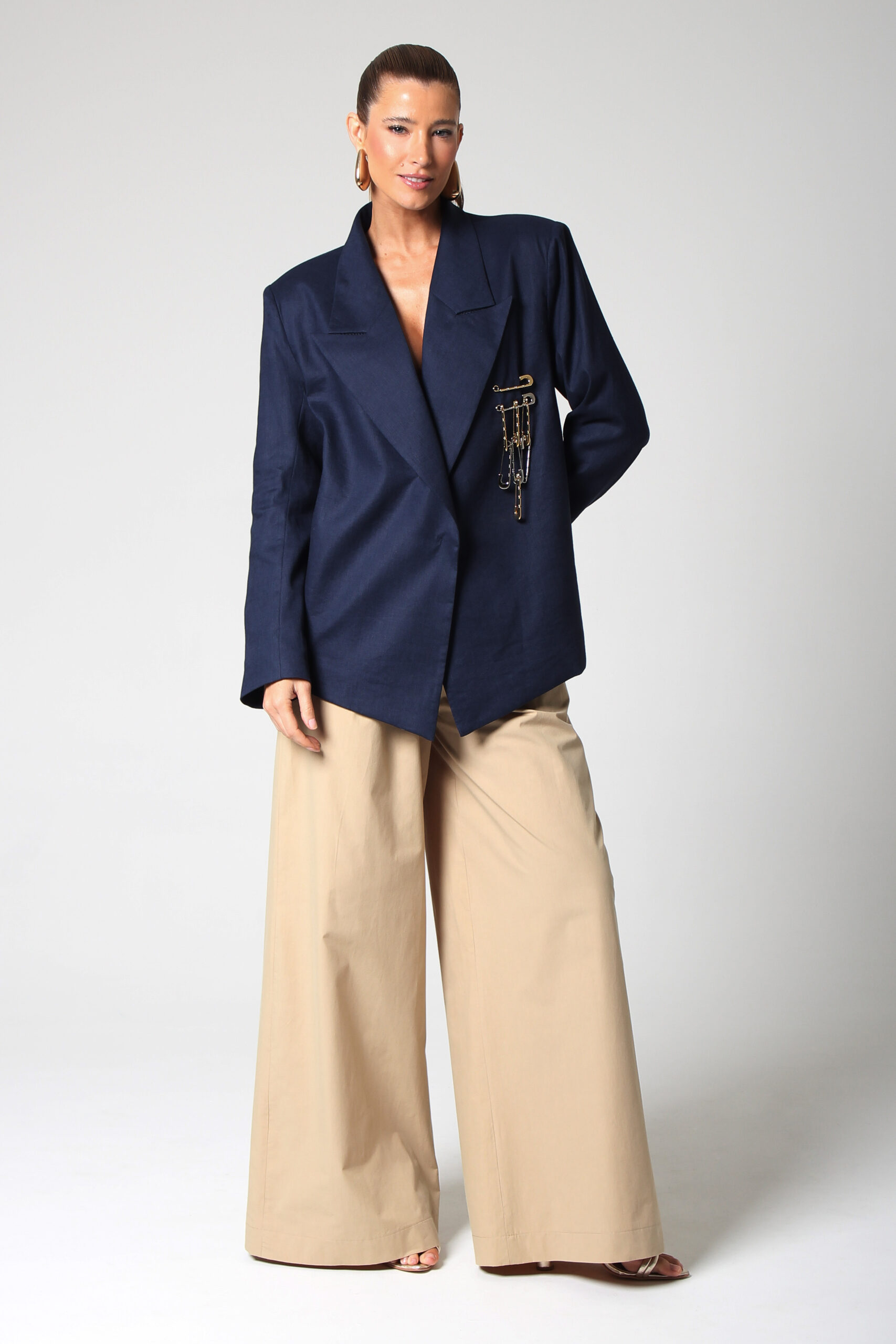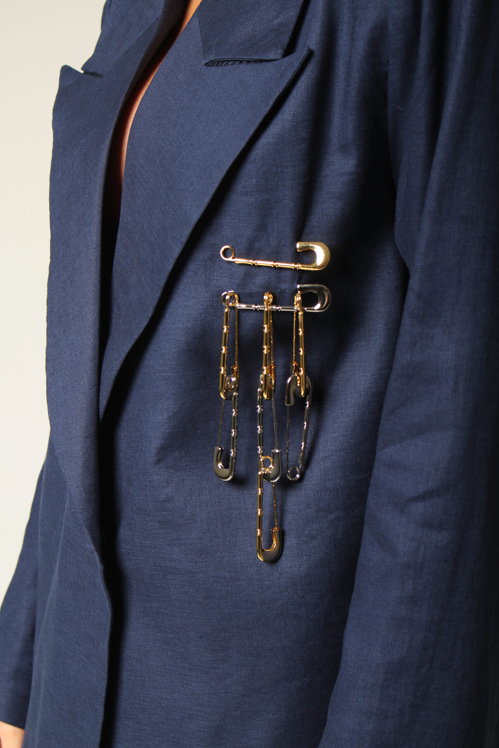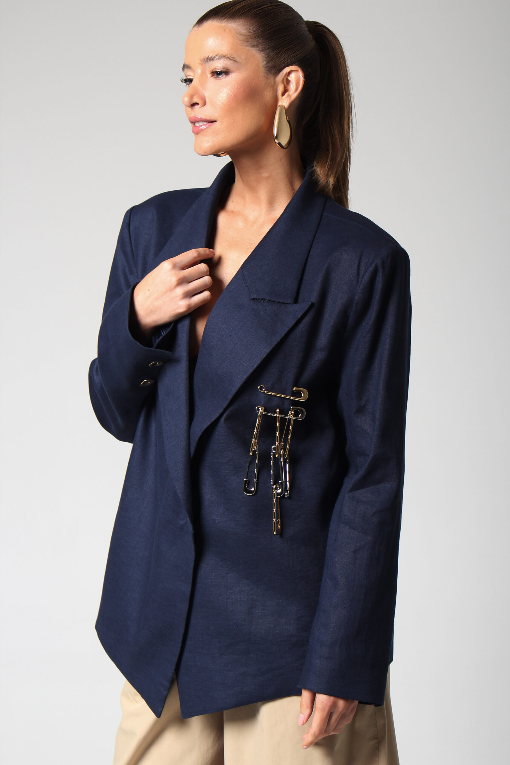 BLAZER CÂNTICO COM ASSIMETRIA NA PONTA, OMBREIRAS E BROCHE EM ALFINETES PRATA E DOURADO.