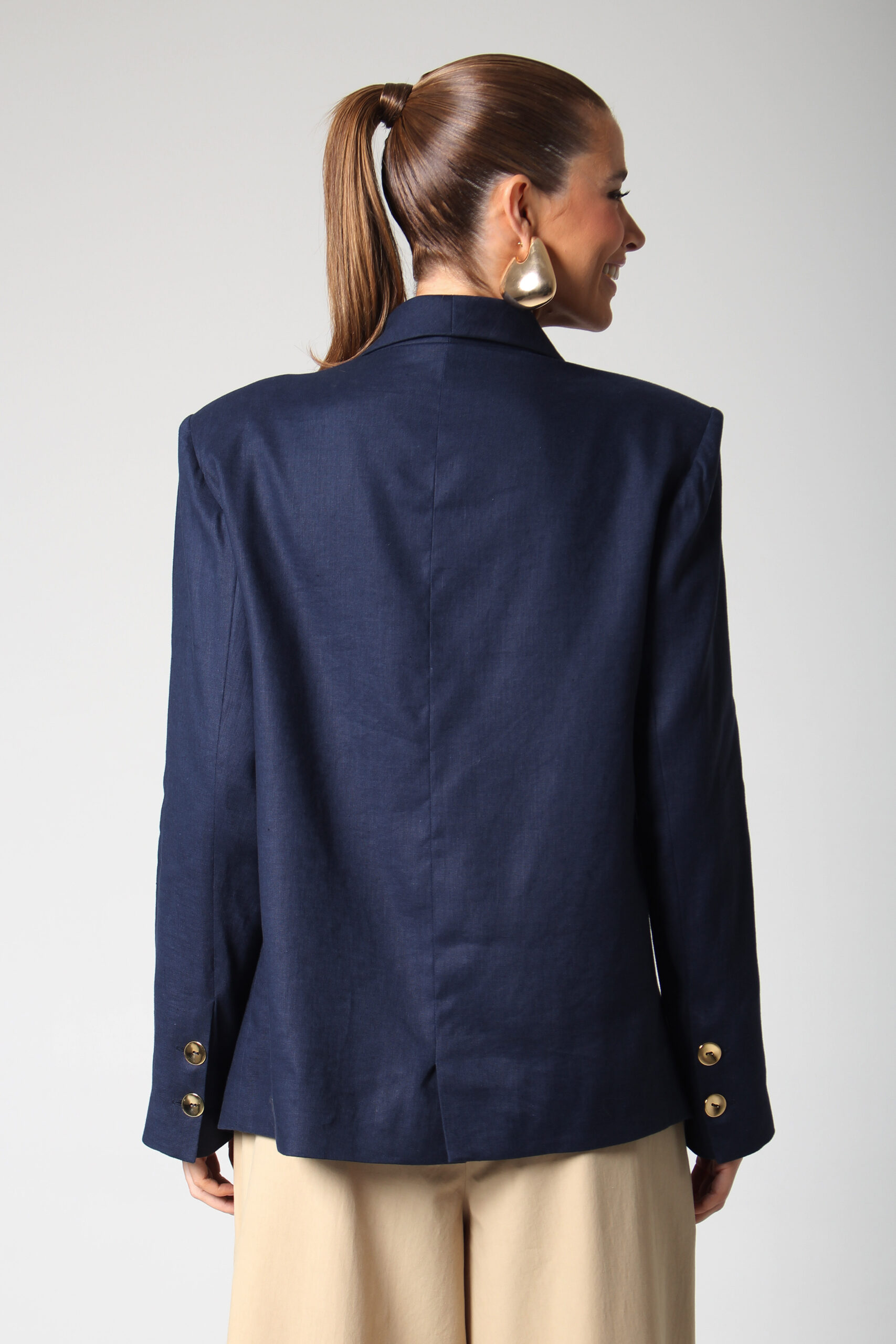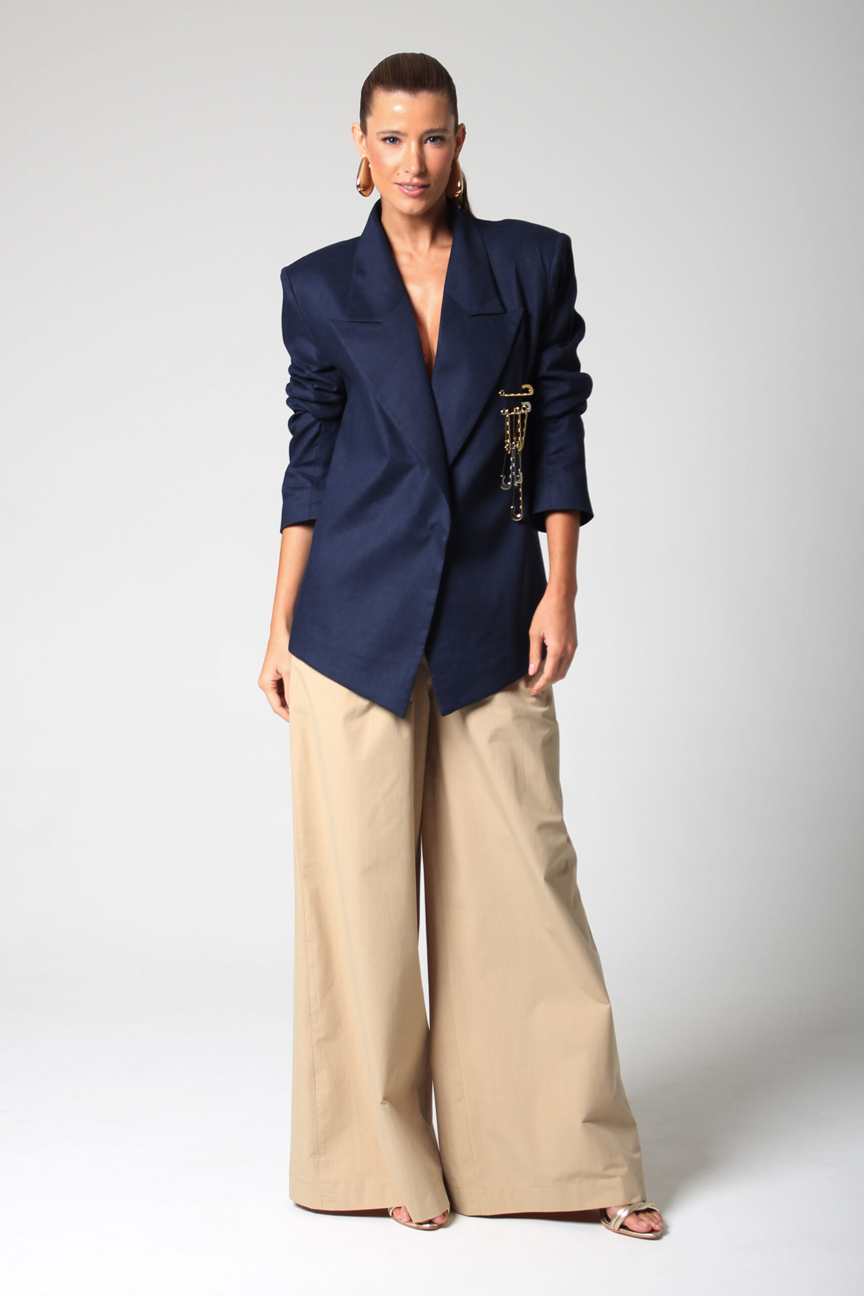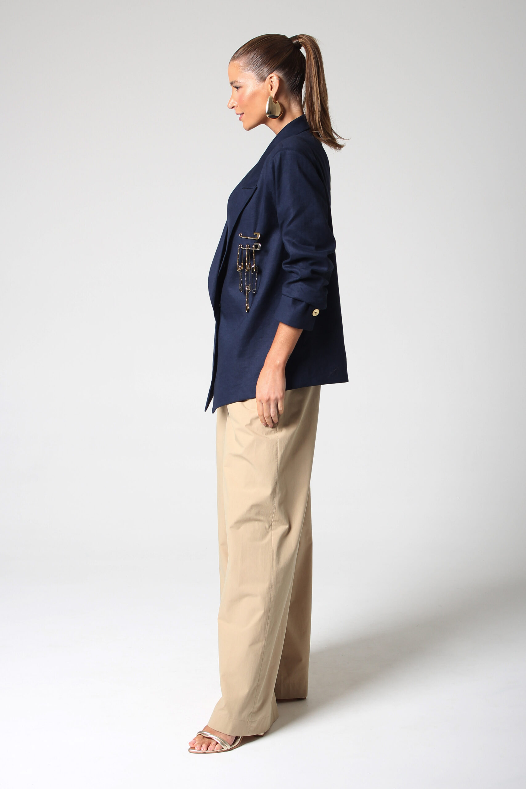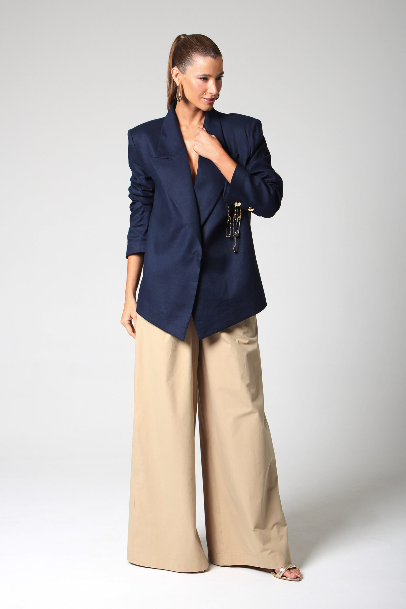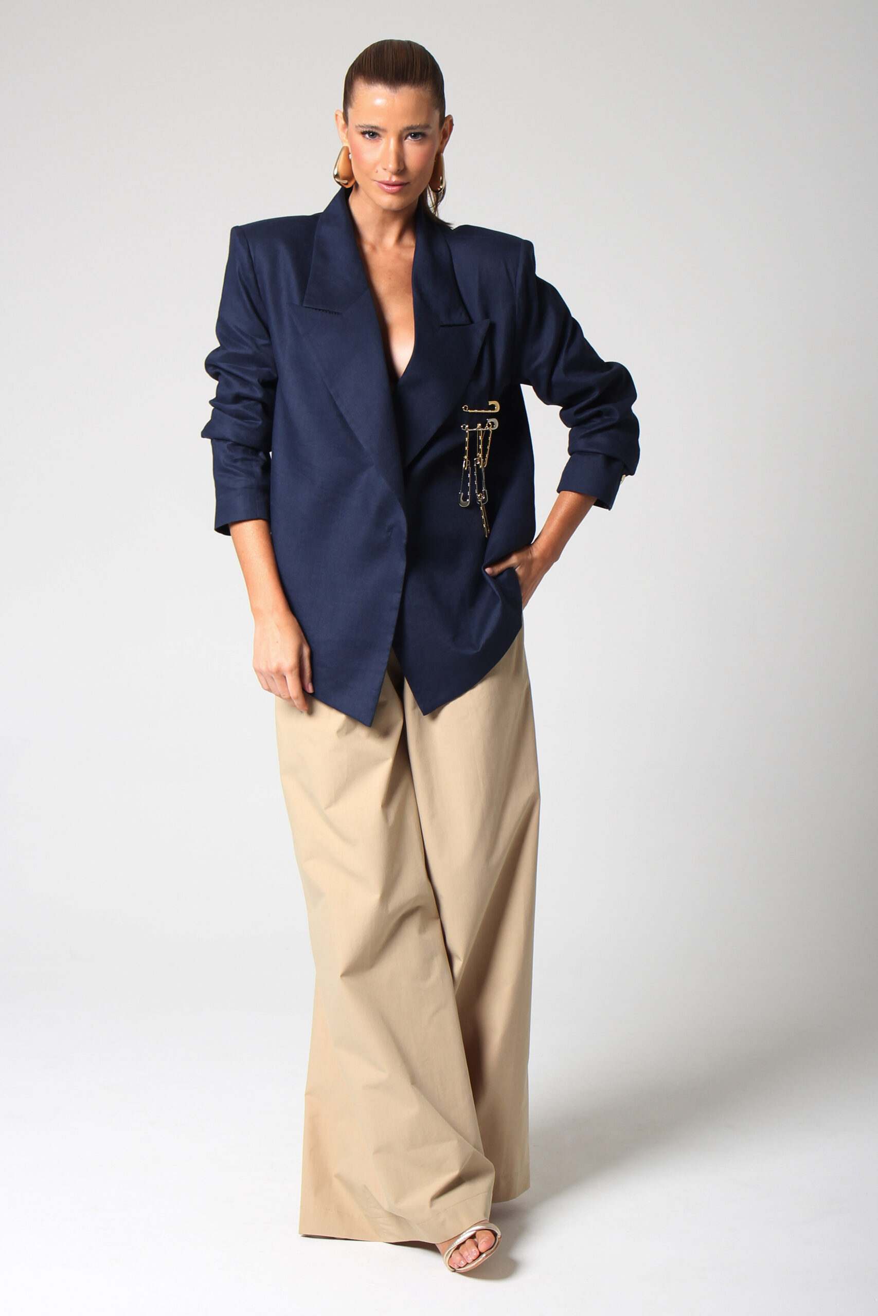 BLAZER CÂNTICO COM ASSIMETRIA NA PONTA, OMBREIRAS E BROCHE EM ALFINETES PRATA E DOURADO.