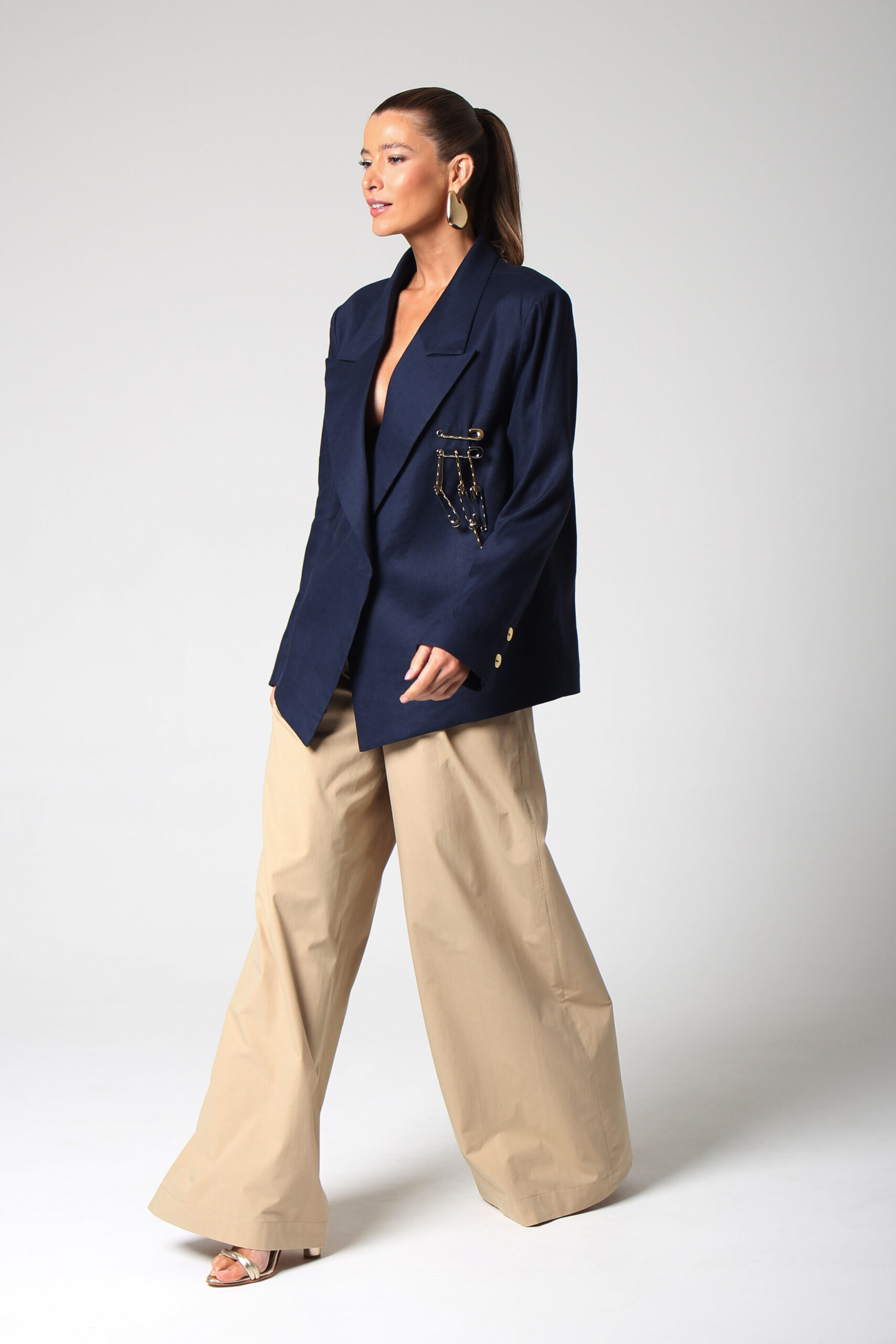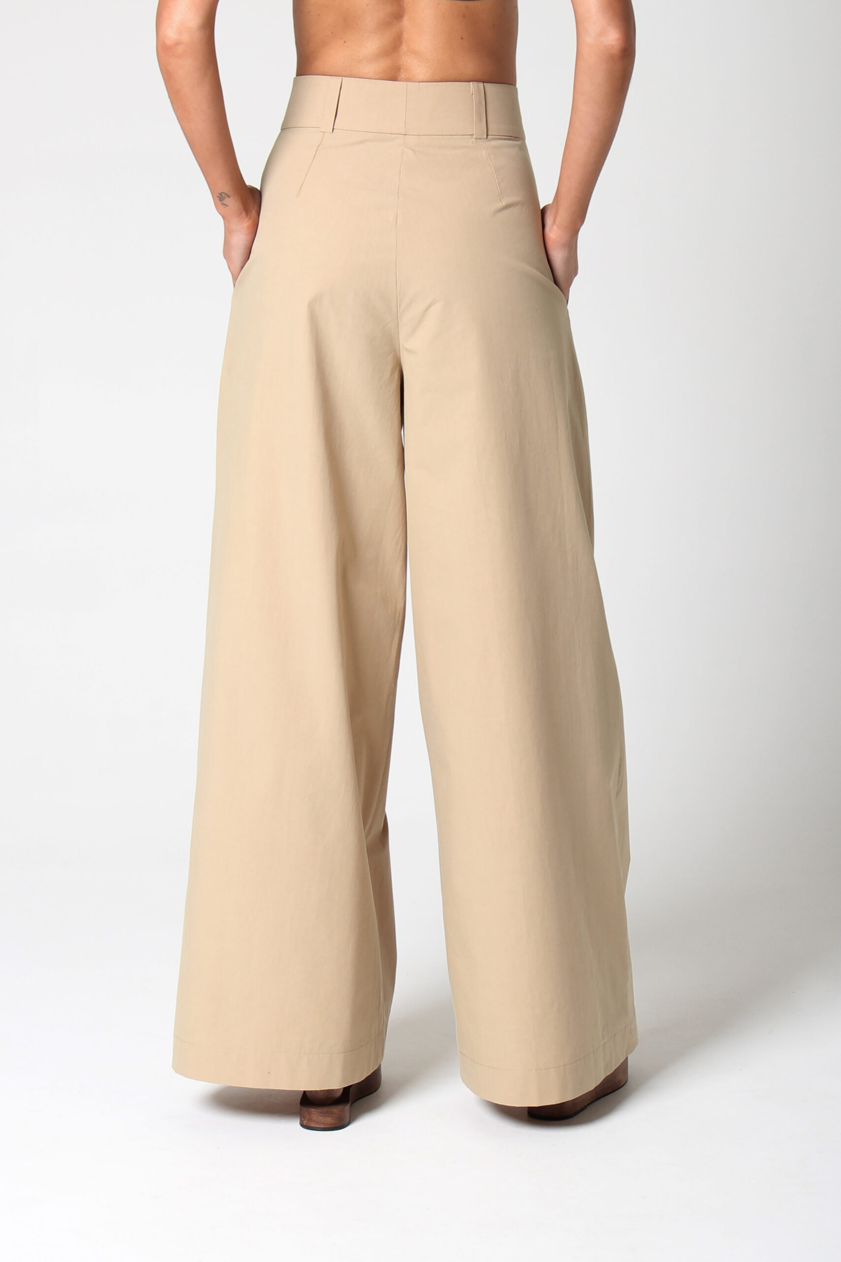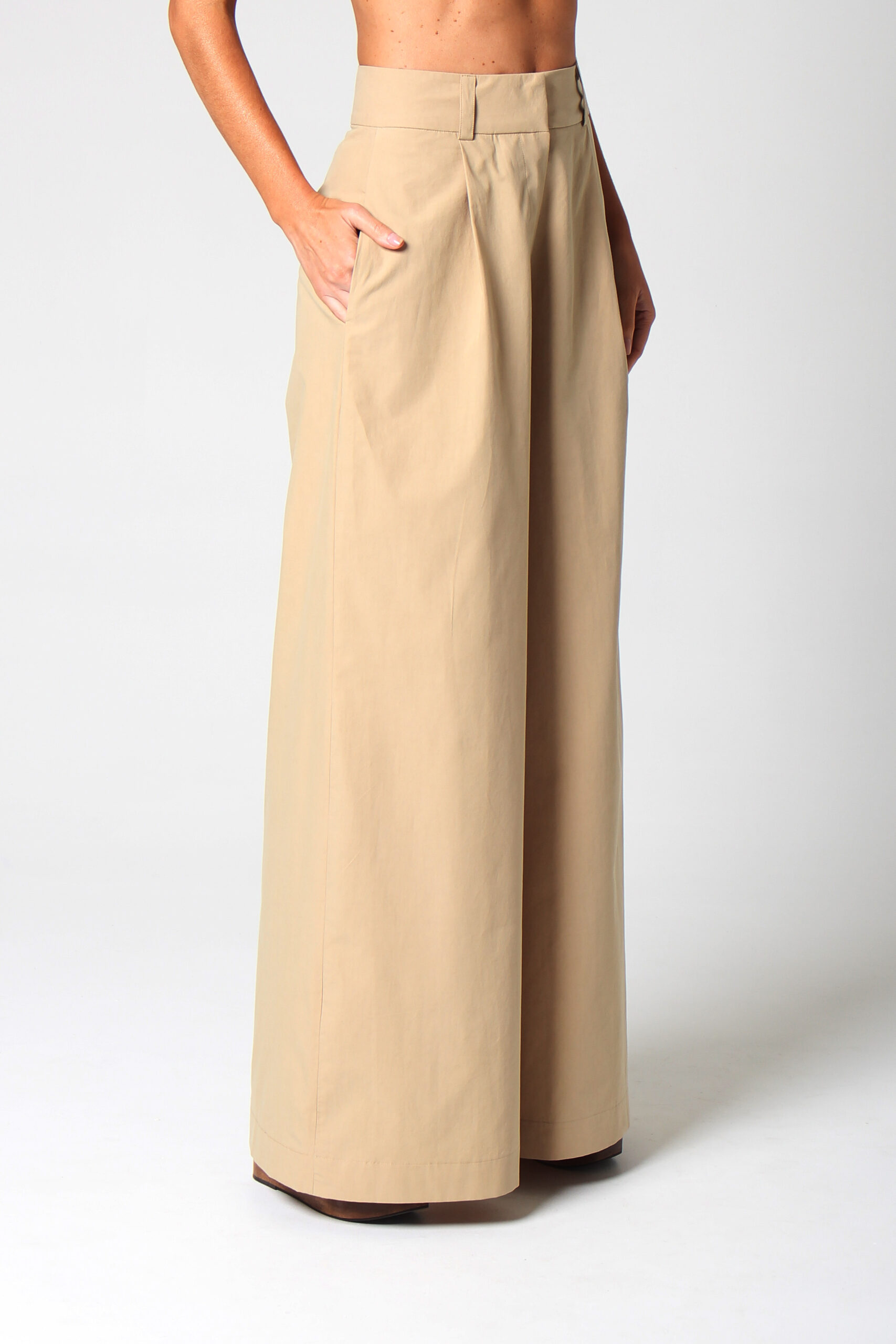 CALÇA ANCHOS RETA COM BOLSOS NAS LATERAIS E FECHAMENTO EM ZÍPER E GANCHO.