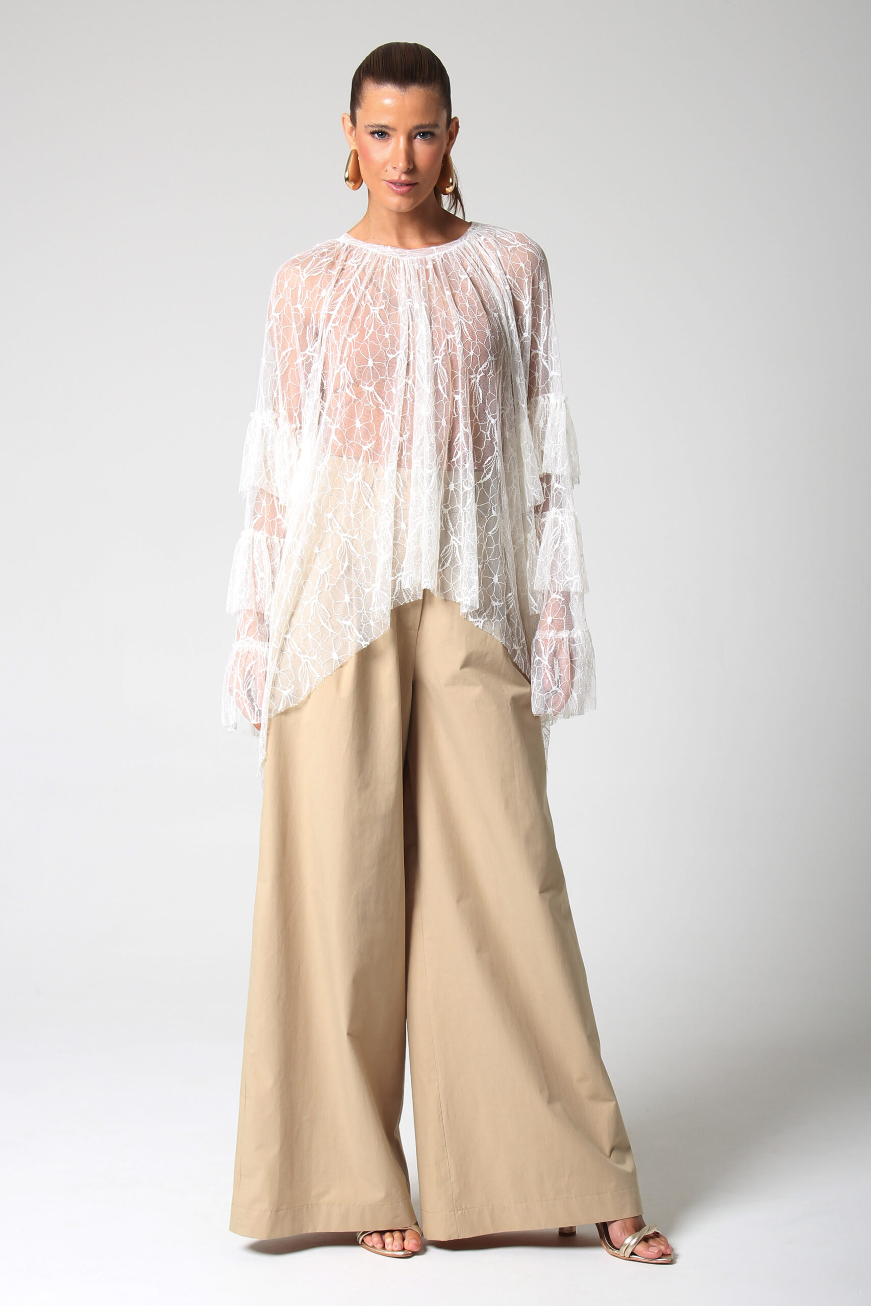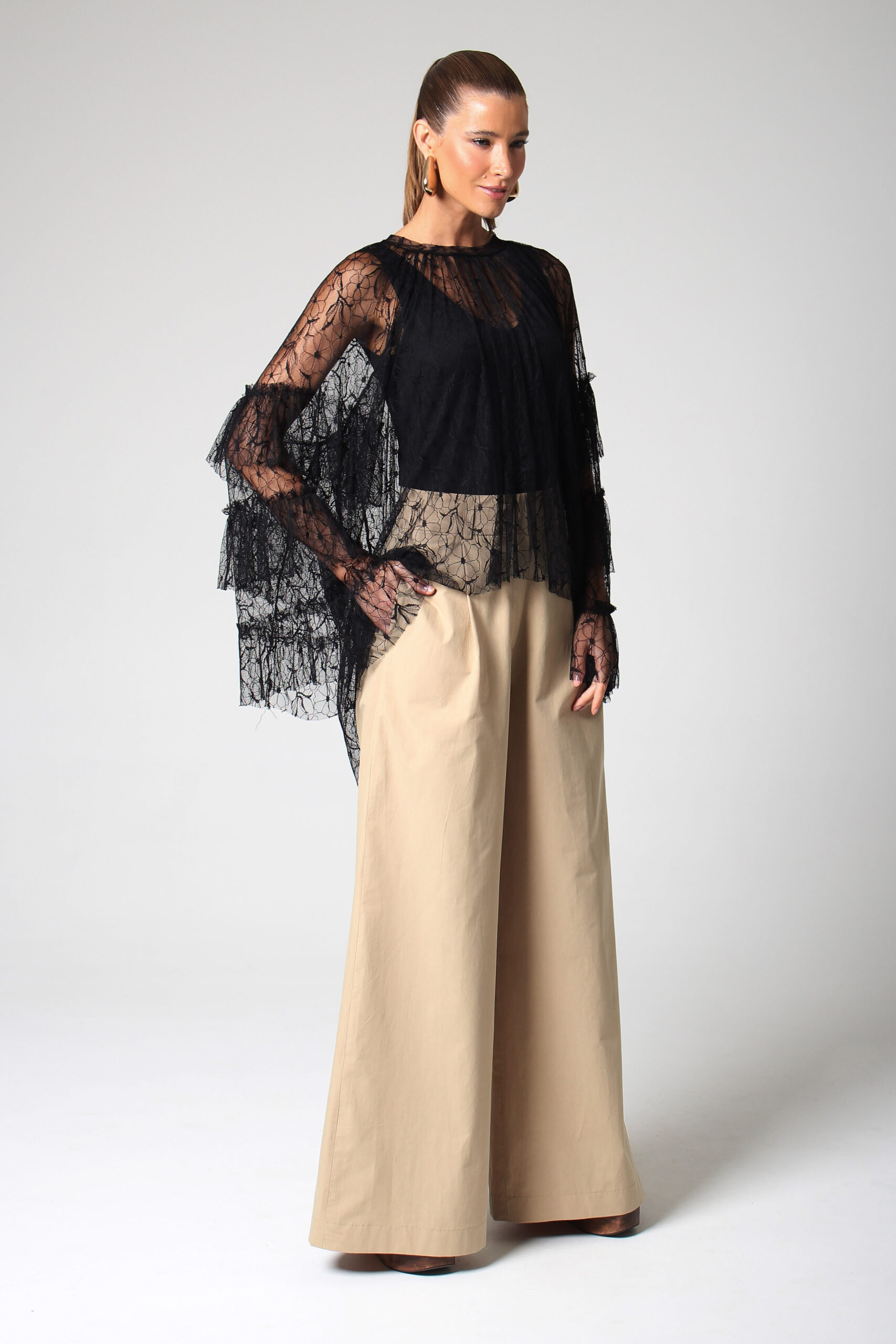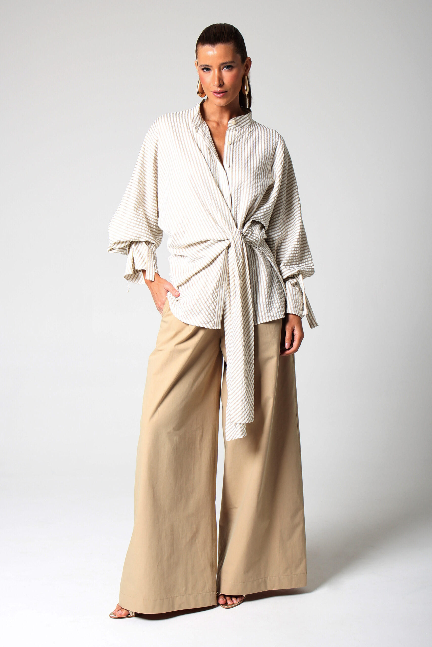 CALÇA ANCHOS RETA COM BOLSOS NAS LATERAIS E FECHAMENTO EM ZÍPER E GANCHO.