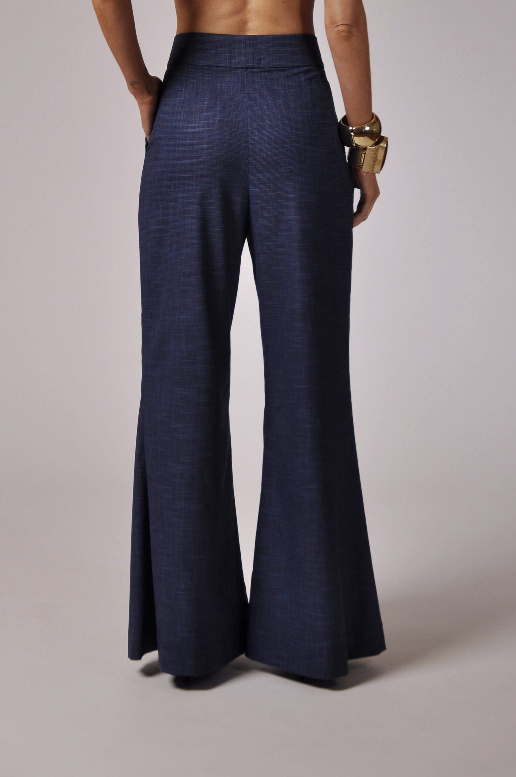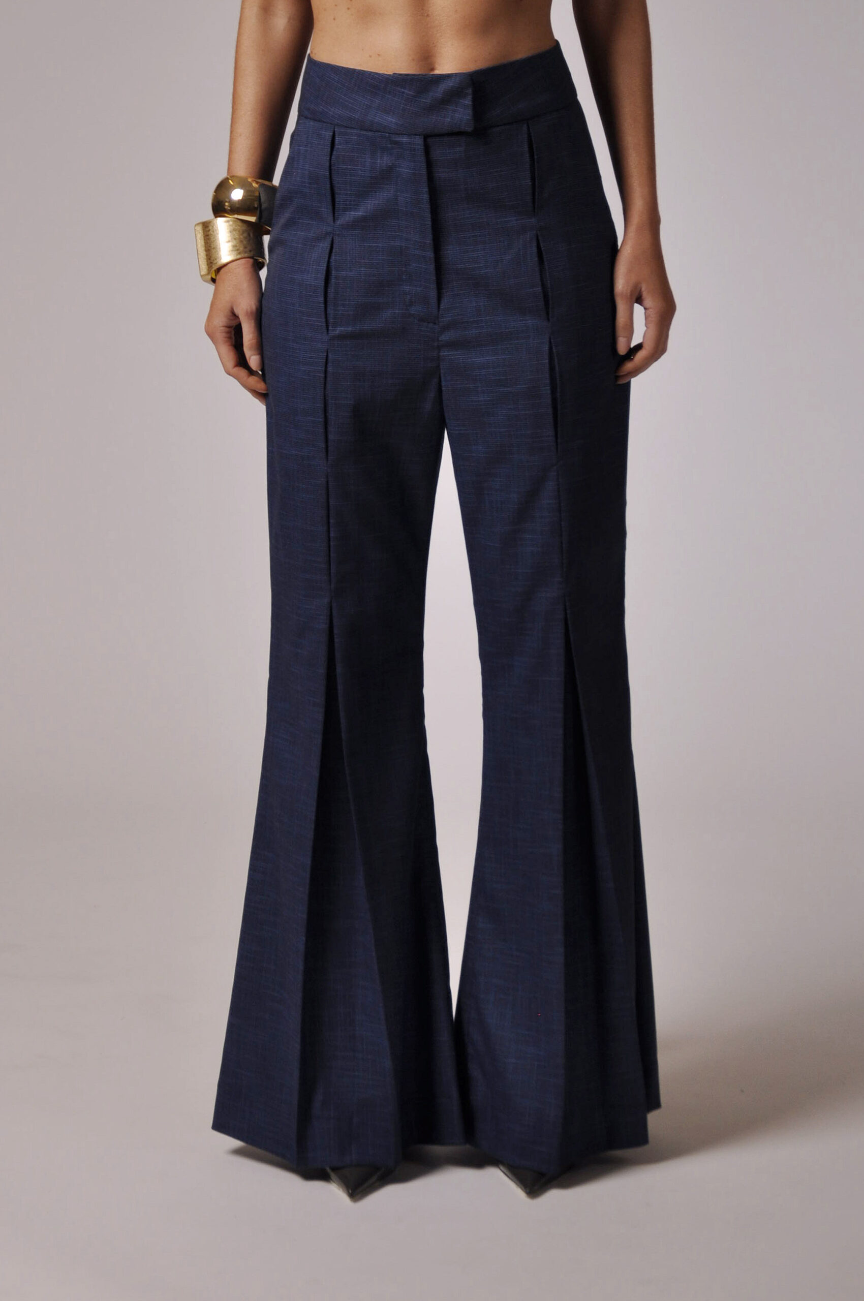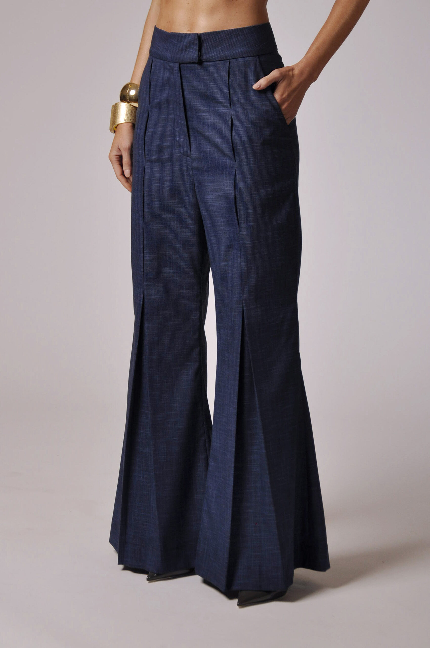 CALÇA FILO FLARE COM PREGAS E FECHAMENTO EM GANCHO E ZÍPER.