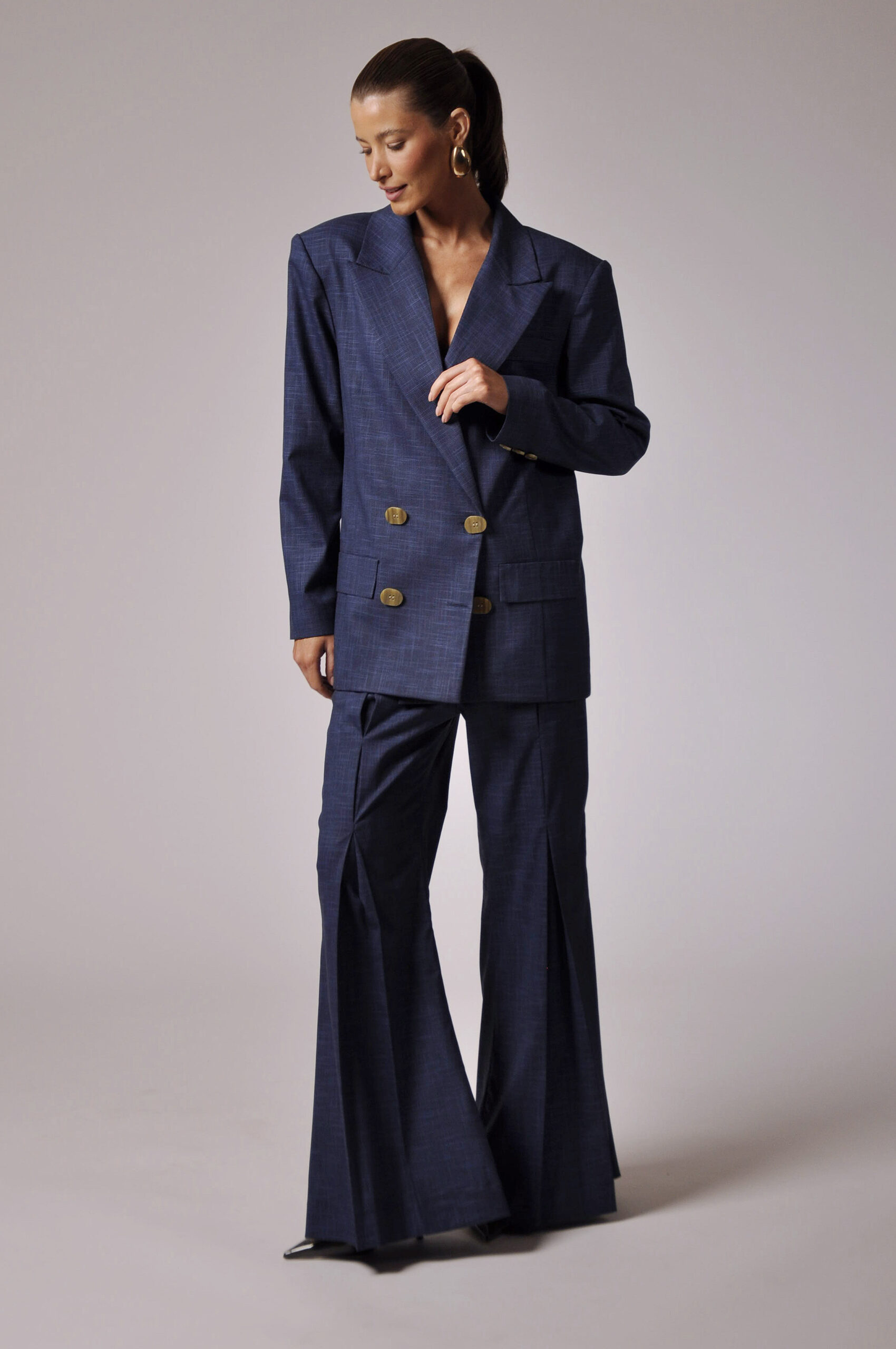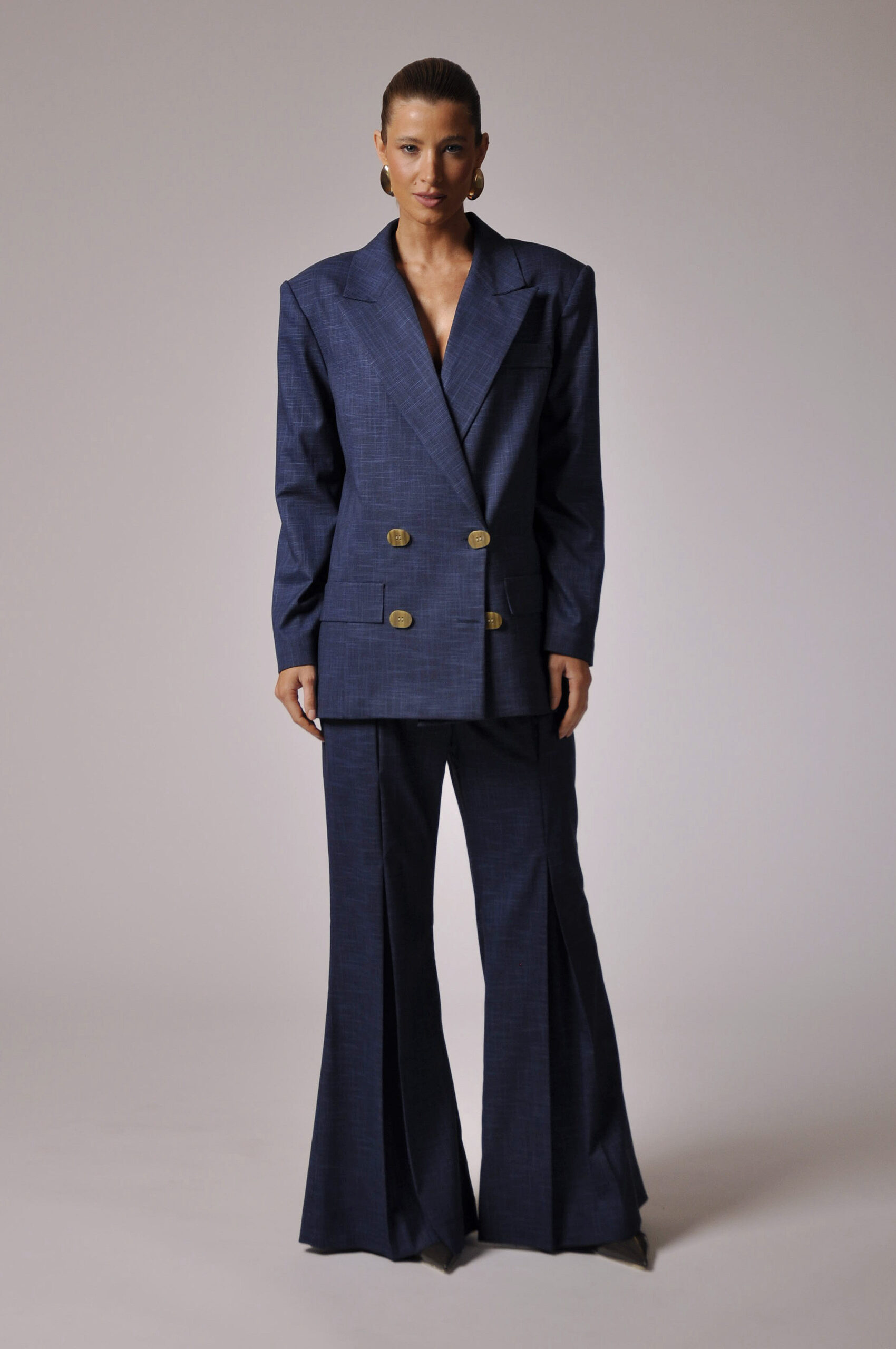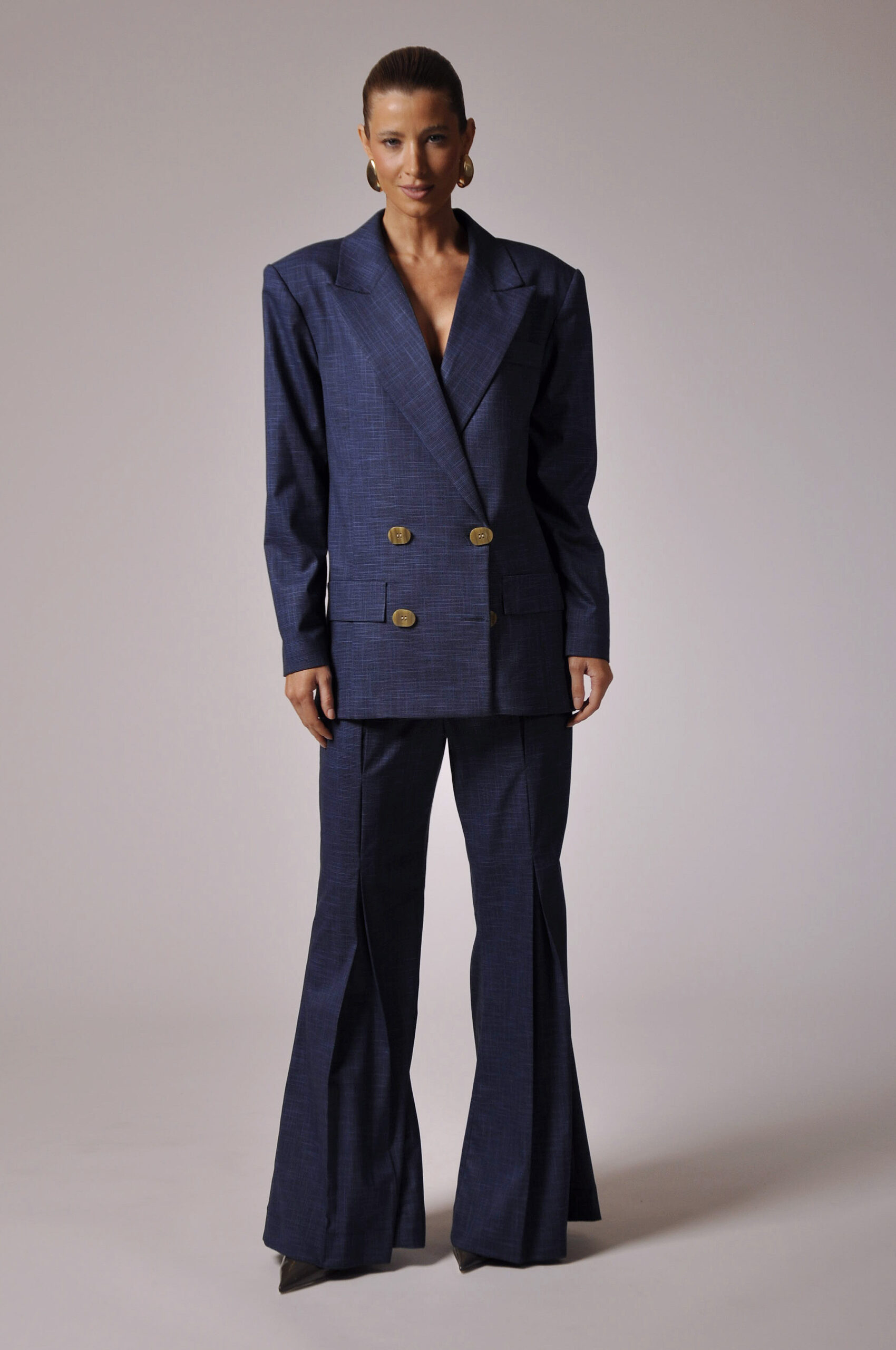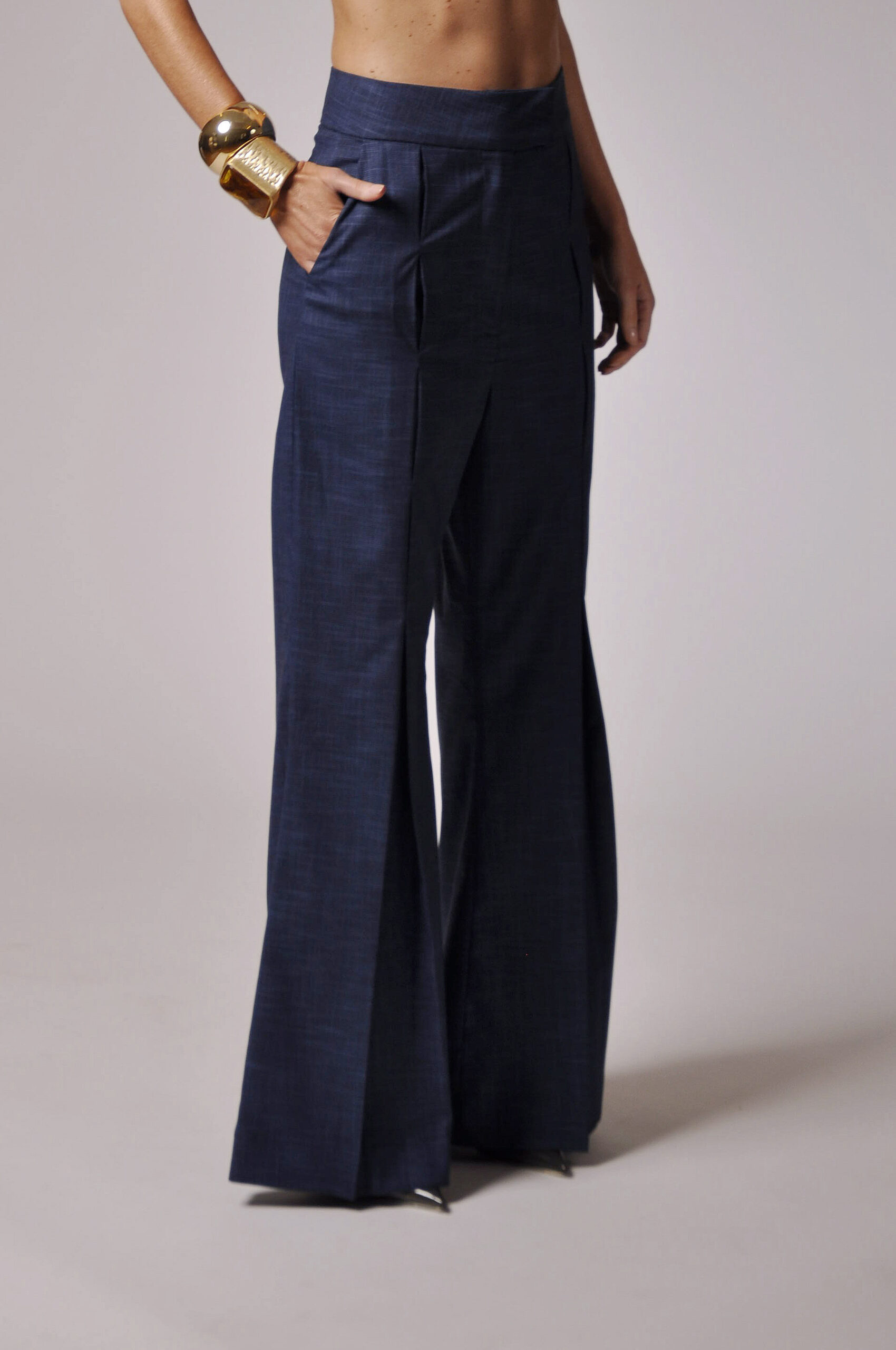 CALÇA FILO FLARE COM PREGAS E FECHAMENTO EM GANCHO E ZÍPER.