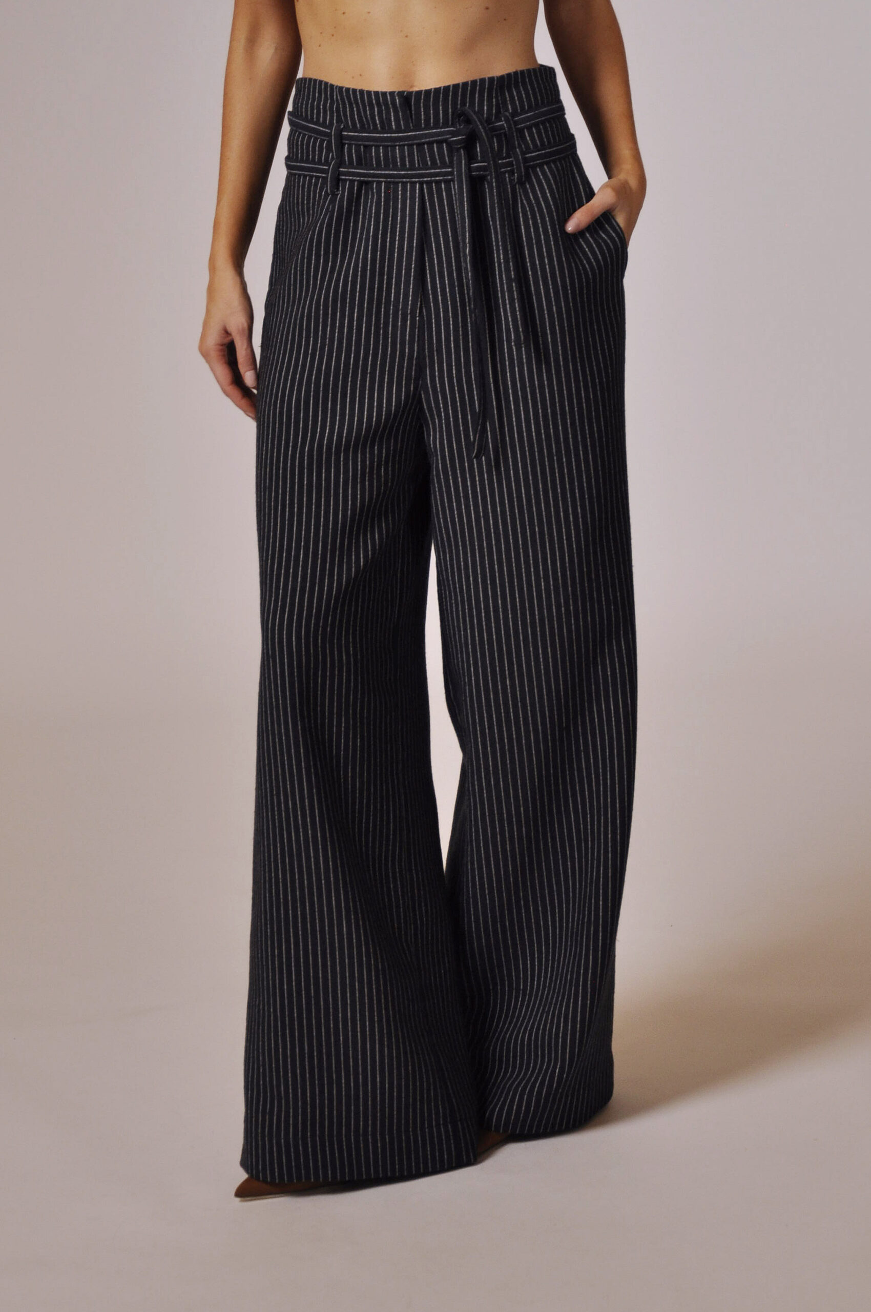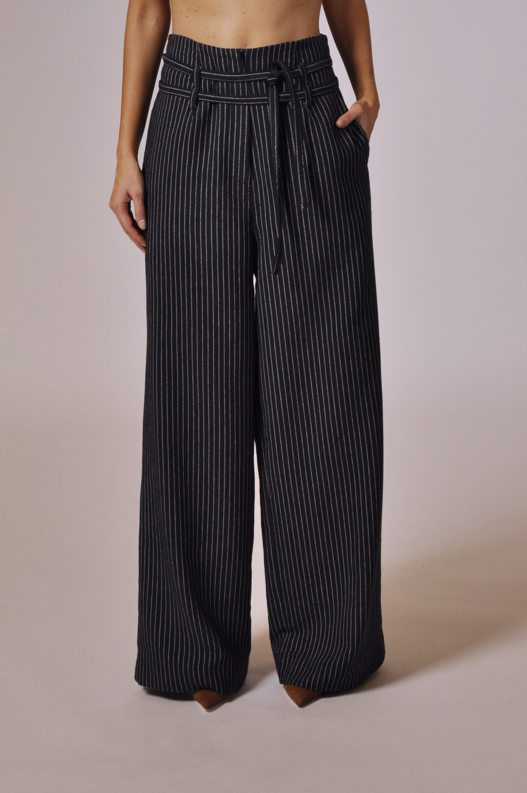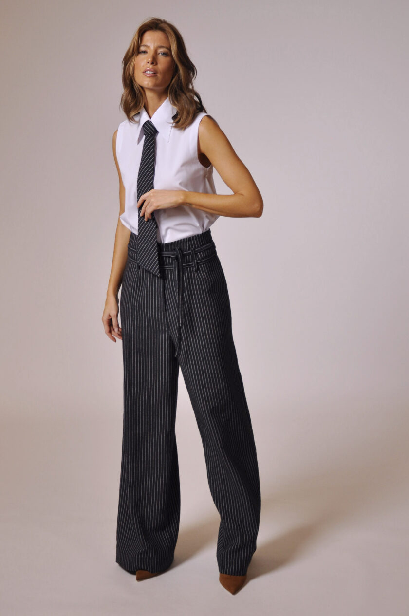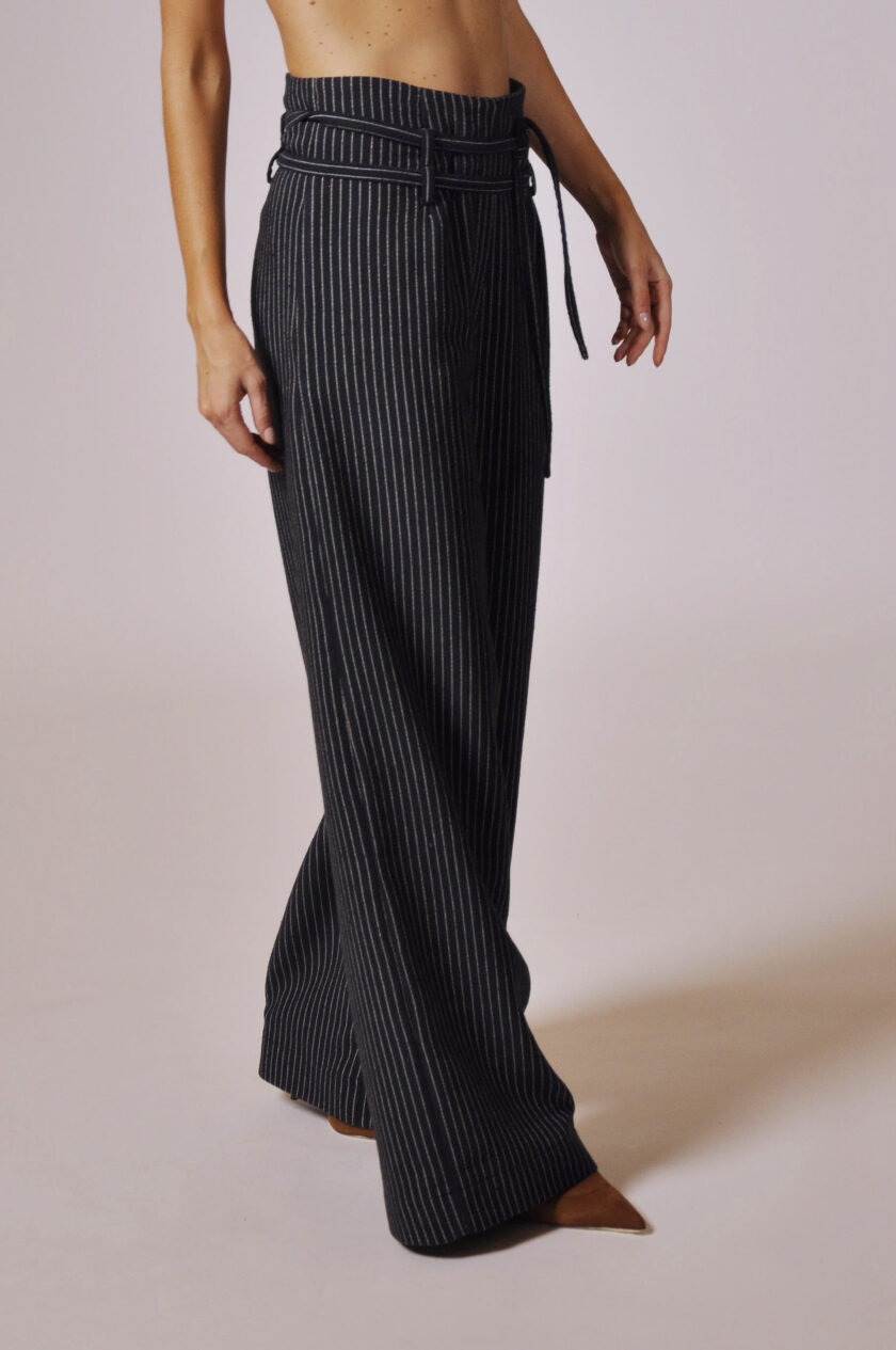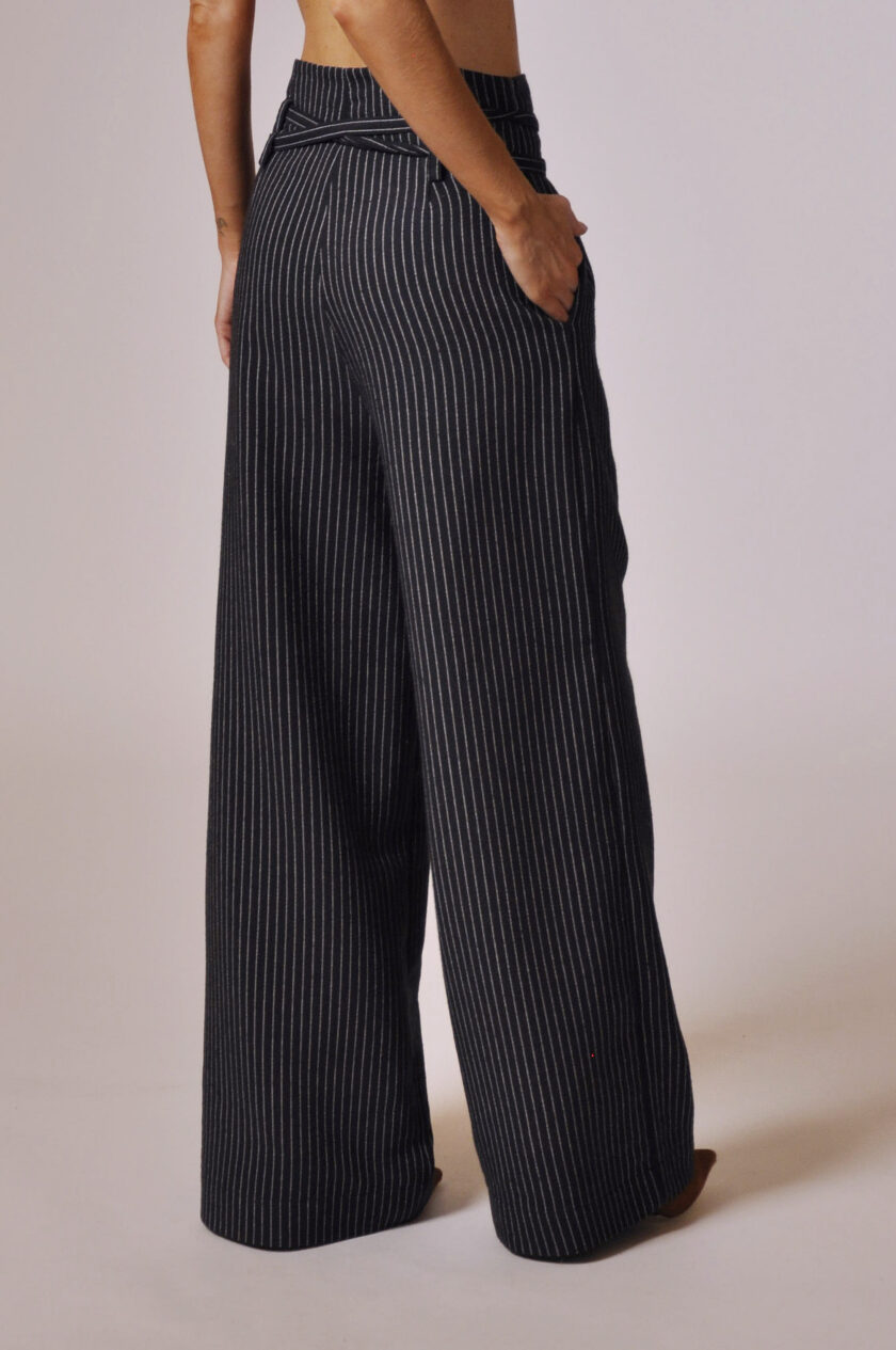CALÇA GLENN CÓS ALTO COM PASSANTE, FAIXA PARA AMARRAÇÃO E BOLSOS.