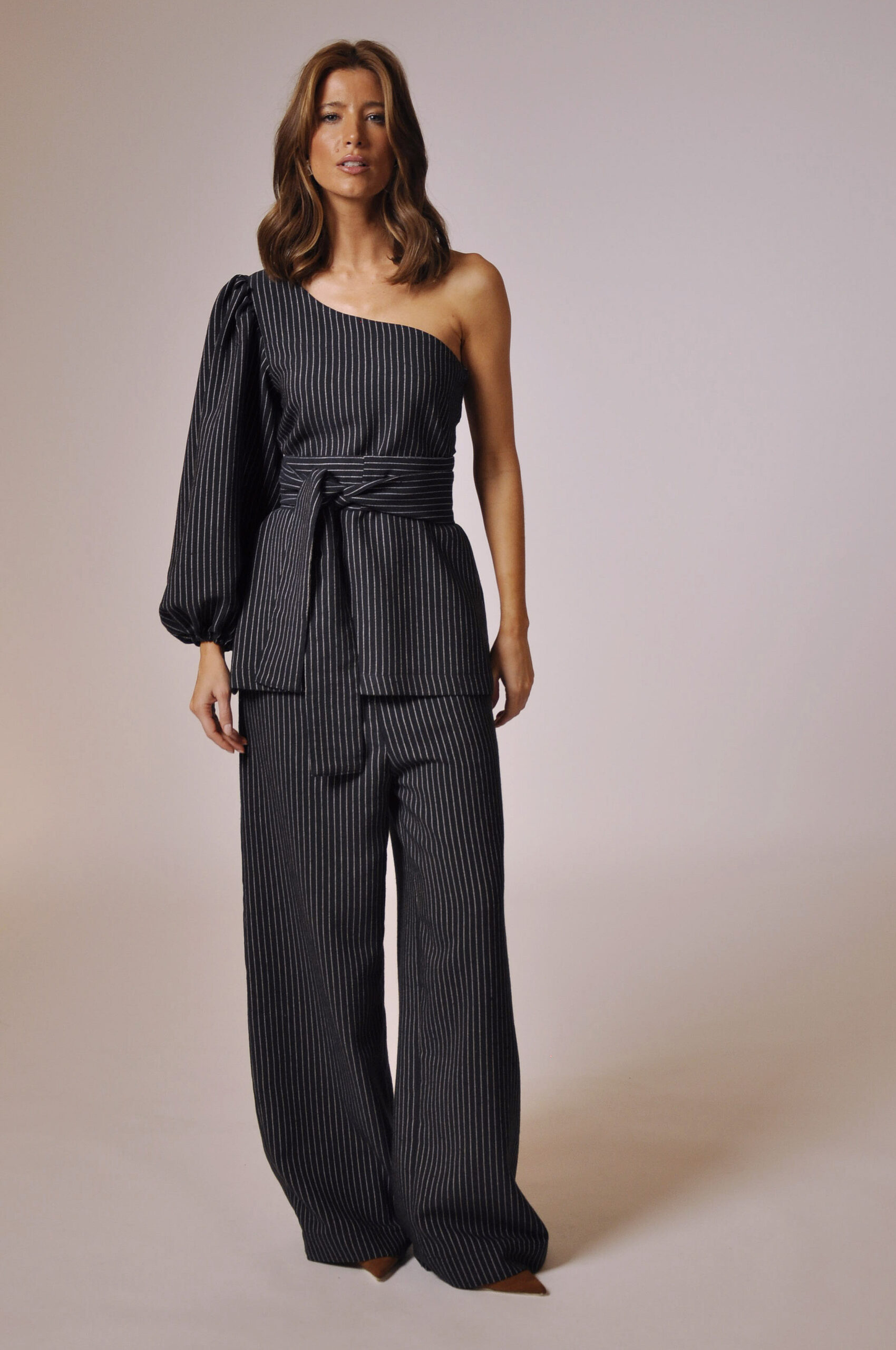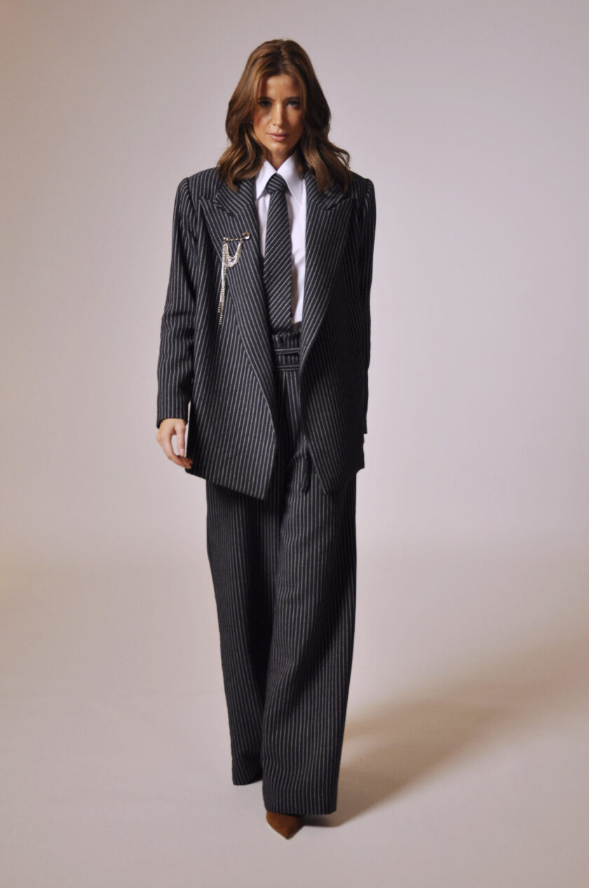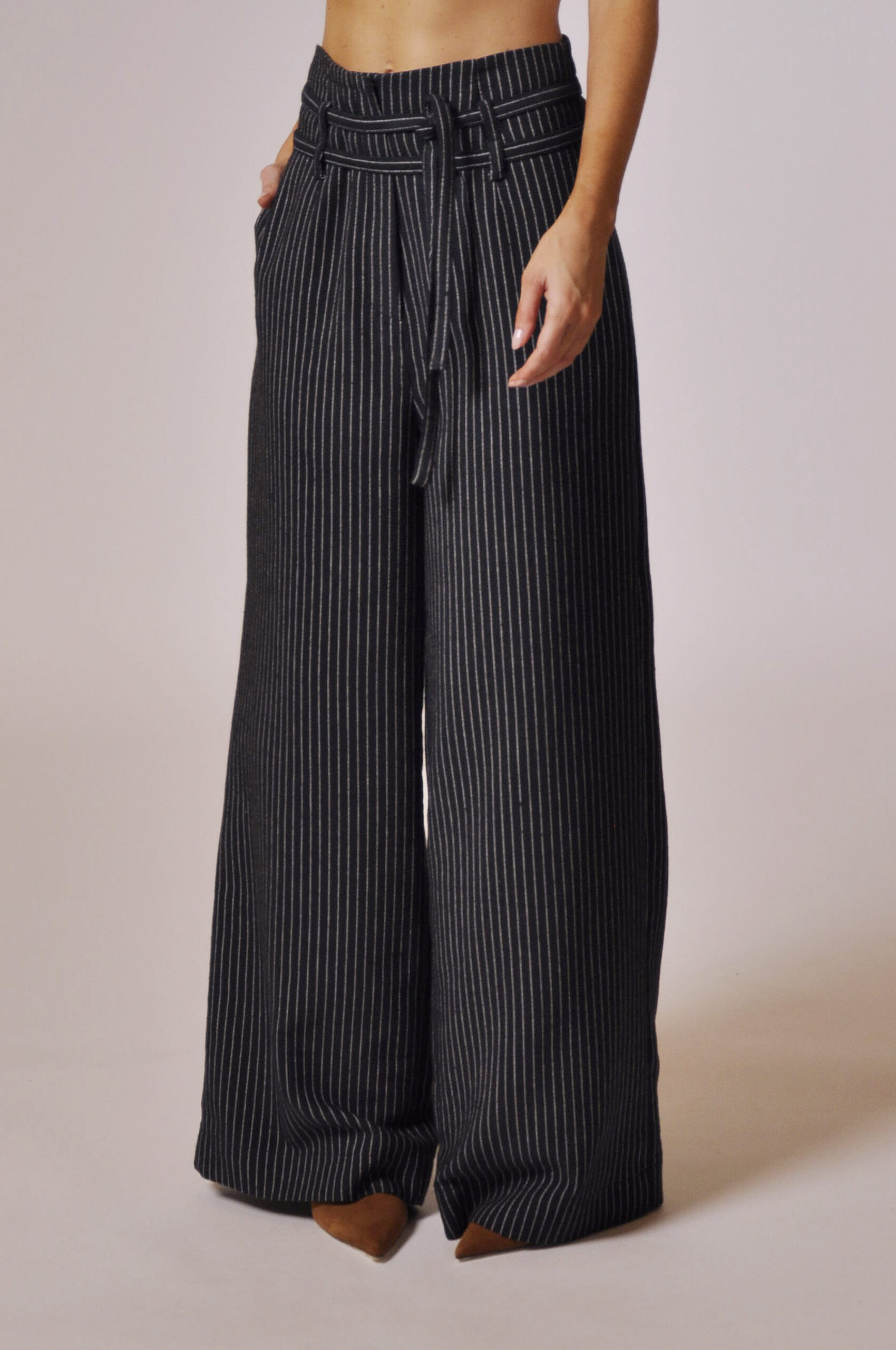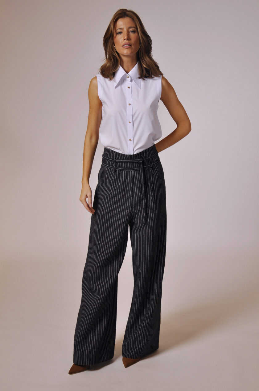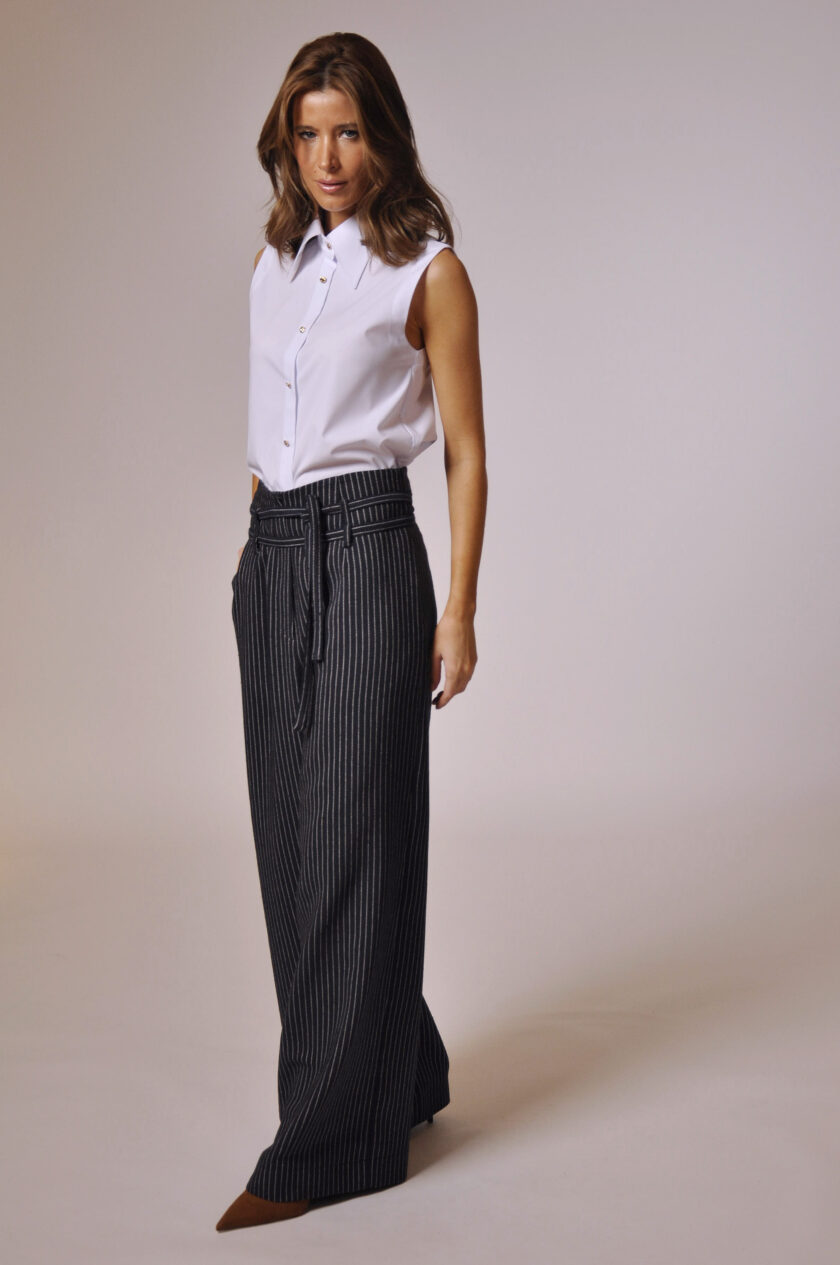 CALÇA GLENN CÓS ALTO COM PASSANTE, FAIXA PARA AMARRAÇÃO E BOLSOS.