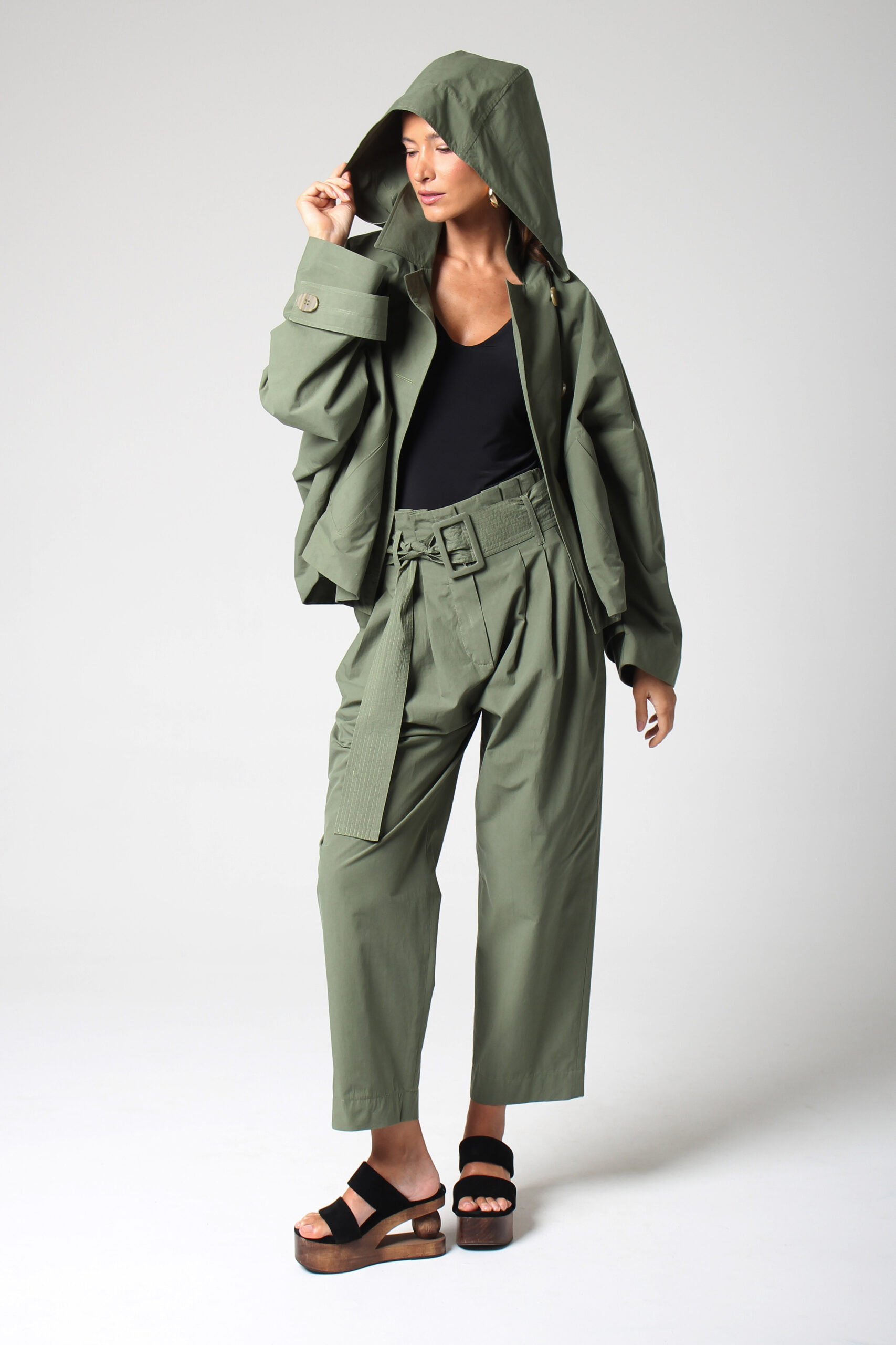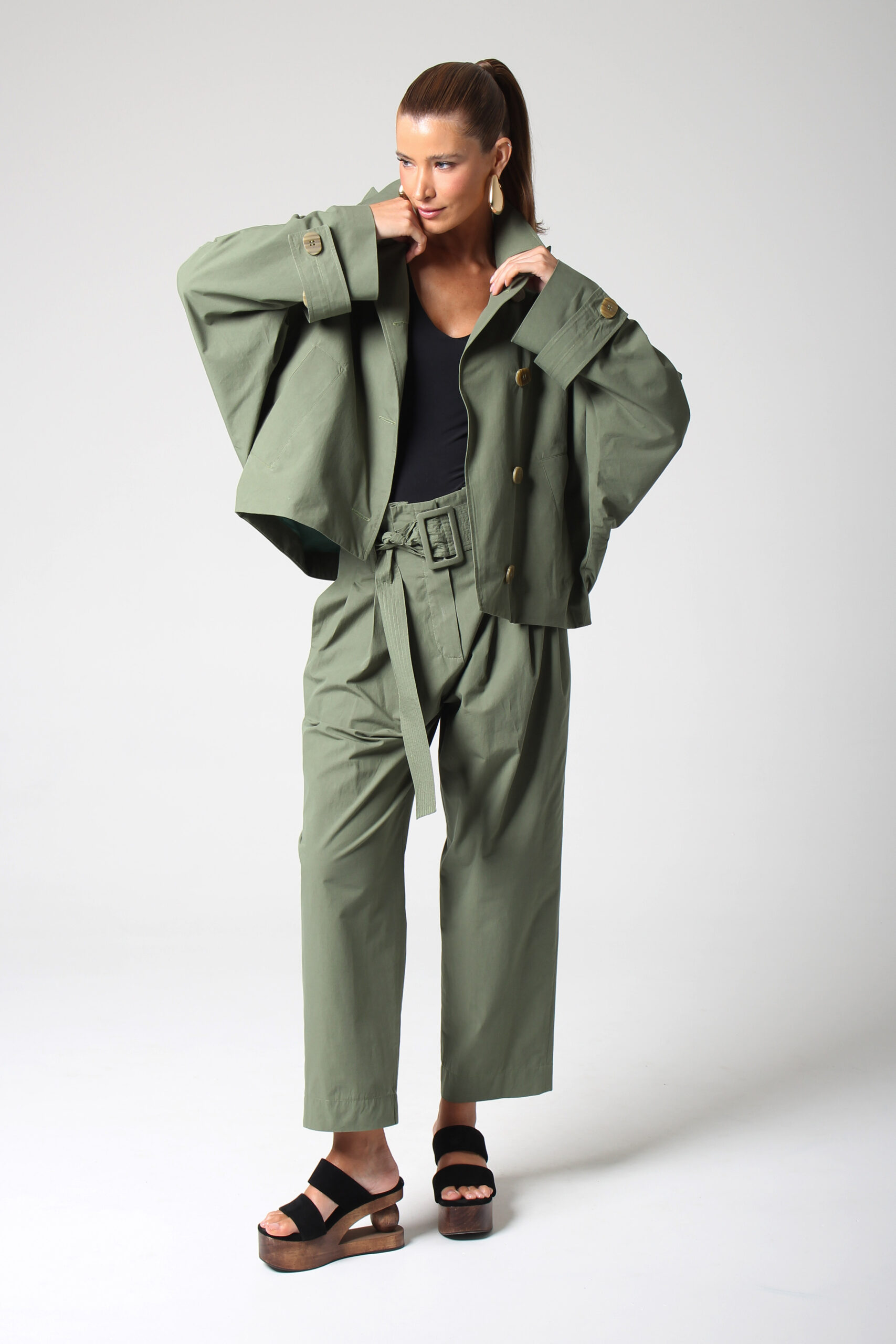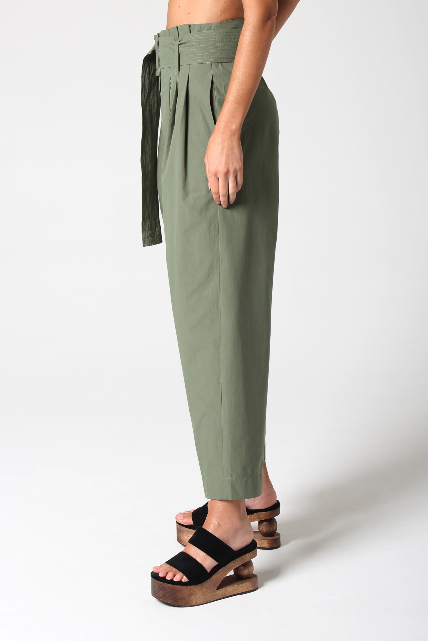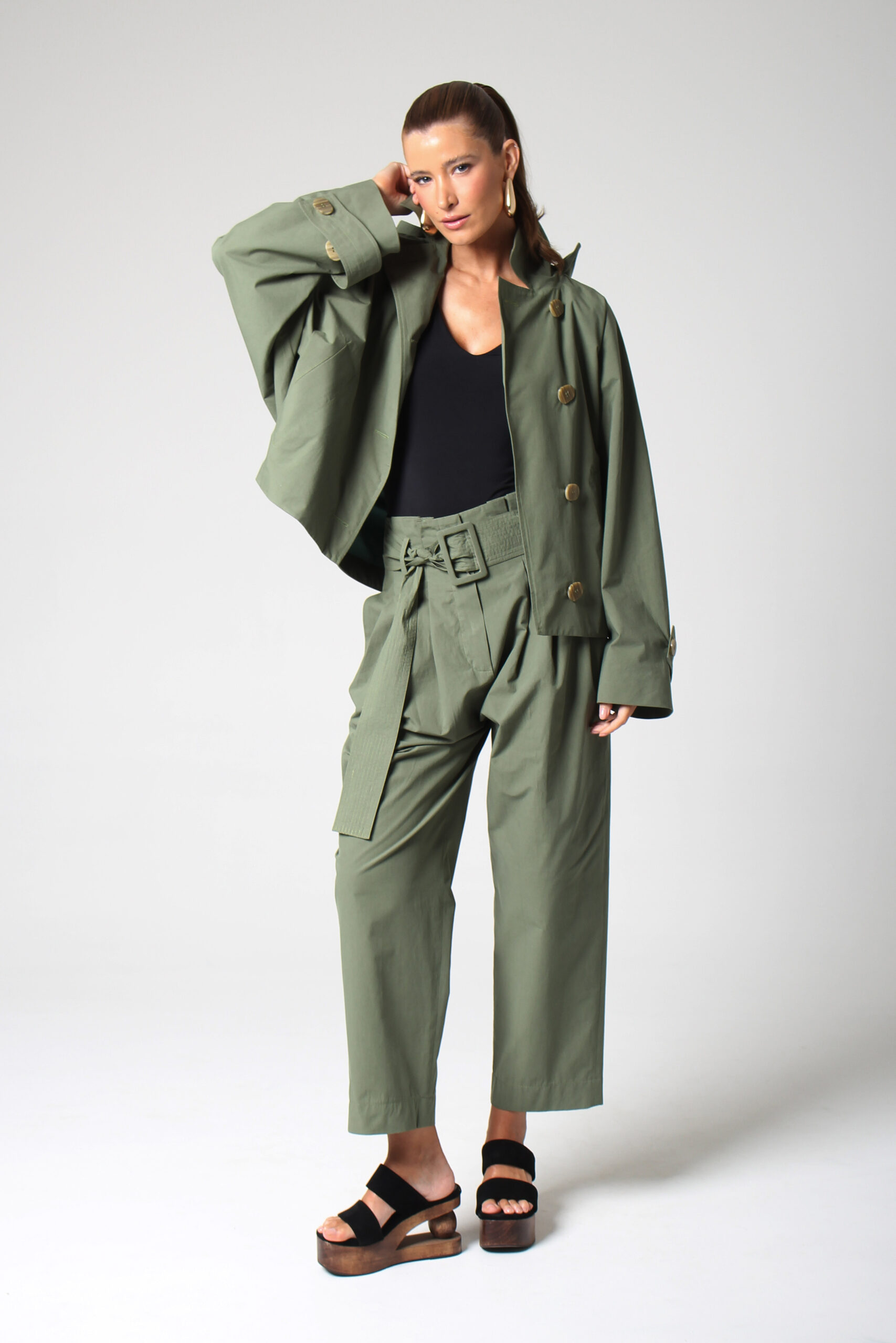 CALÇA JANY CÓS ALTO COM BOLSOS E PASSANTES PARA CINTO QUE ACOMPANHA.