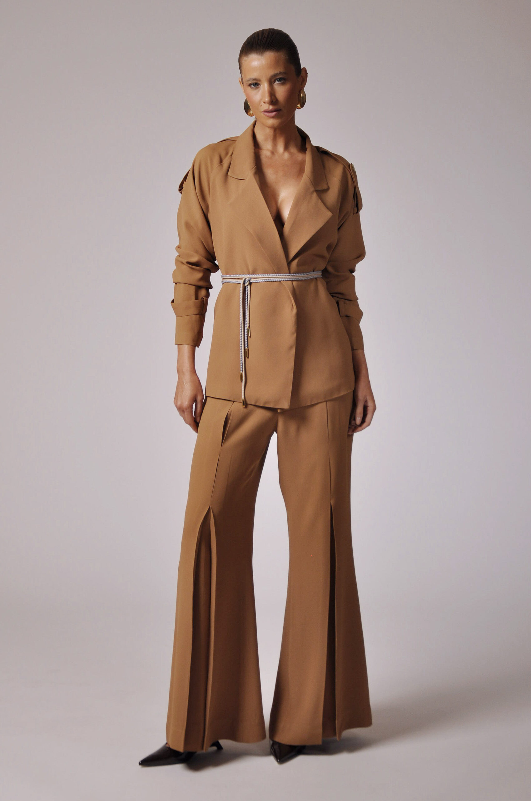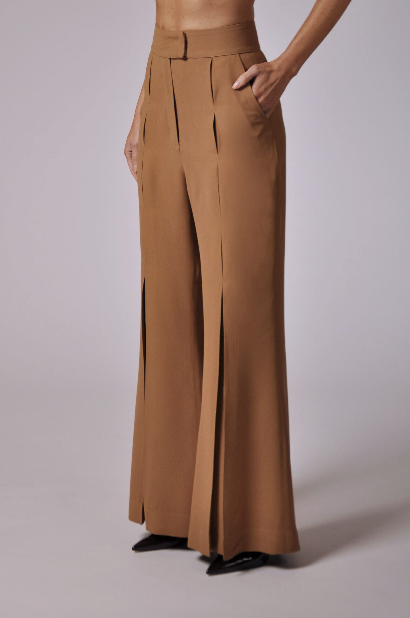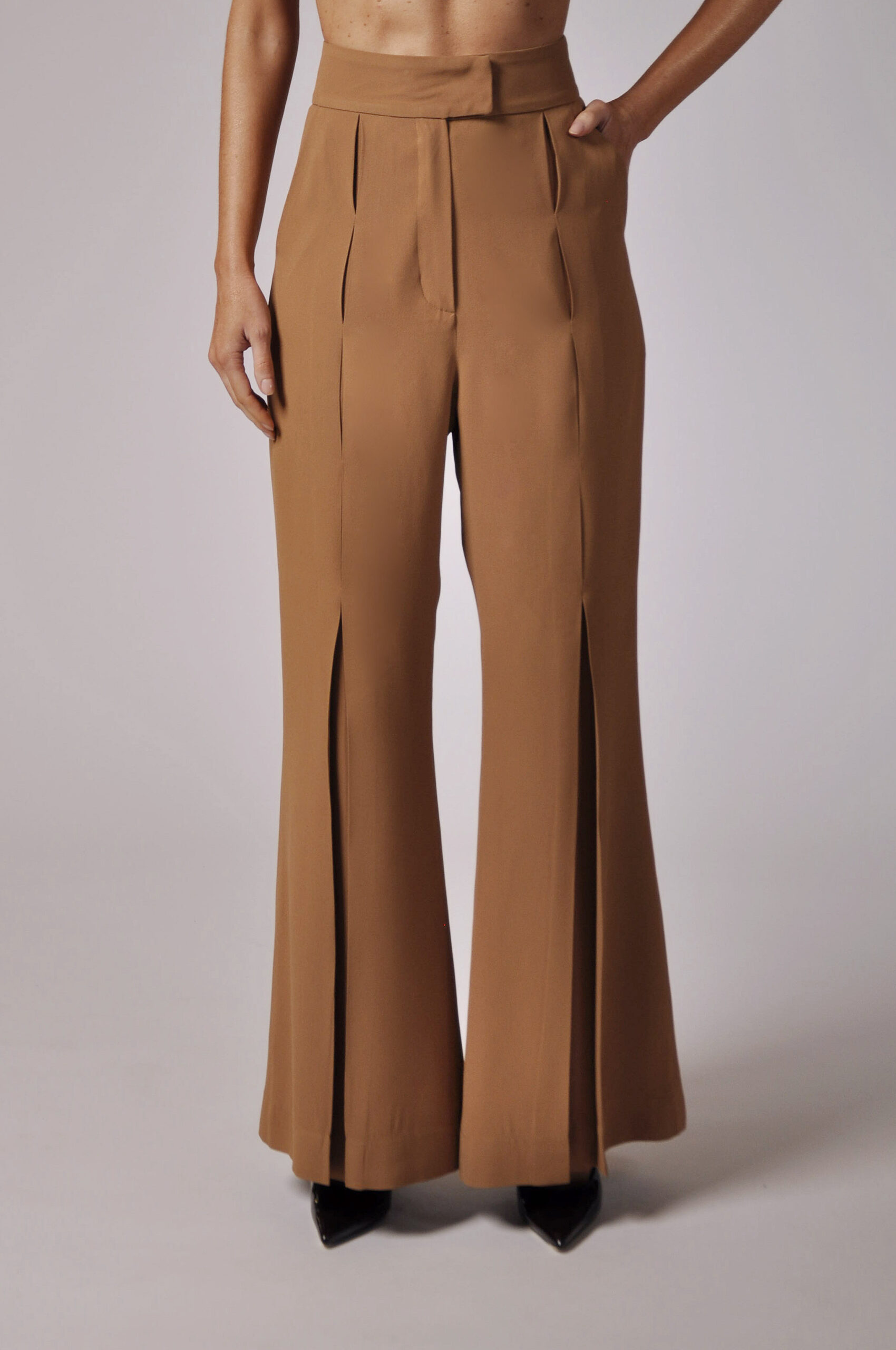 CALÇA KLAXON FLARE COM PREGAS FRONTAIS E ABOTOAMENTO EM GANCHO E ZÍPER.