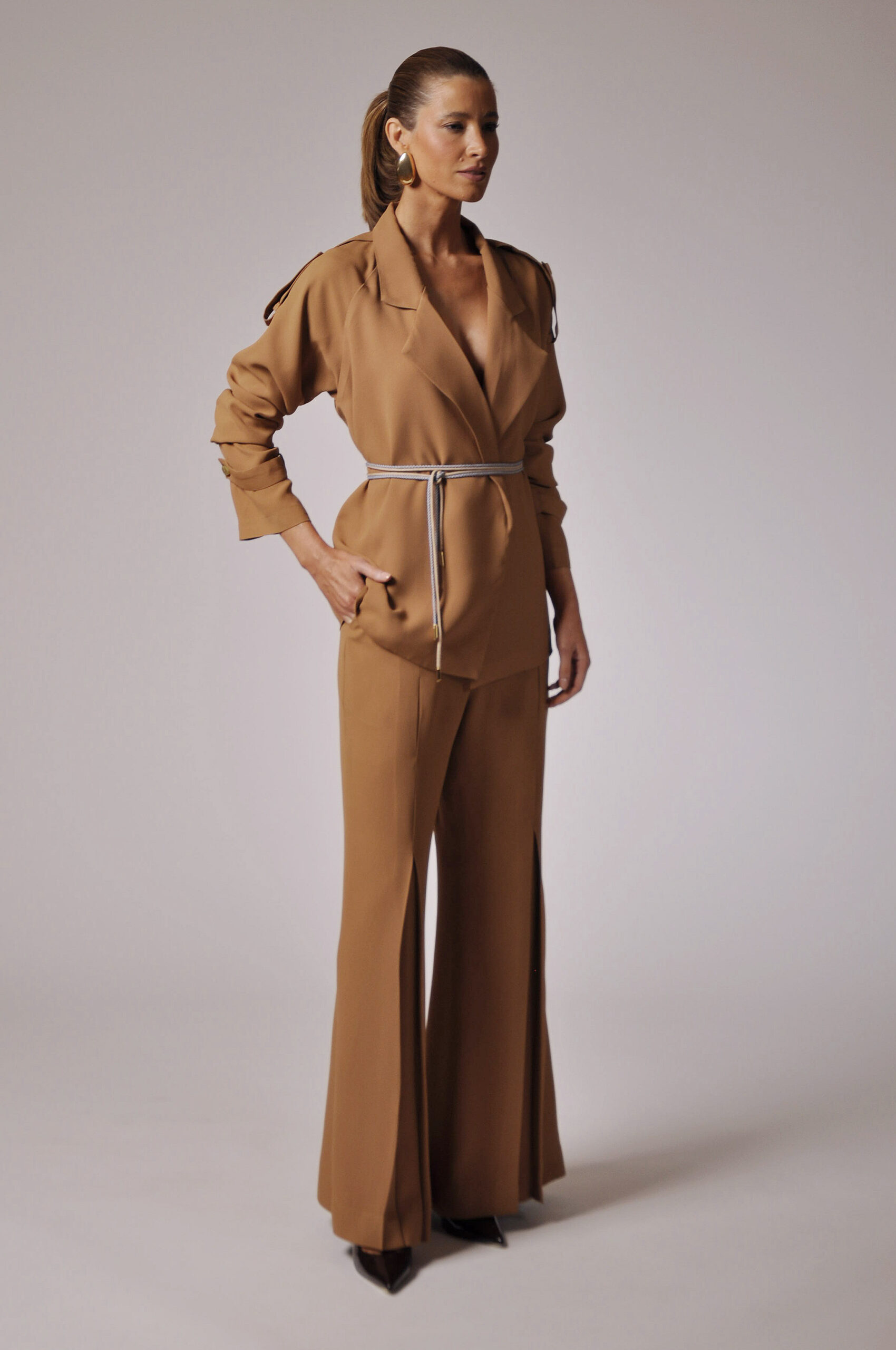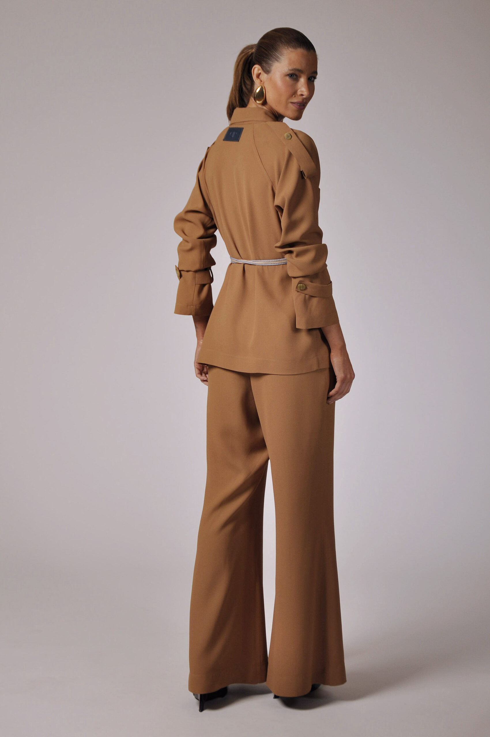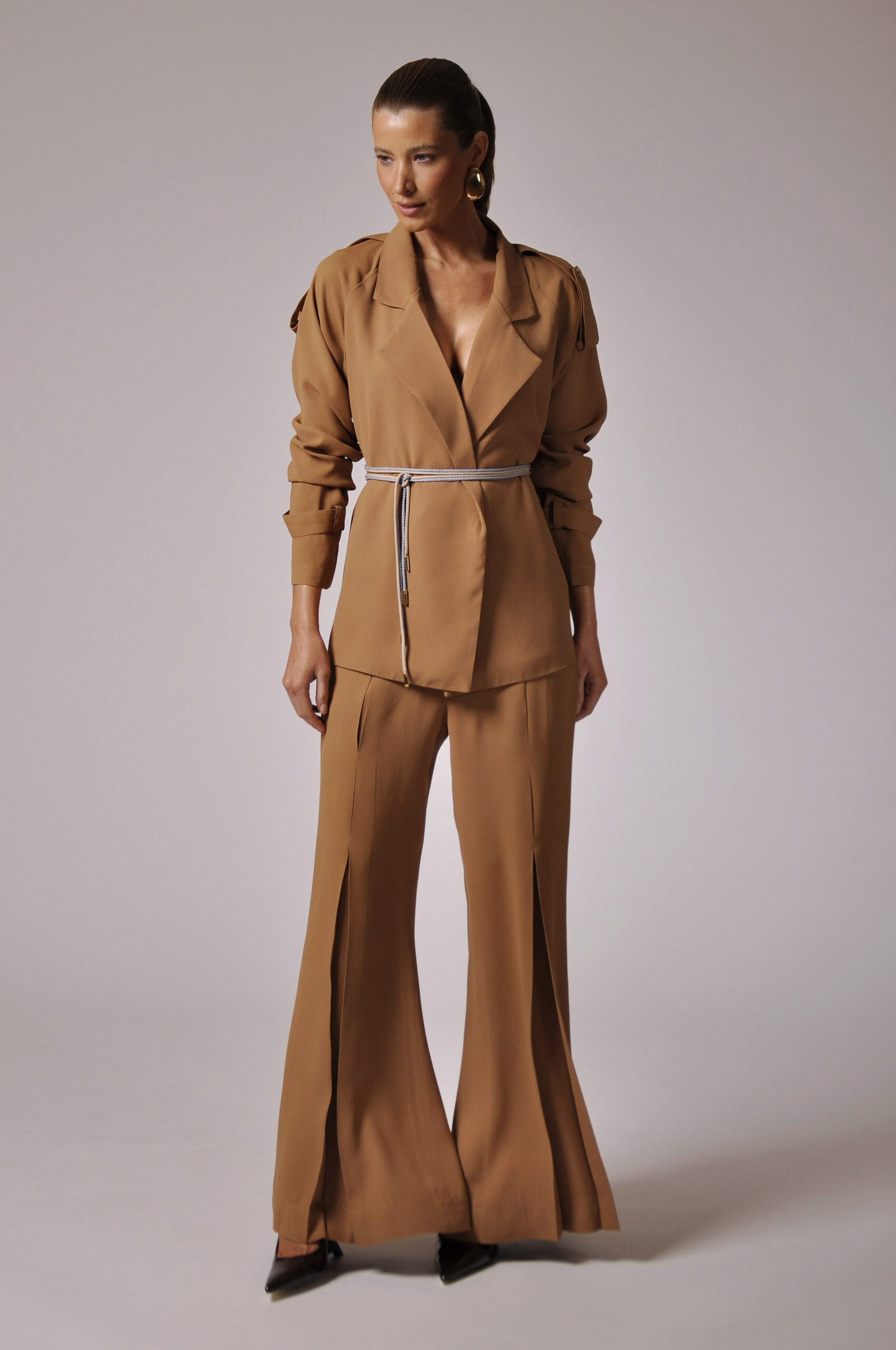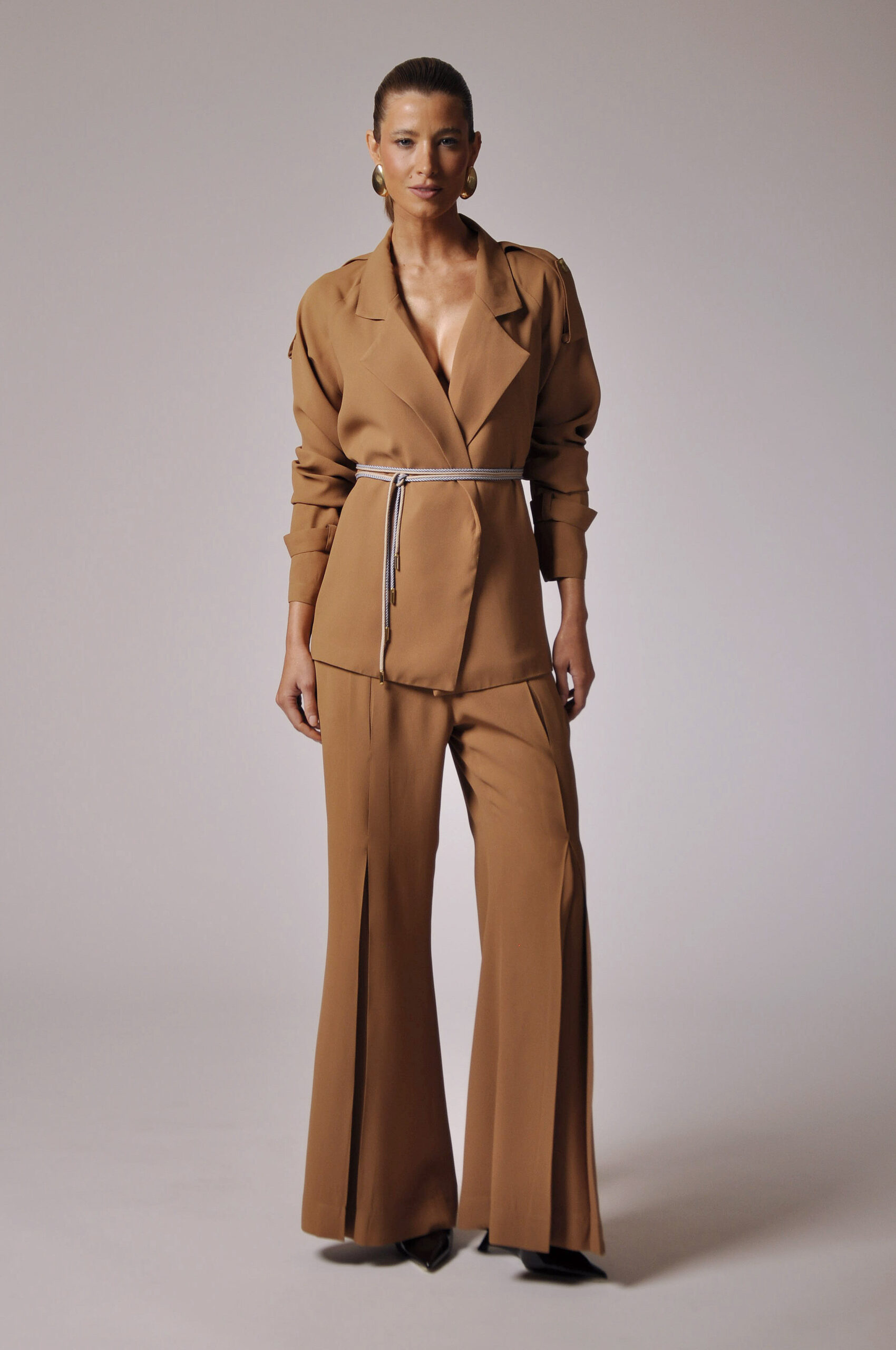 CALÇA KLAXON FLARE COM PREGAS FRONTAIS E ABOTOAMENTO EM GANCHO E ZÍPER.