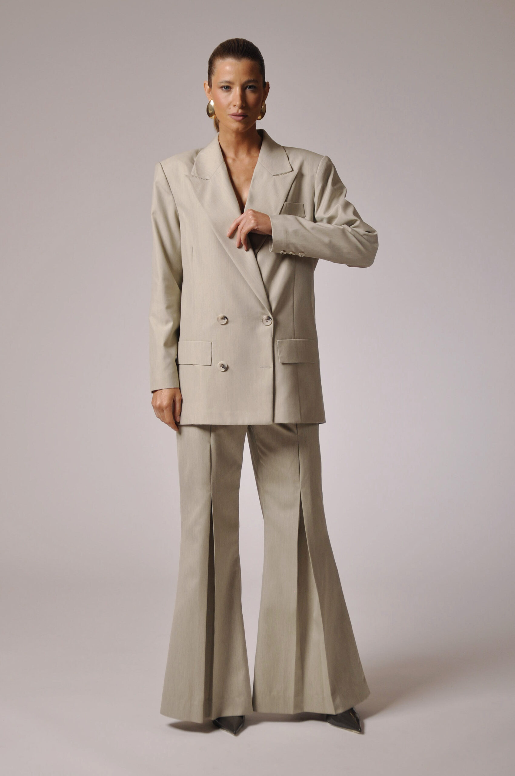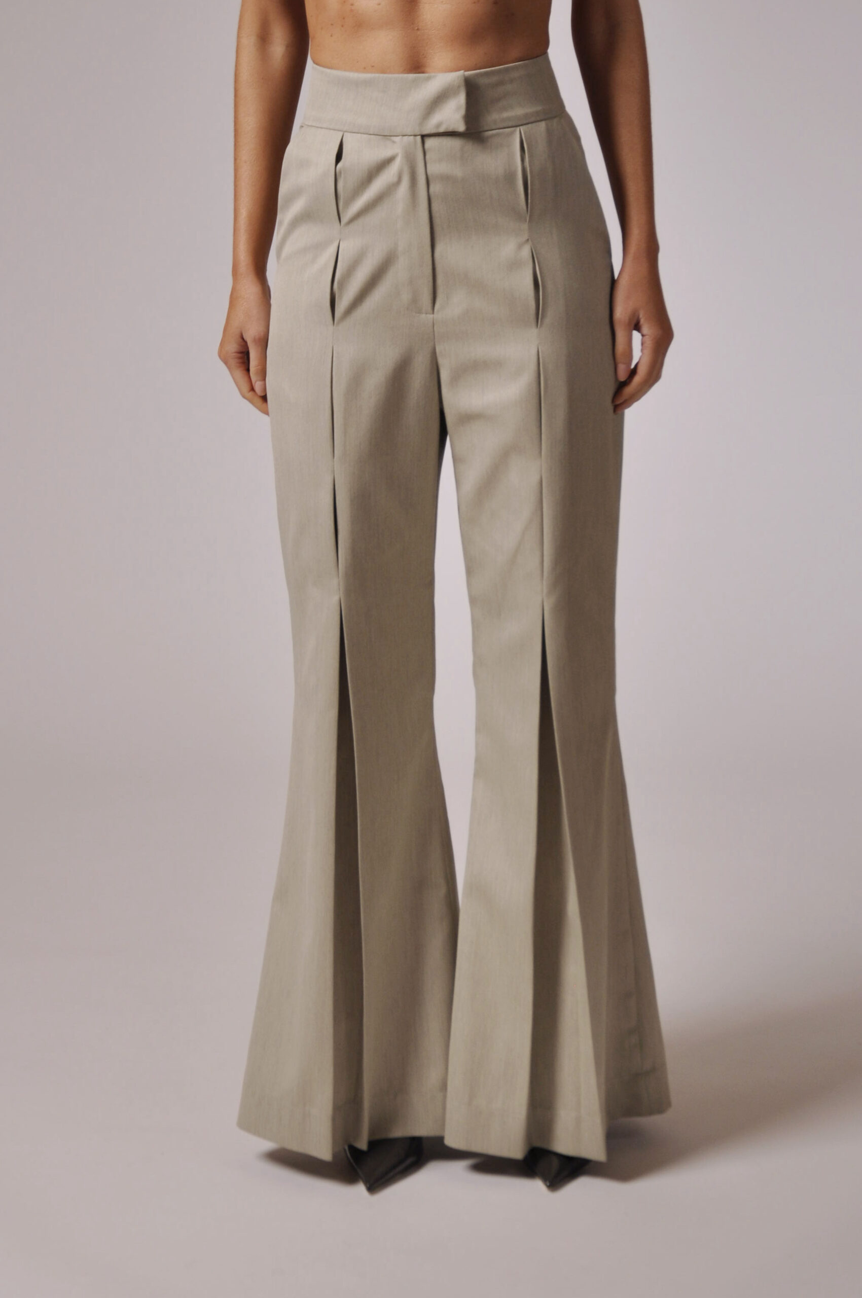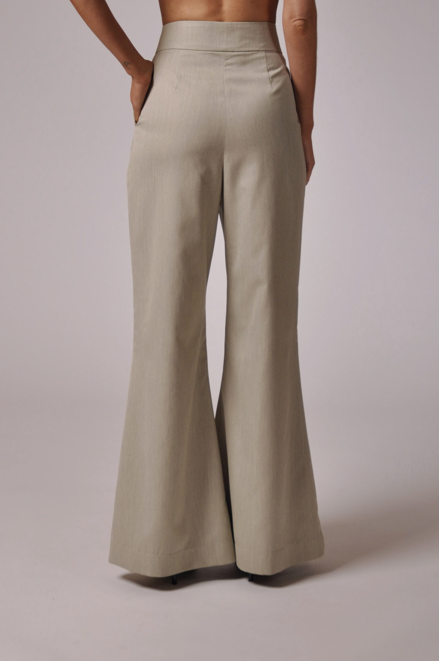 CALÇA LAUSANNE FLARE COM PREGAS E FECHAMENTO EM GANCHO E ZÍPER.