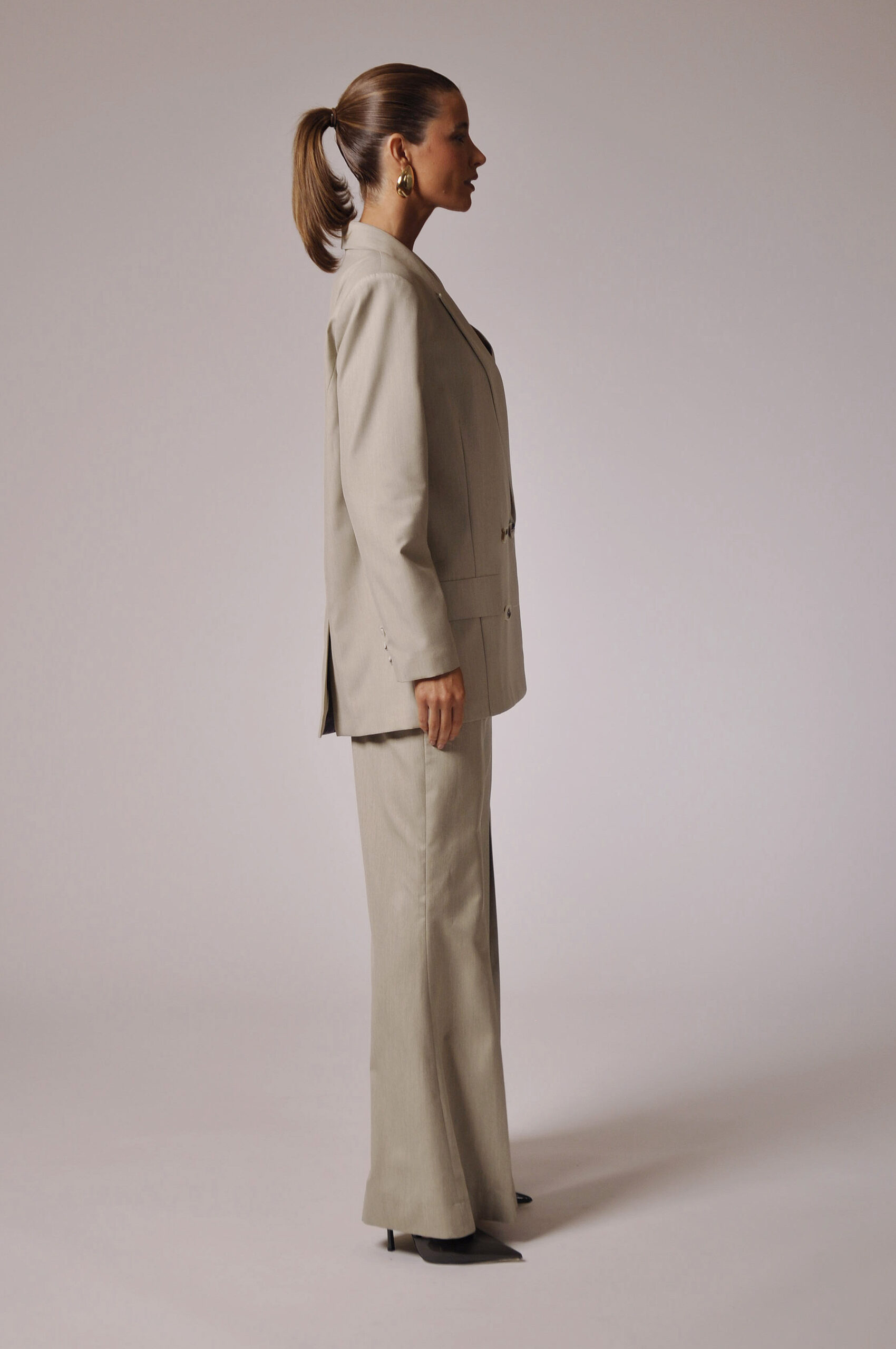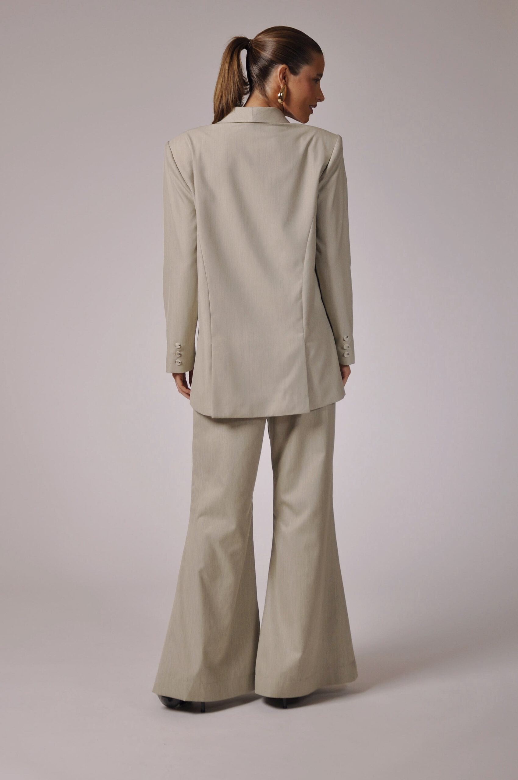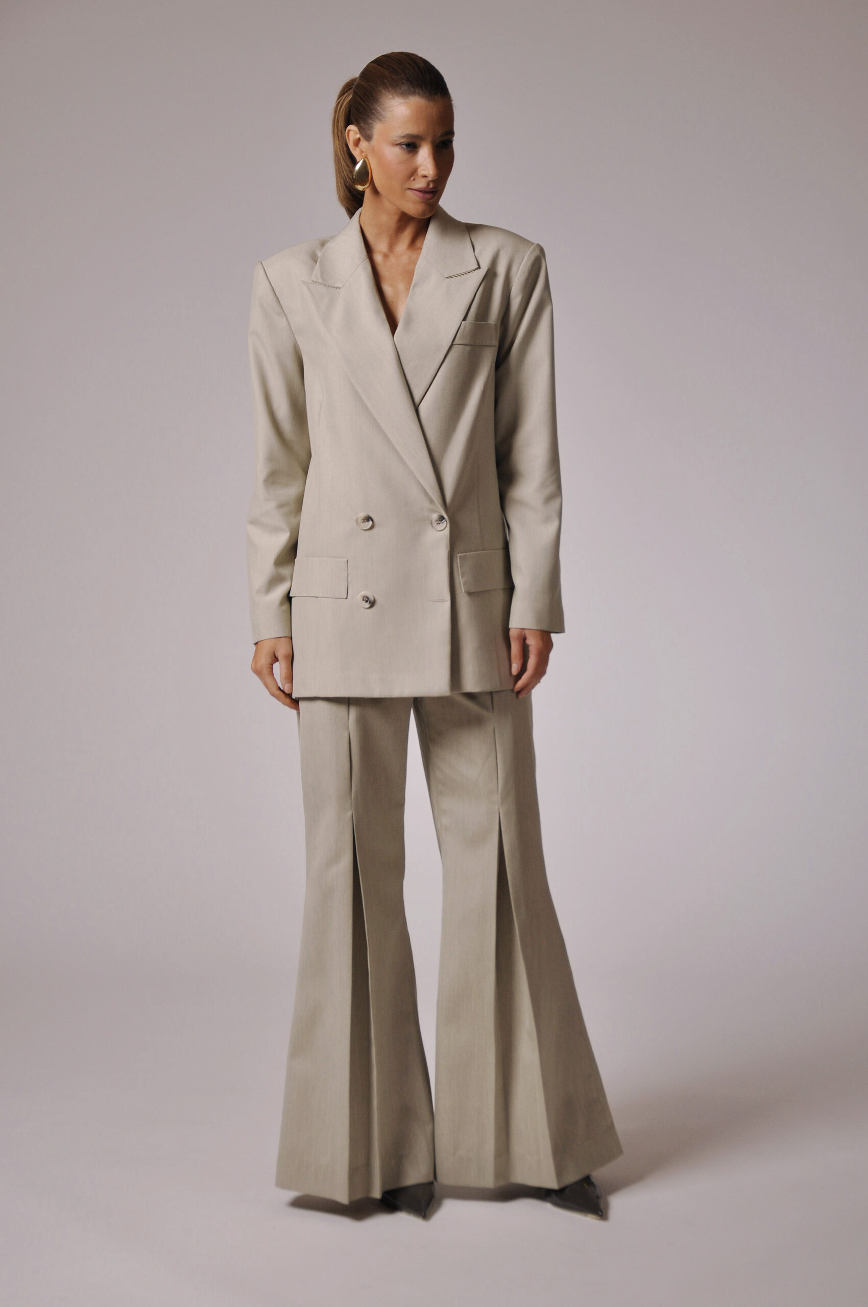 CALÇA LAUSANNE FLARE COM PREGAS E FECHAMENTO EM GANCHO E ZÍPER.