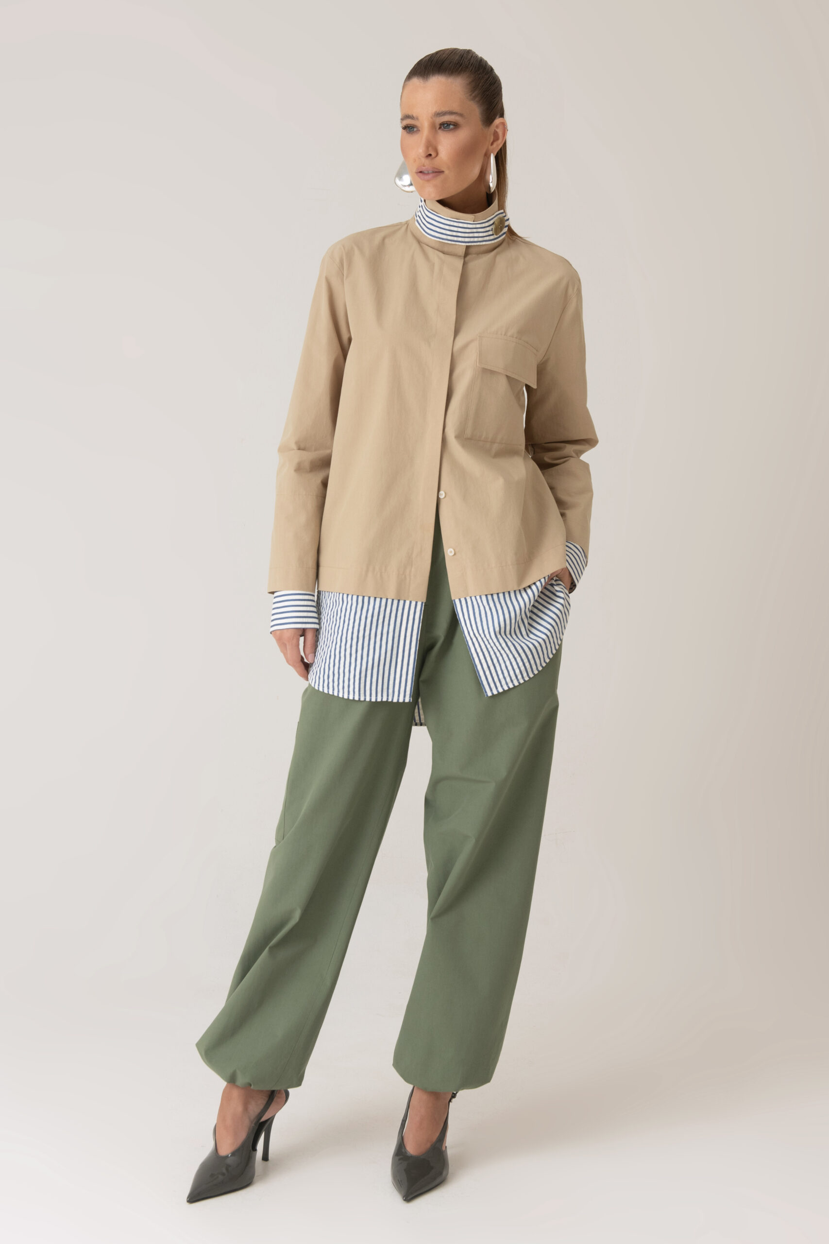 Possui cós com elástico, zíper e gancho, bolsos laterais e barra ajustada com elástico.