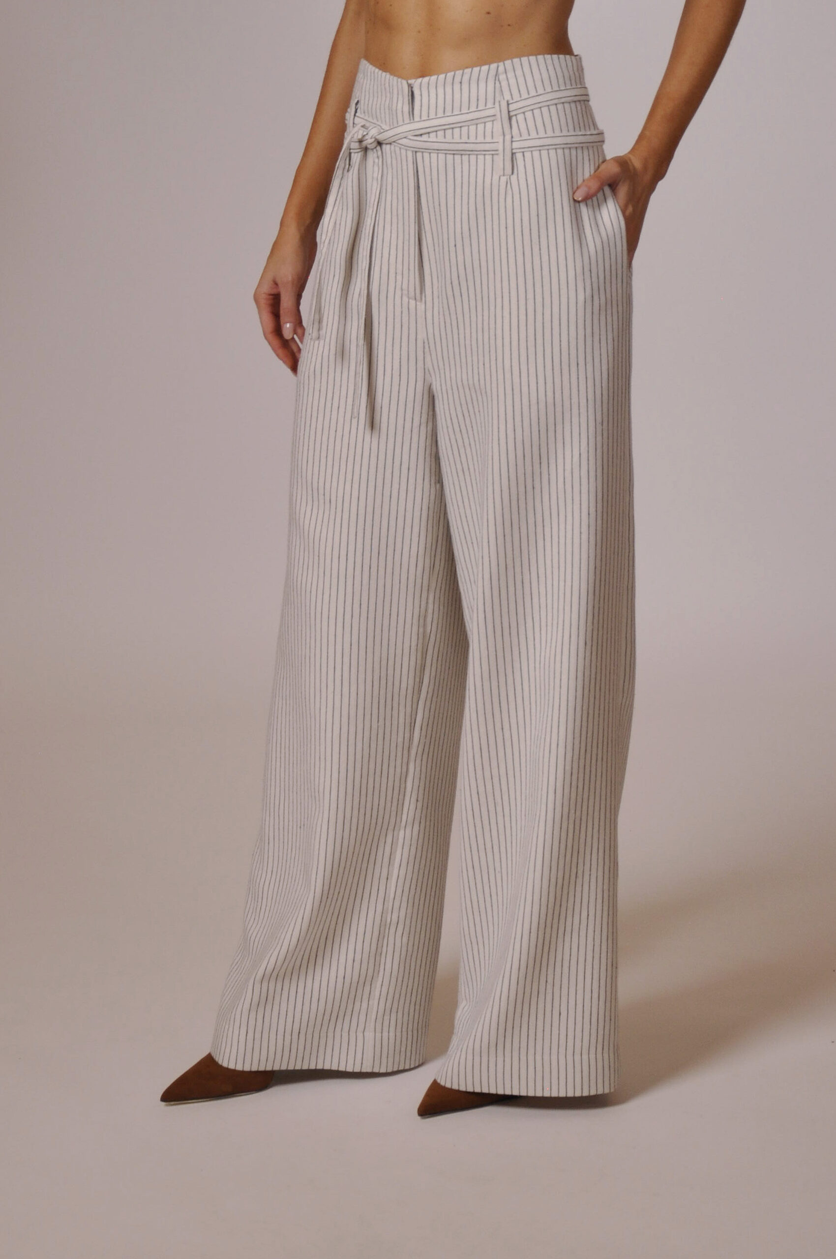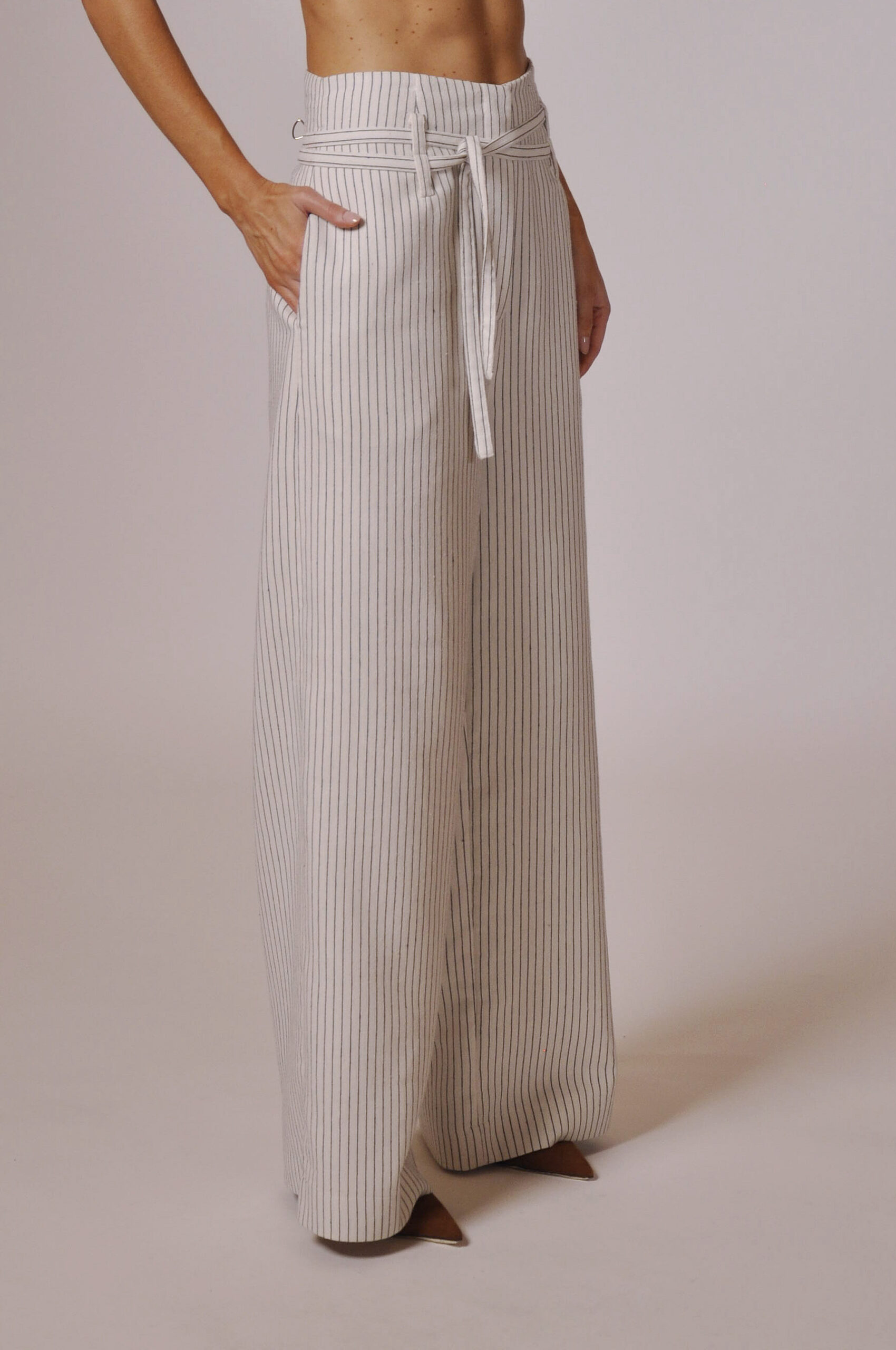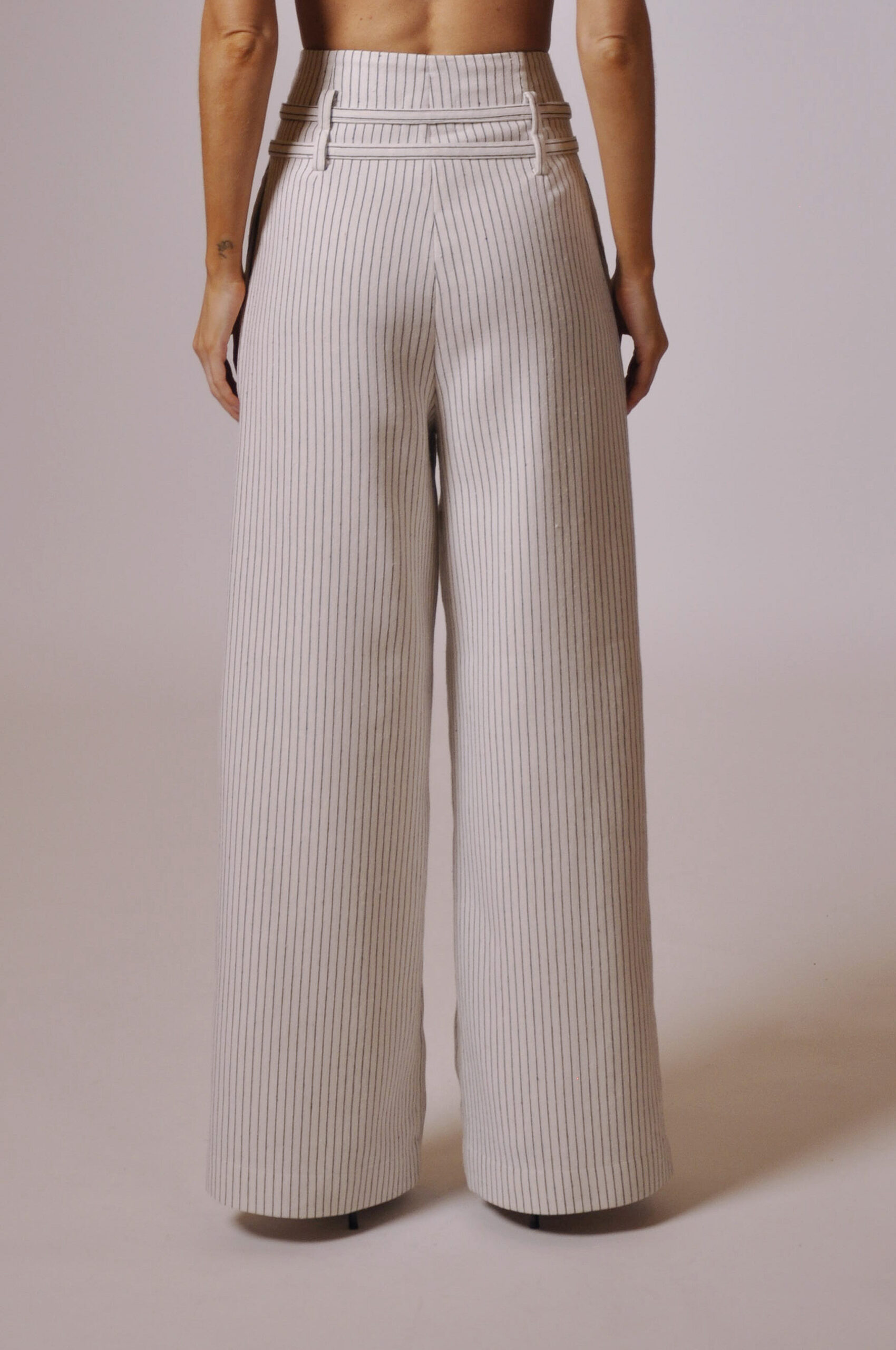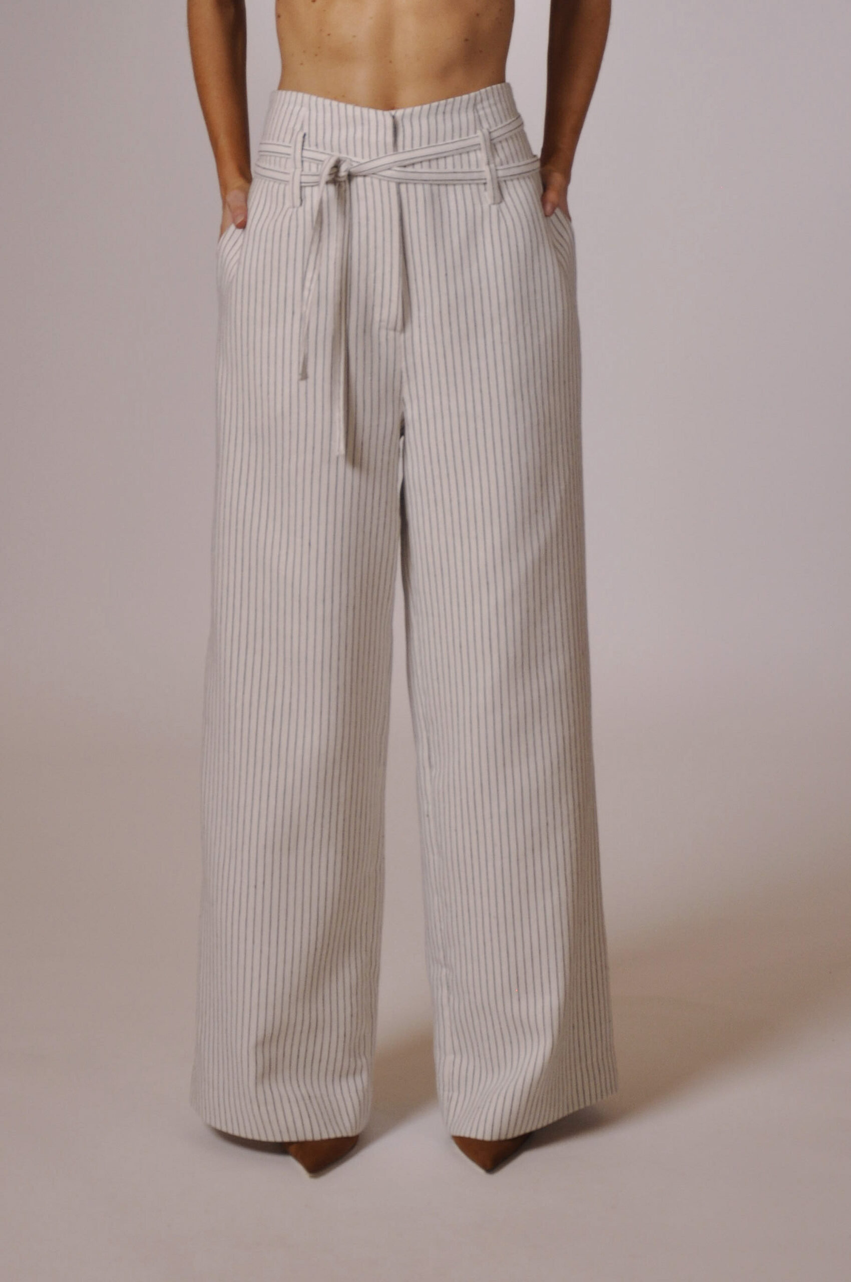 CALÇA MAH CÓS ALTO COM PASSANTE, FAIXA PARA AMARRAÇÃO E BOLSOS.