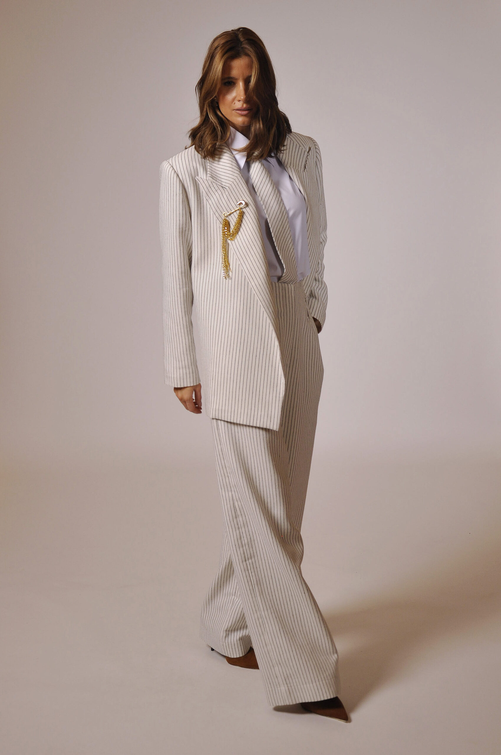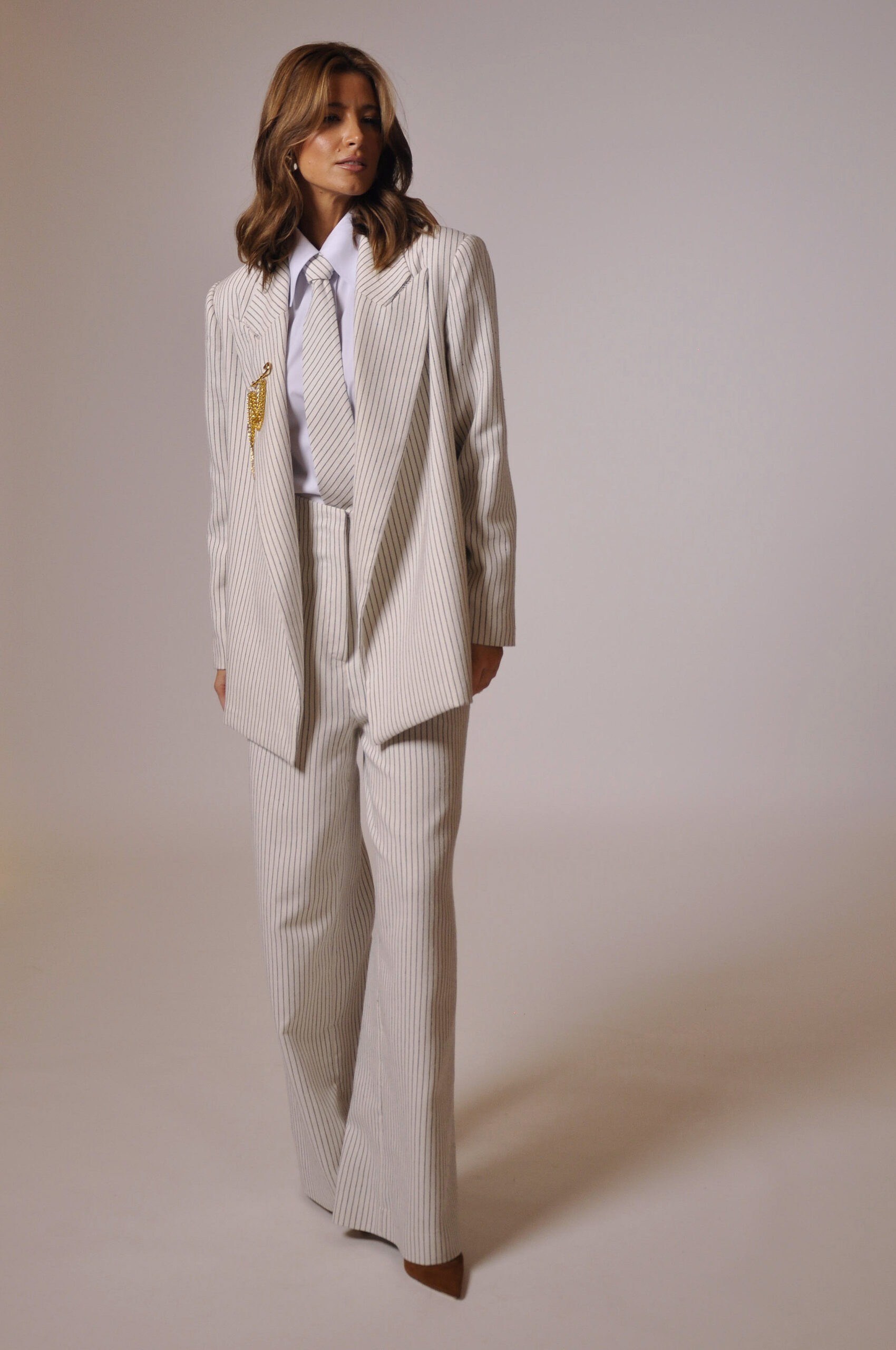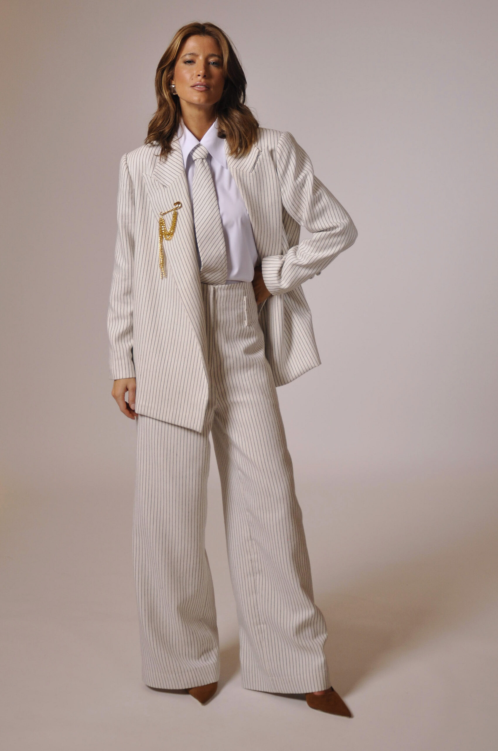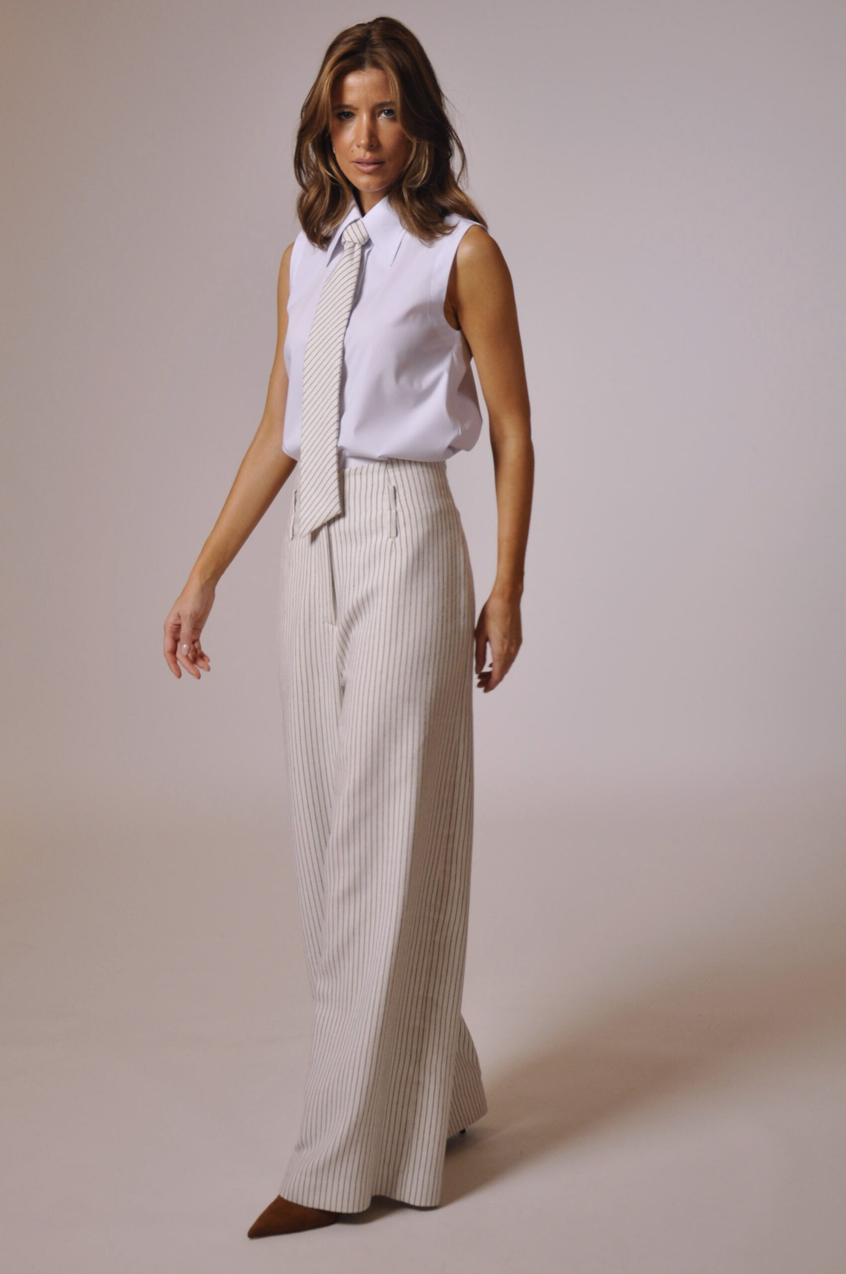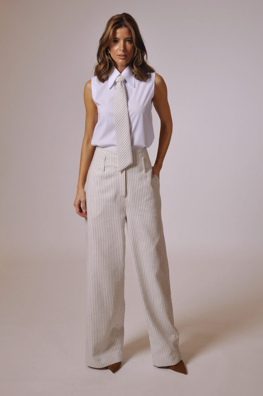 CALÇA MAH CÓS ALTO COM PASSANTE, FAIXA PARA AMARRAÇÃO E BOLSOS.