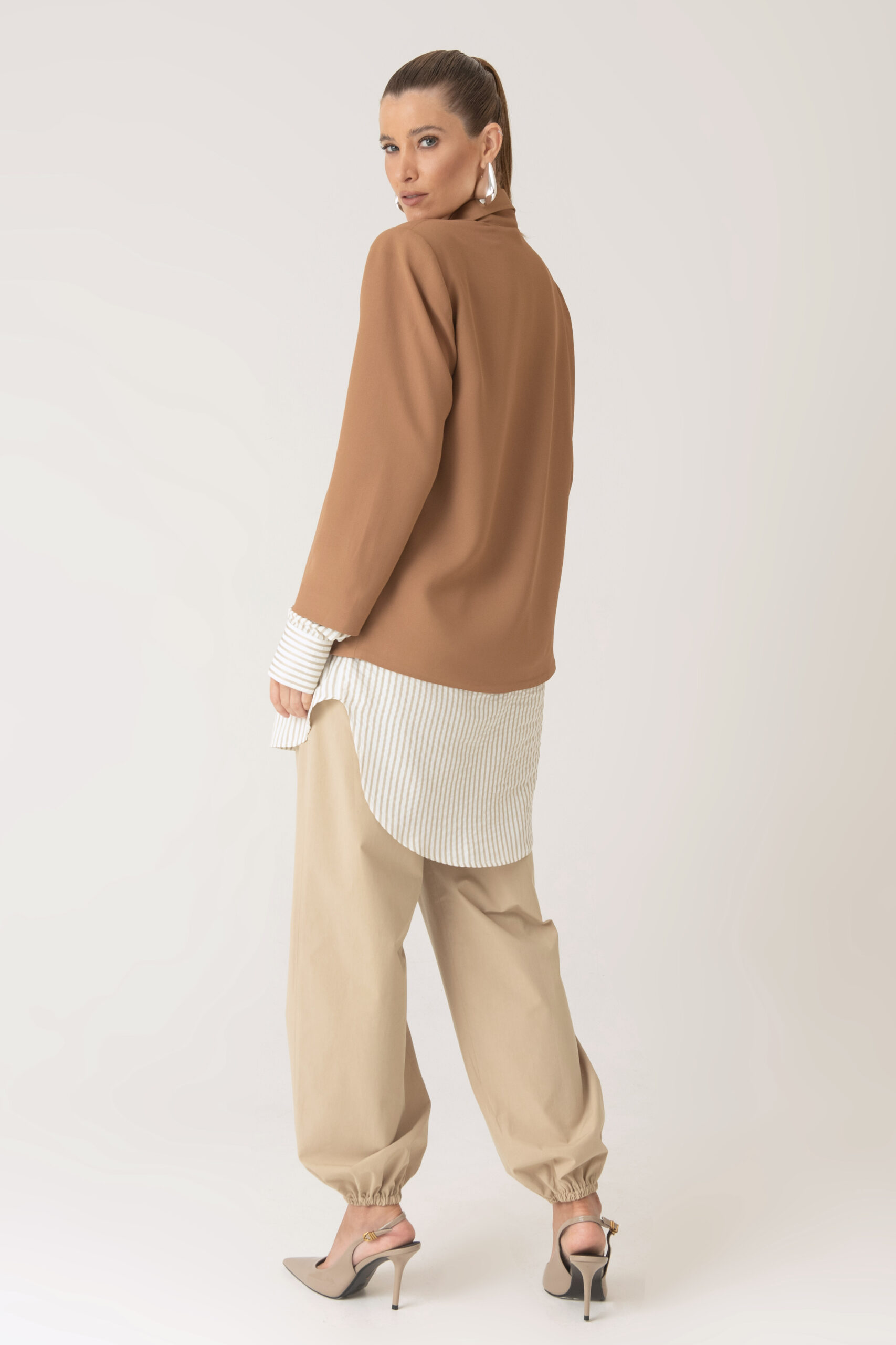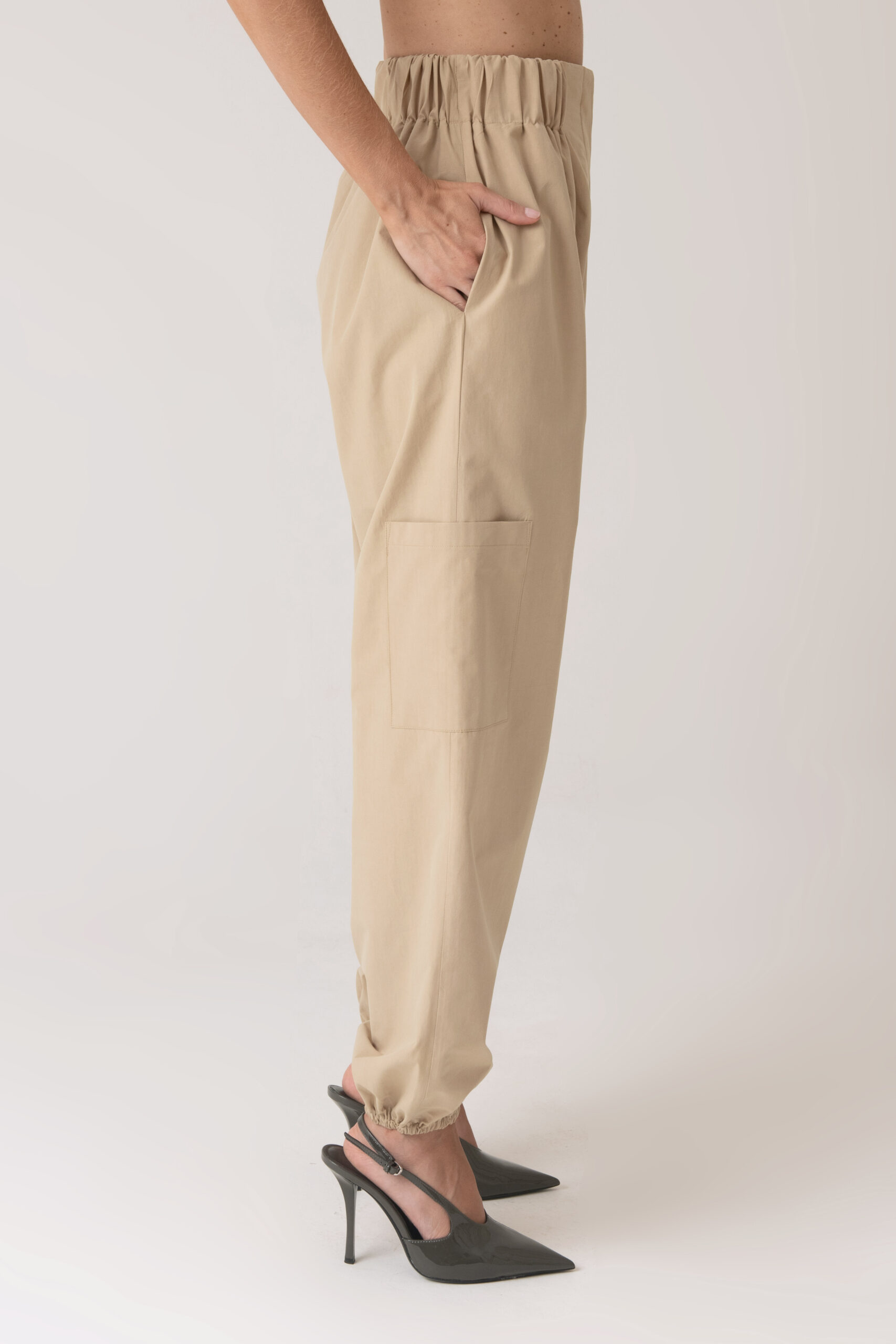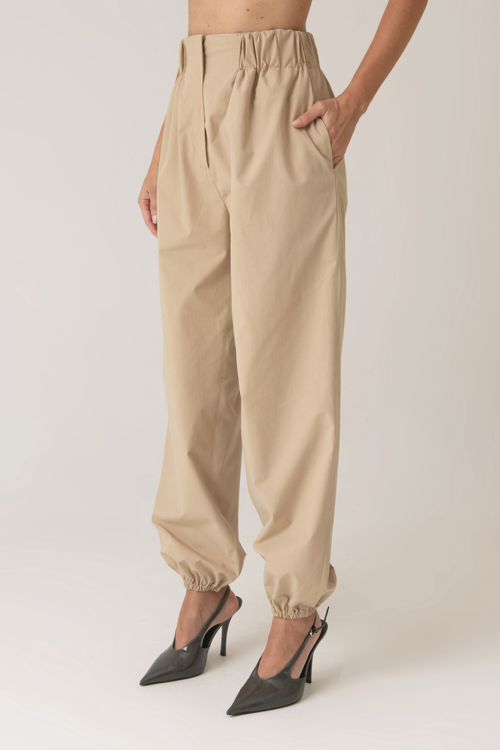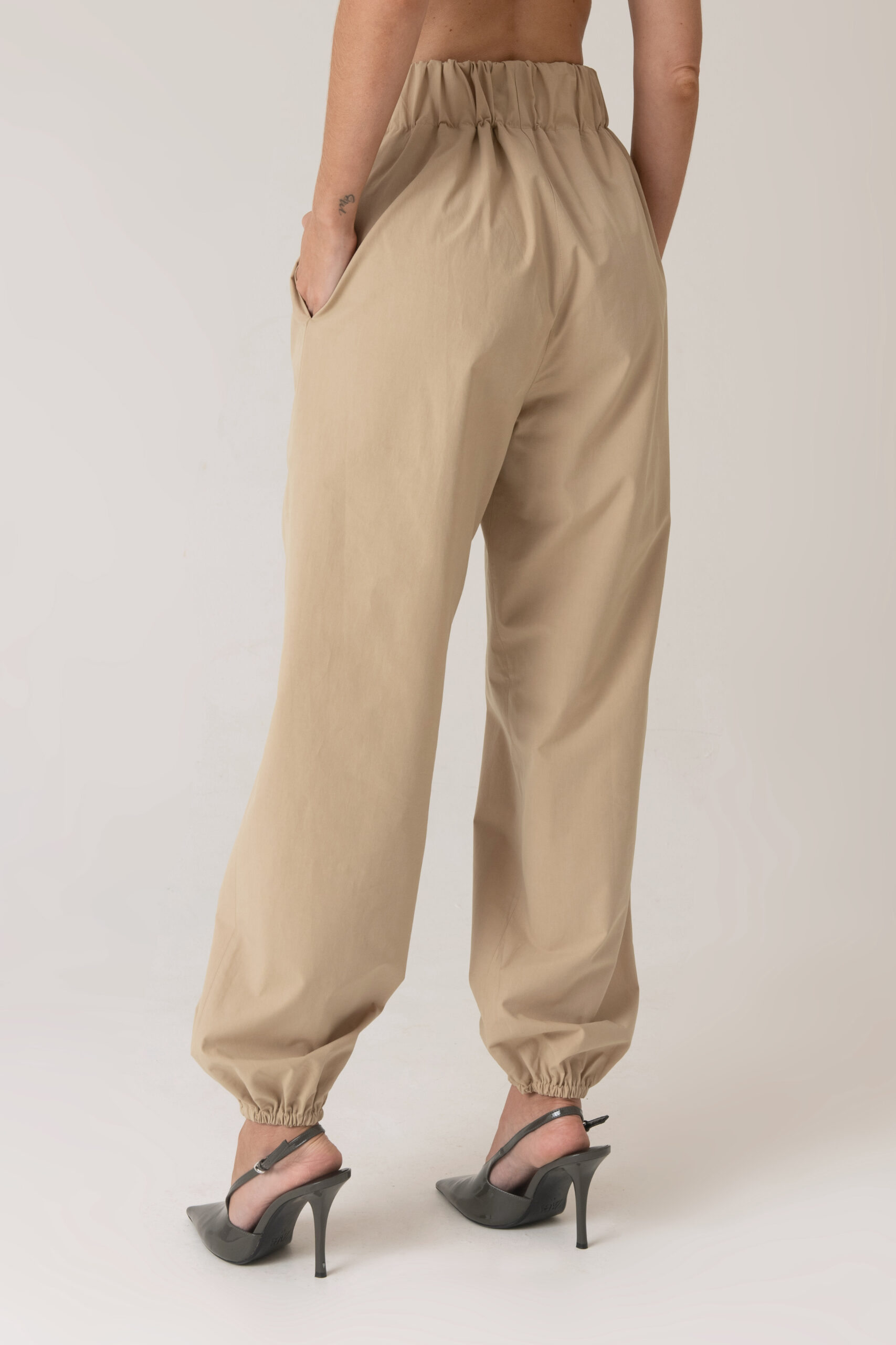 Possui cós com elástico, zíper e gancho, bolsos laterais e barra ajustada com elástico.
