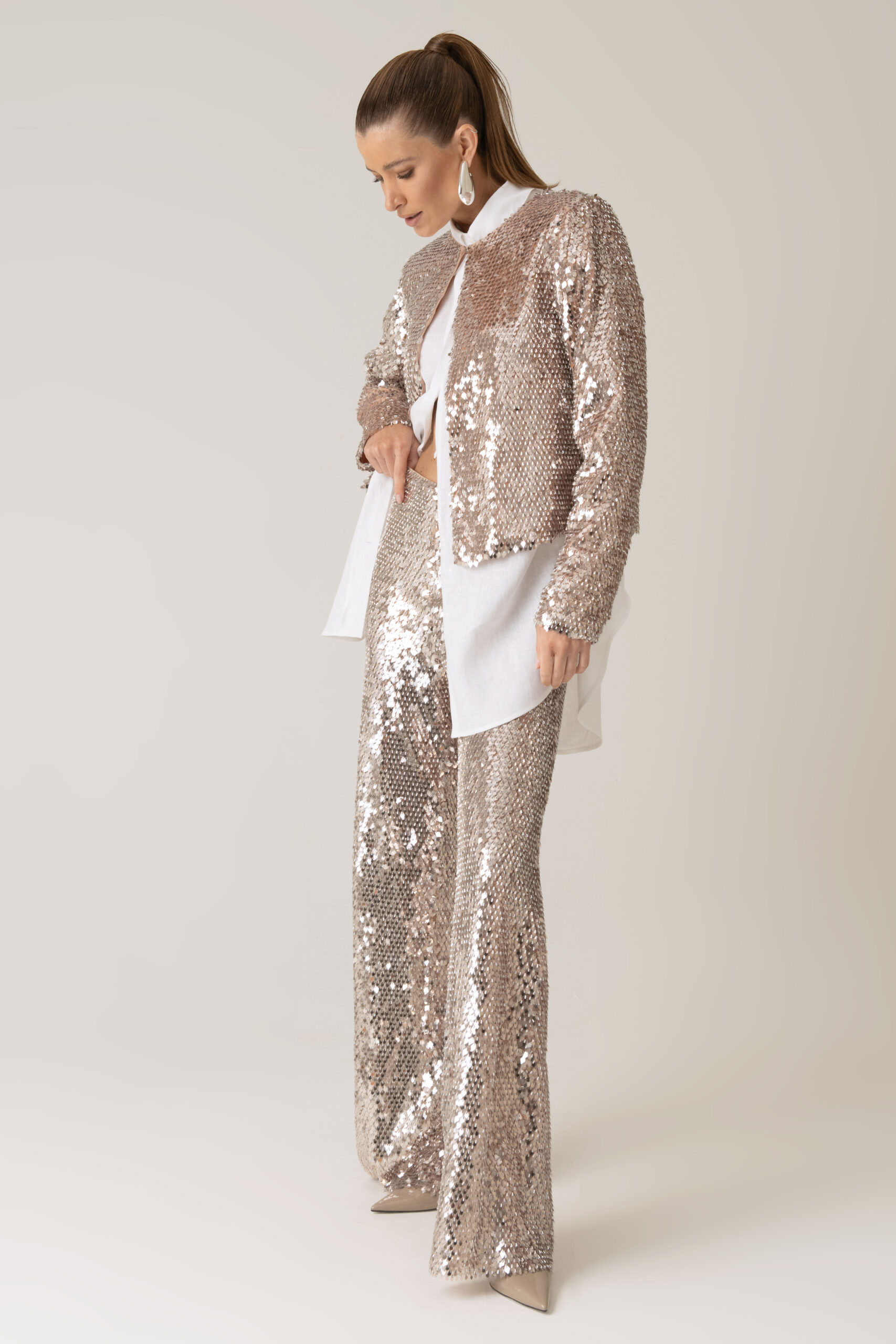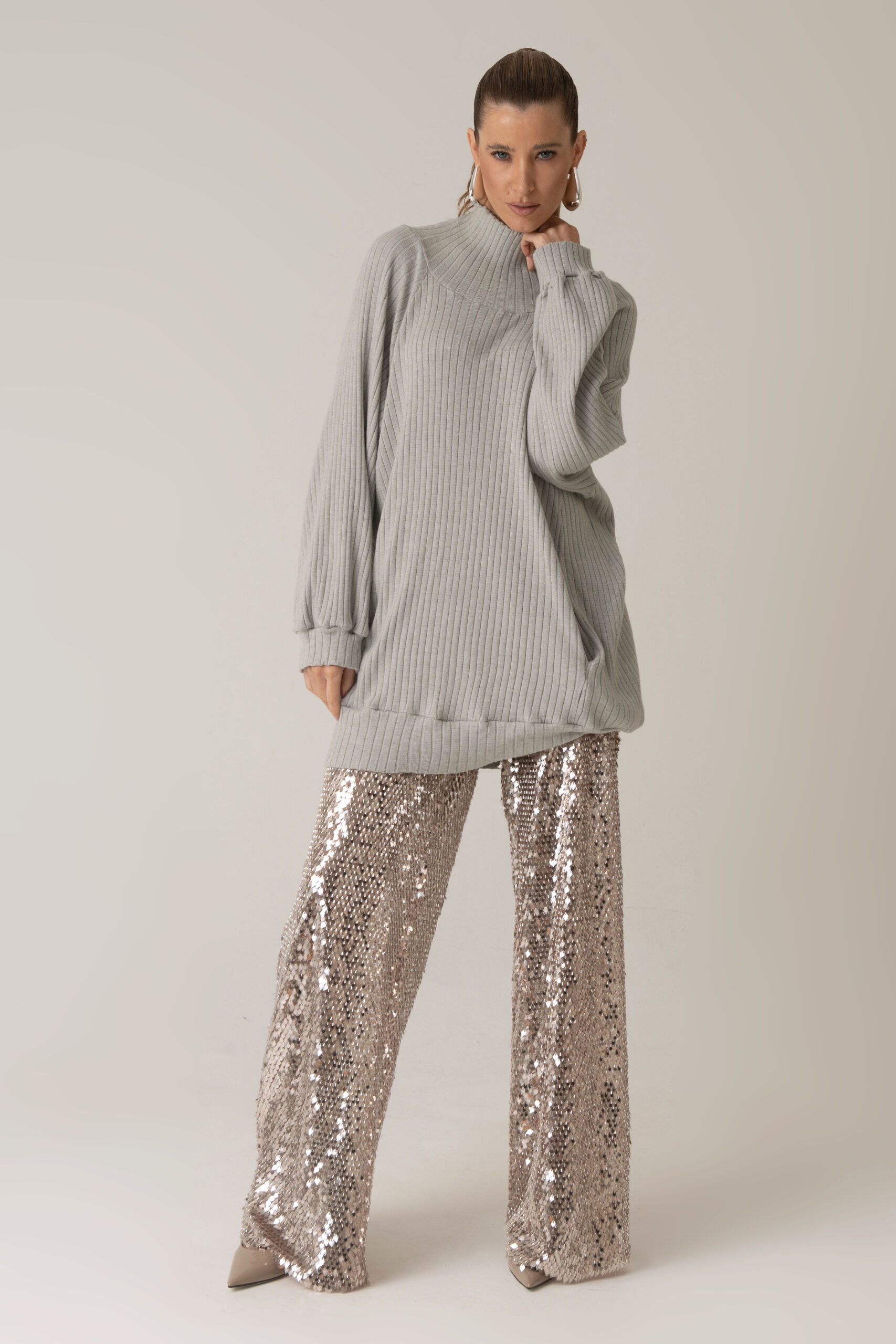 Possui caimento fluido e confortável, com leve movimento ao caminhar.