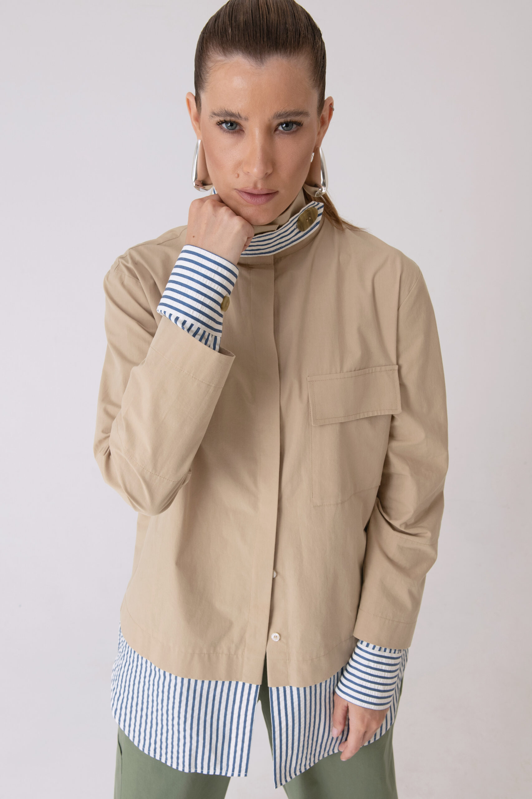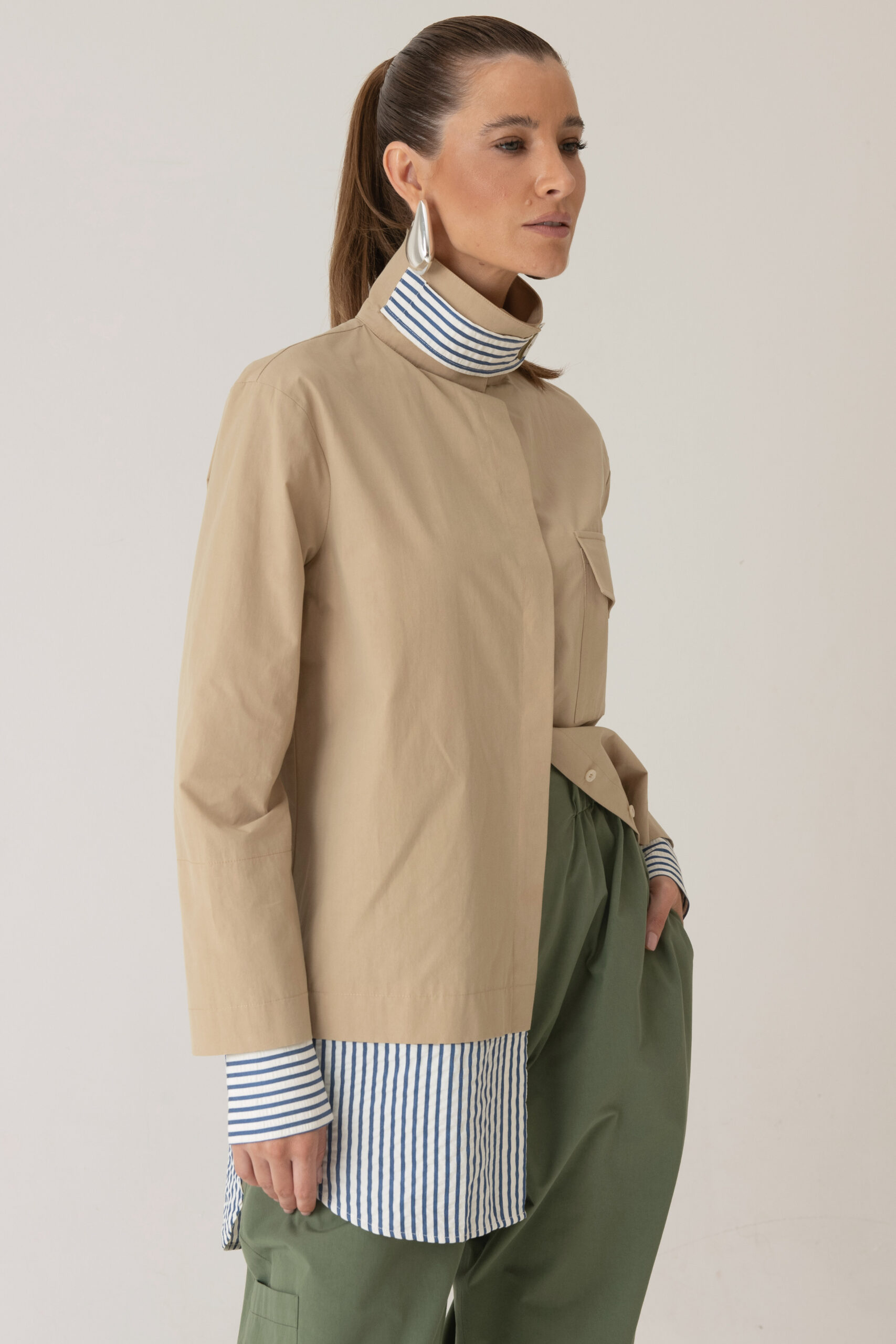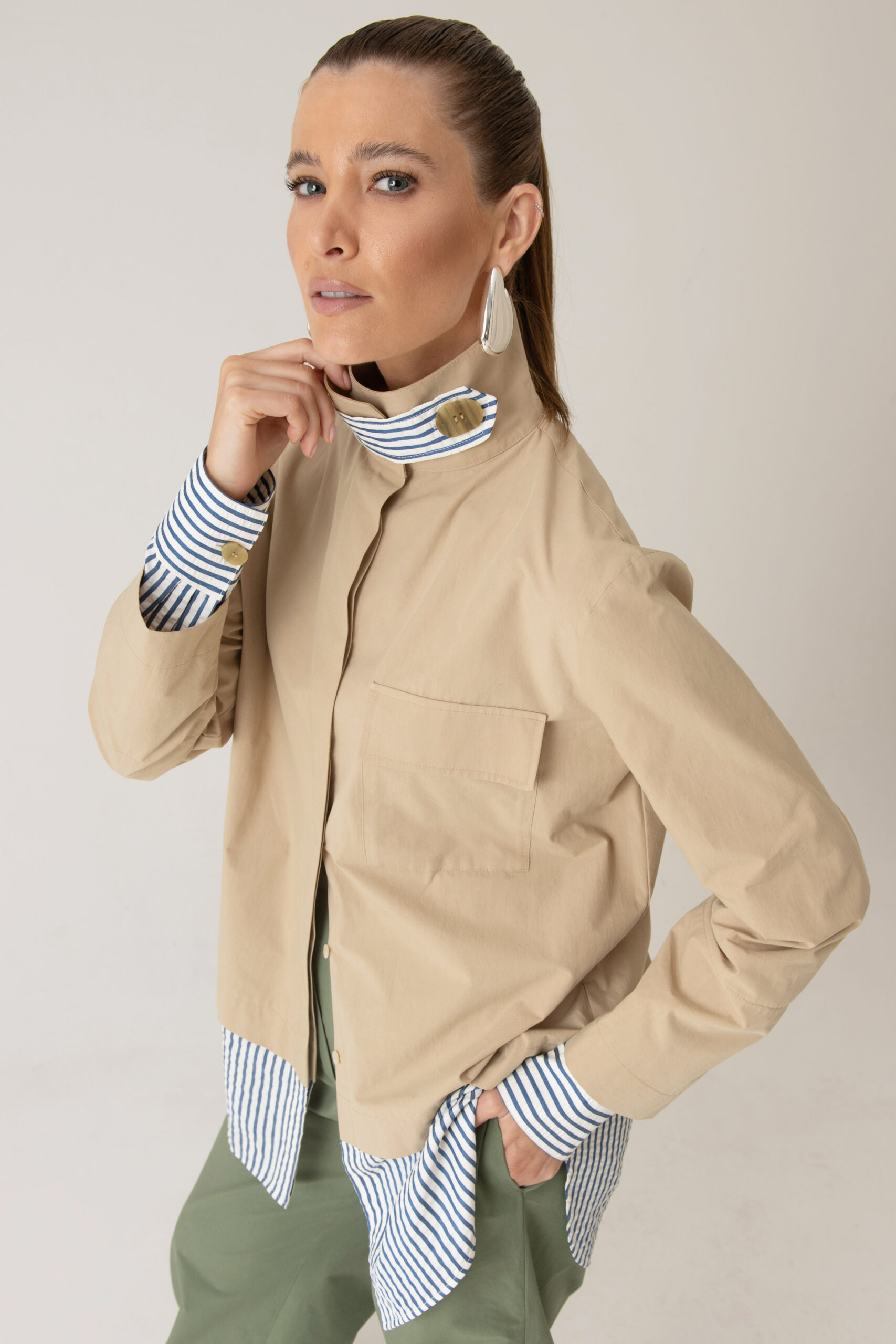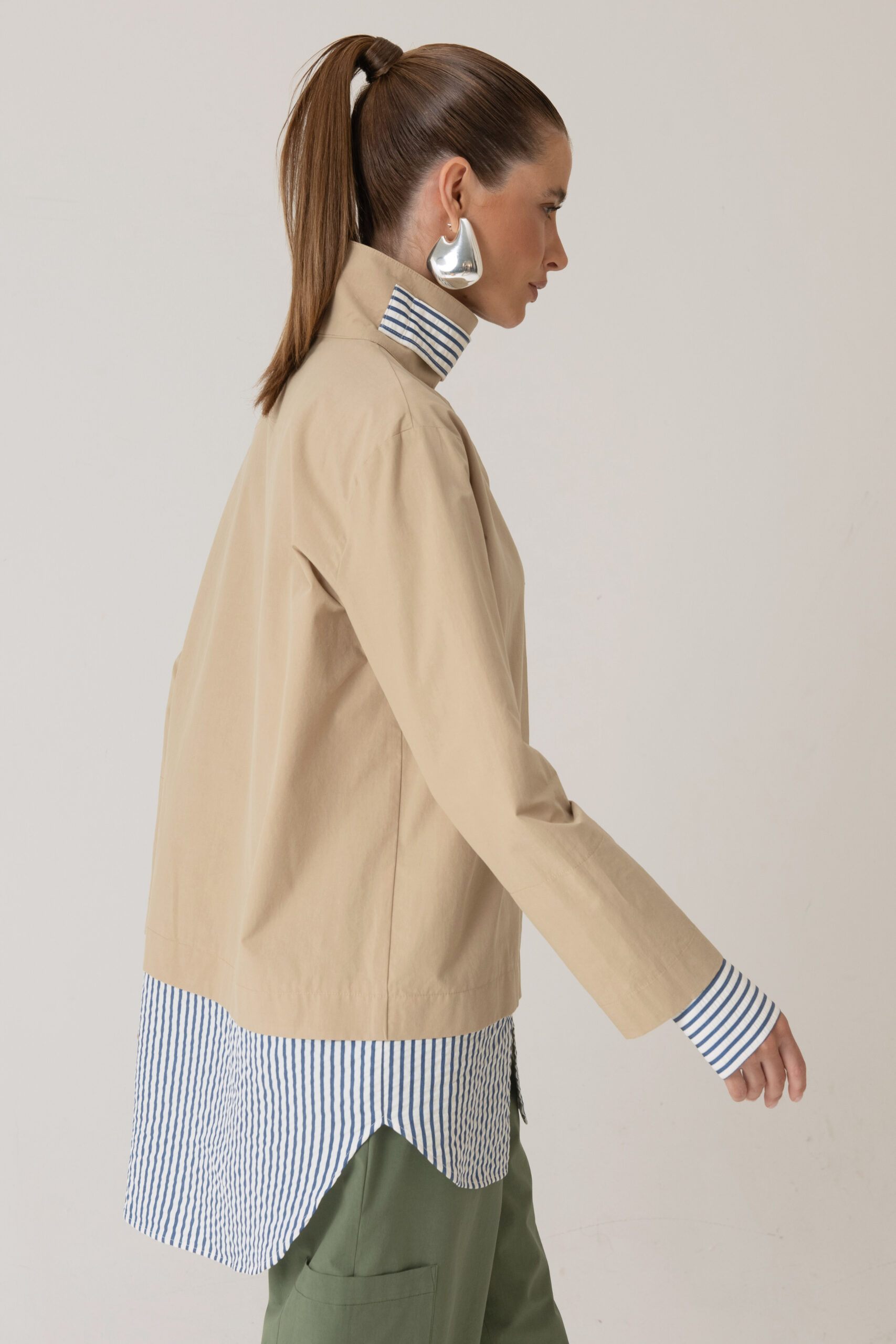 Possui fechamento frontal, bolso aplicado e detalhes contrastantes nas mangas e barra com tecido em algodão listrado.