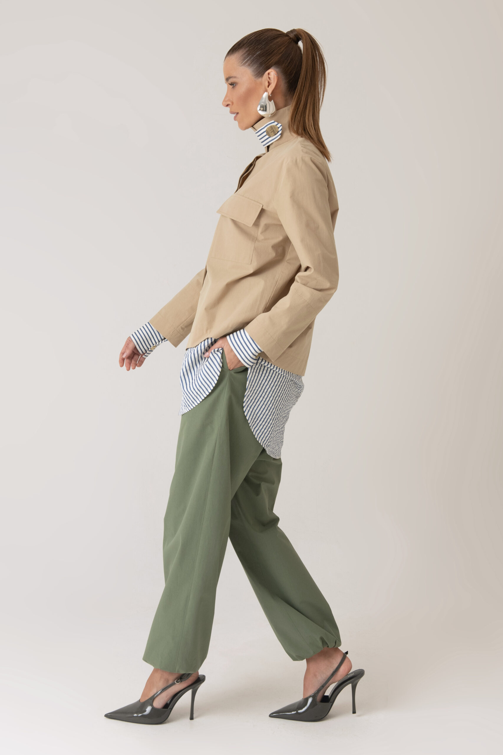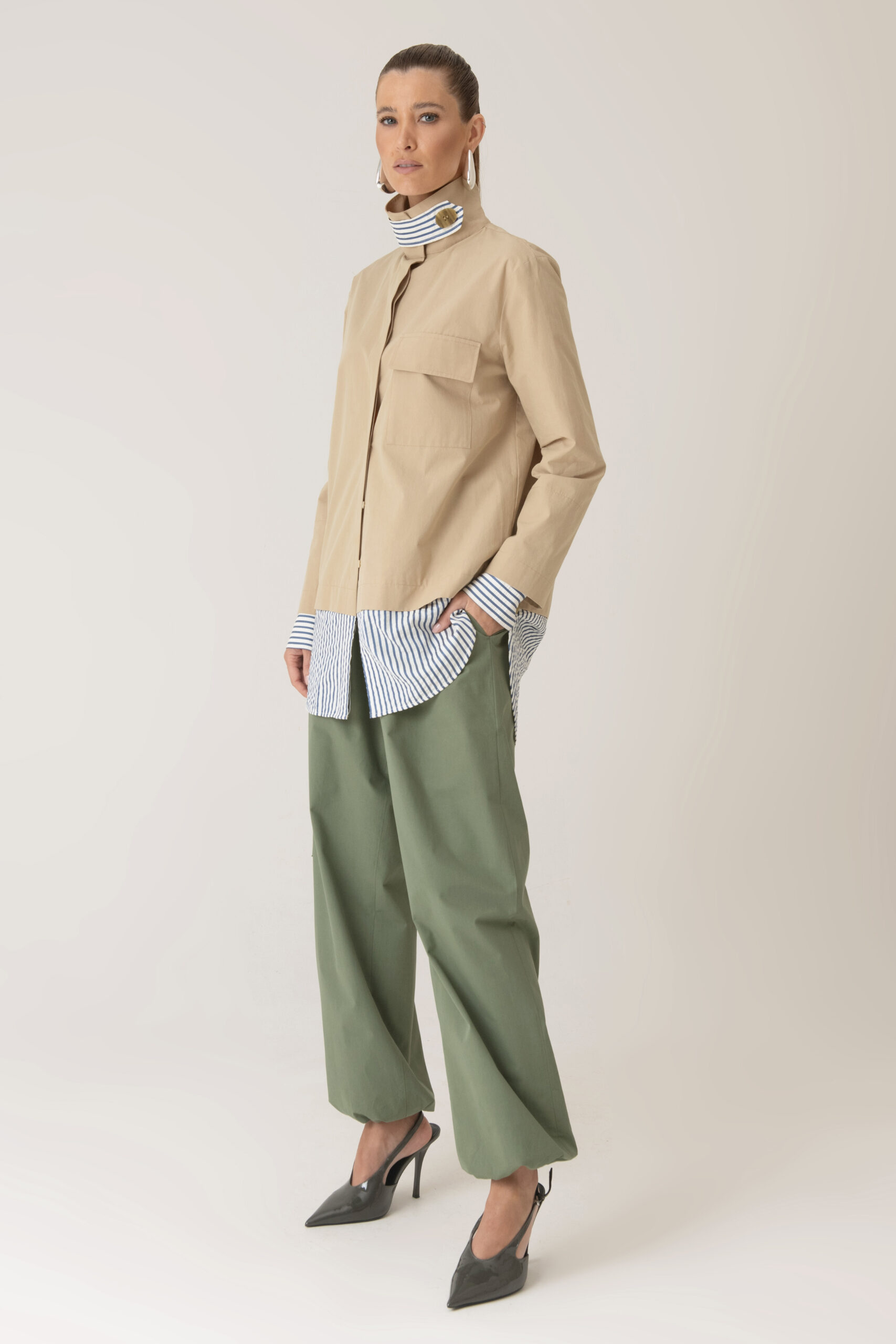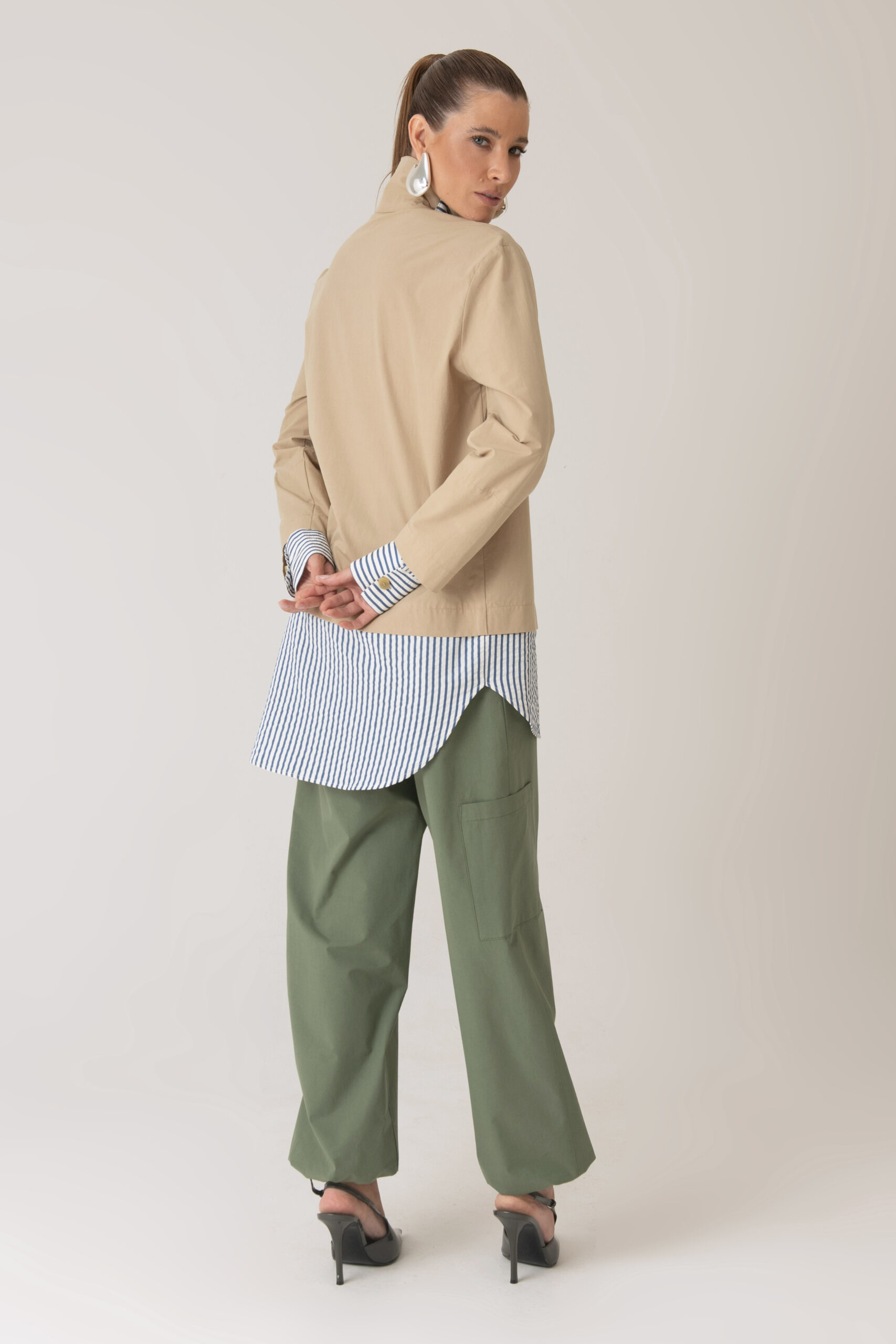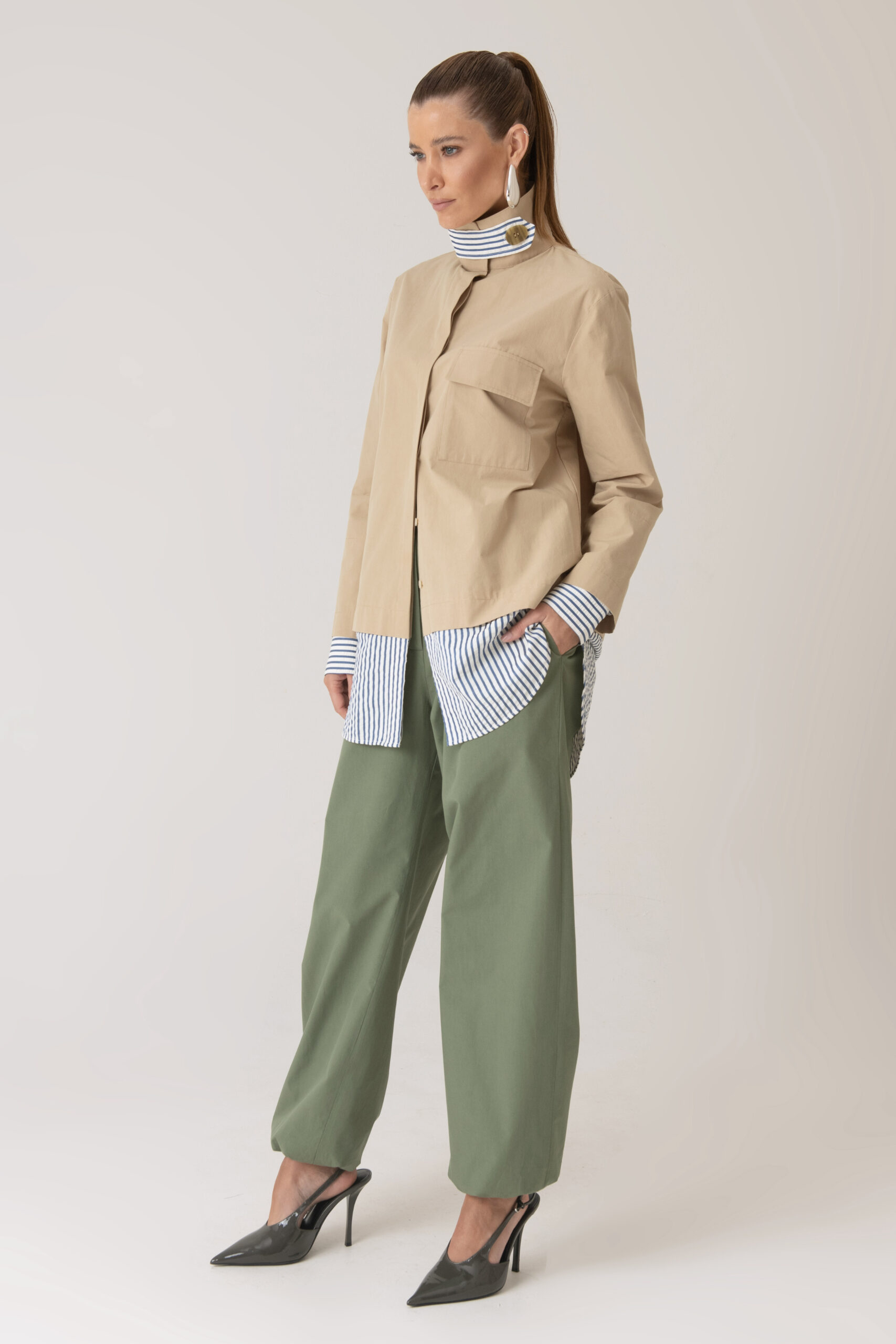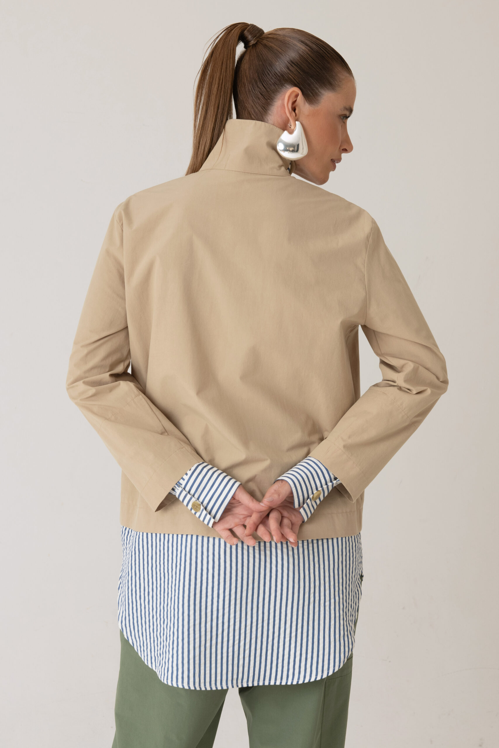 Possui fechamento frontal, bolso aplicado e detalhes contrastantes nas mangas e barra com tecido em algodão listrado.