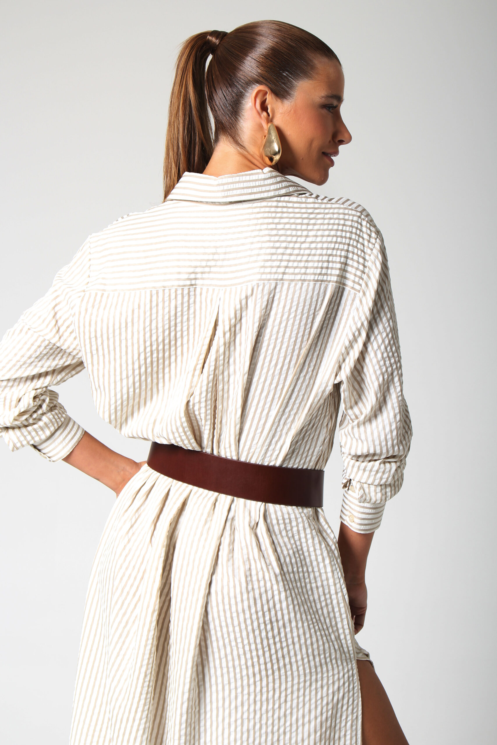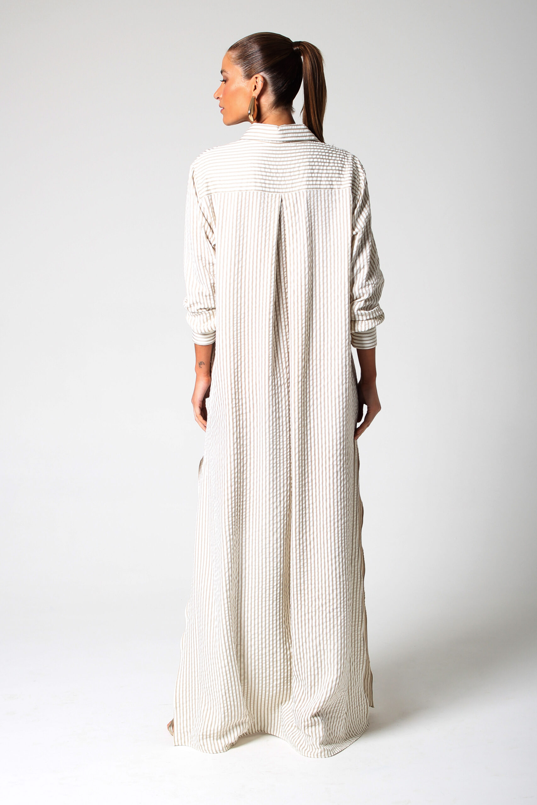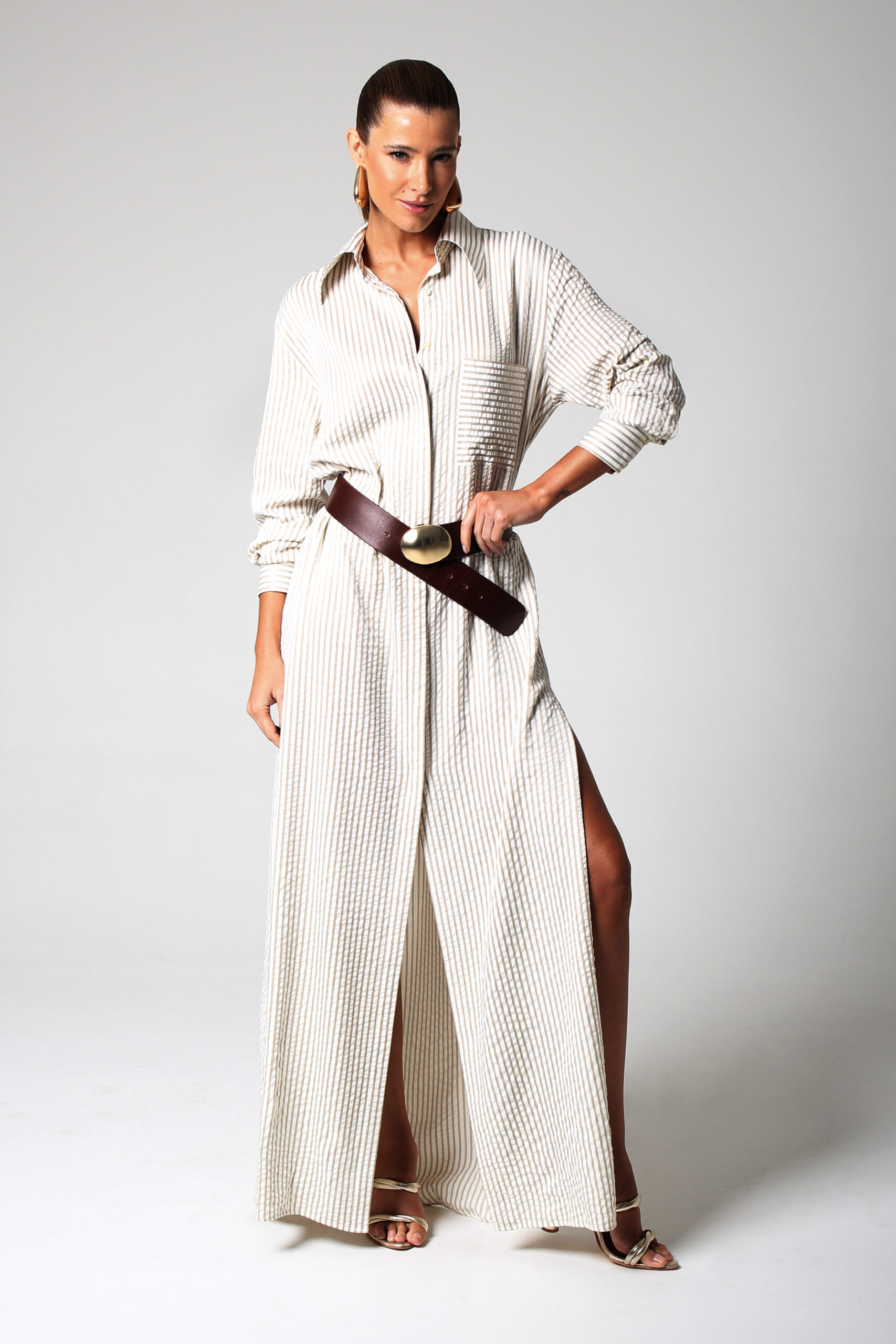 CHEMISE VALE LONGA COM ABOTOAMENTO FRONTAL, MANGA LONGA, BOLSO FRONTAL E FENDAS LATERAIS.