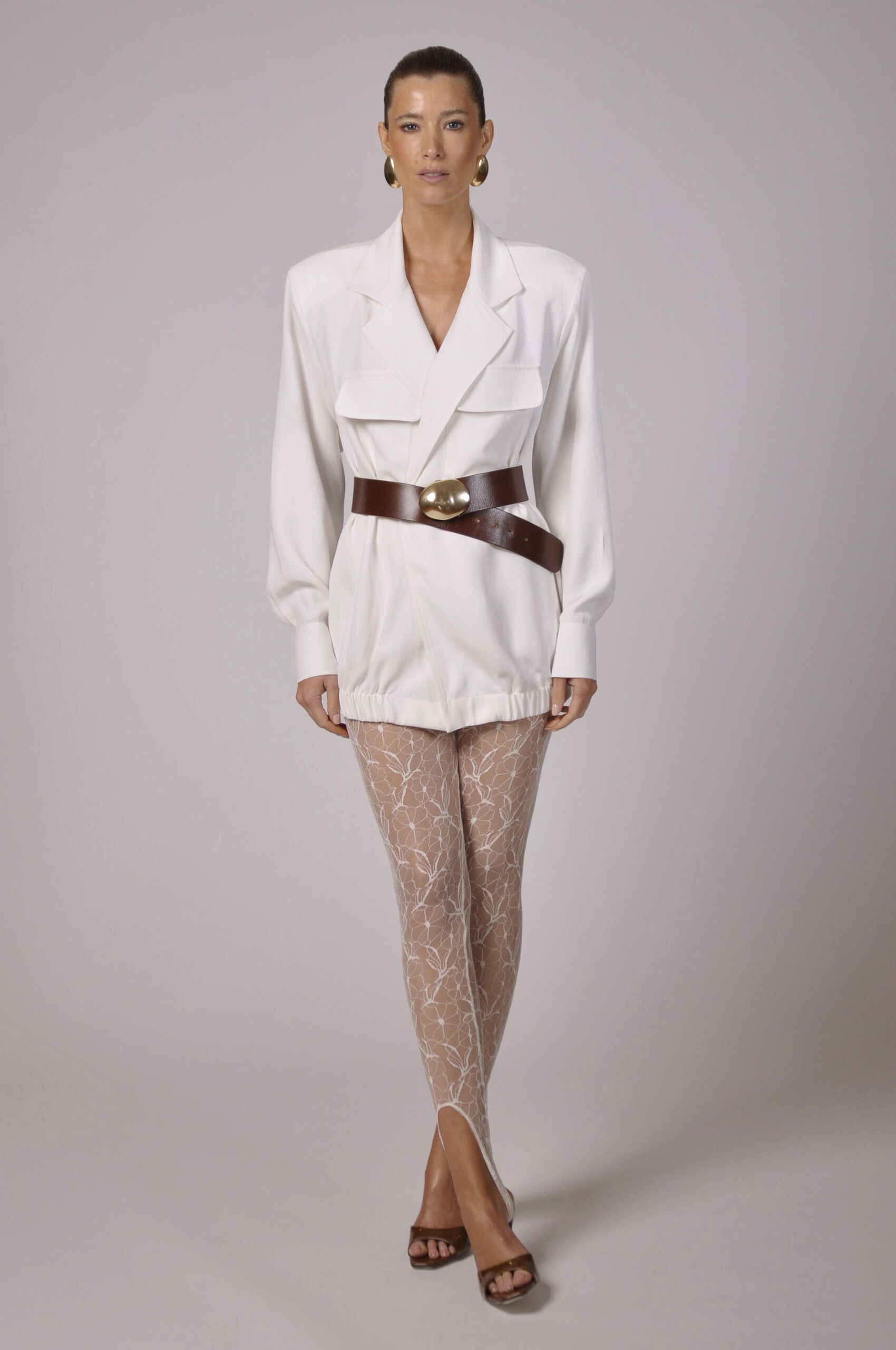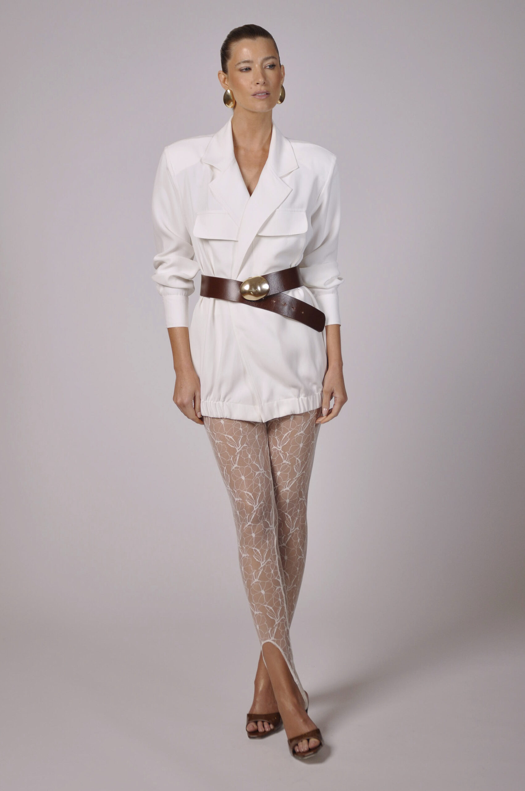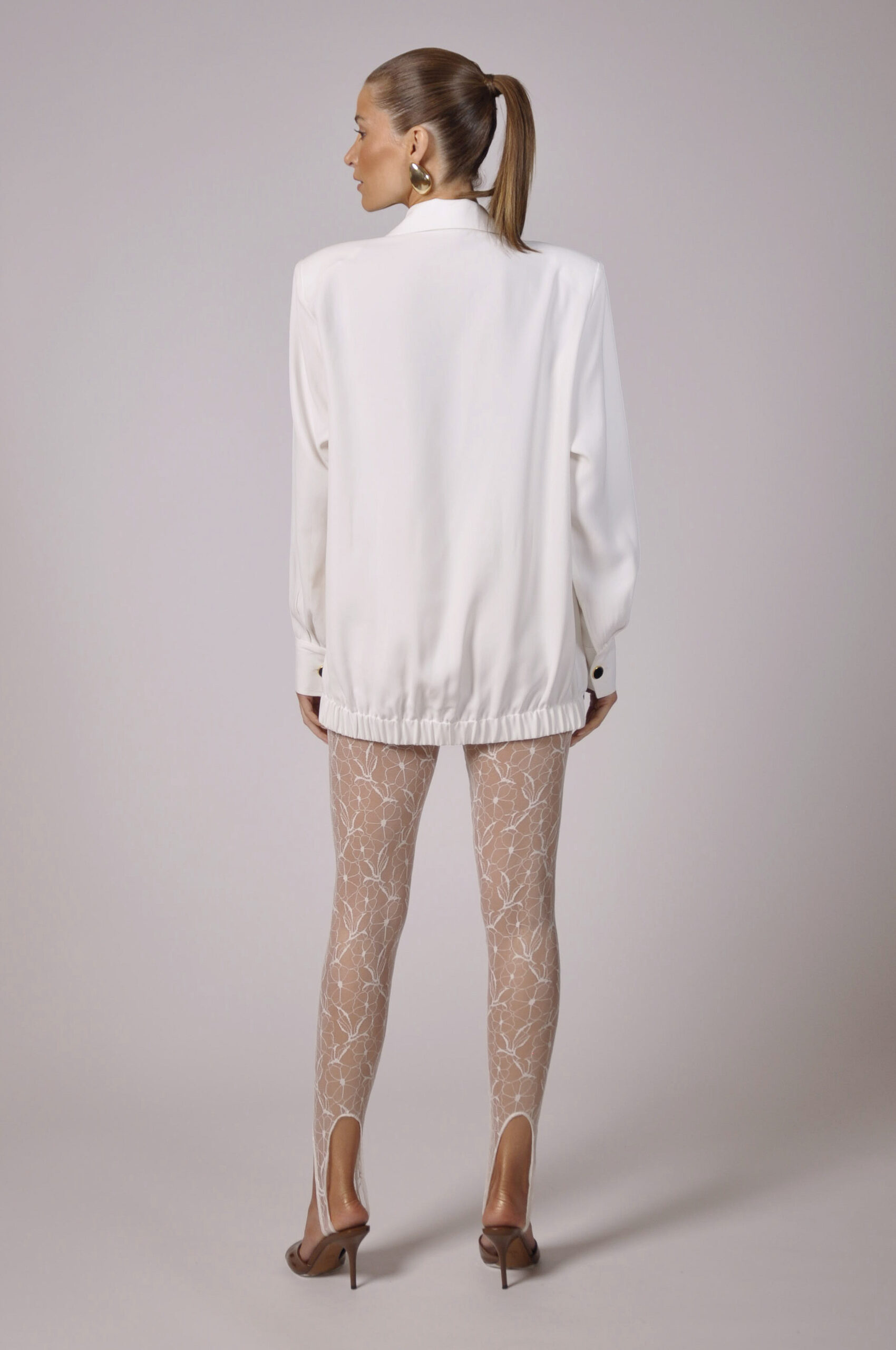 LEGGING DAY EM RENDA PÉROLA COM ELÁSTICO NA CINTURA. ACOMPANHA HOT PANTS EM ECOFIO PRETO.