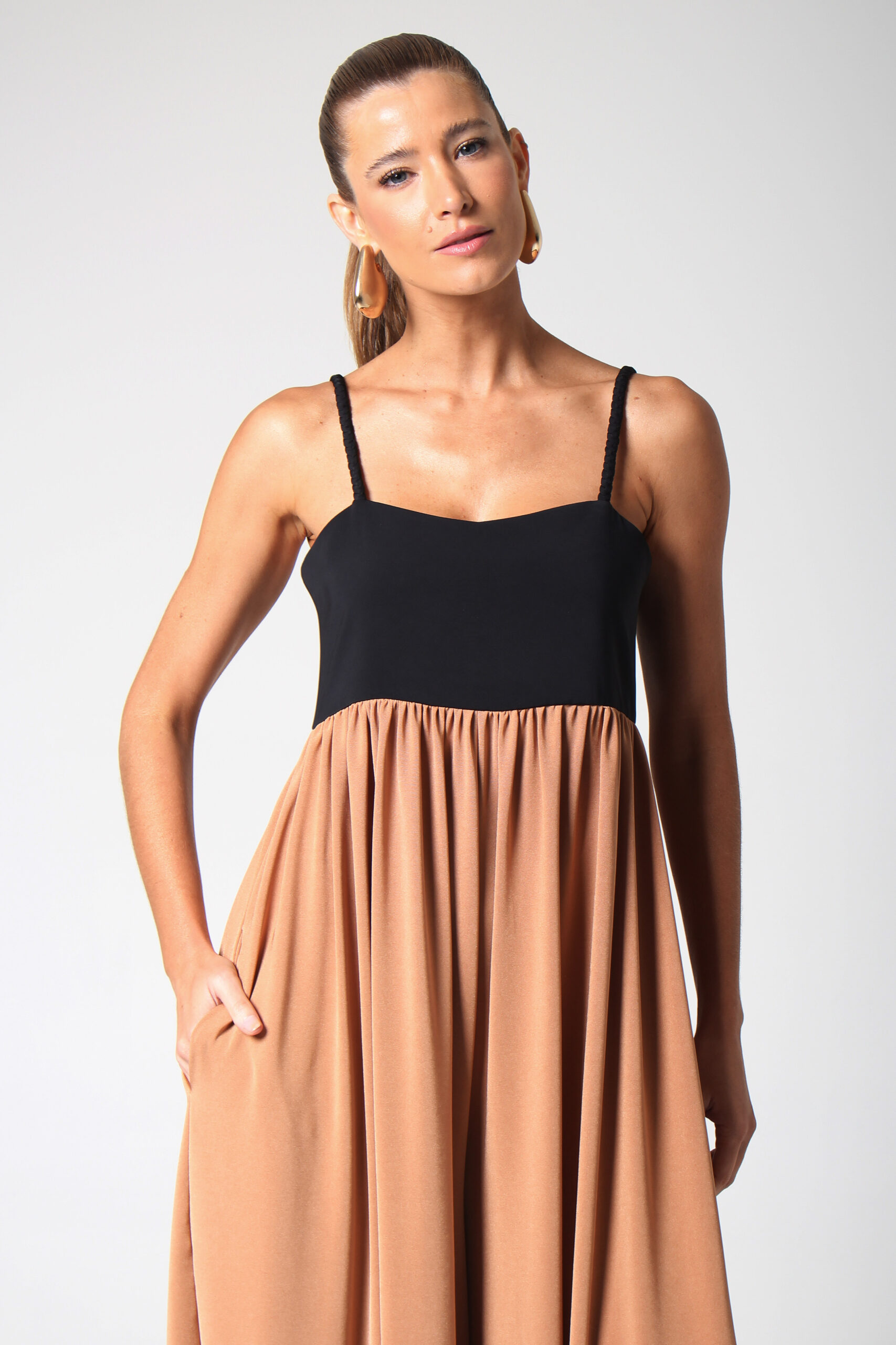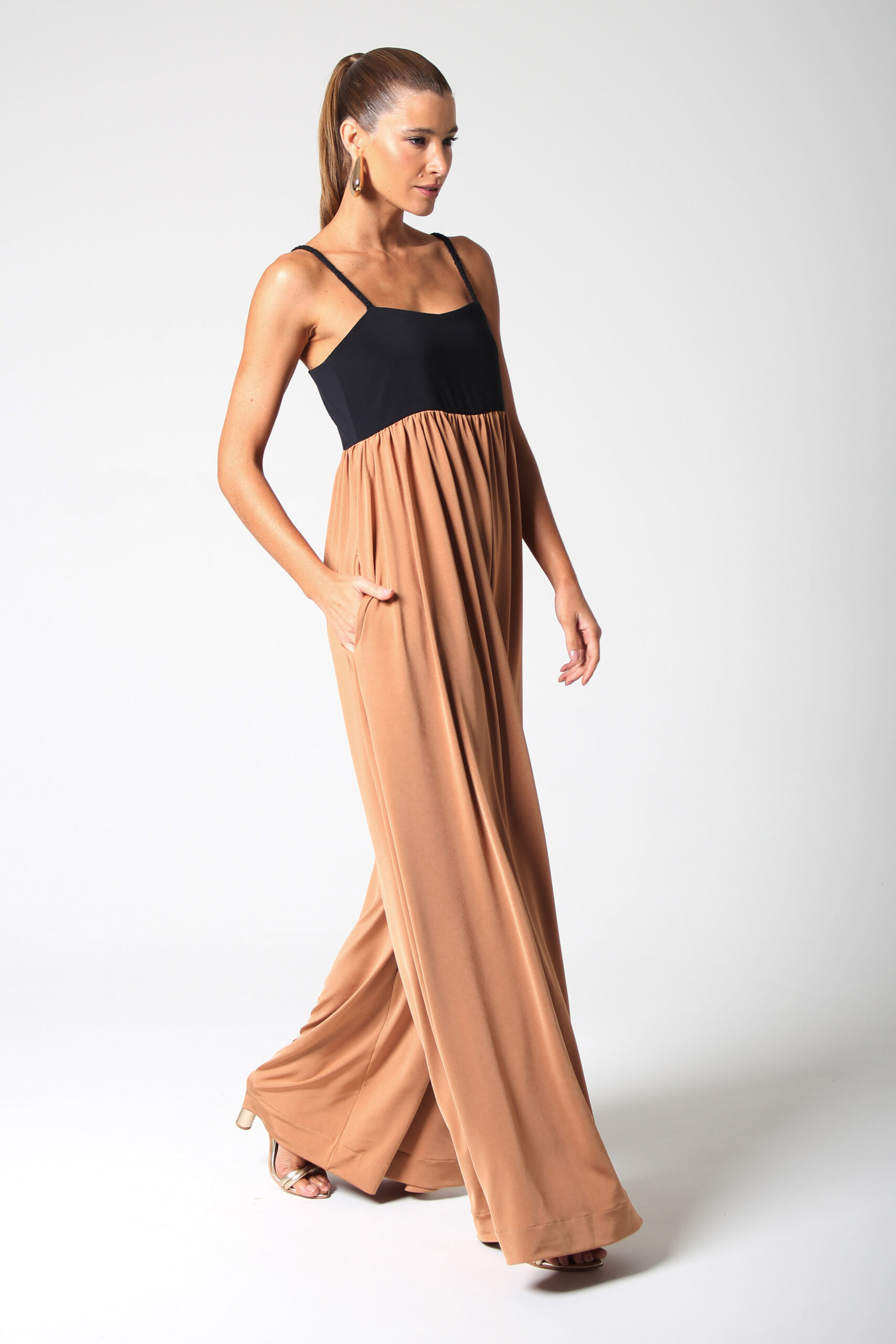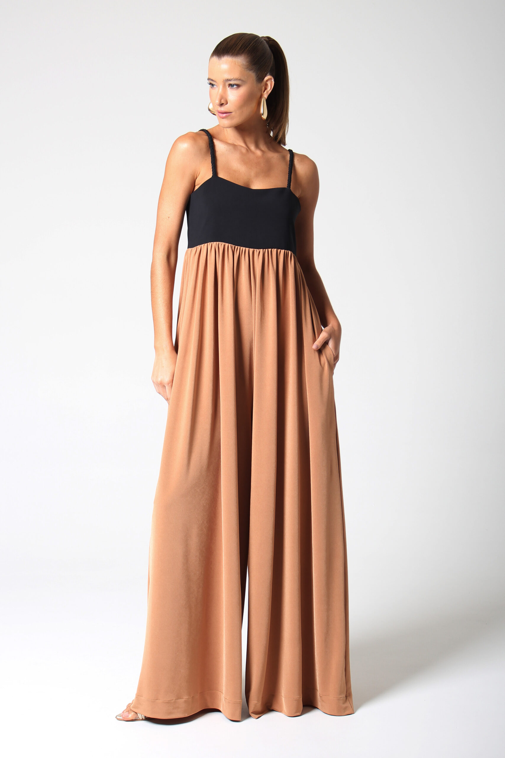 MACACÃO TWO-TONE COM ALÇA TRANÇADA, BOLSOS LATERAIS E FECHAMENTO POSTERIOR EM ZÍPER