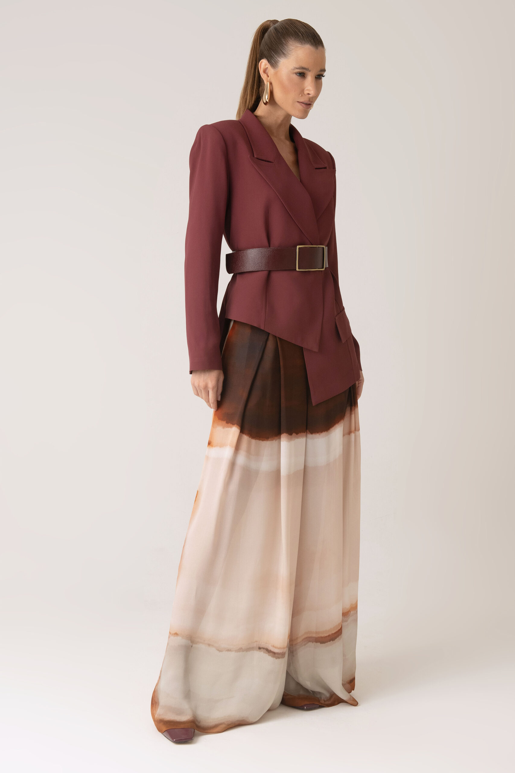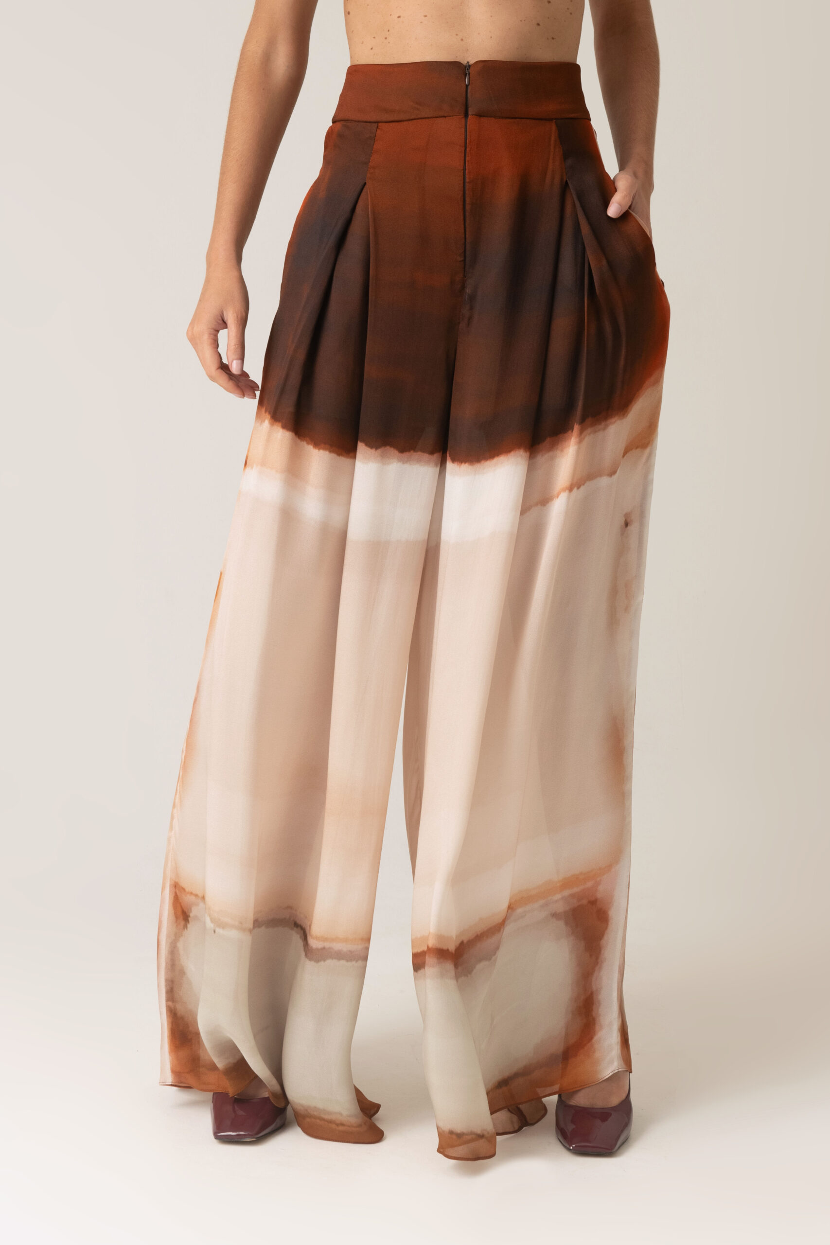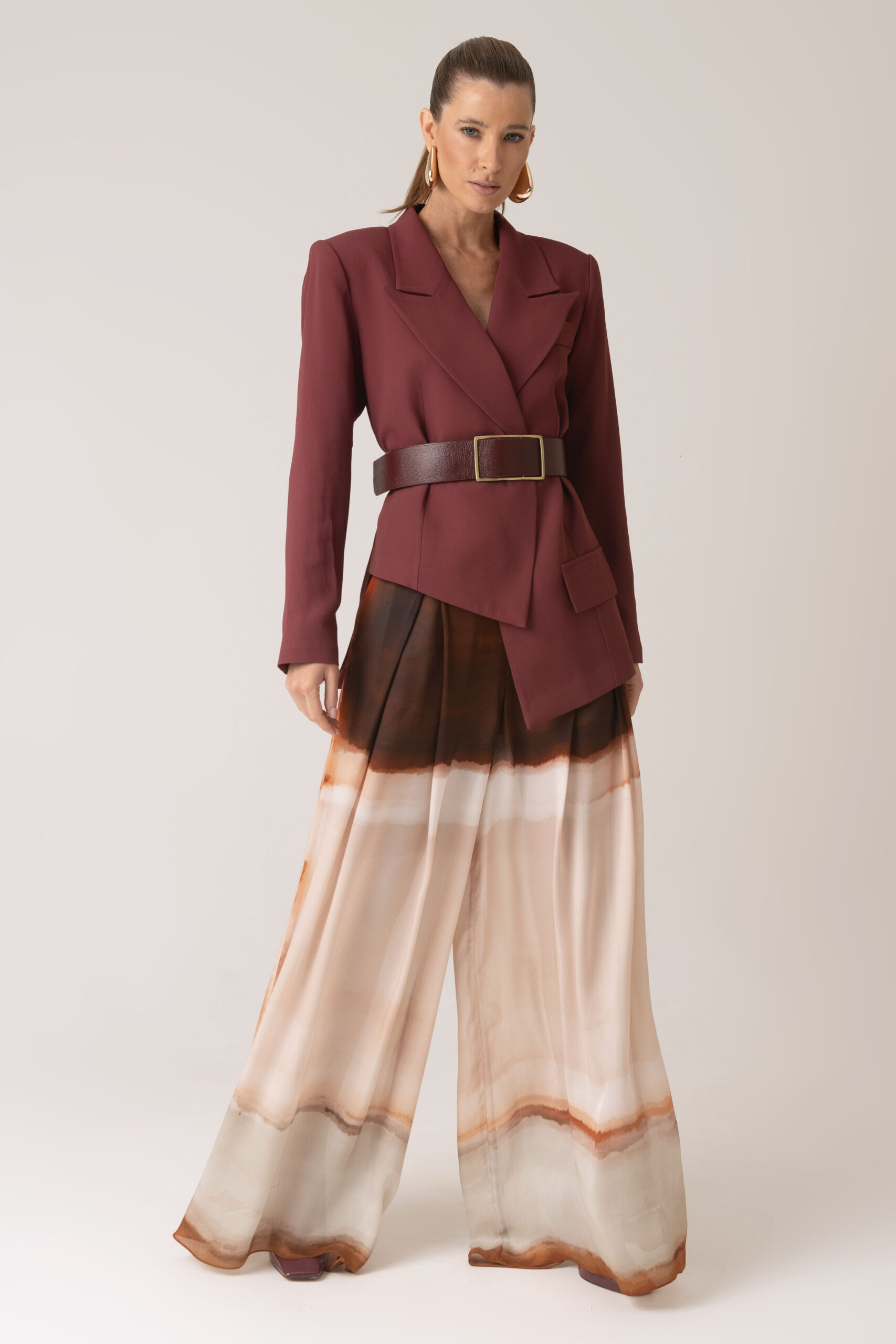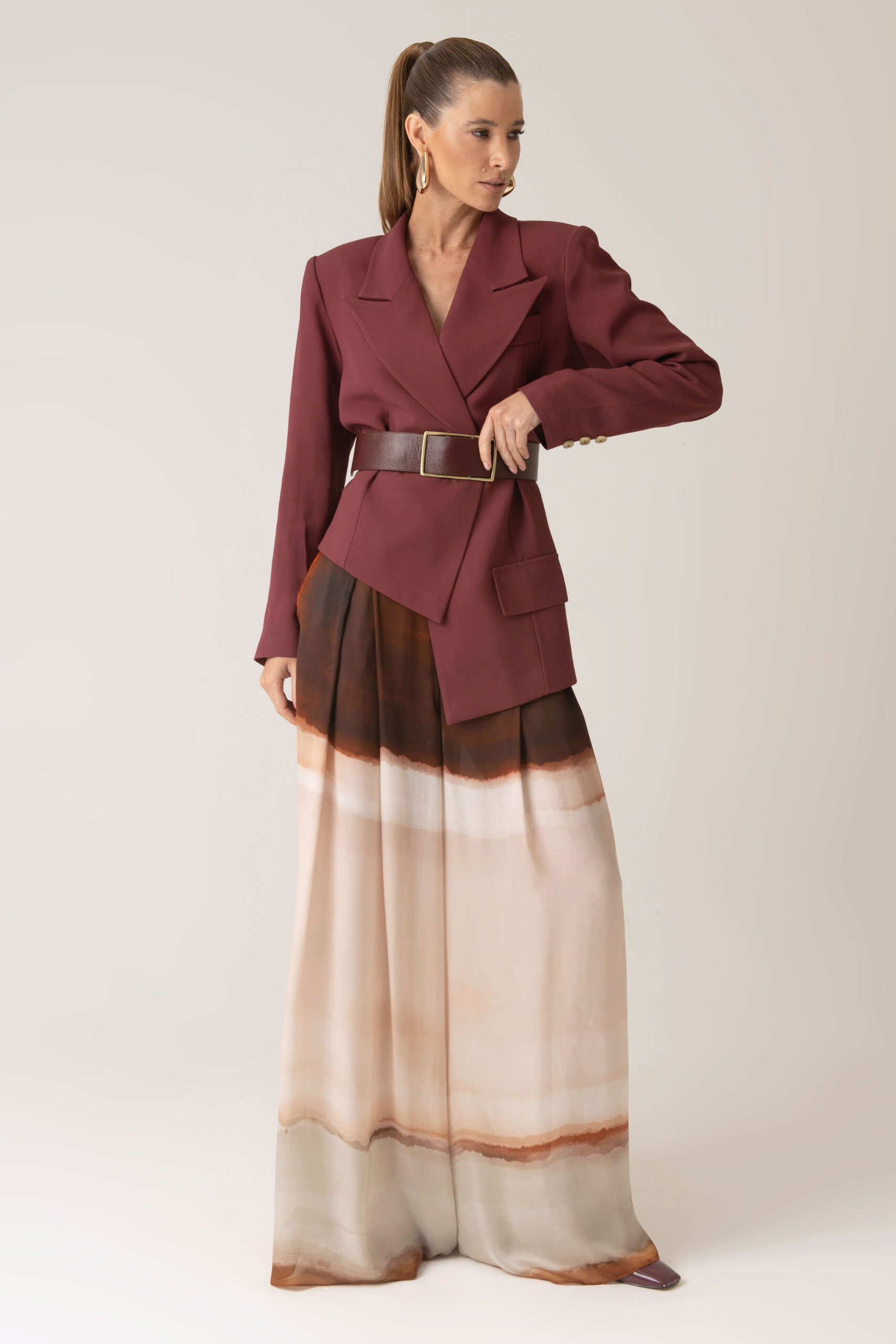 Possui cós alto, valorizando a cintura e criando uma proporção sofisticada no look. A estampa com efeito degradê adiciona profundidade e identidade visual à peça.