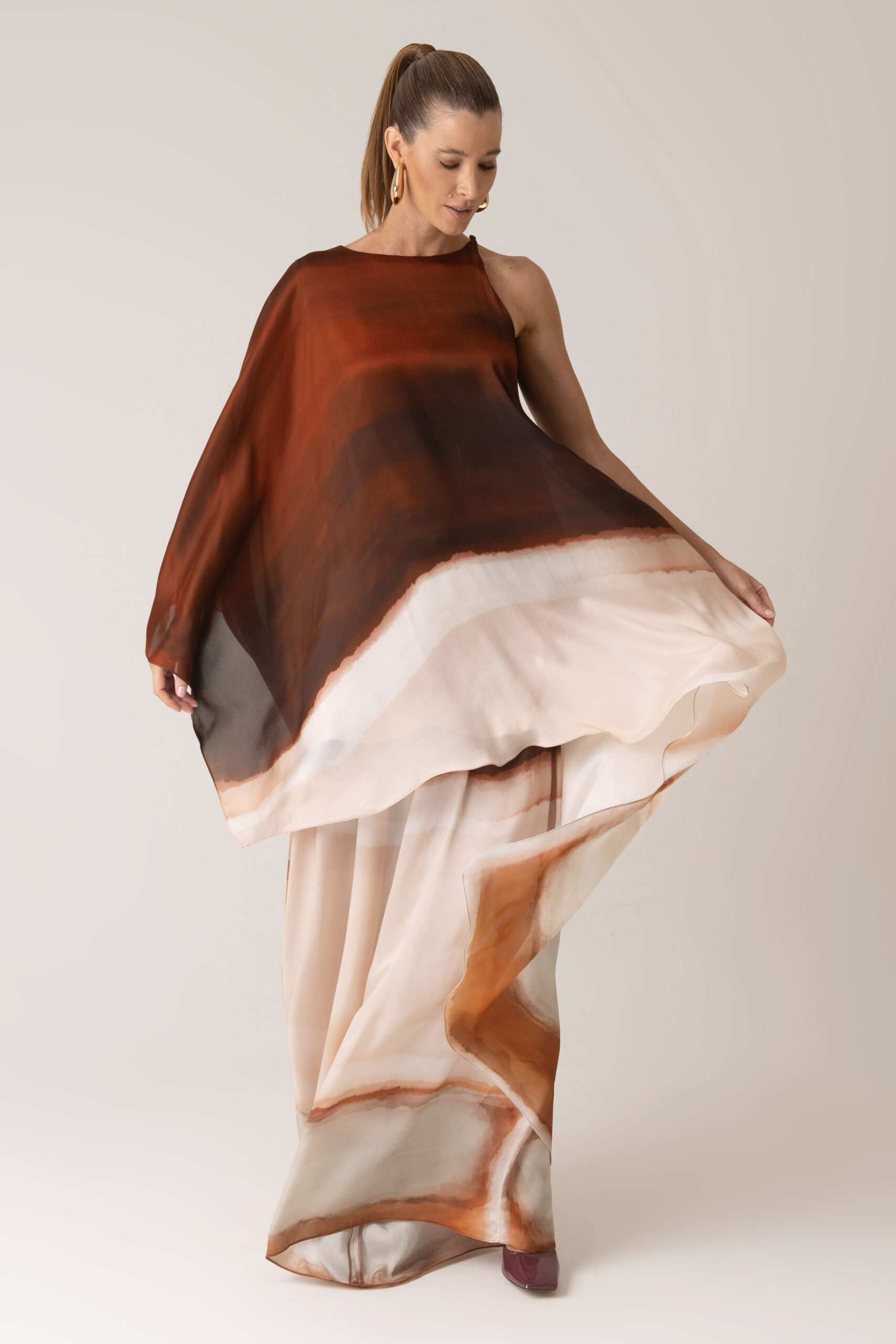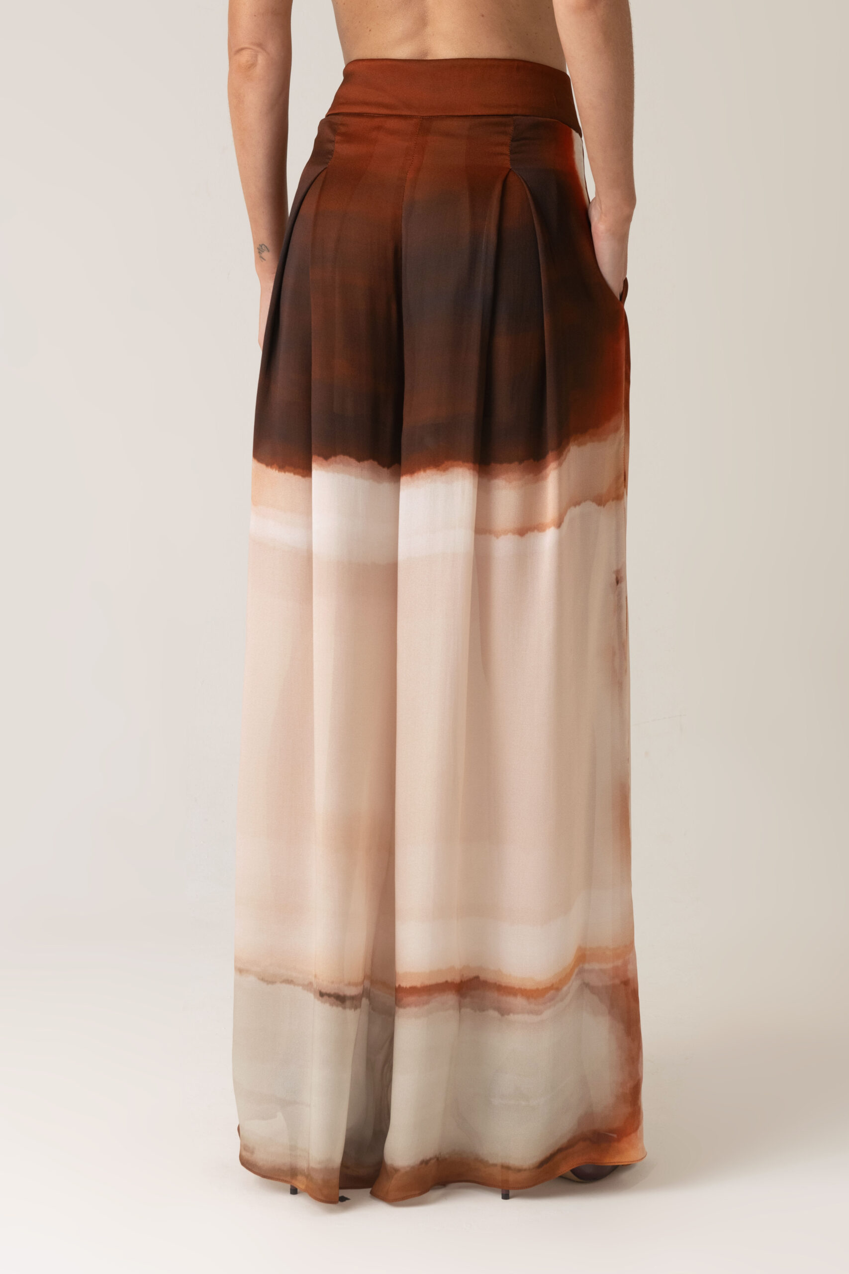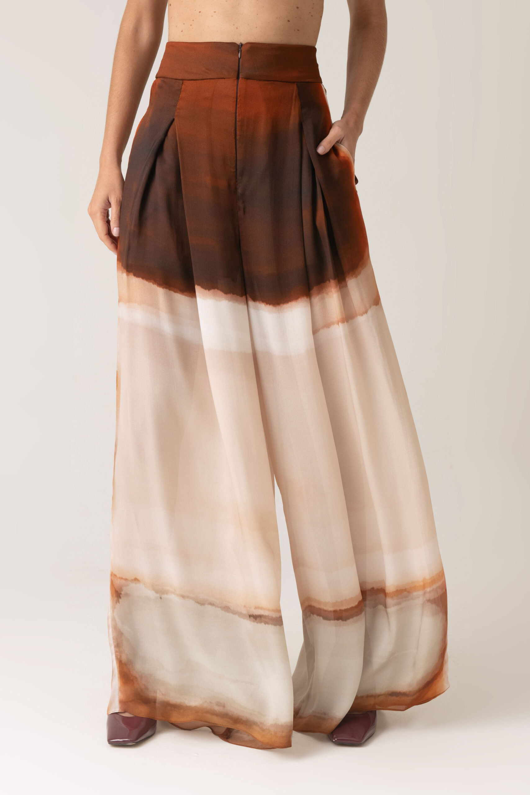 Possui cós alto, valorizando a cintura e criando uma proporção sofisticada no look. A estampa com efeito degradê adiciona profundidade e identidade visual à peça.