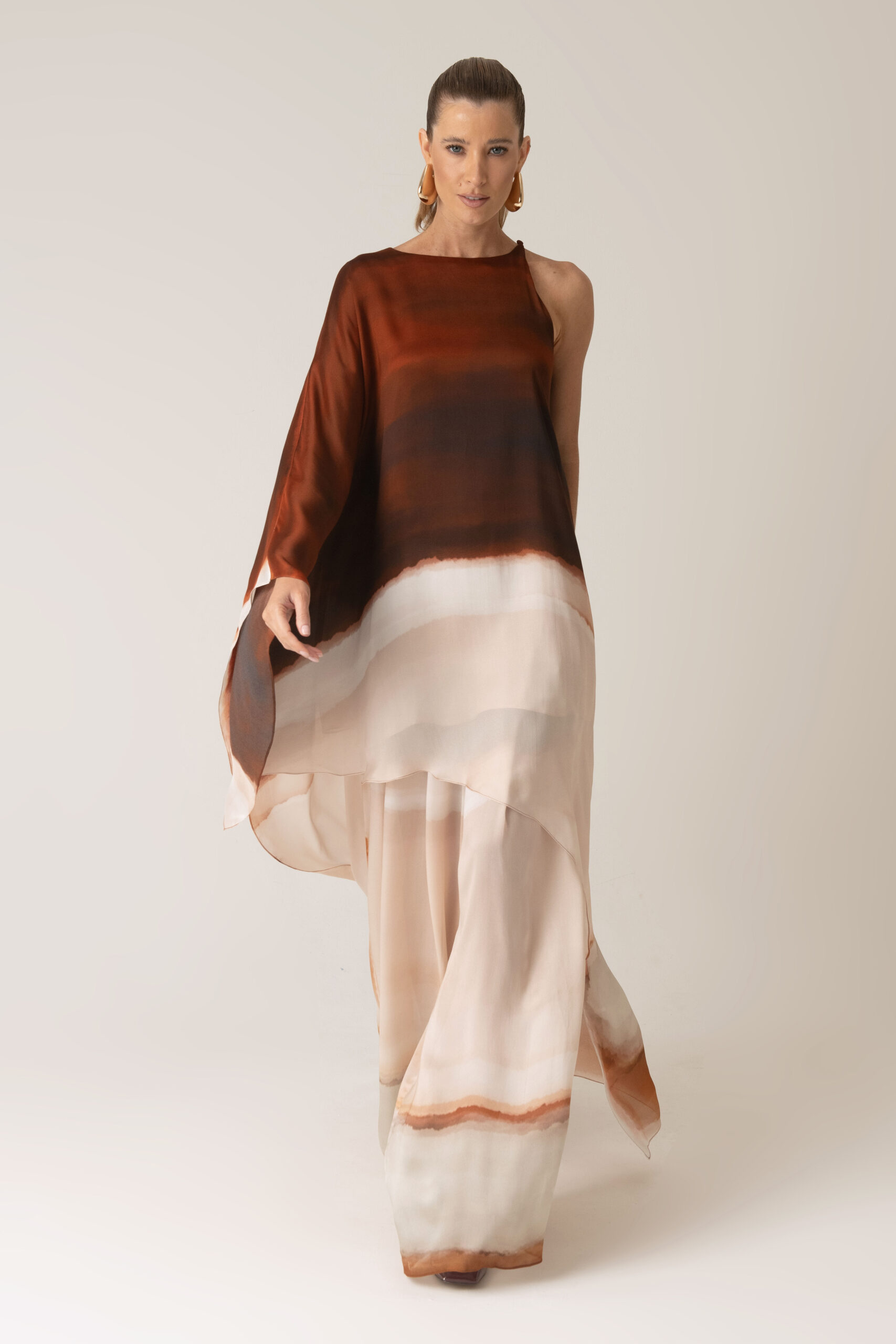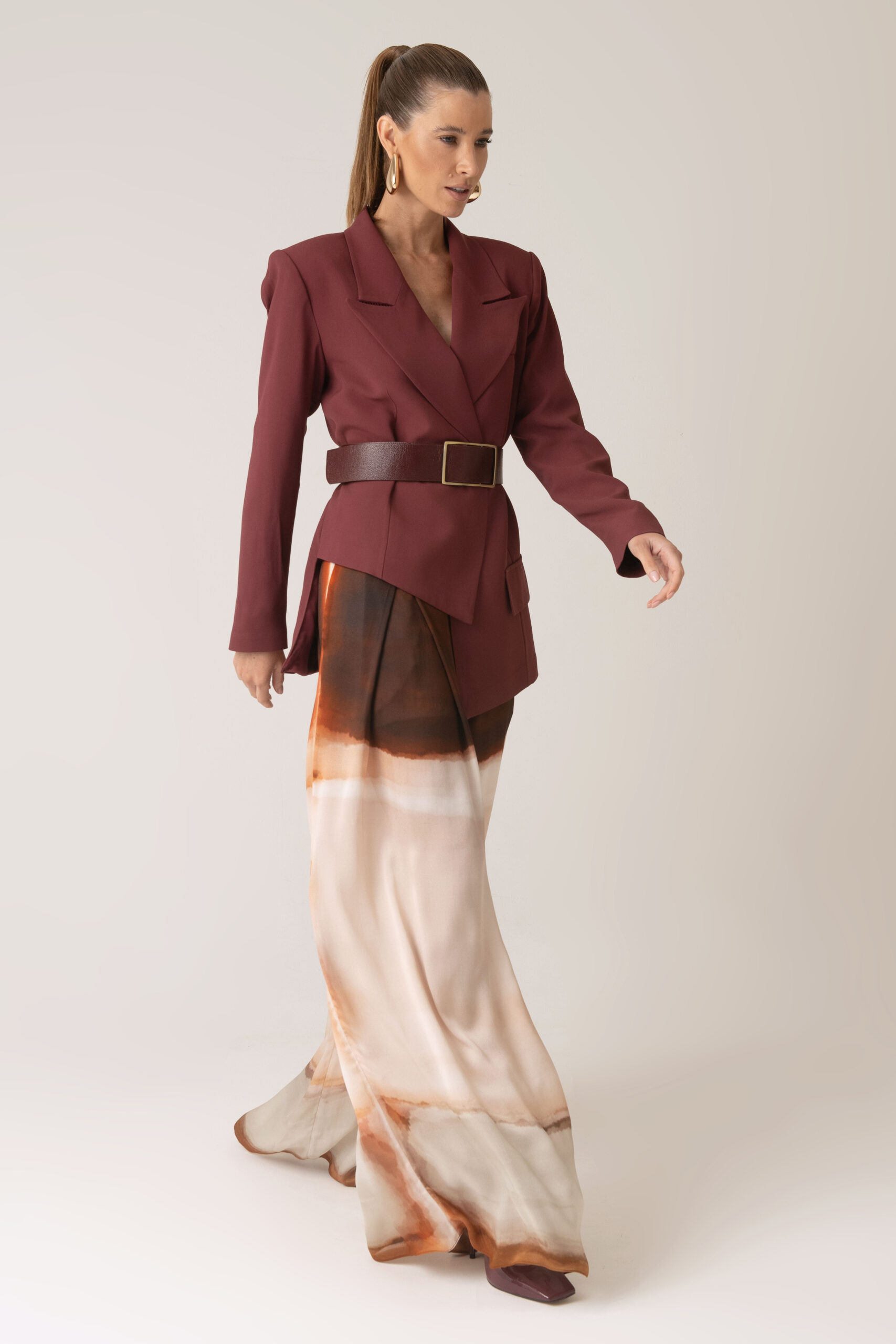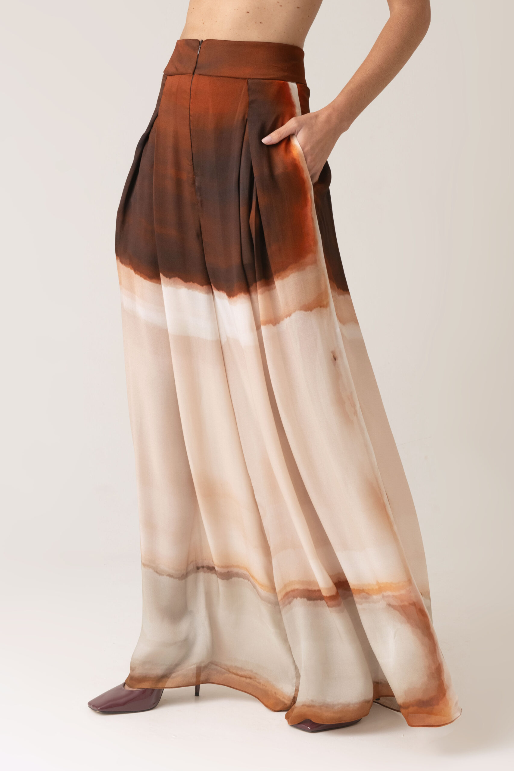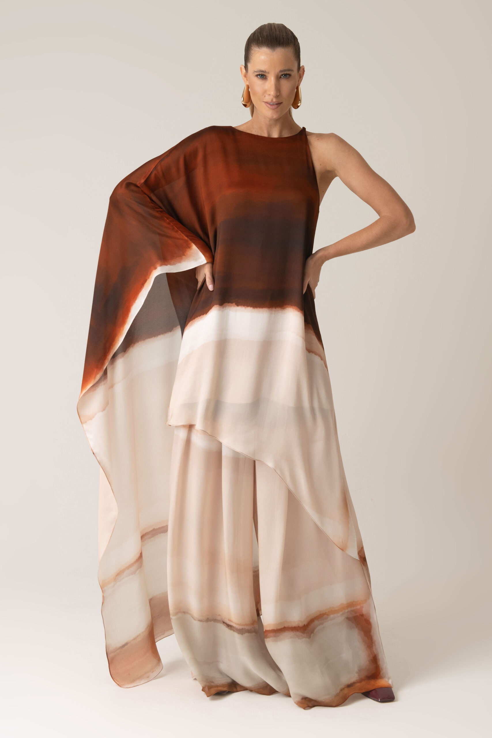 Possui cós alto, valorizando a cintura e criando uma proporção sofisticada no look. A estampa com efeito degradê adiciona profundidade e identidade visual à peça.