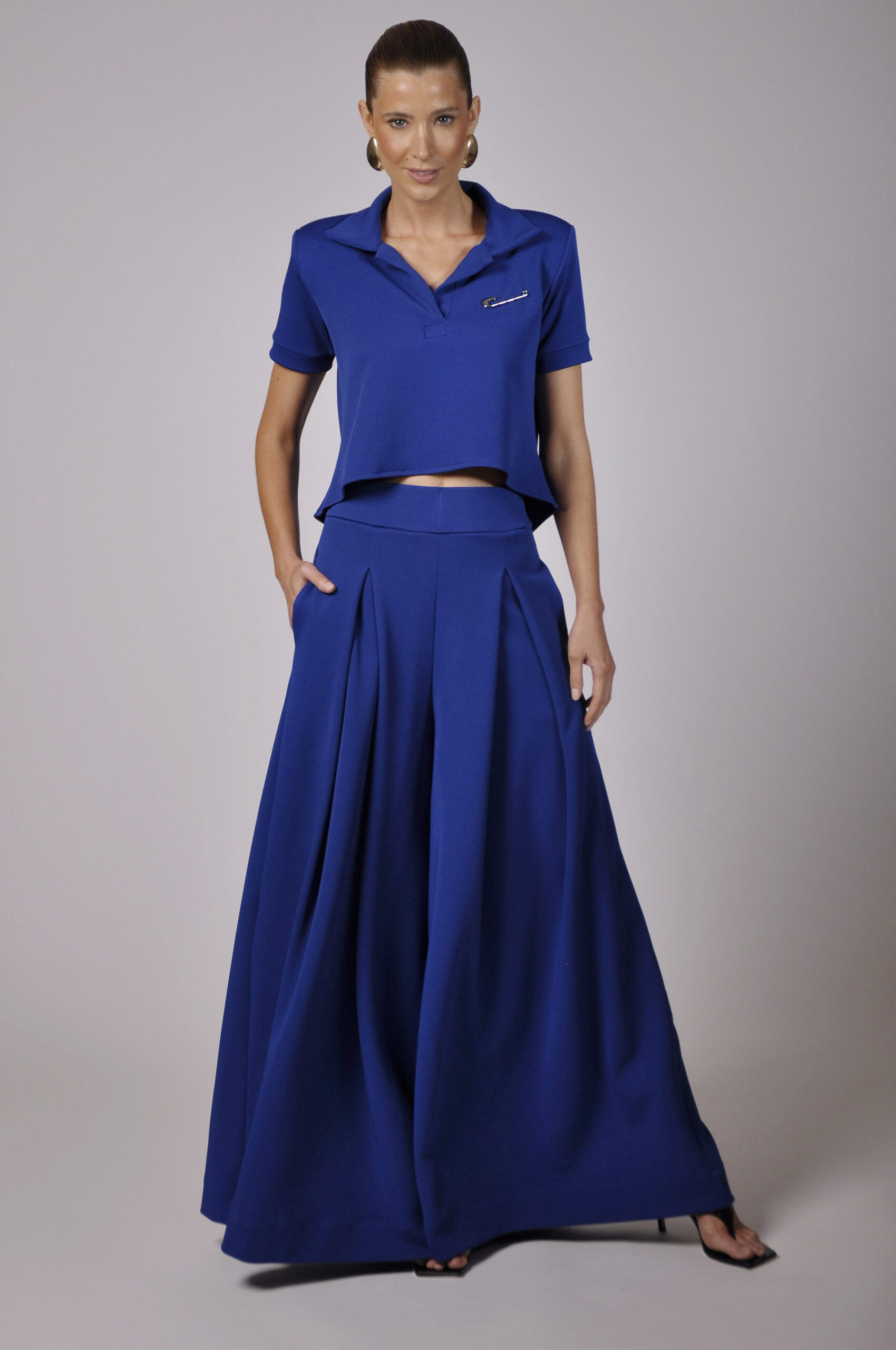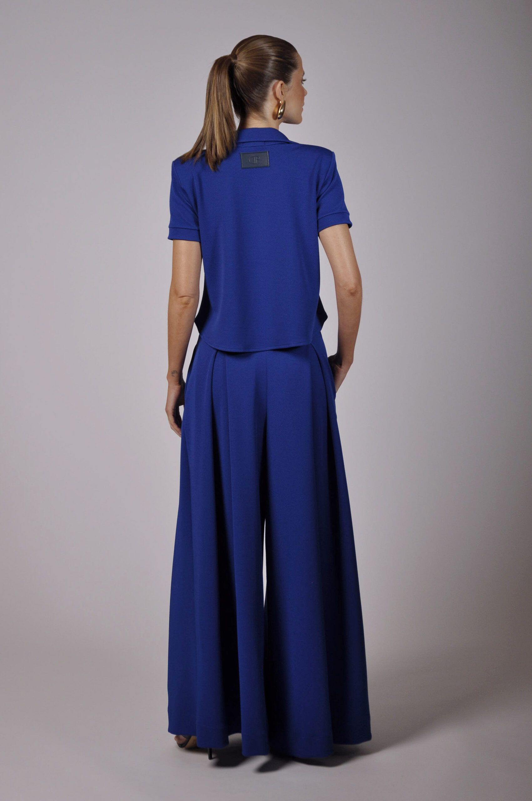 POLO UNO COM CORTE AMPLO, OMBREIRAS E BROCE ALFINETE EM METAL PRATA.