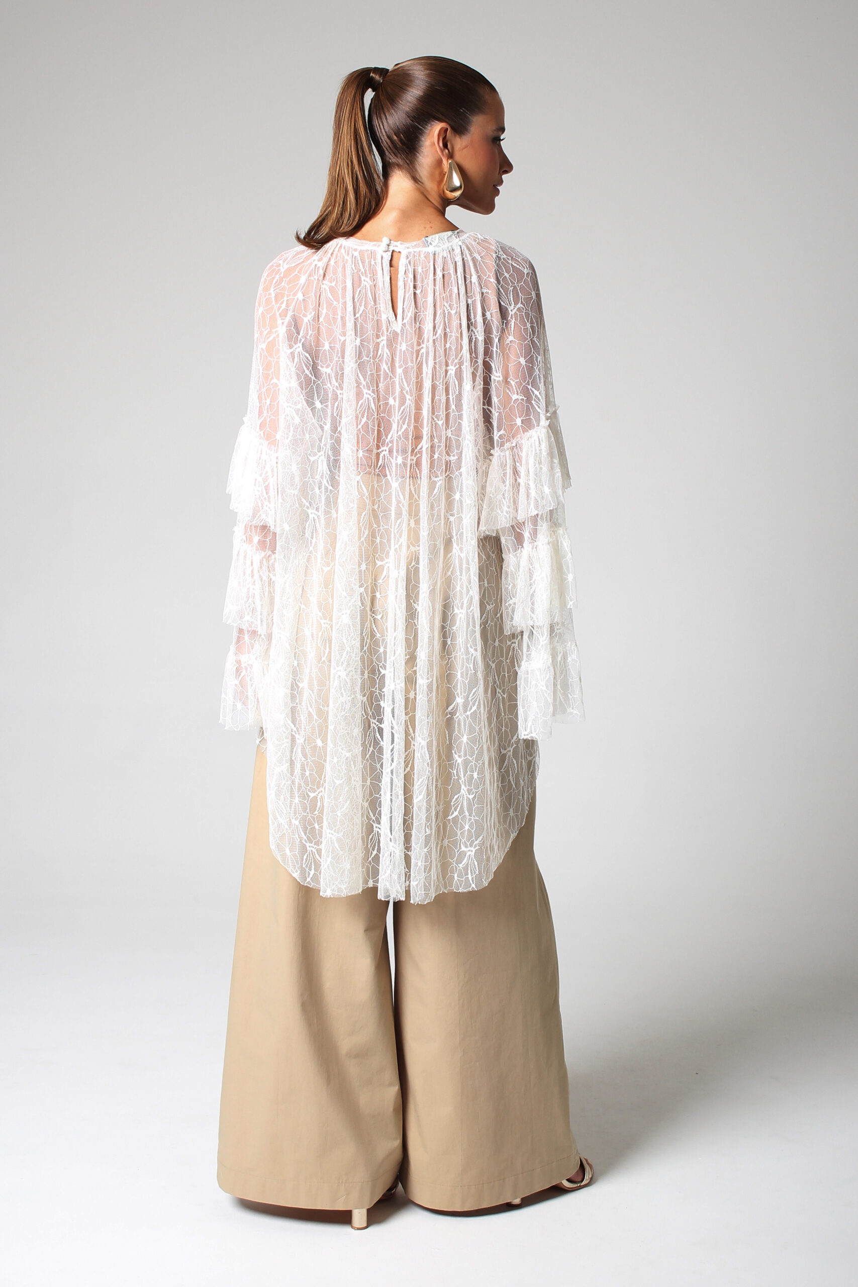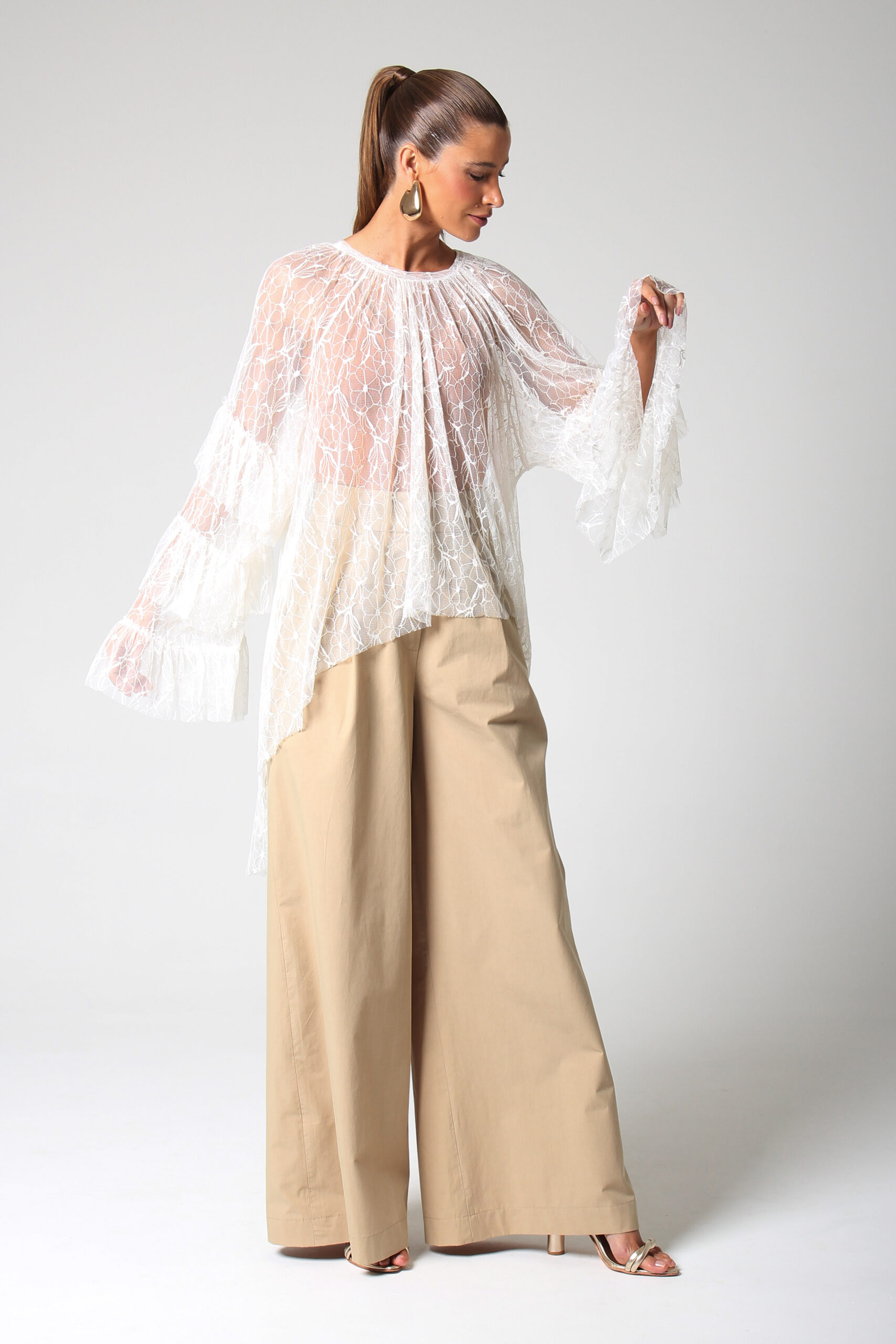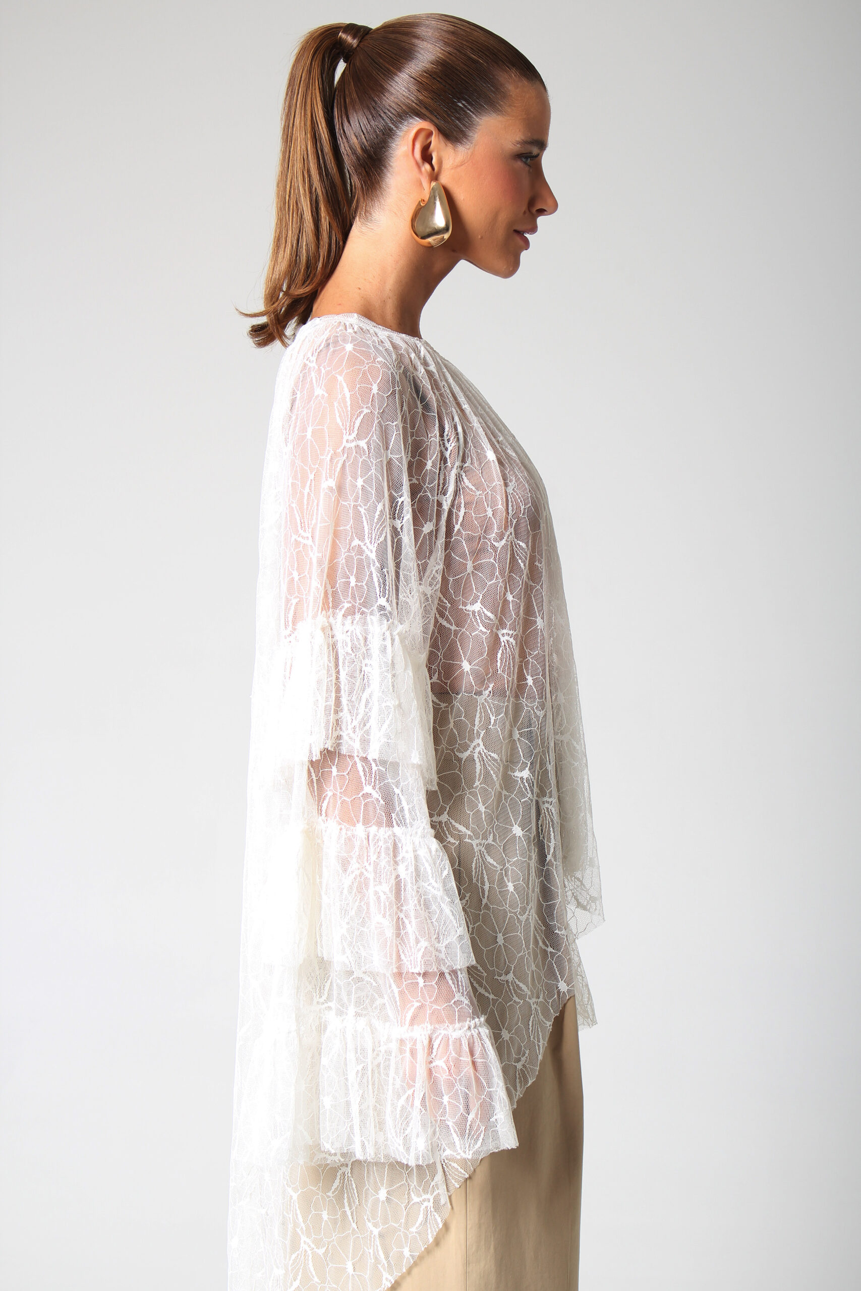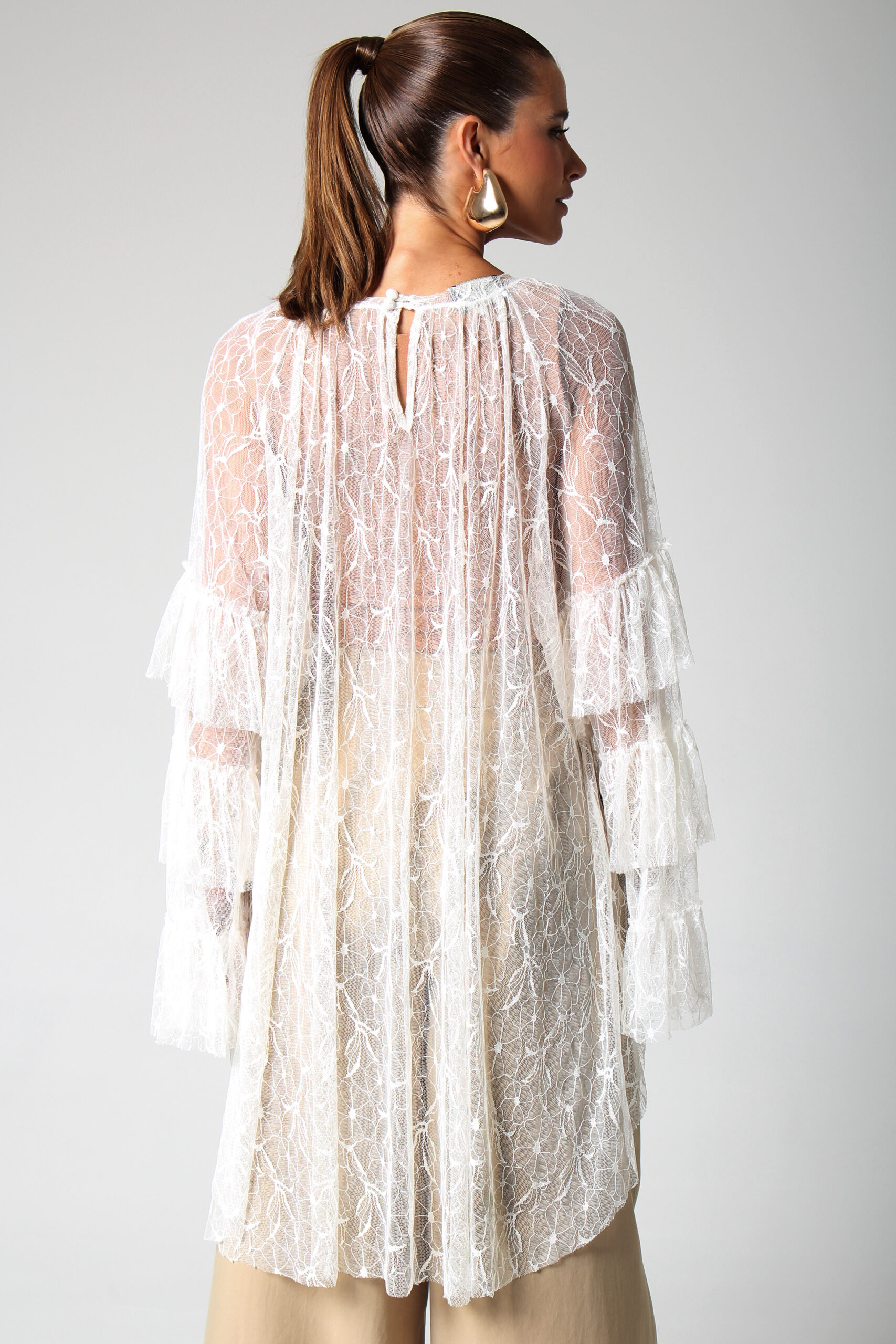 TOP ONDAS CURTO NA FRENTE E LONGO NAS COSTAS, MANGA LONGA COM BABADOS E GOLA CANOA.