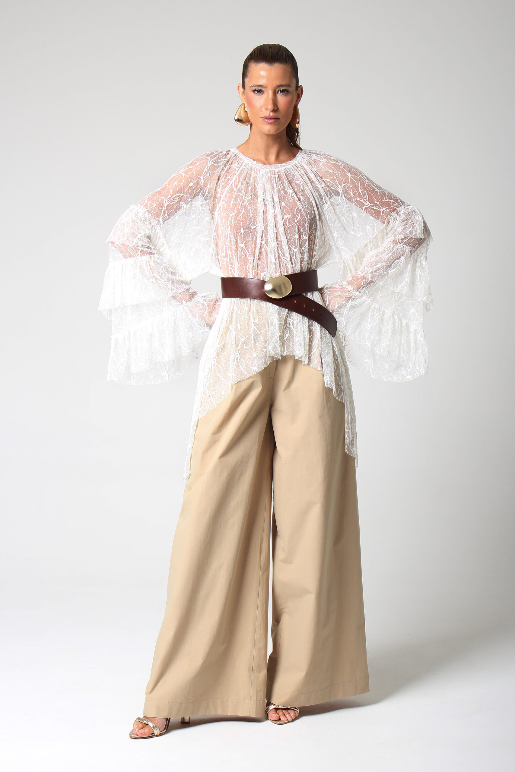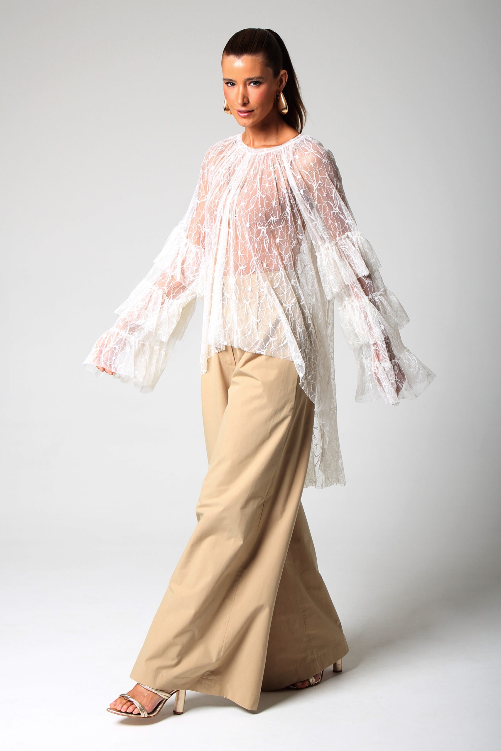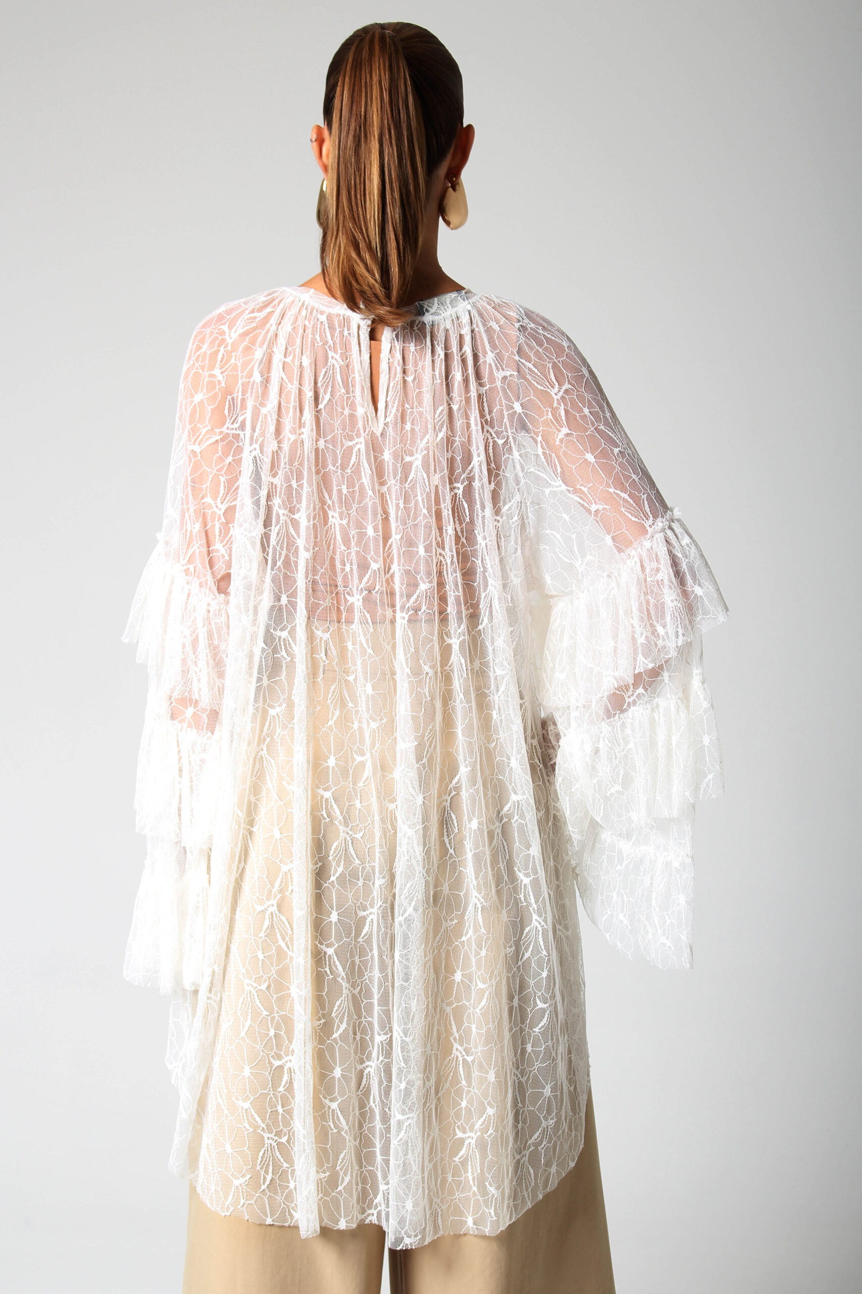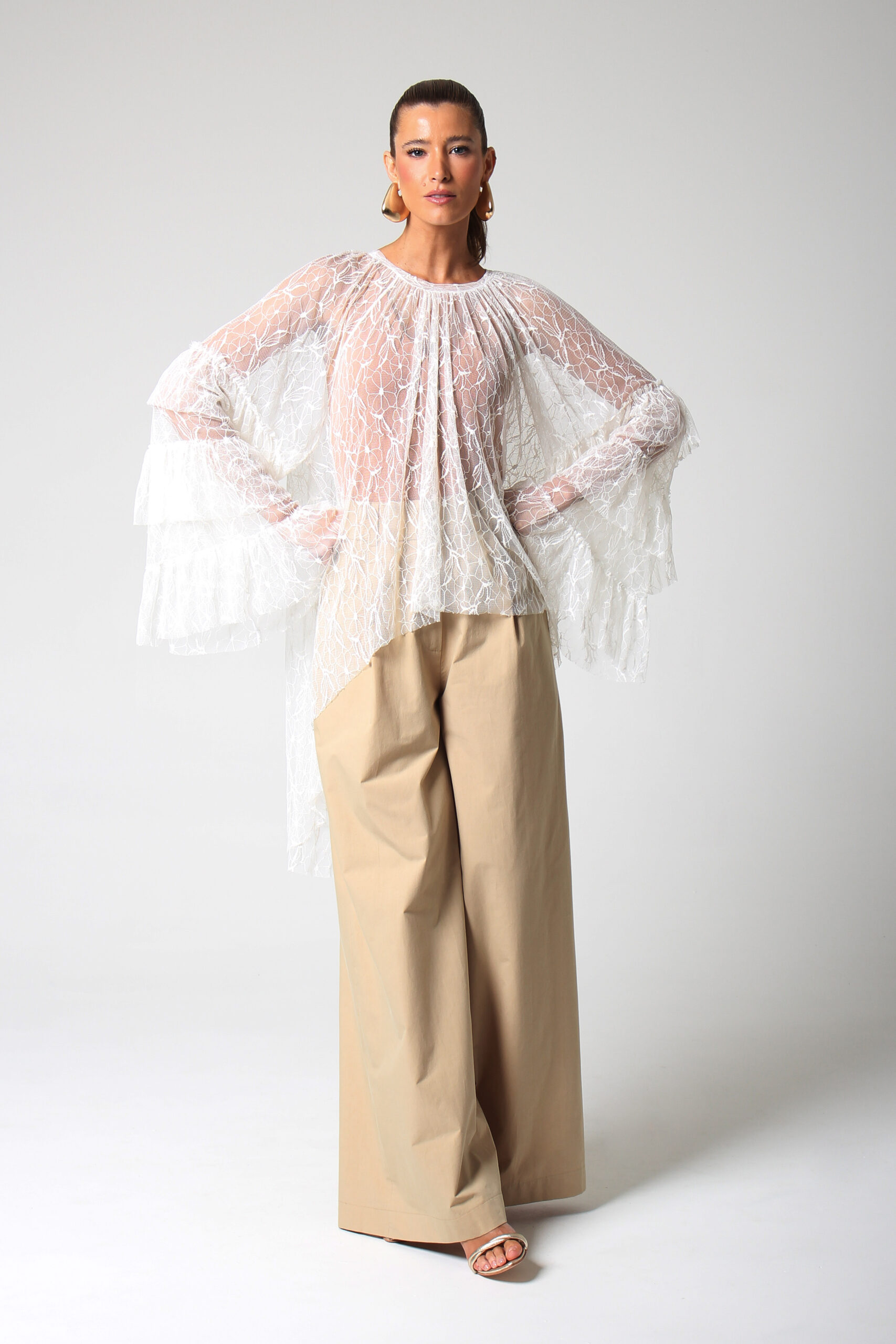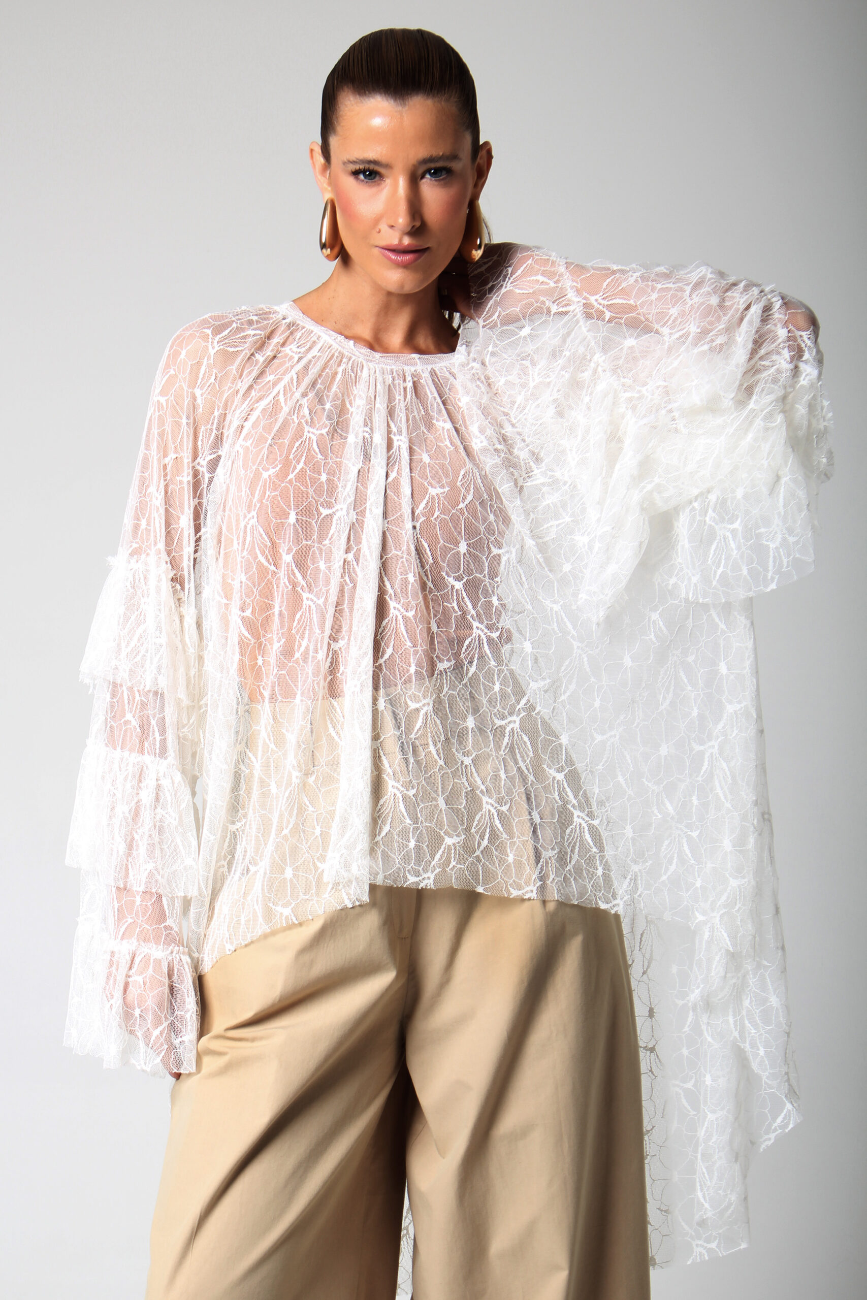 TOP ONDAS CURTO NA FRENTE E LONGO NAS COSTAS, MANGA LONGA COM BABADOS E GOLA CANOA.