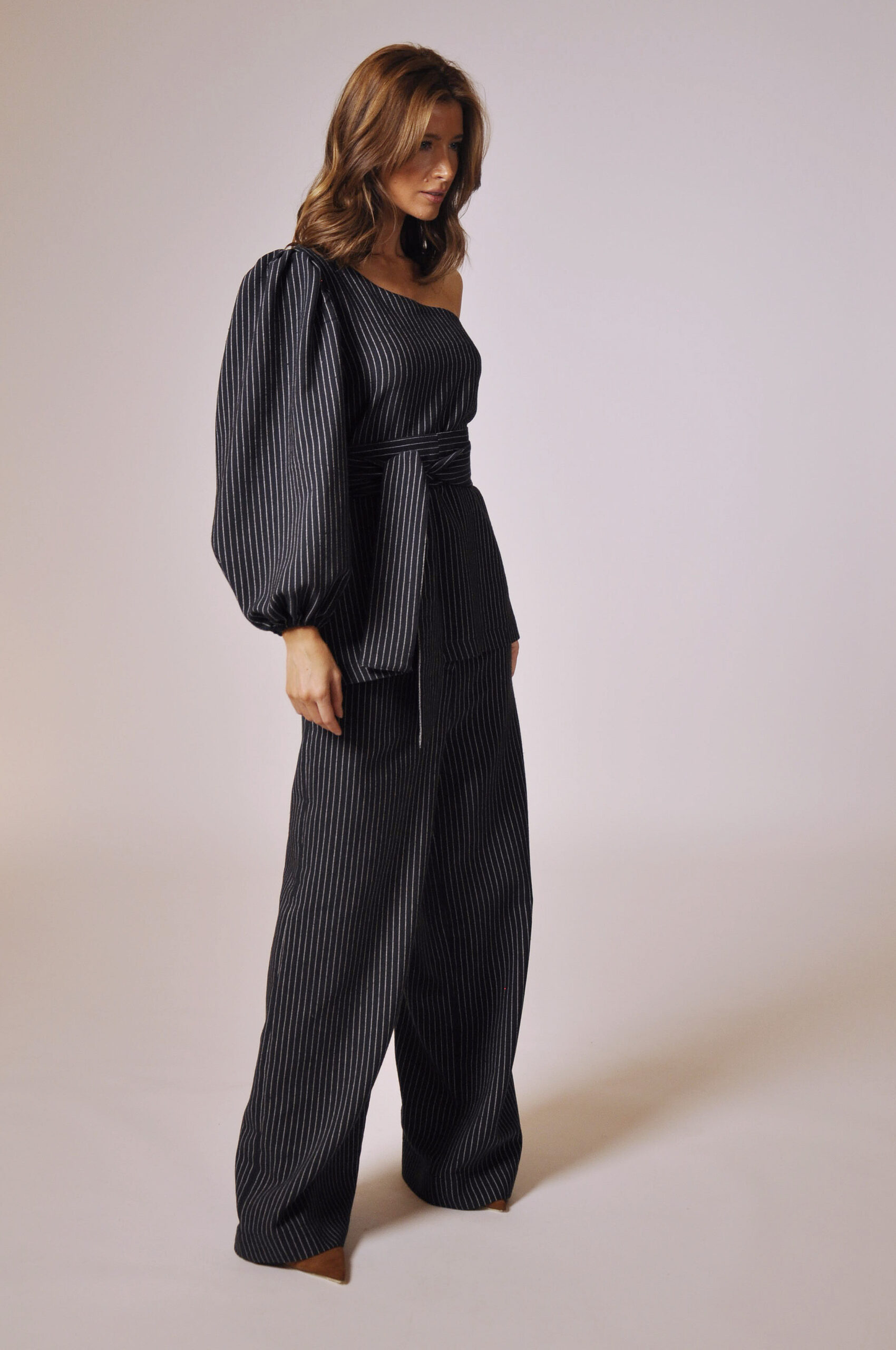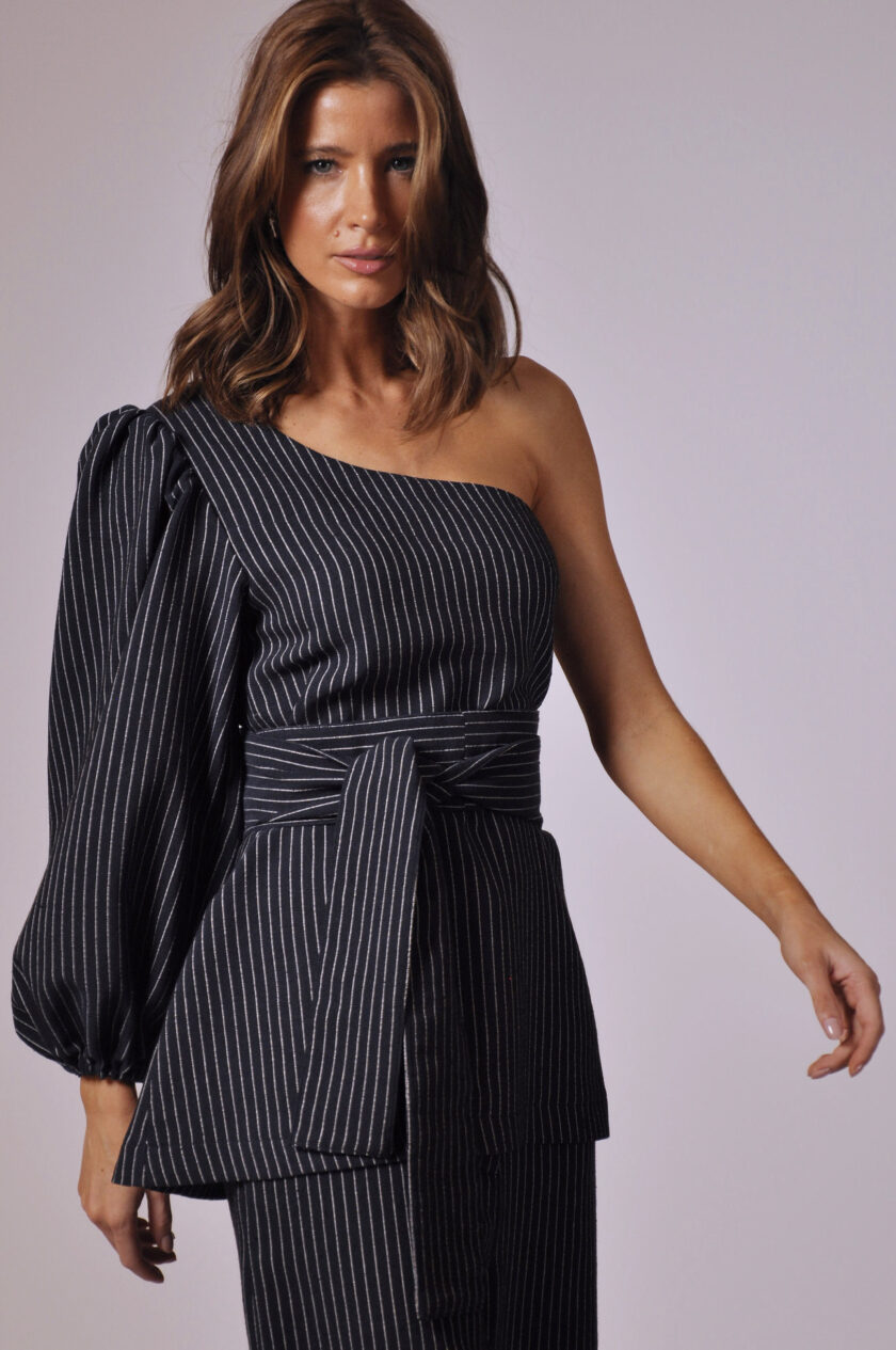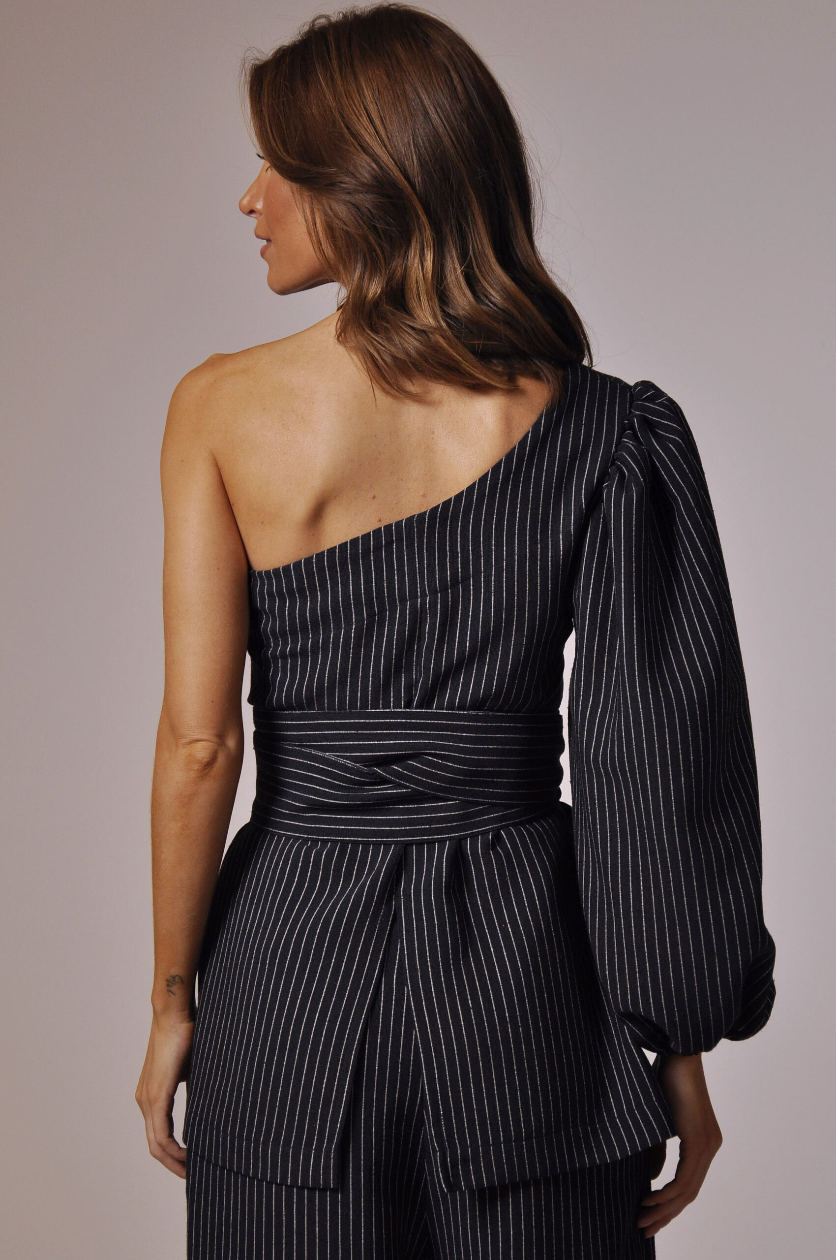 TOP WIN UM OMBRO SÓ COM MANGA BUFANTE E FAIXA PARA AMARRAÇÃO.
