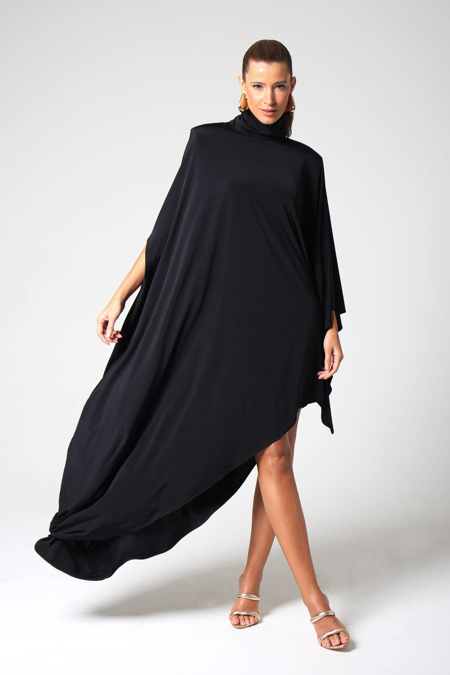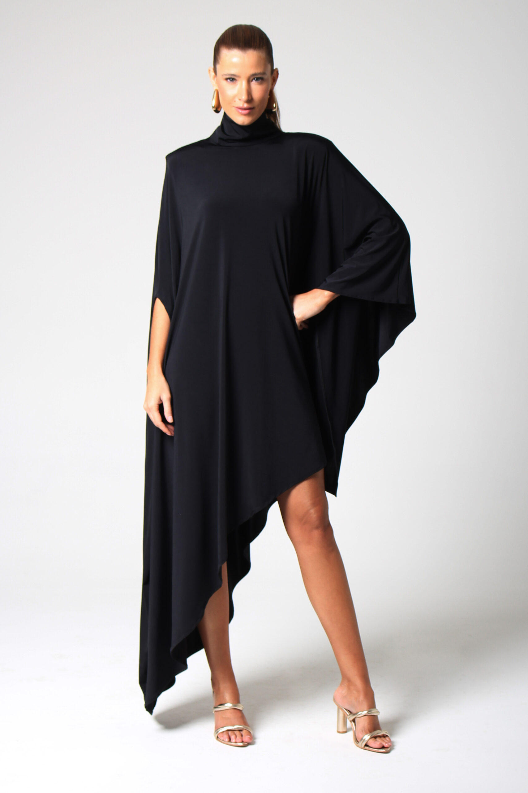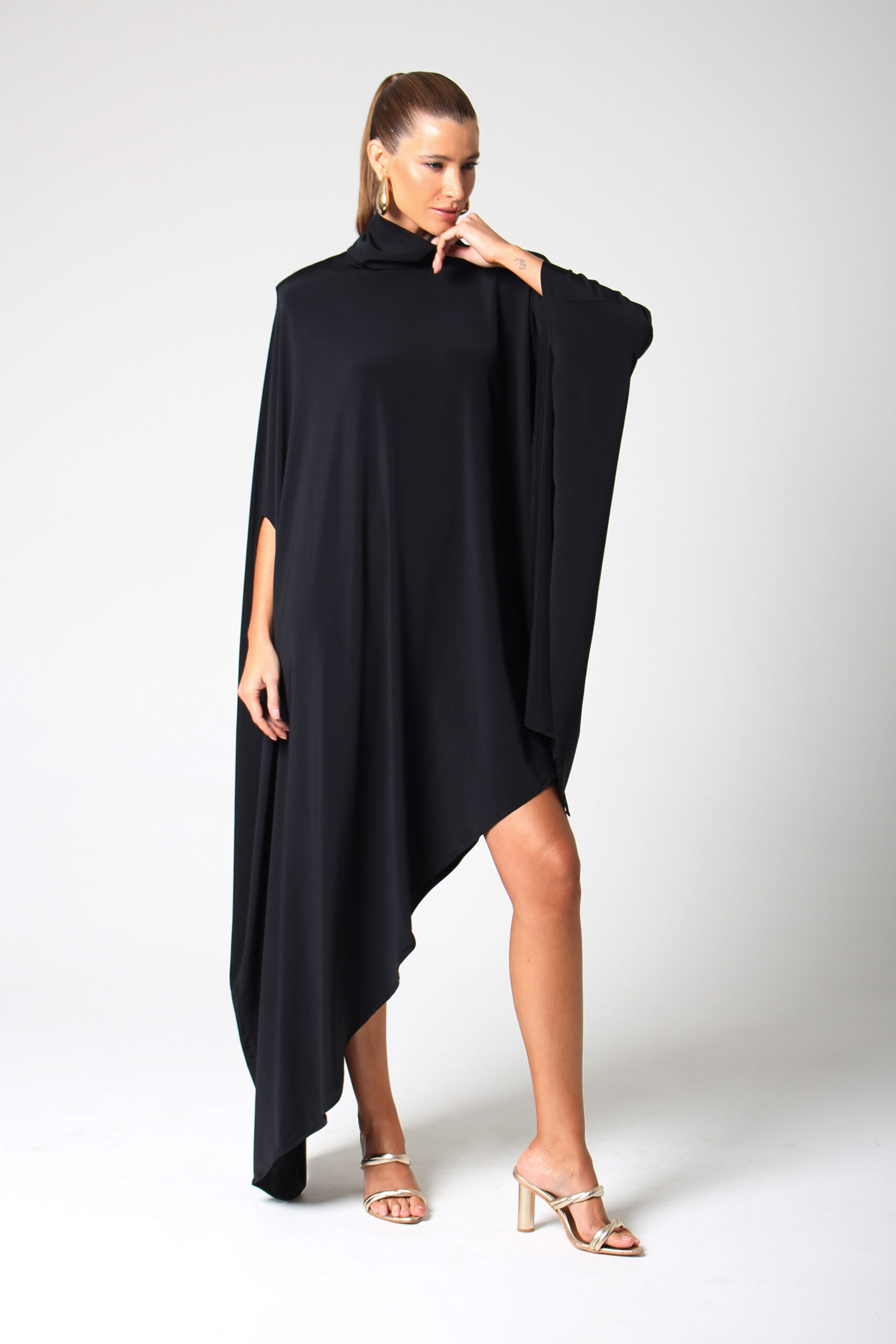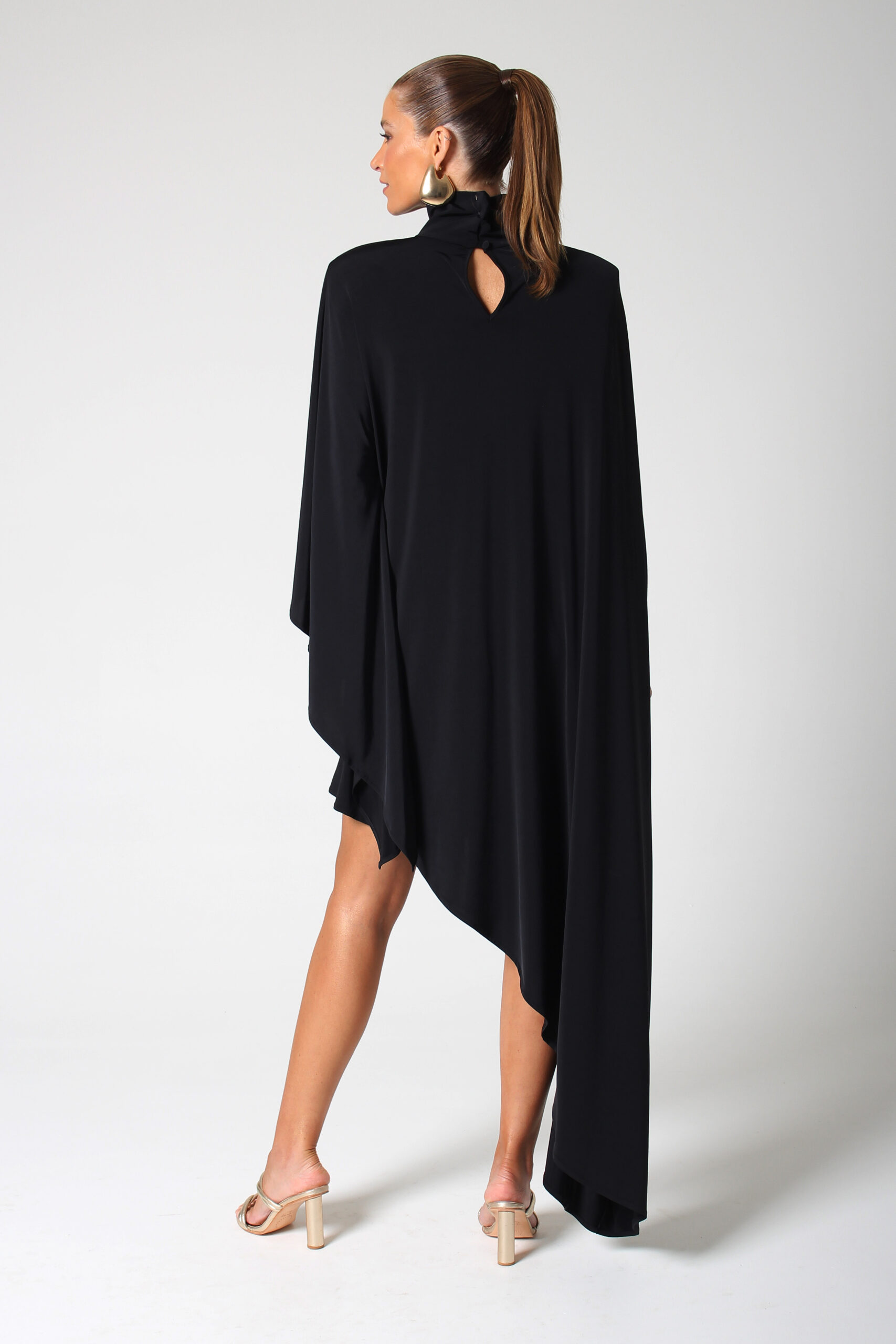 VESTIDO BLOOM ASSIMÉTRICO, GOLA ALTA COM BOTÕES ENCAPADOS.