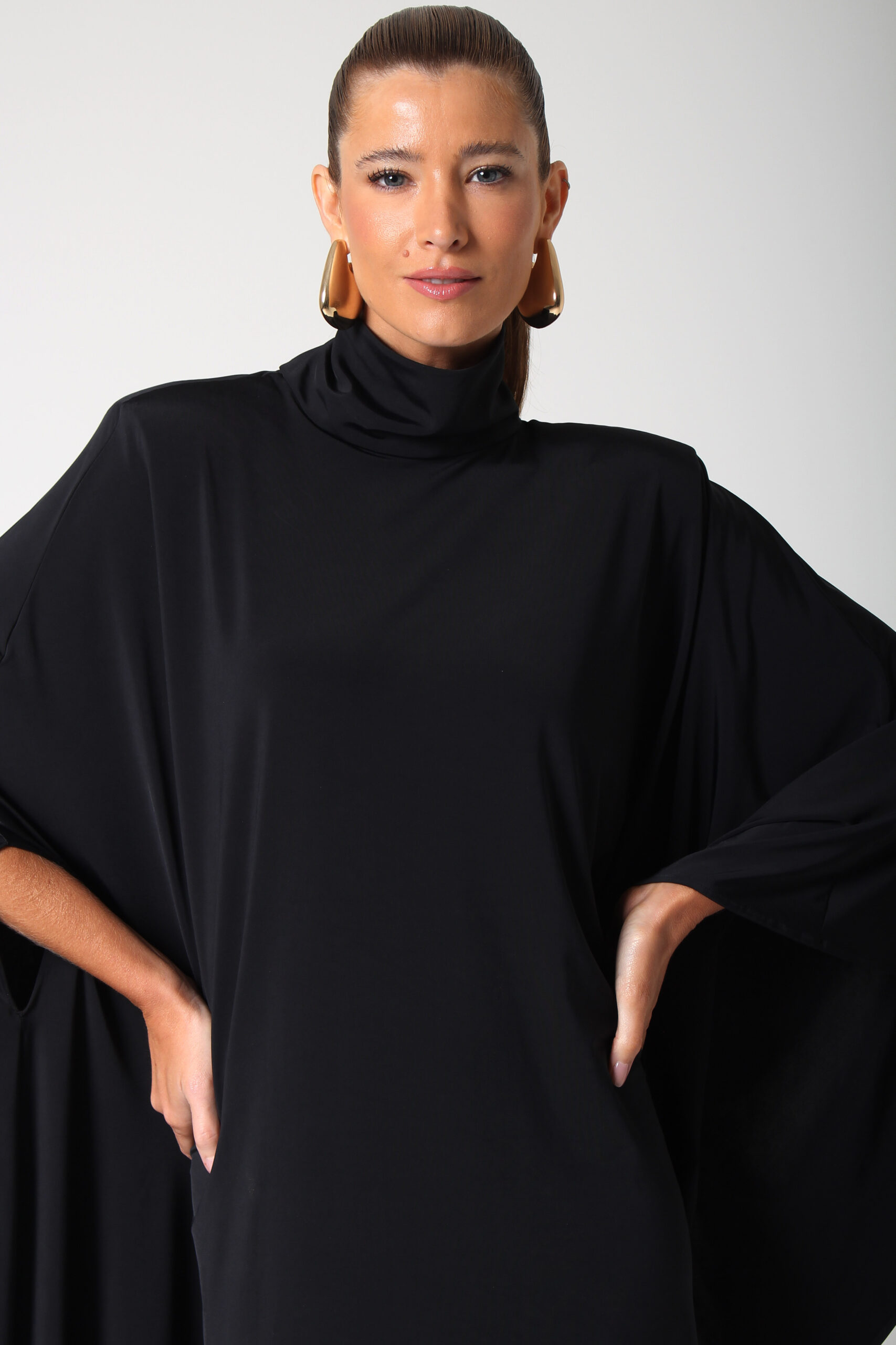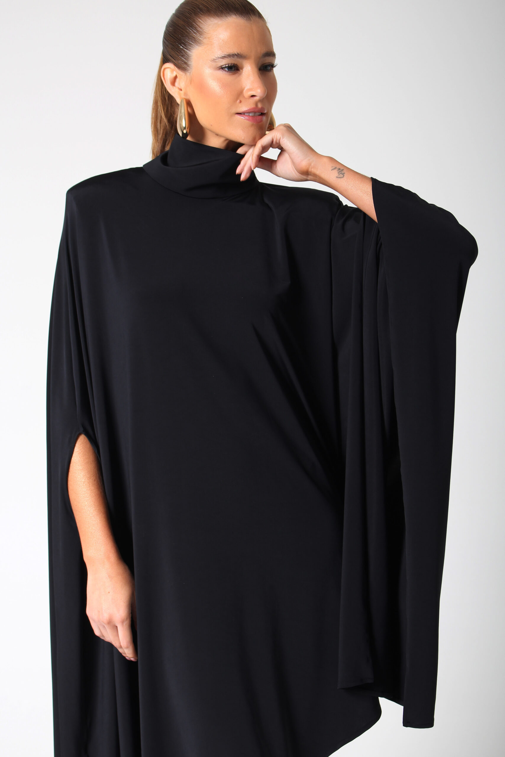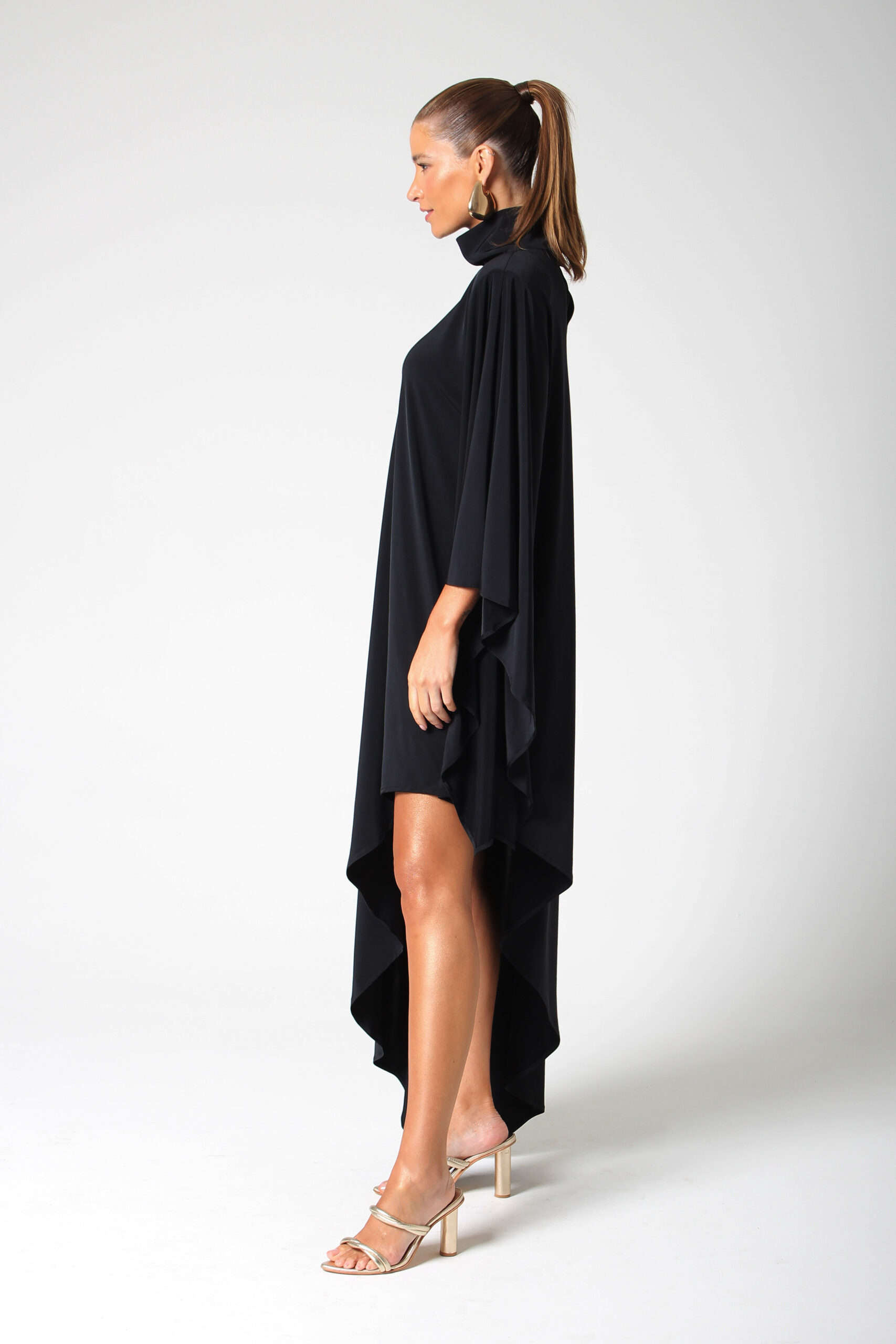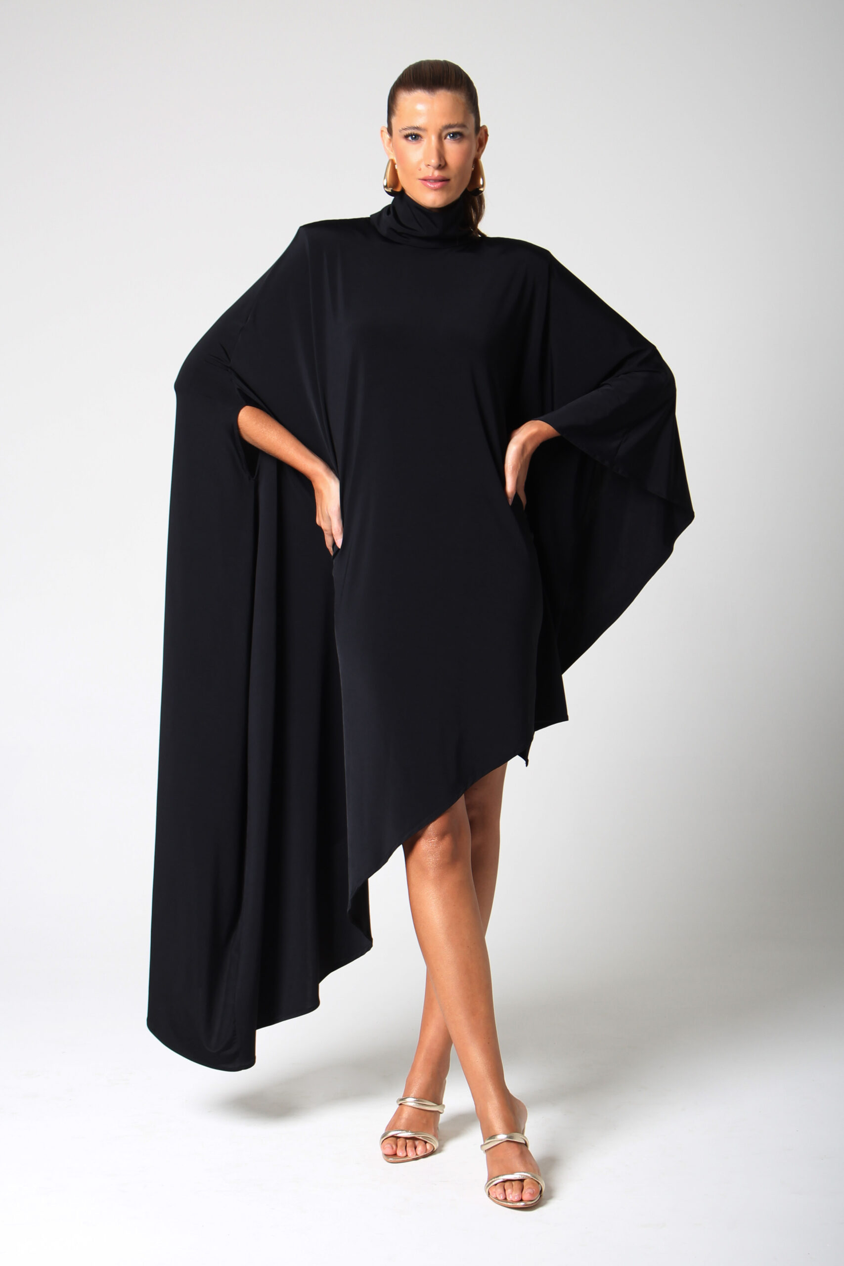 VESTIDO BLOOM ASSIMÉTRICO, GOLA ALTA COM BOTÕES ENCAPADOS.