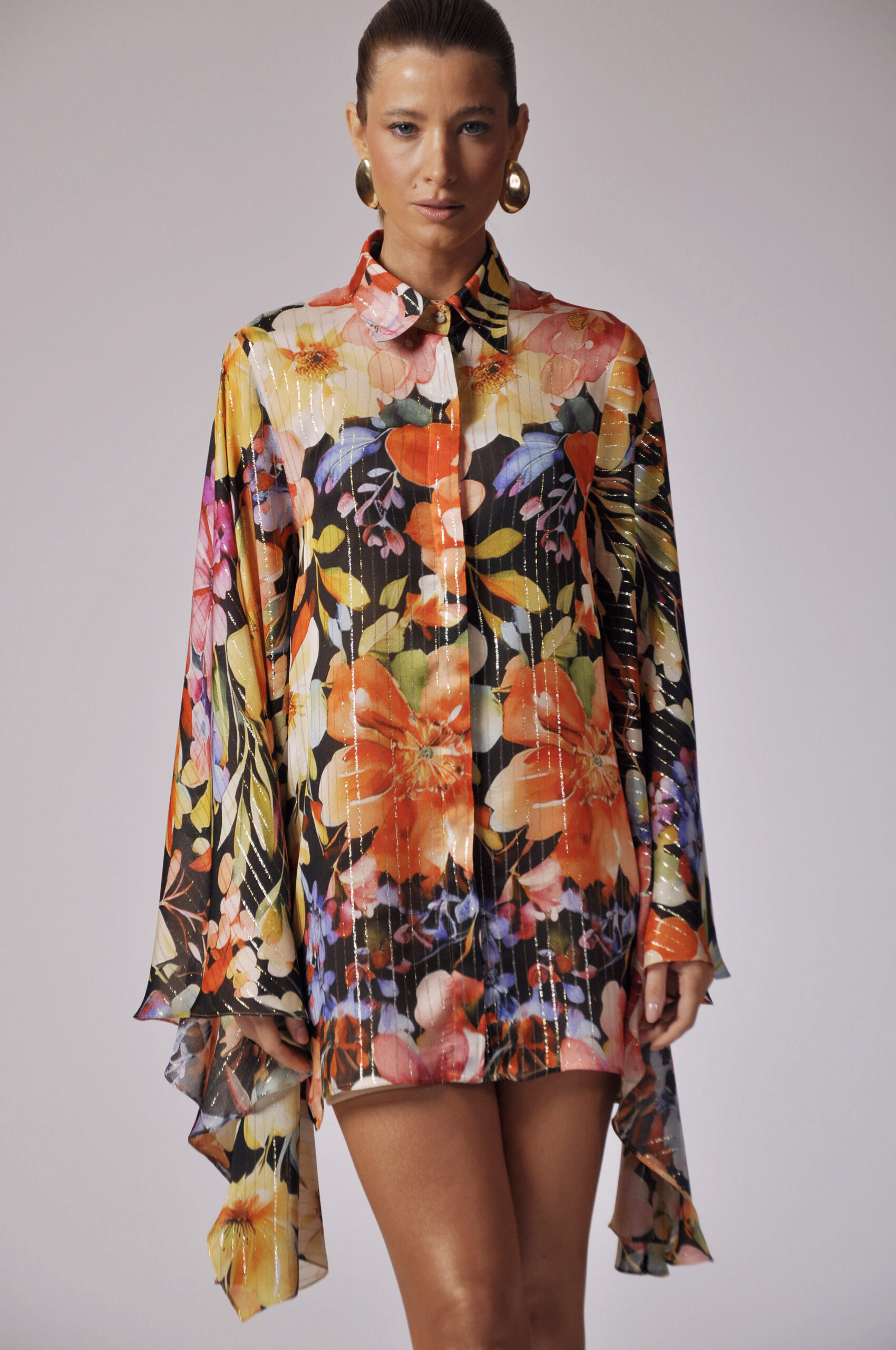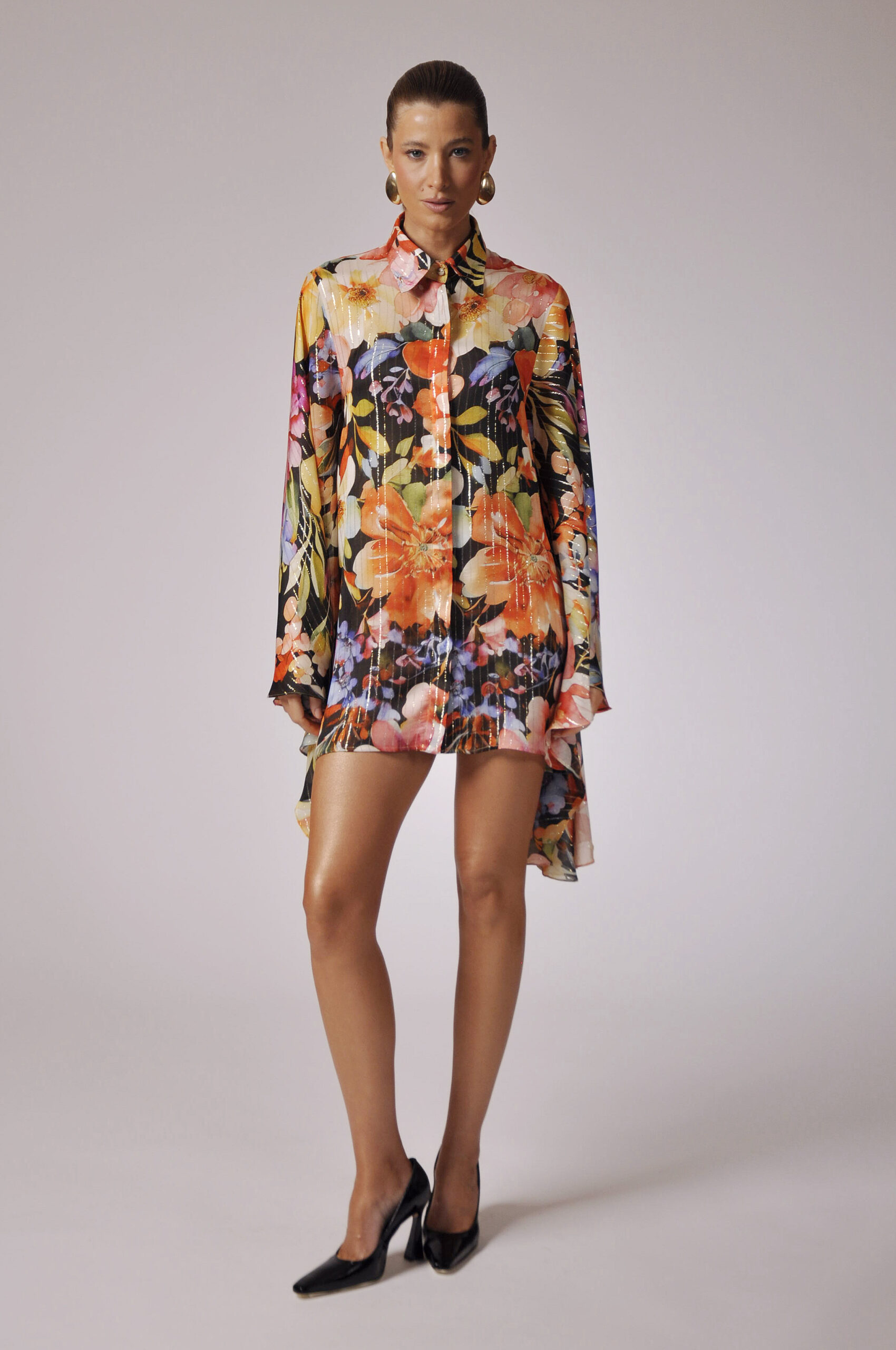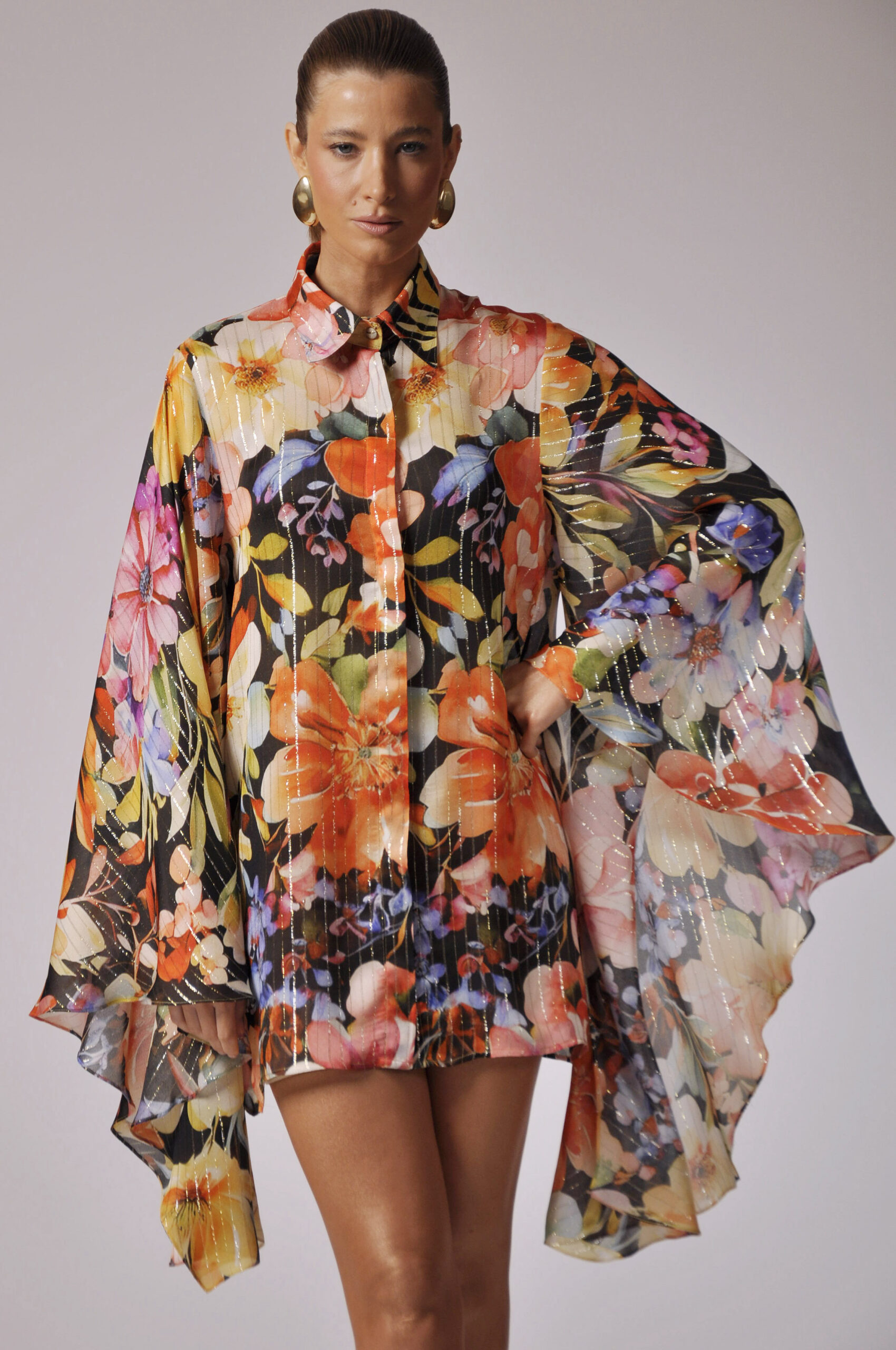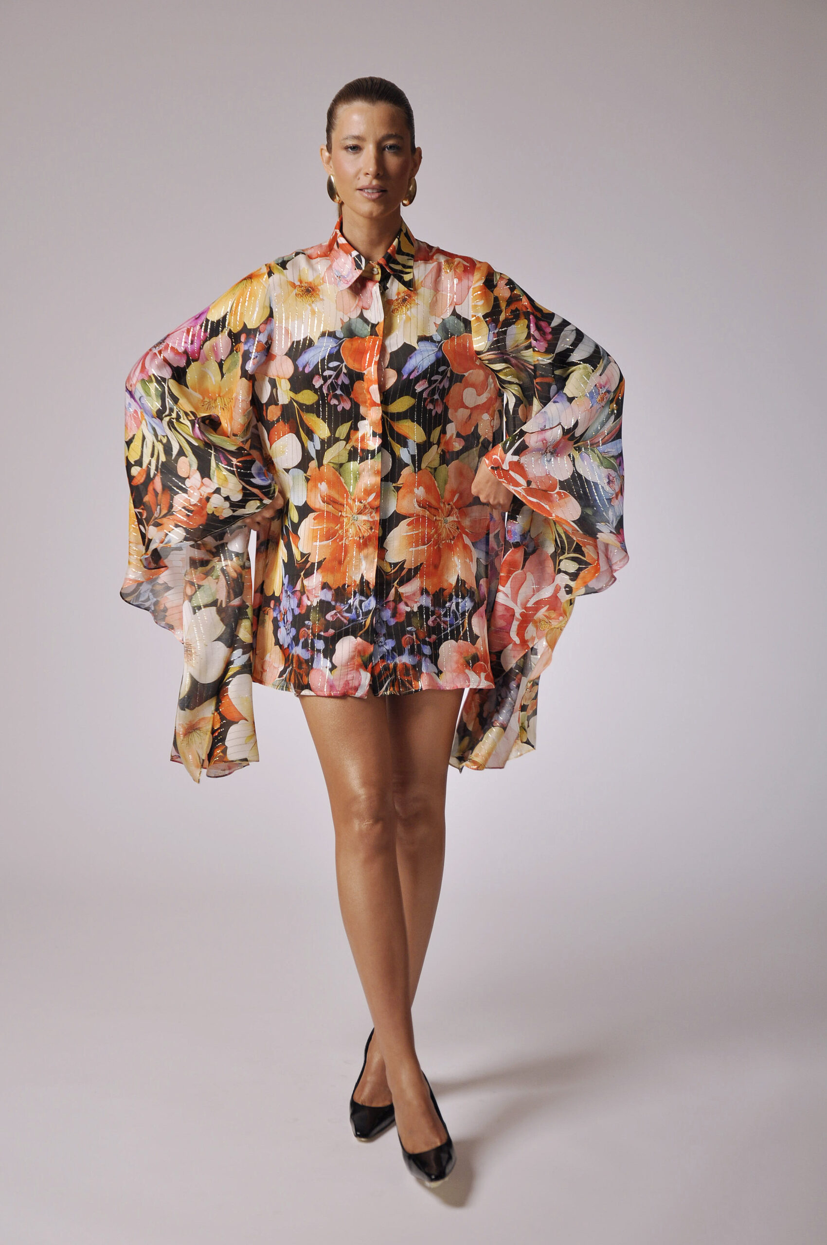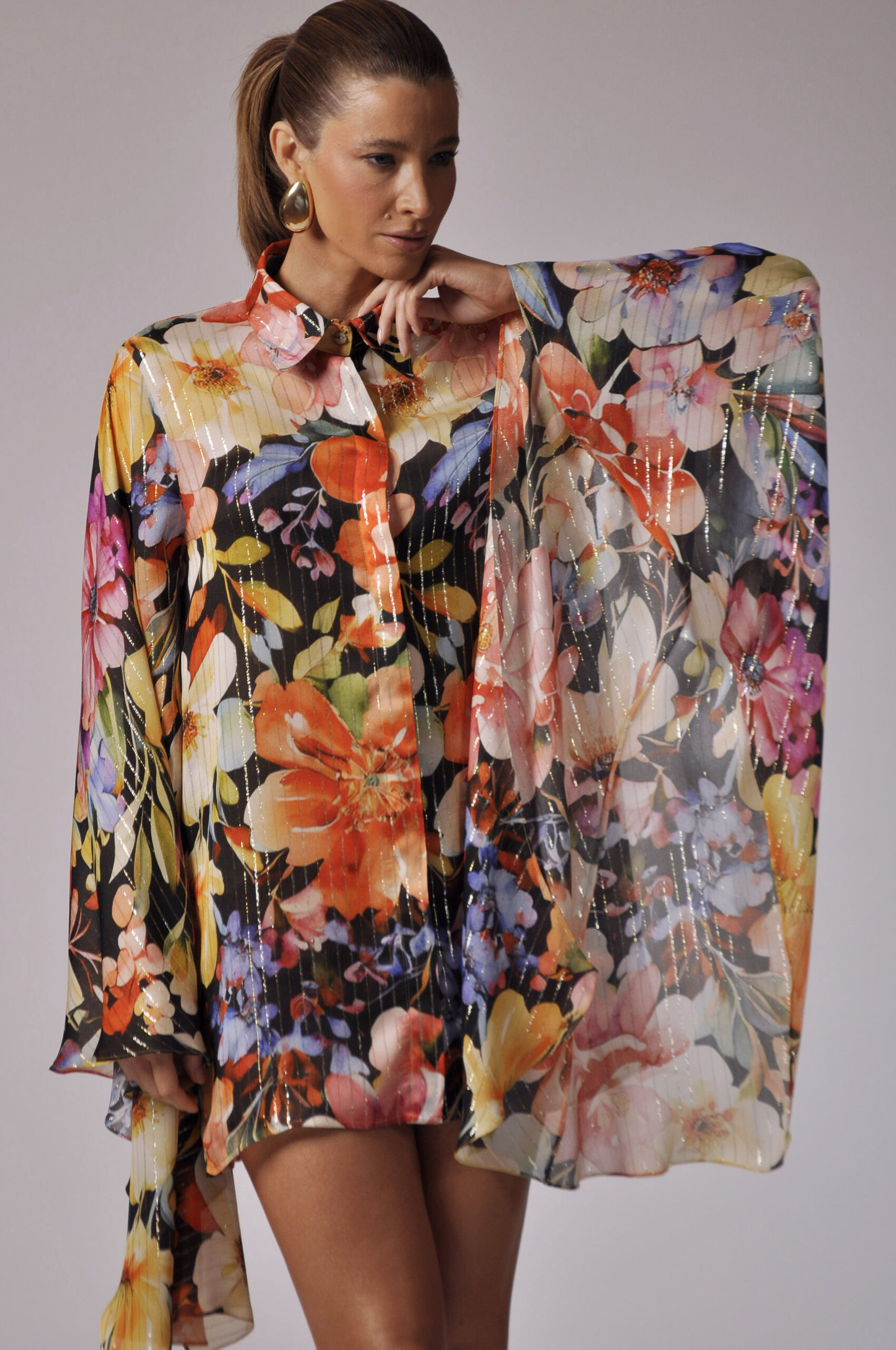 VESTIDO/CAMISA FLEURS CURTO COM ABOTOAMENTO FRONTA COM MANGA ASSIMÉTRICA.