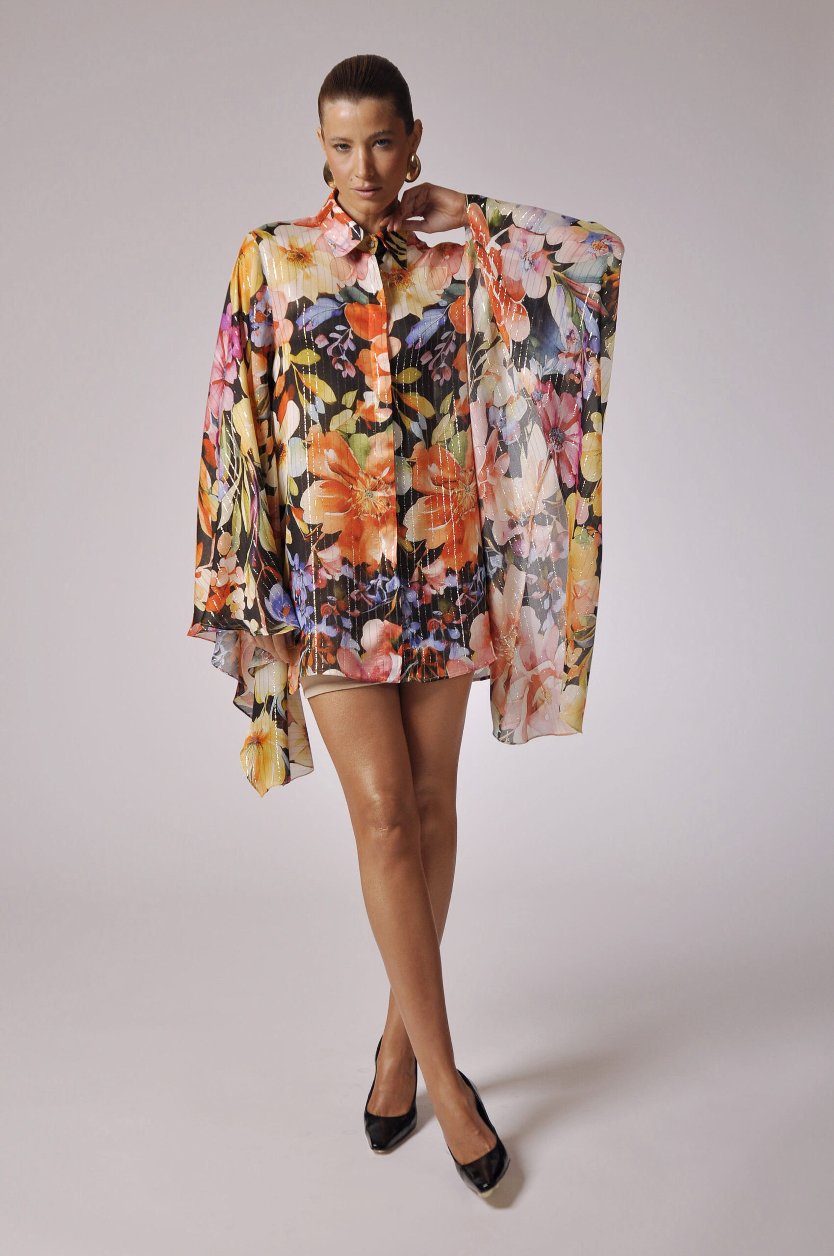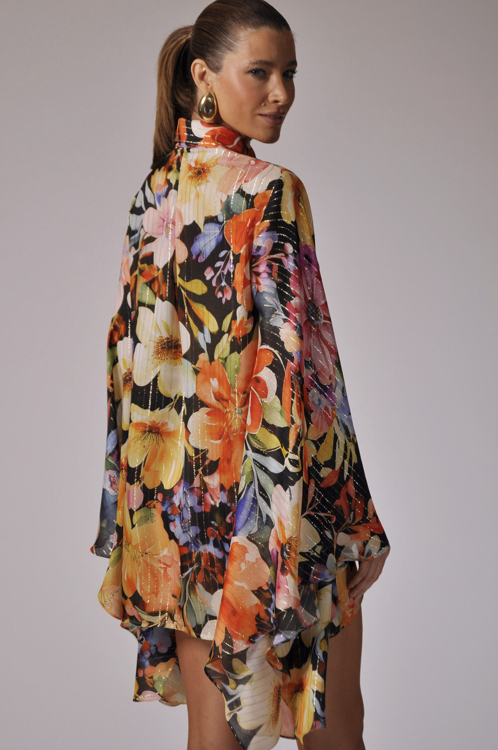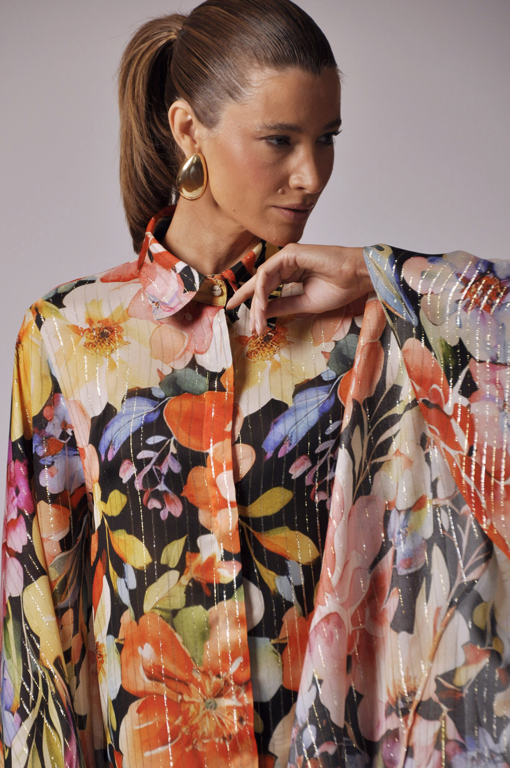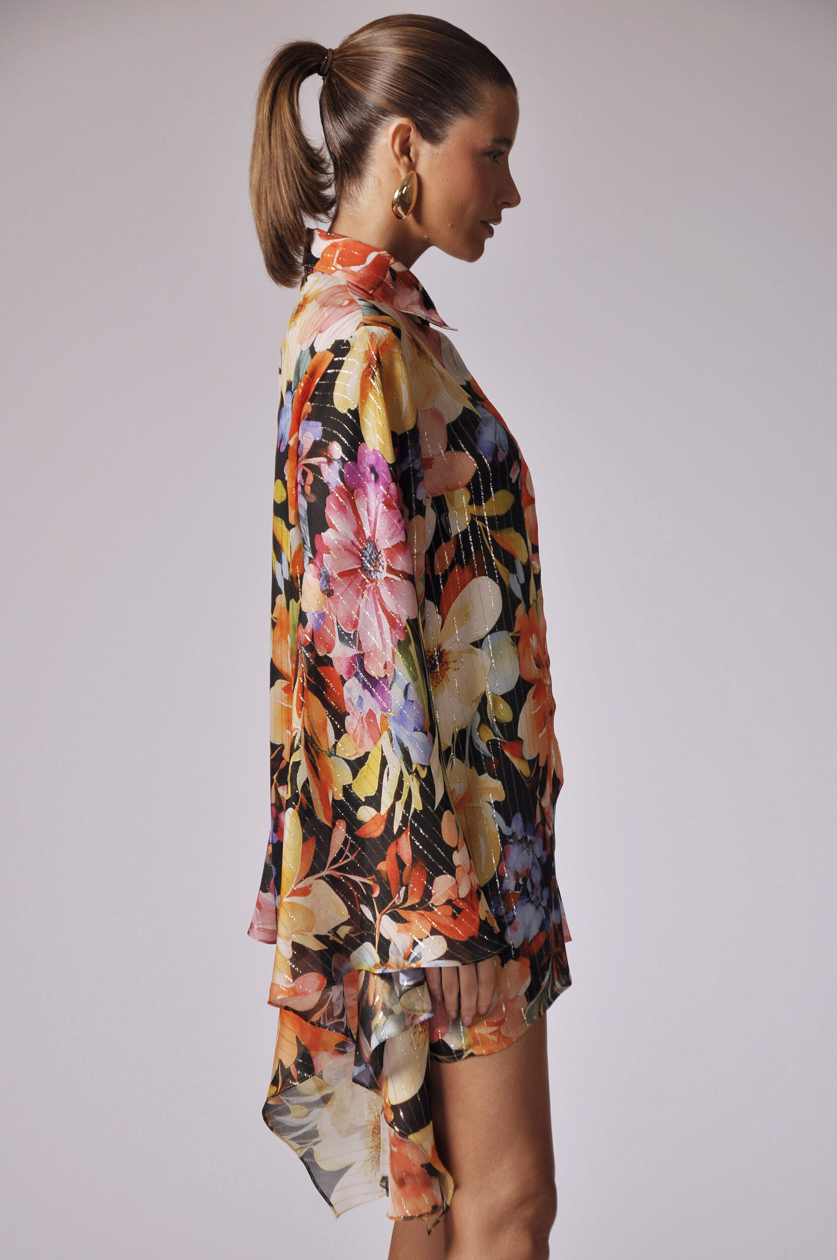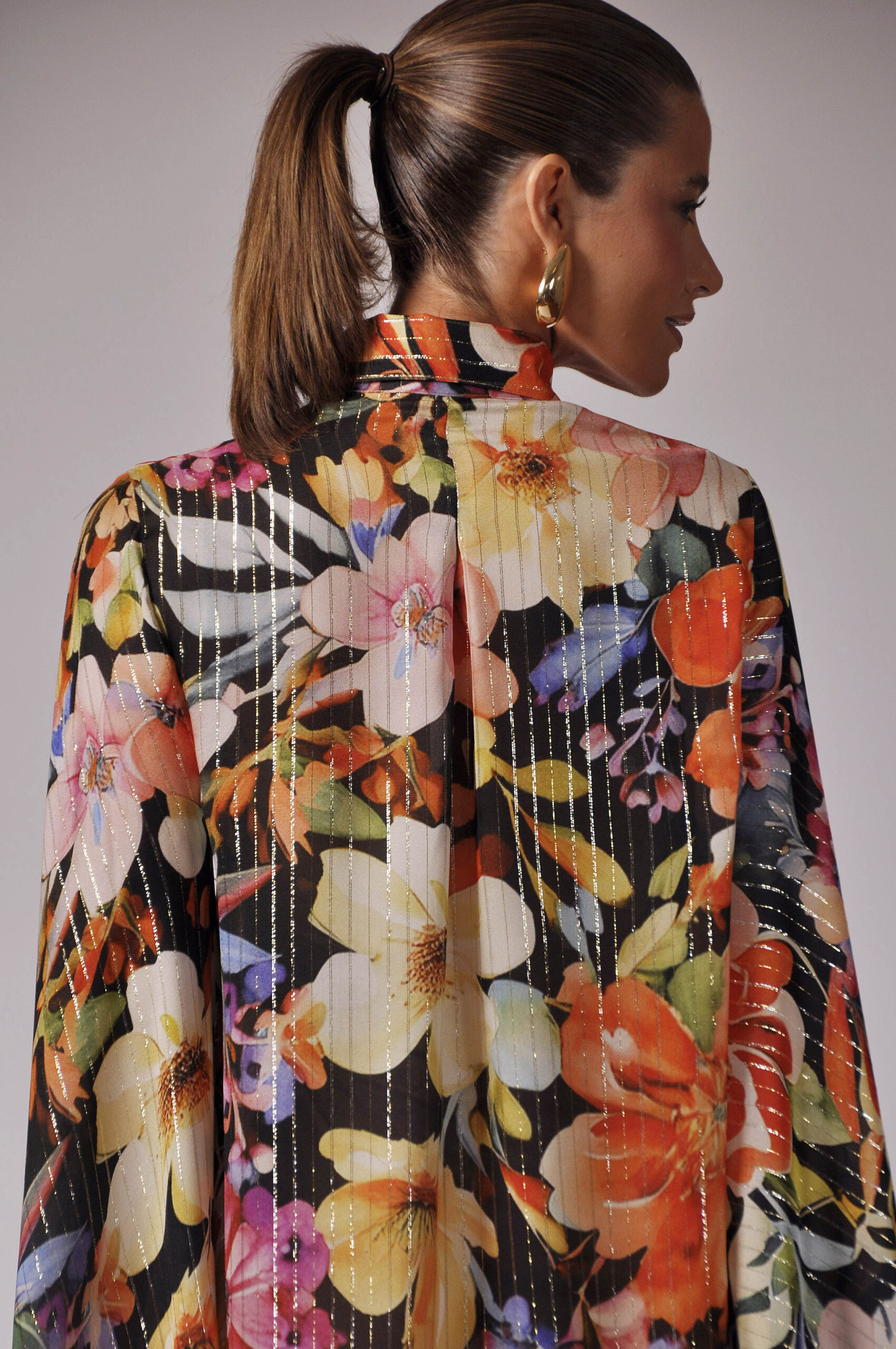VESTIDO/CAMISA FLEURS CURTO COM ABOTOAMENTO FRONTA COM MANGA ASSIMÉTRICA.