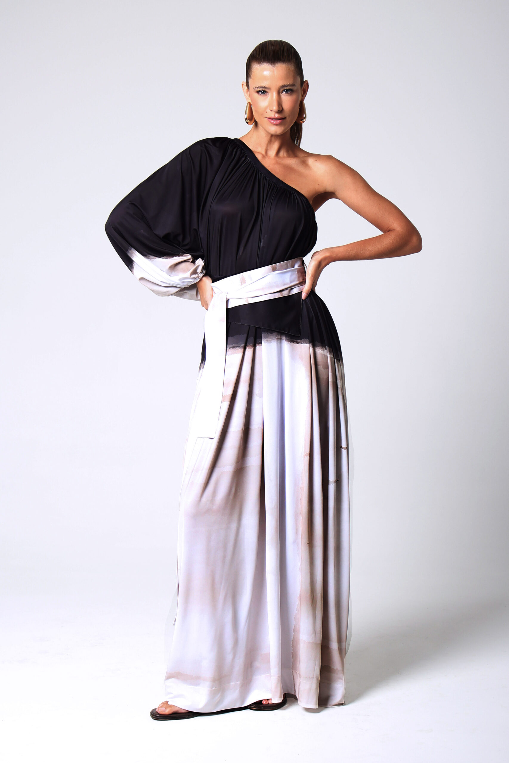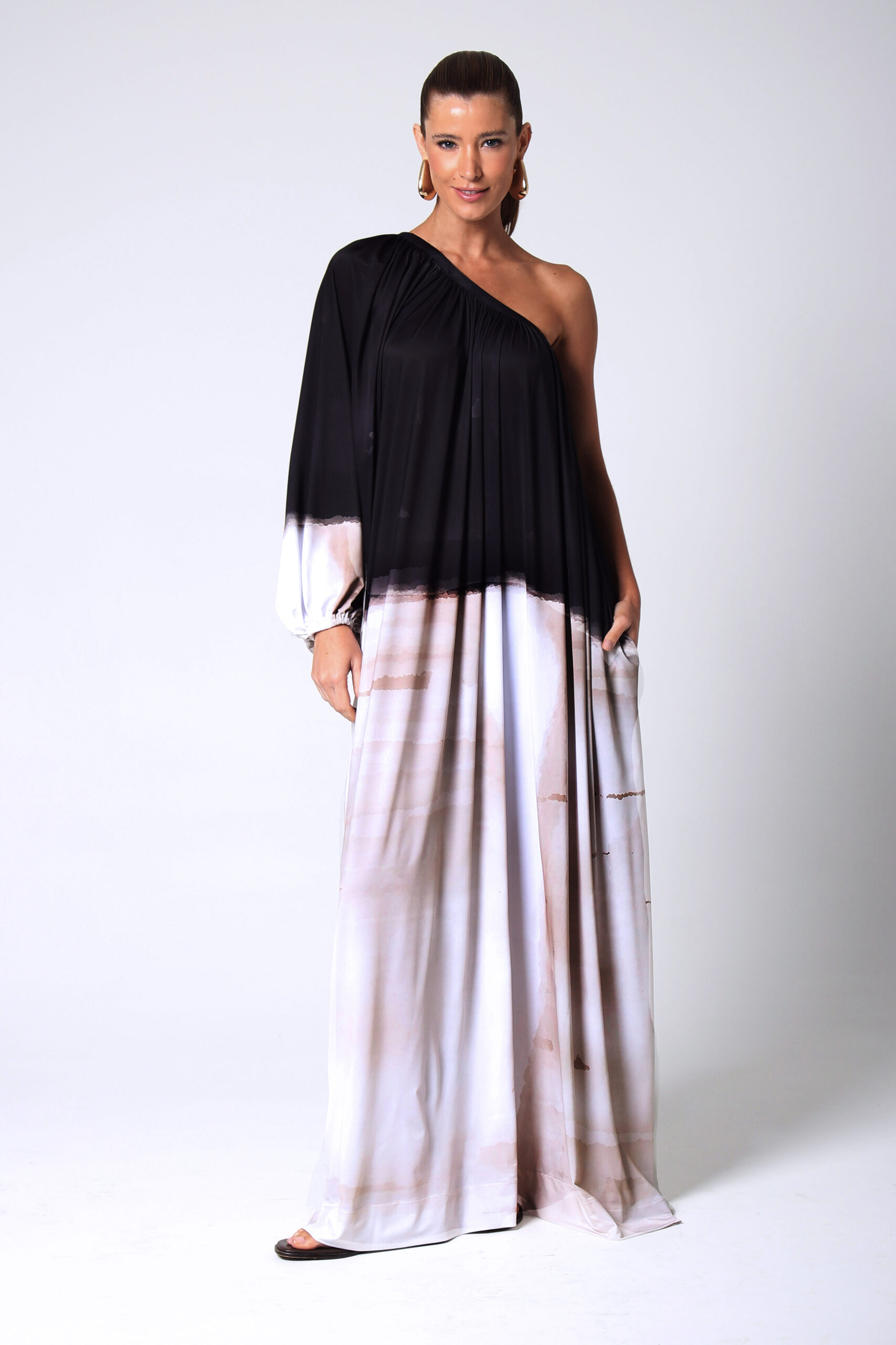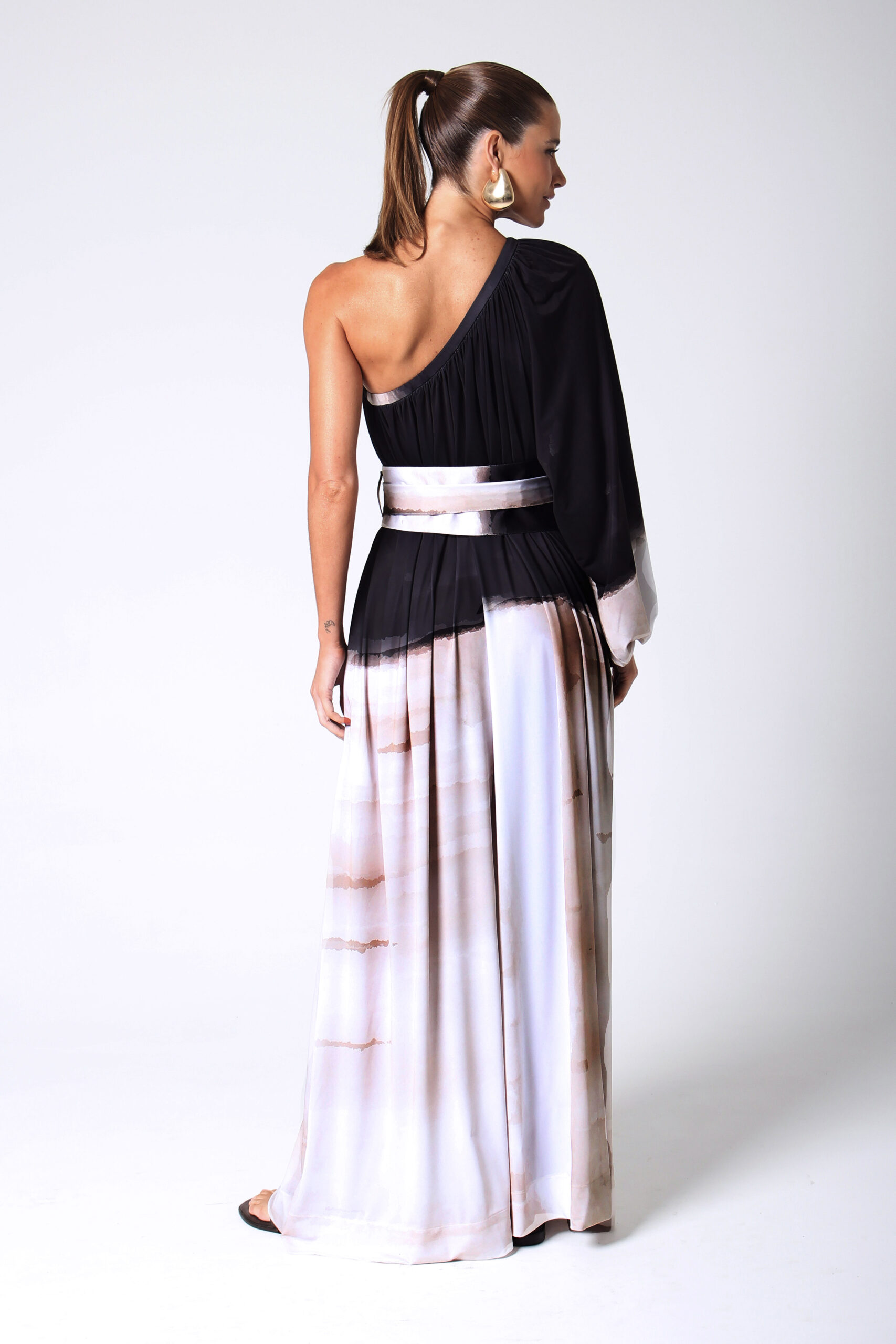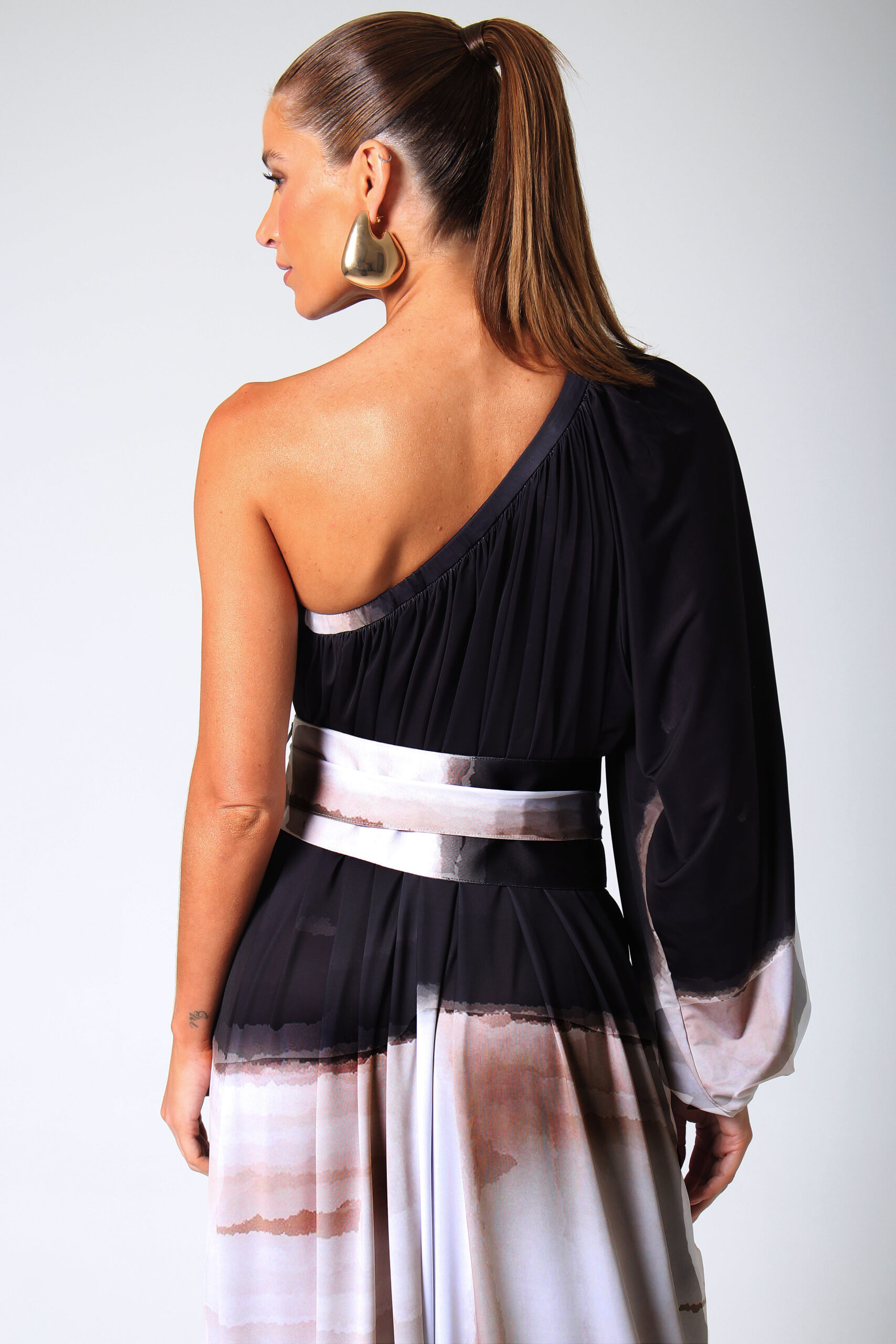 VESTIDO ELOS, UM OMBRO SÓ COM MANGA BUFANTE, BOLSOS NAS LATERAIS E FAIXA PARA AMARRAÇÃO.