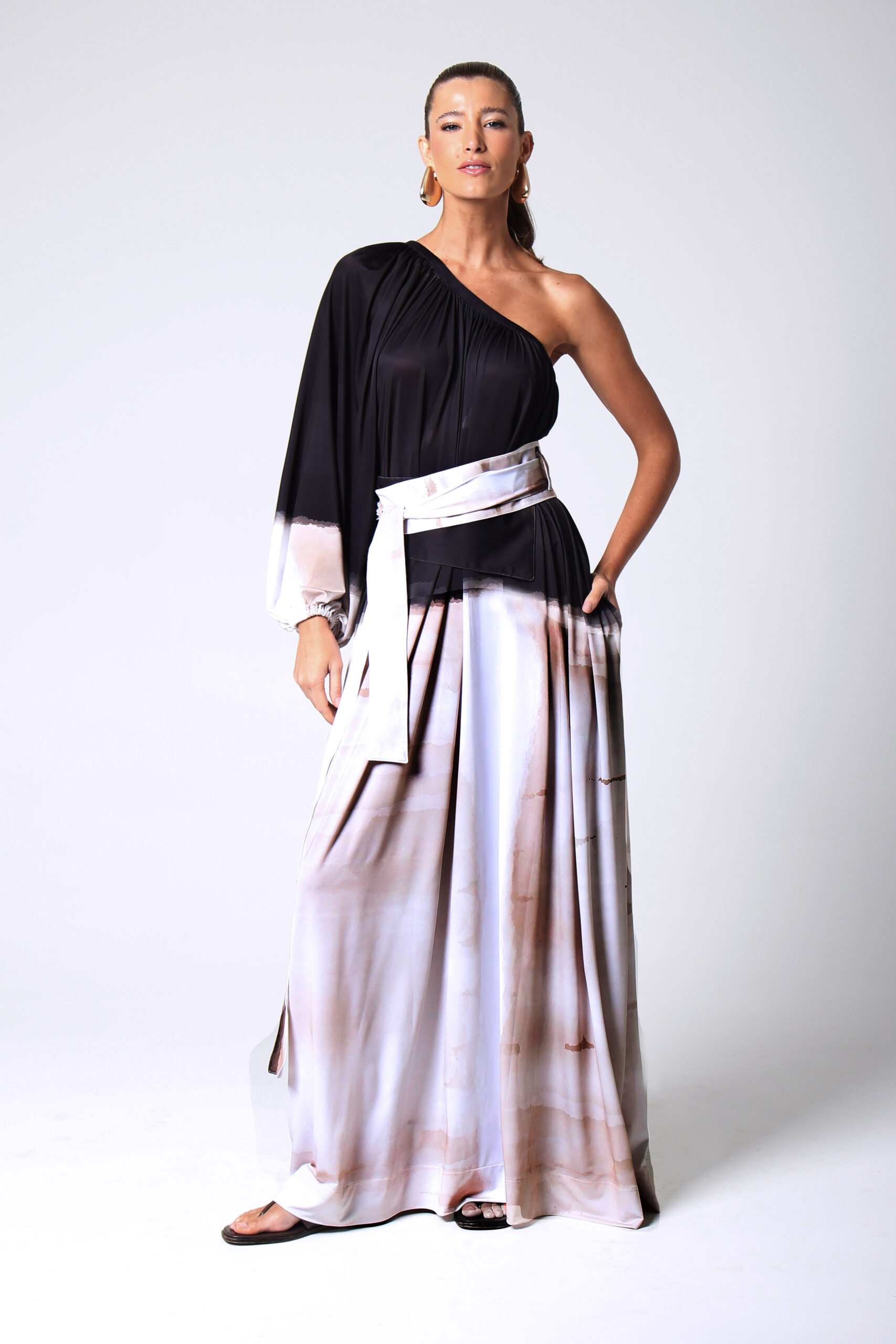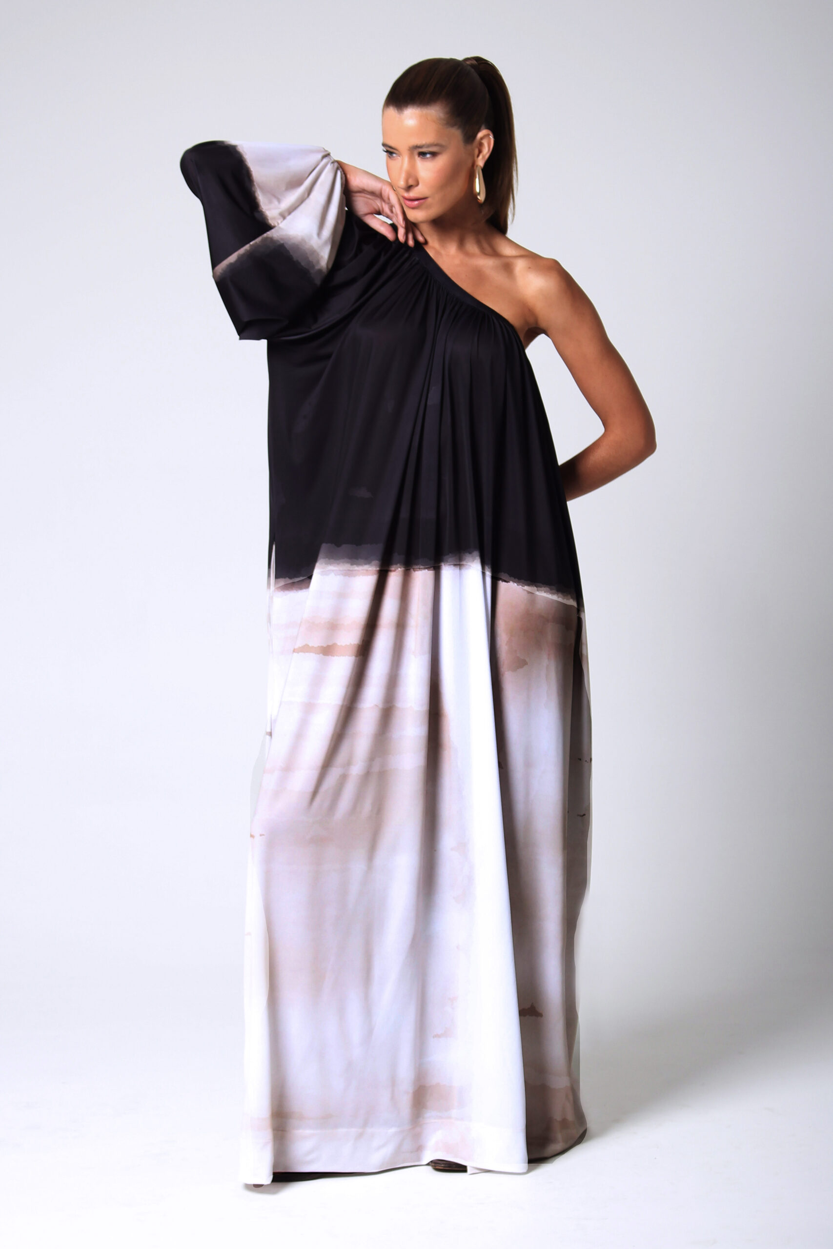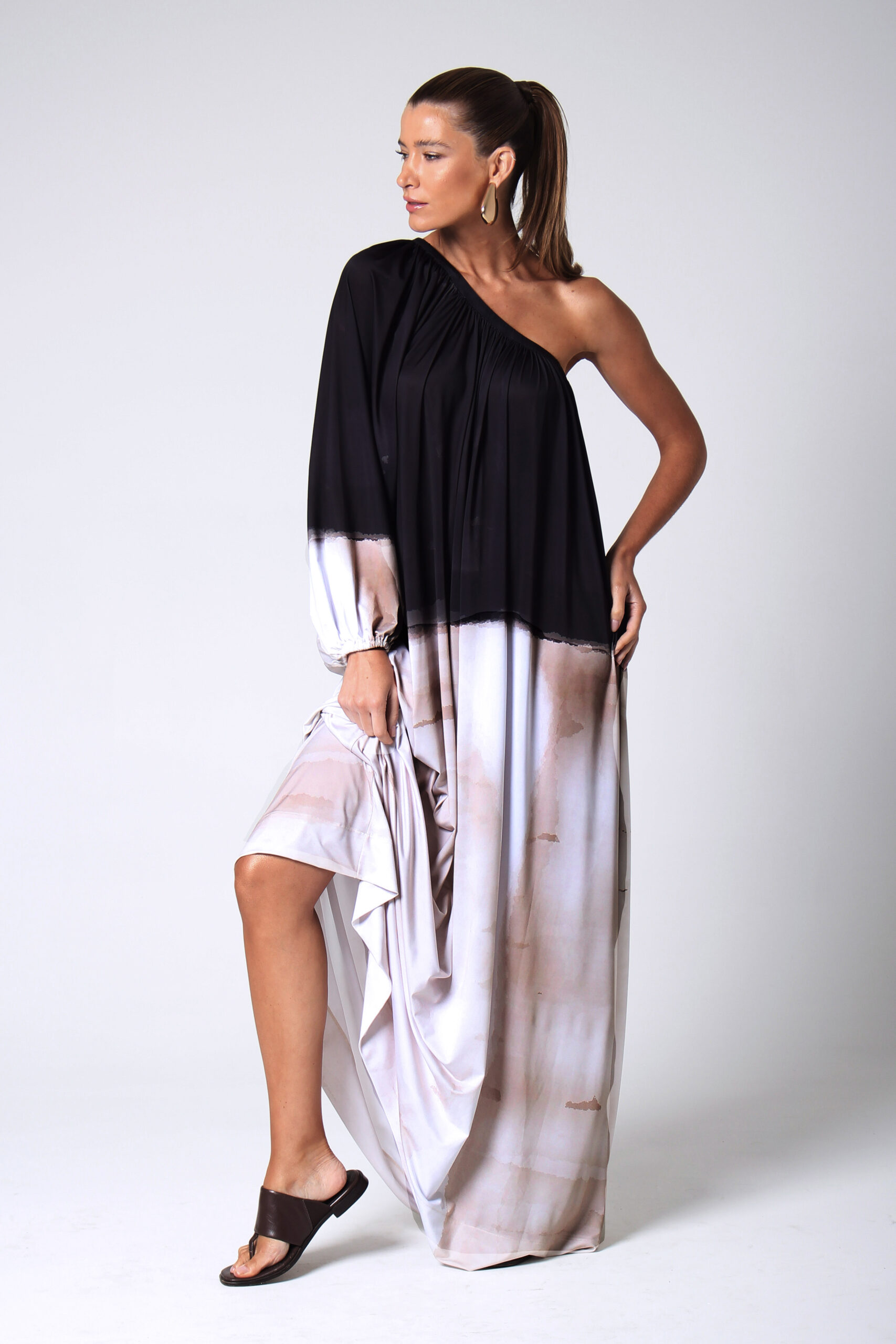 VESTIDO ELOS, UM OMBRO SÓ COM MANGA BUFANTE, BOLSOS NAS LATERAIS E FAIXA PARA AMARRAÇÃO.