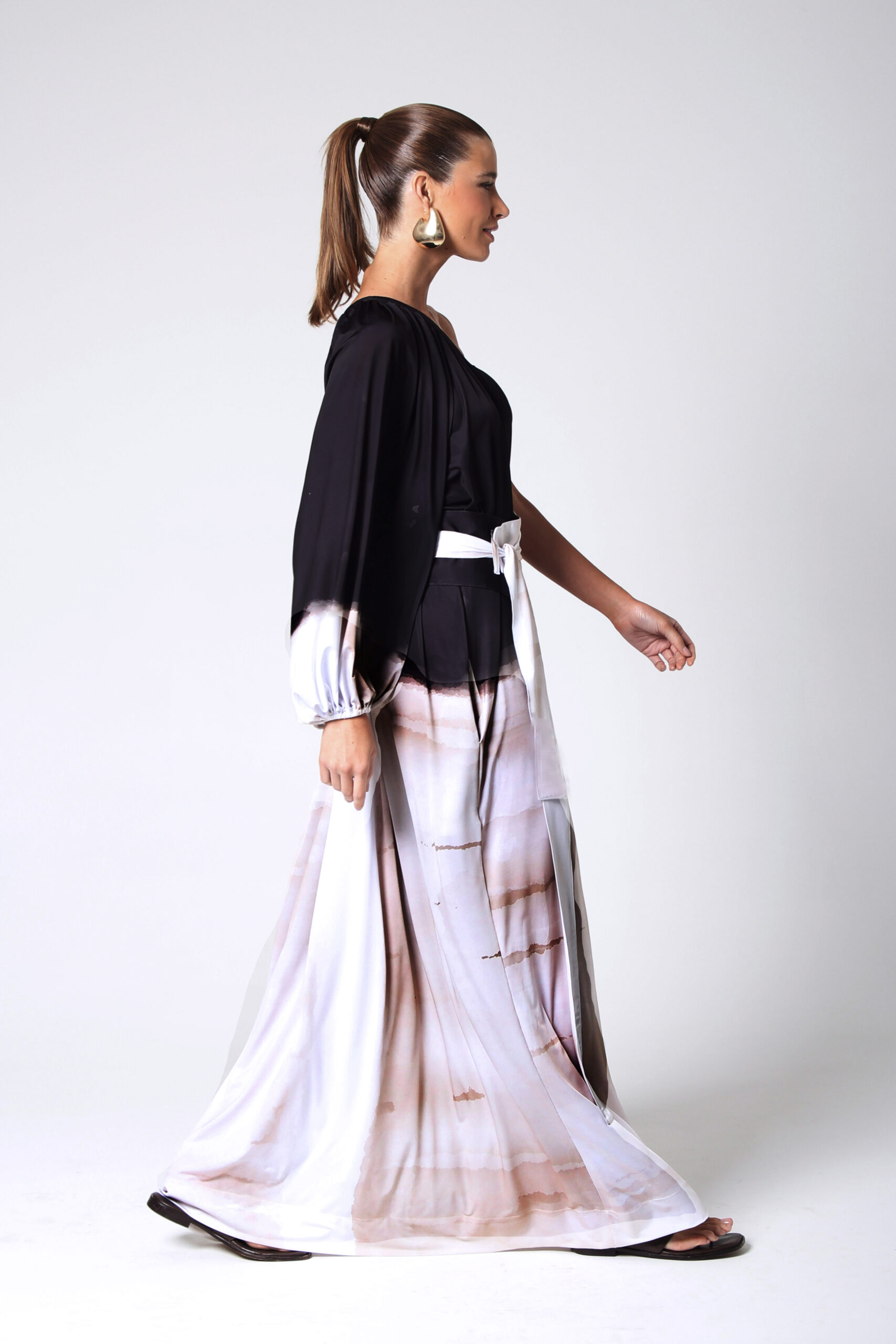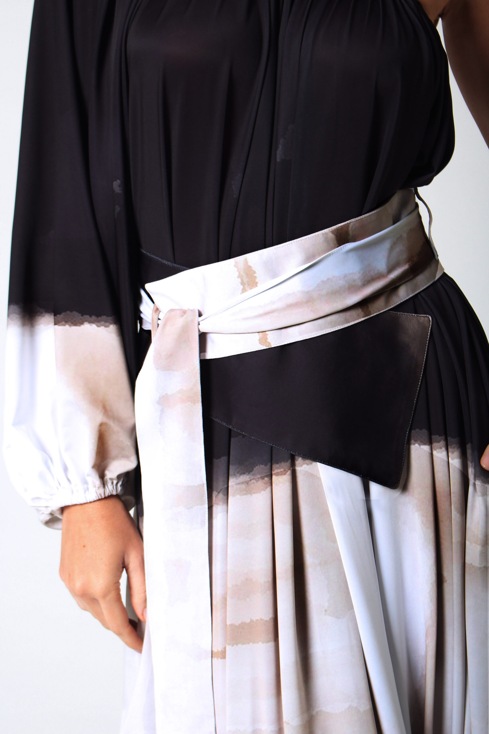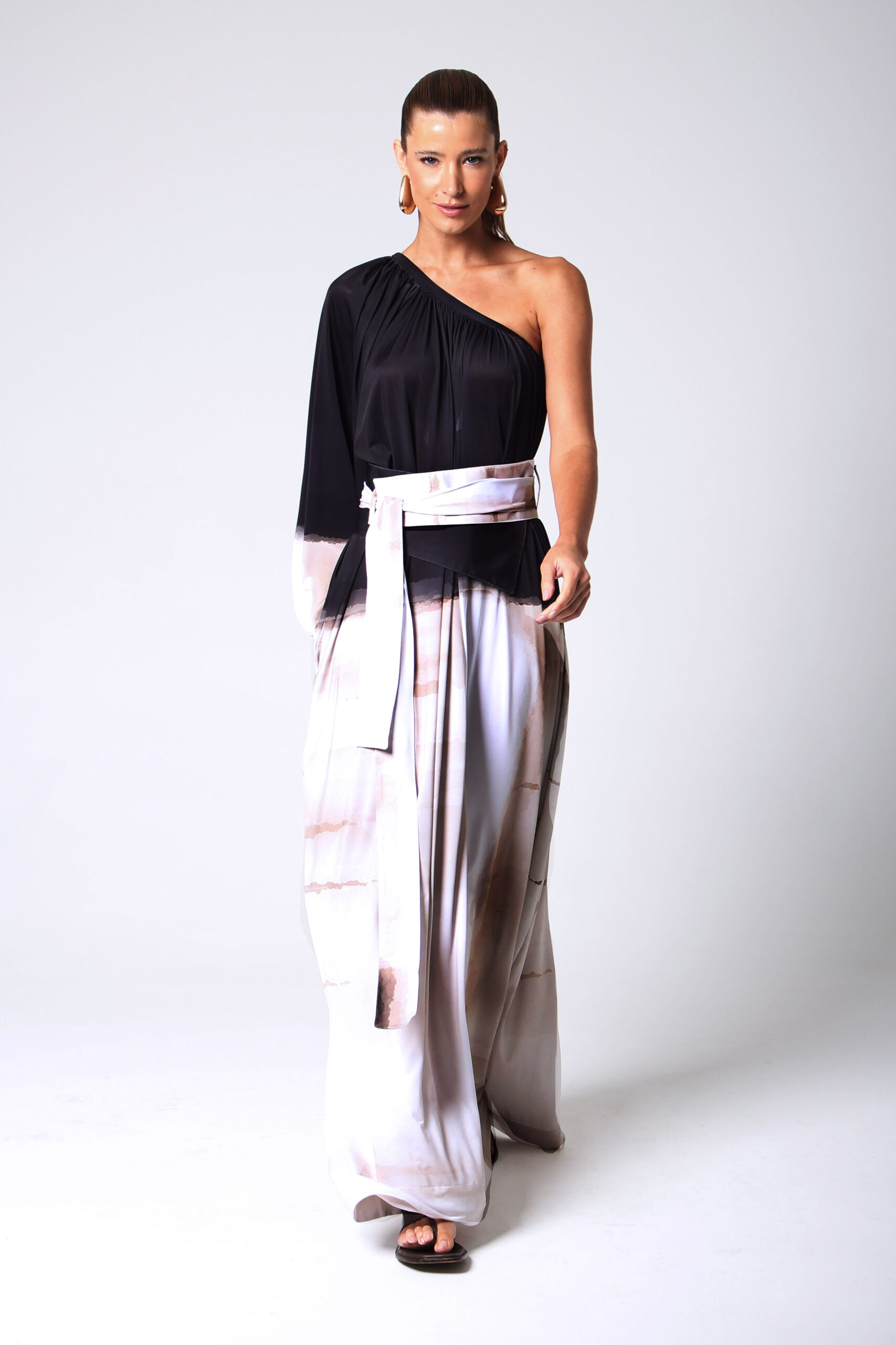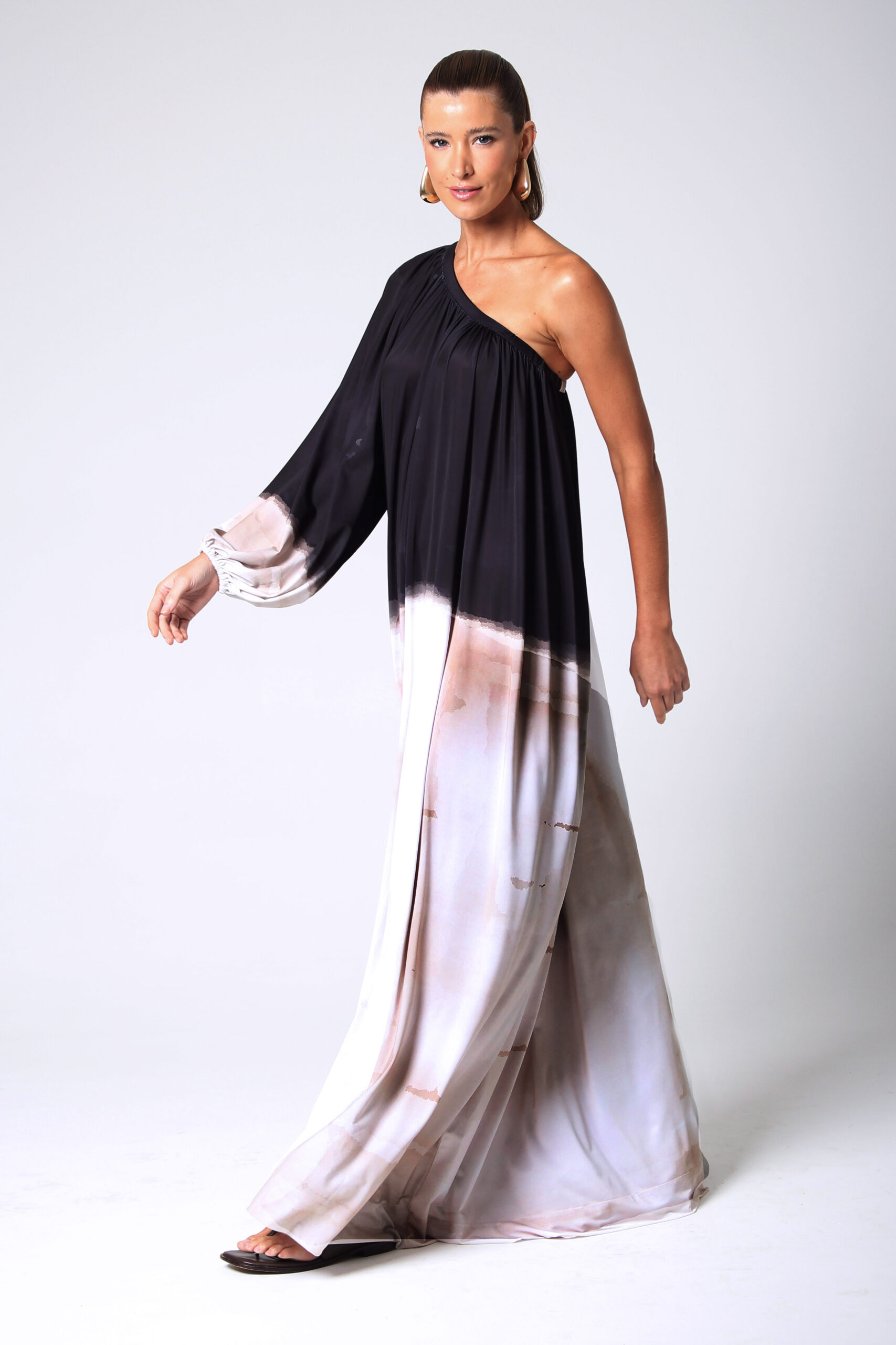 VESTIDO ELOS, UM OMBRO SÓ COM MANGA BUFANTE, BOLSOS NAS LATERAIS E FAIXA PARA AMARRAÇÃO.