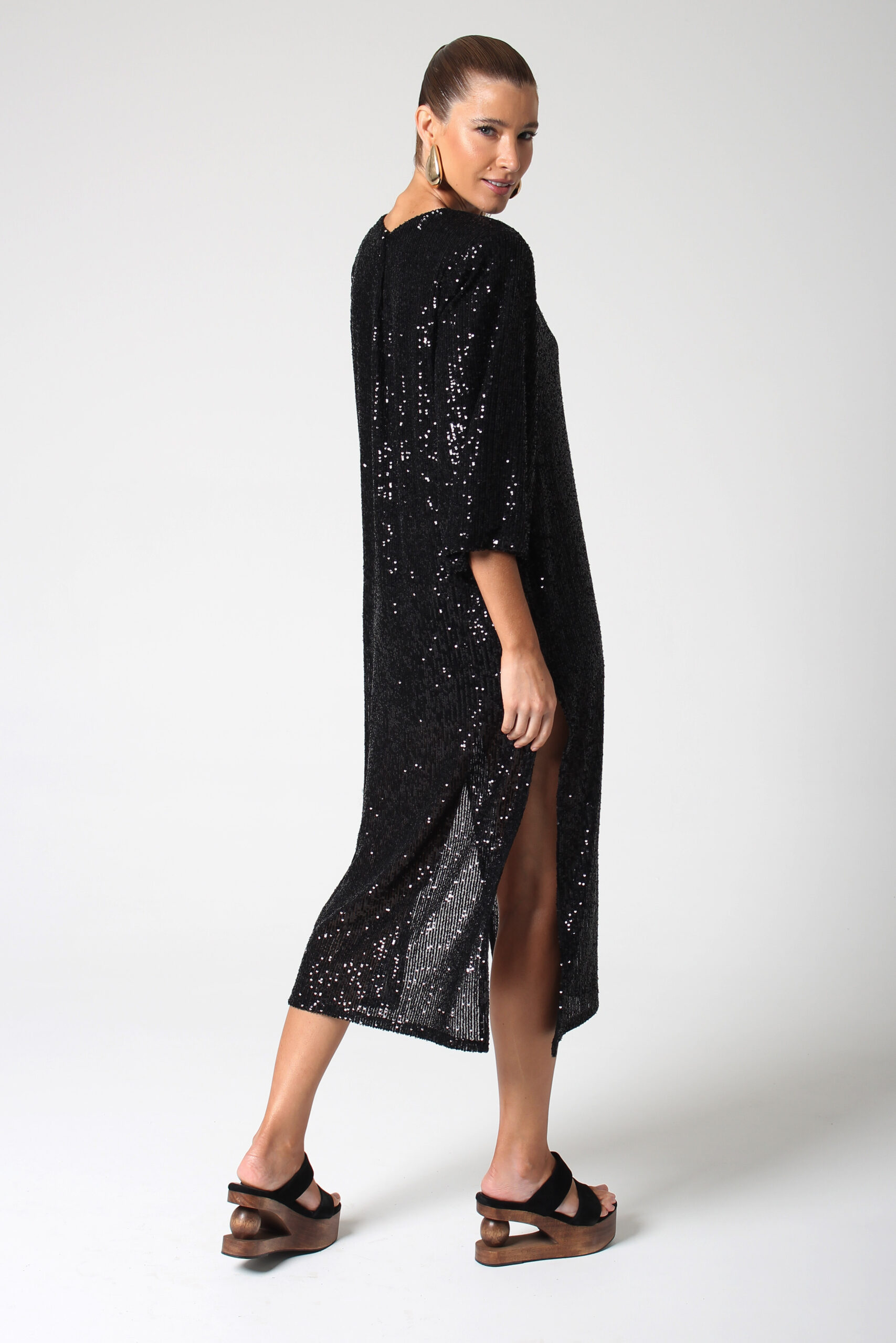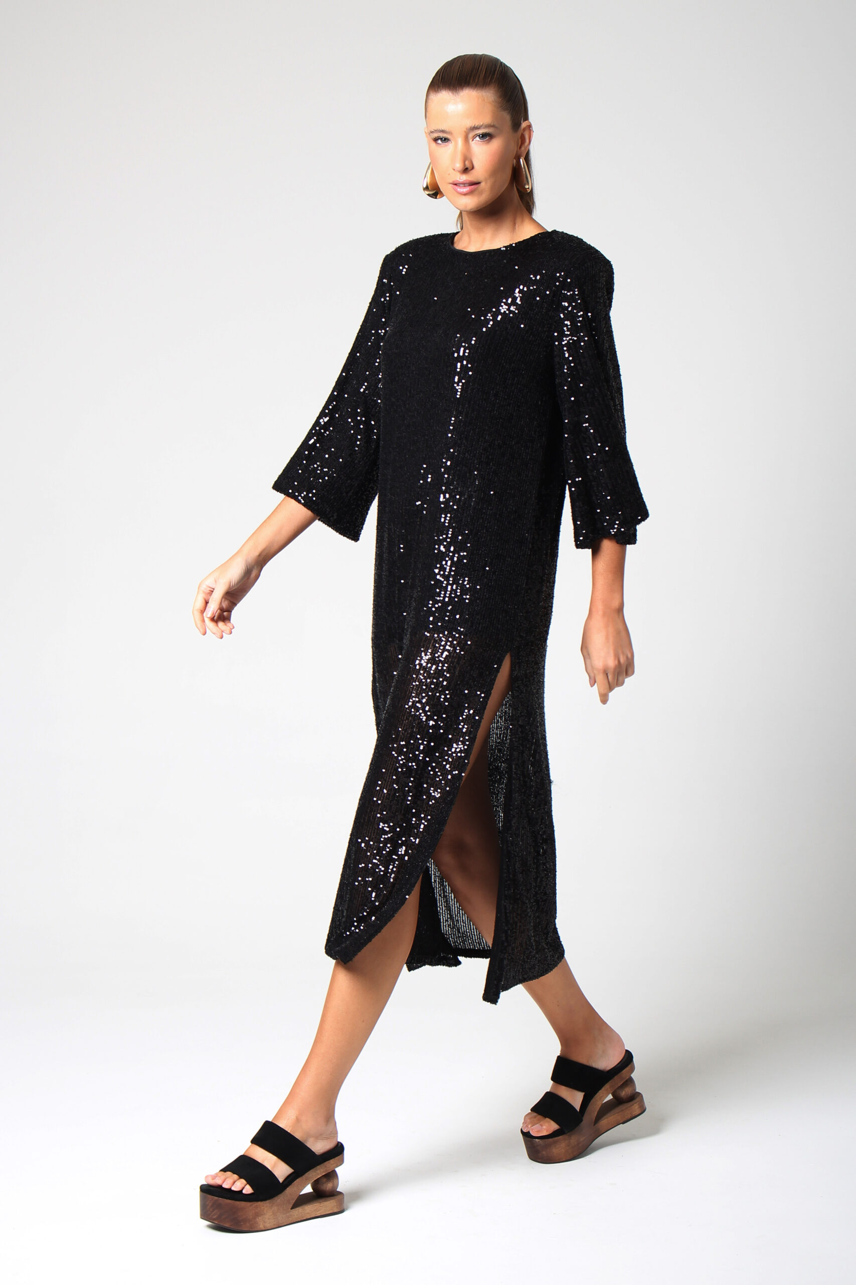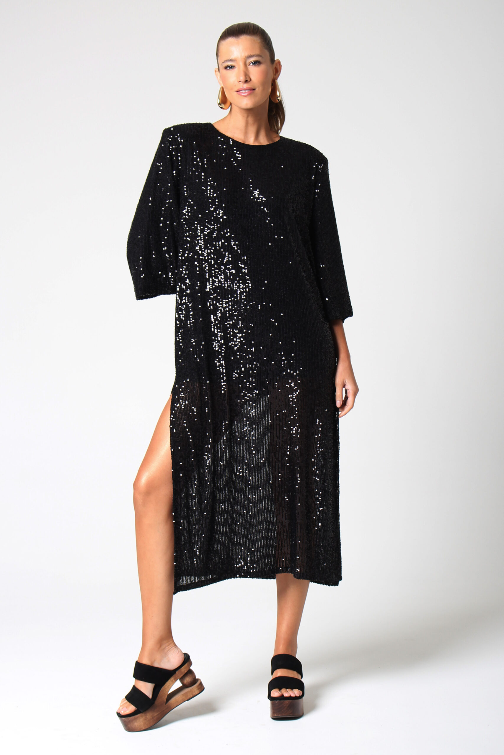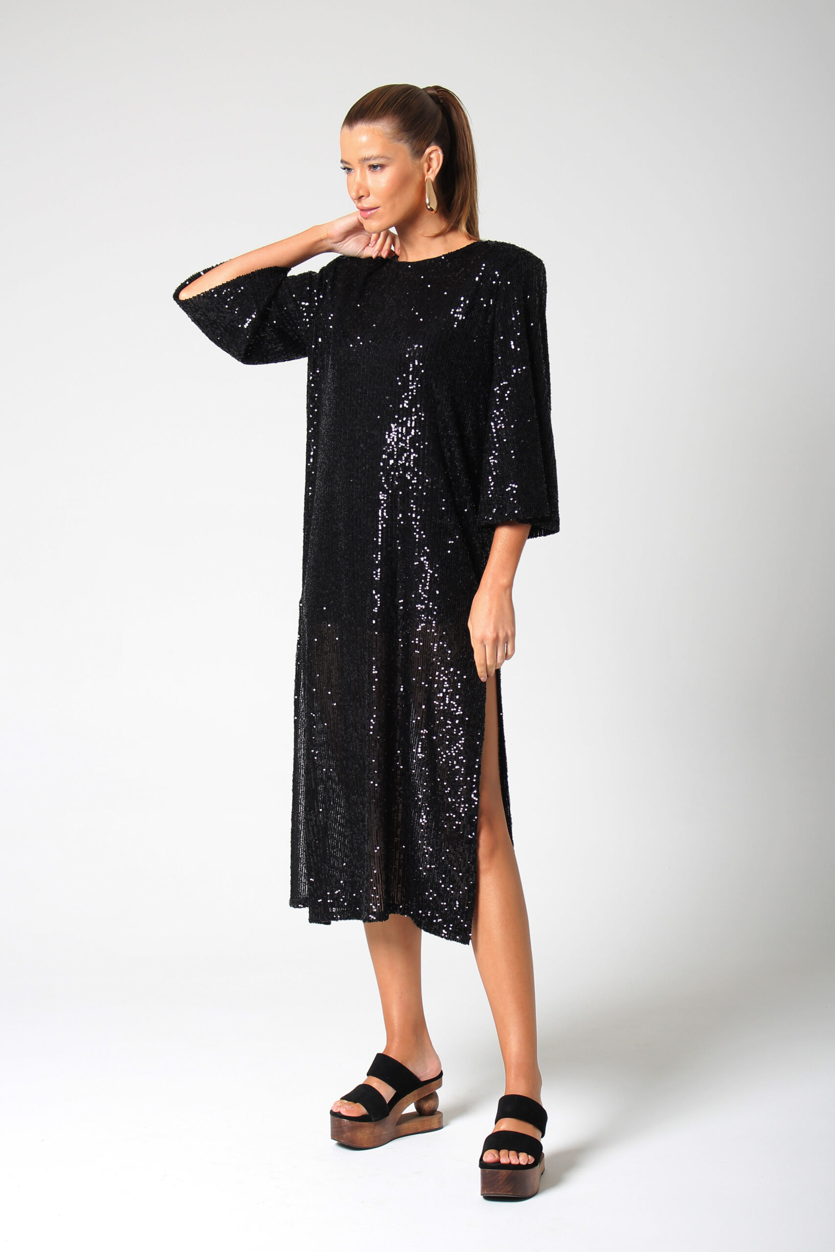 VESTIDO MALU, ESTILO CAMISETÃO, COM MANGA CURTA LEVEMENTE EVASÊ COM FENDAS NAS LATERAIS E GOLA CANOA.