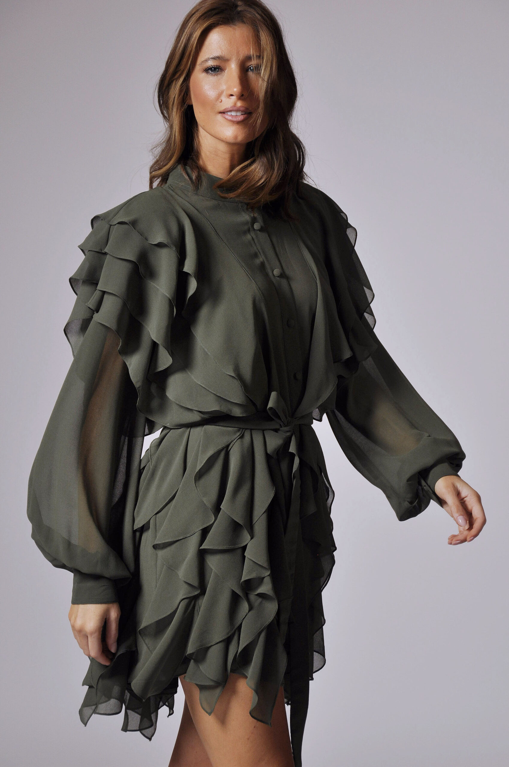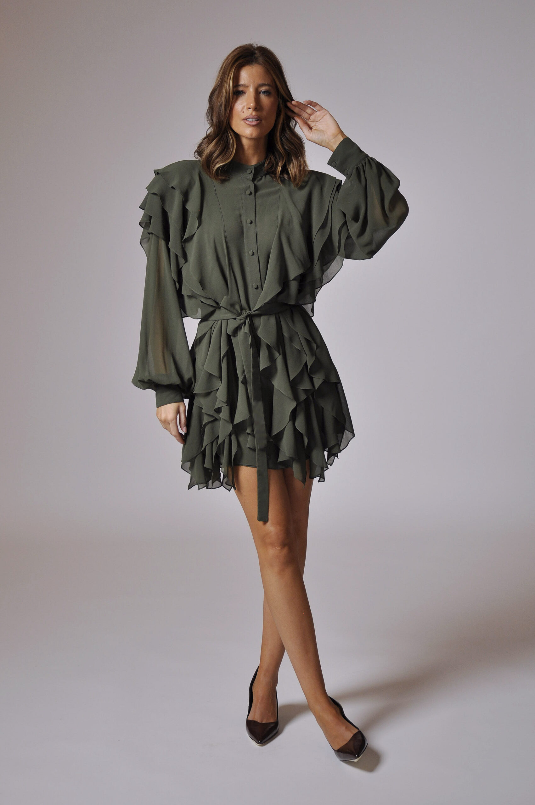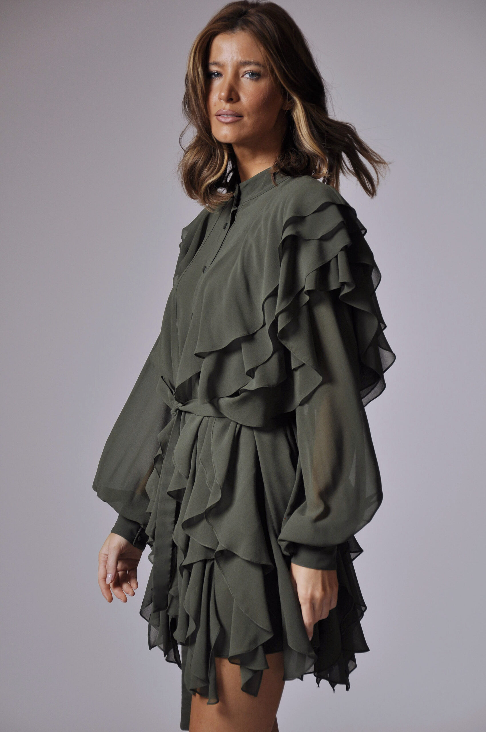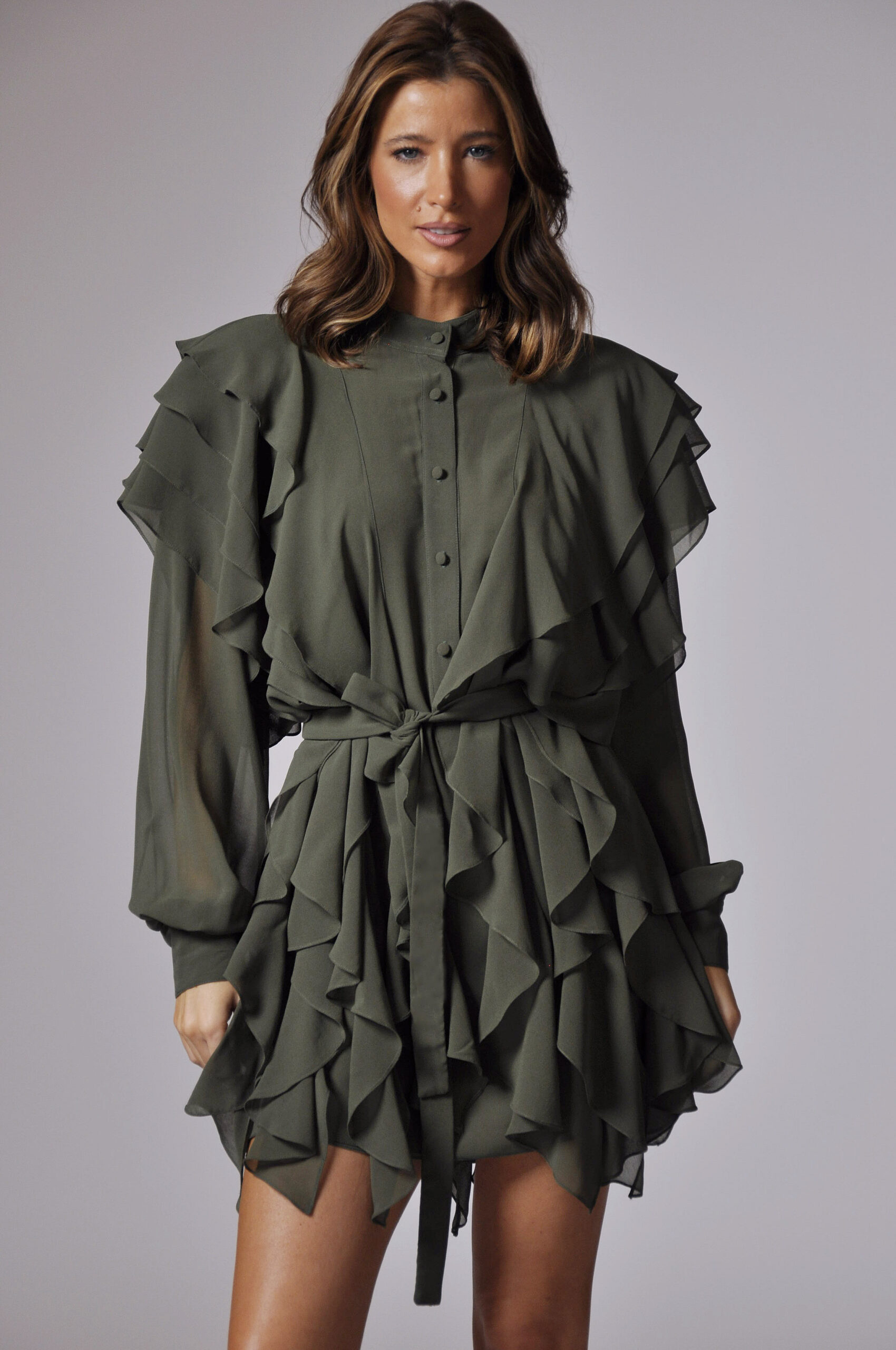 VESTIDO MARIE CURTO, COM ABOTOAMENTO FRONTAL E BABADOS